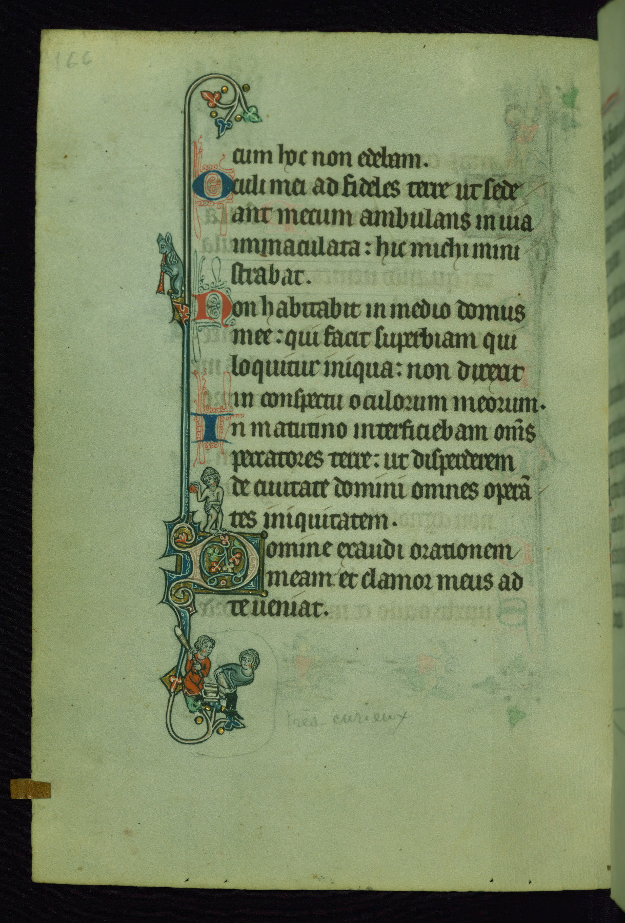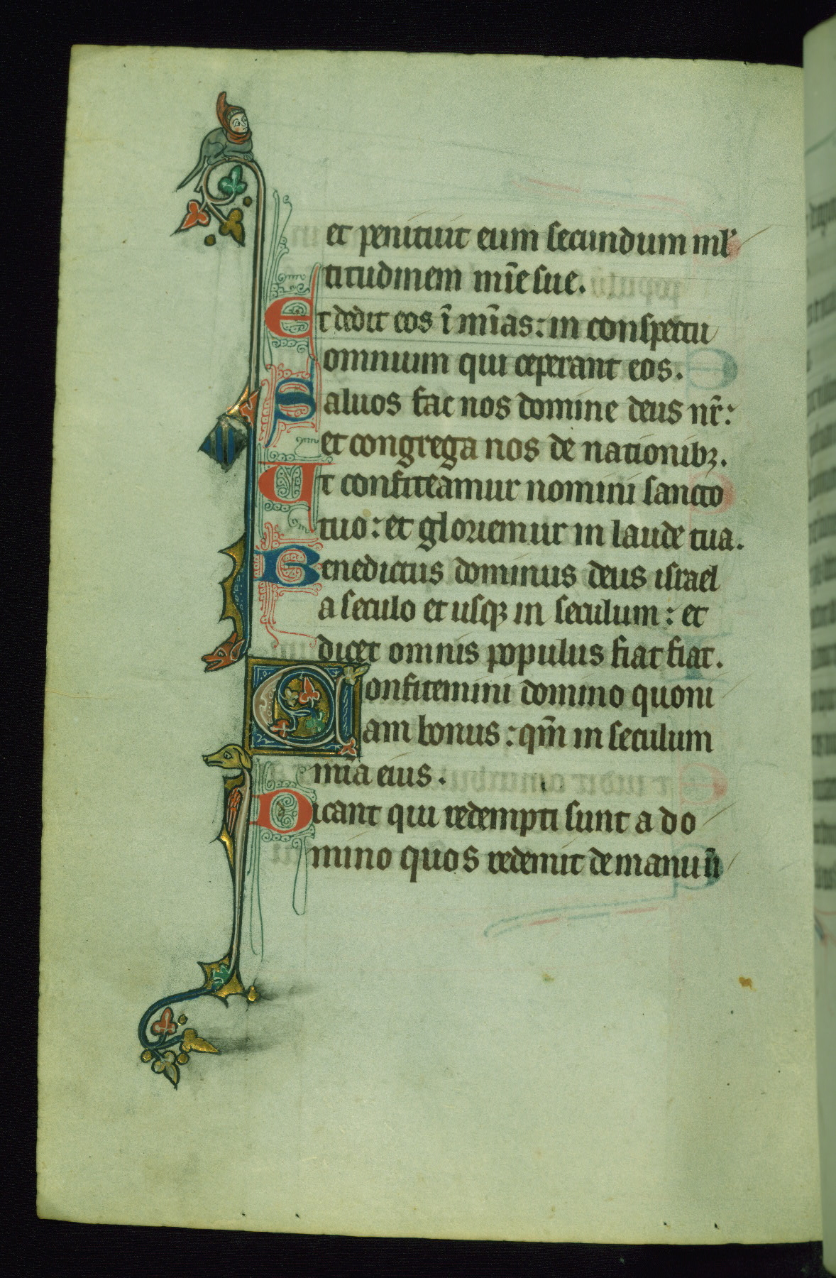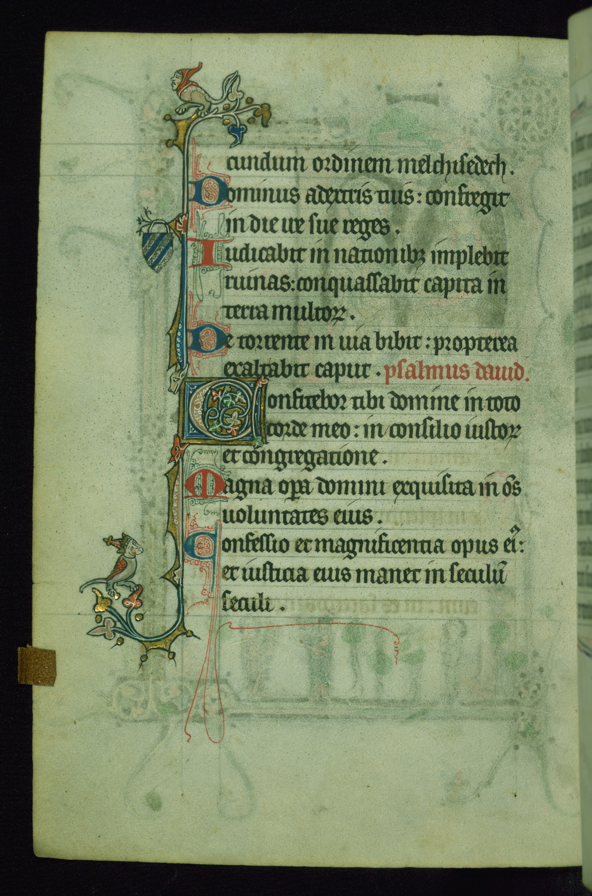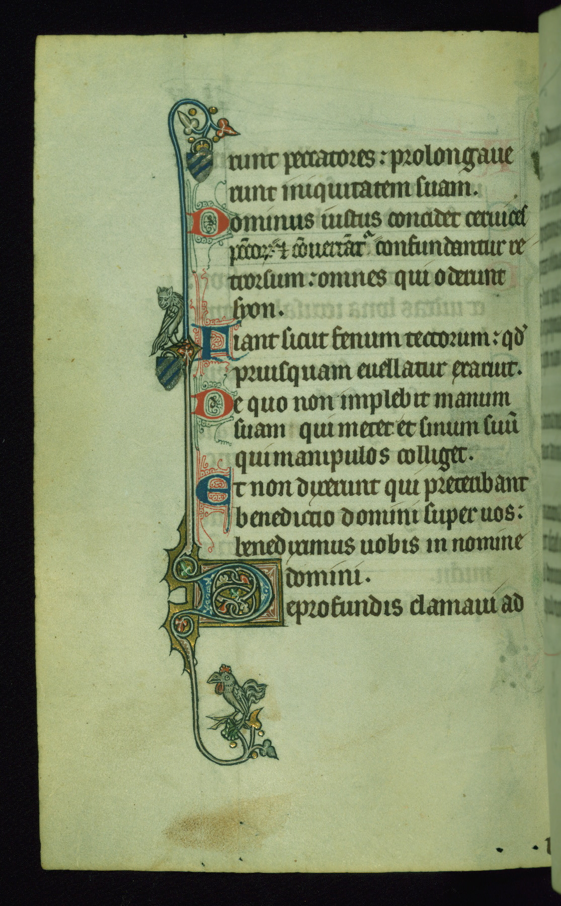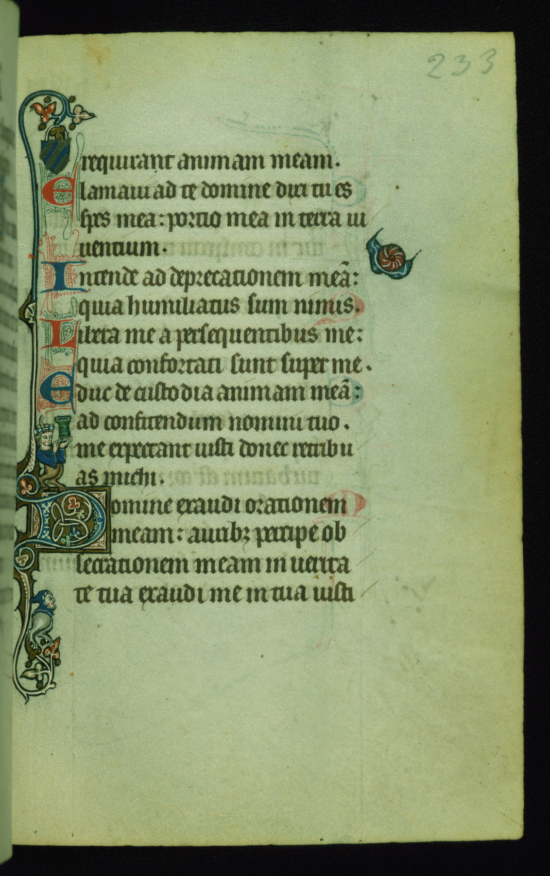 This Psalter, with an additional Office of the Dead, was created in the late thirteenth century in northeastern France. A large quantity of Franciscan saints in the calendar and litany, as well as marginal imagery of them, suggests that the original owner had a strong affinity for that order. The manuscript was likely begun for one patron but finished for another, given a change in scribal and artistic hands and the addition of heraldry from Psalm 109 onward. Arms for the Fieschi family, as well as a birth notice in the calendar, identify the manuscript's first owner as Leonardo dei Fieschi, a Genoese nobleman (d. 1331). Among a multitude of drolleries, the manuscript contains a number of unusual marginal vignettes depicting SS. Francis, Clare, and Elisabeth of Hungary. One image of St. Francis (fol. 139v) is heavily worn, which may be evidence of devotional touching by the manuscript's owner.