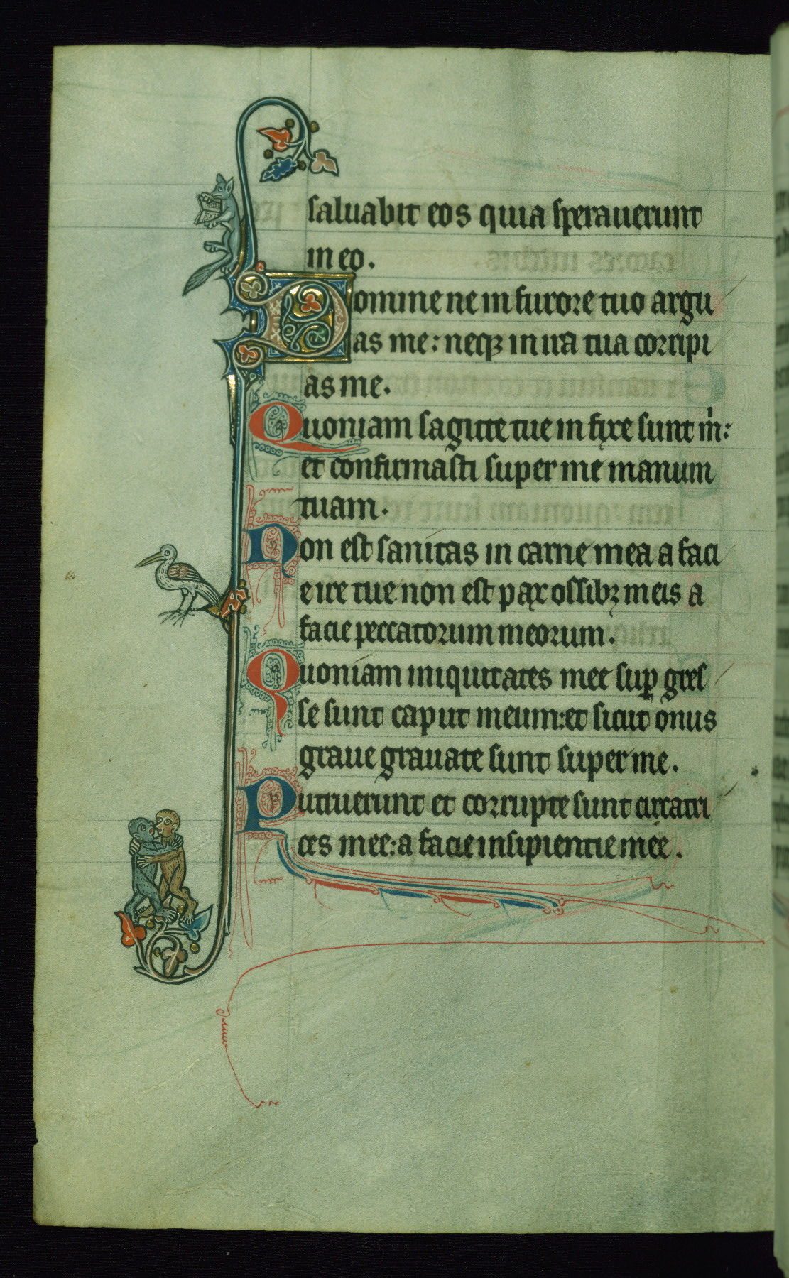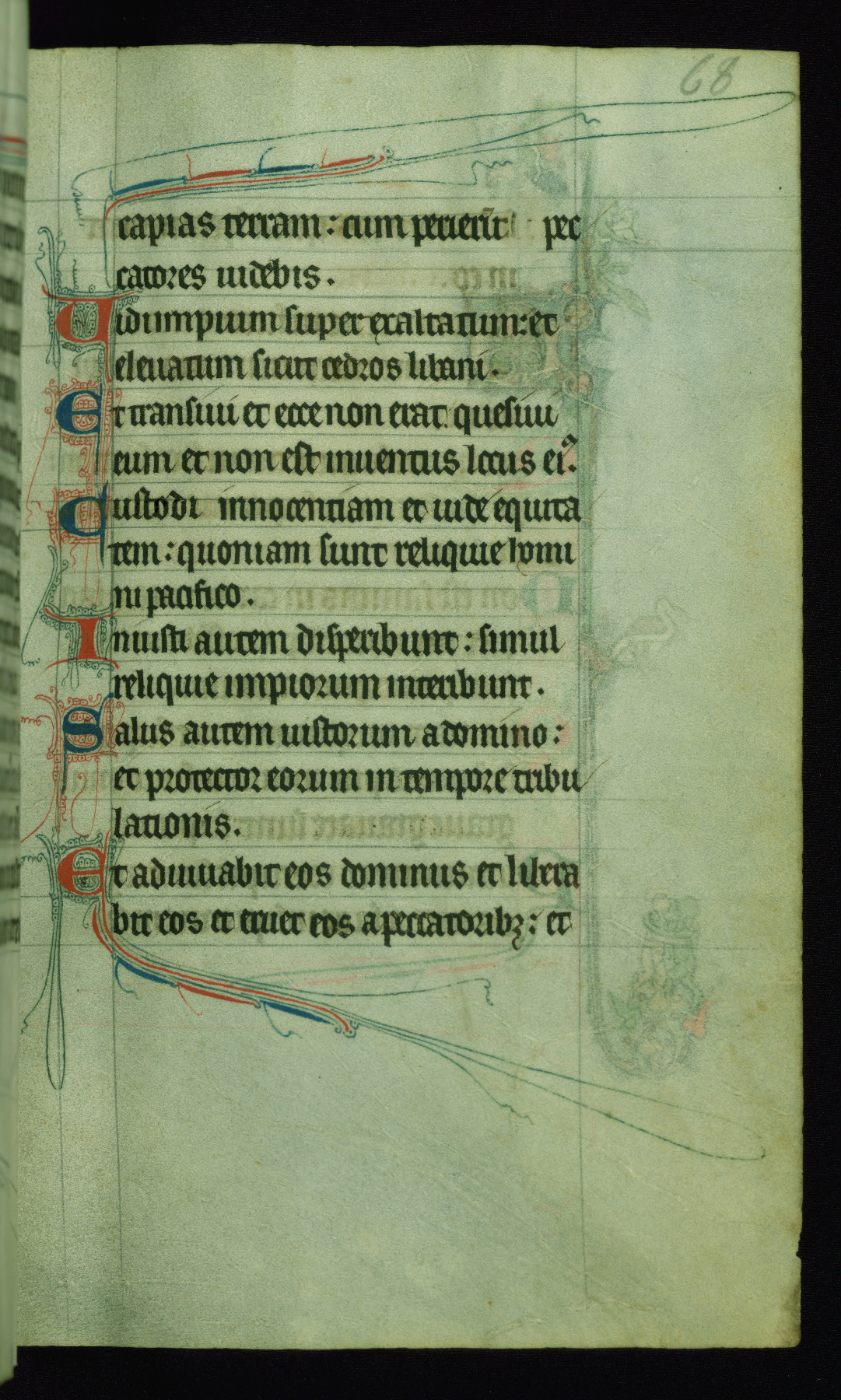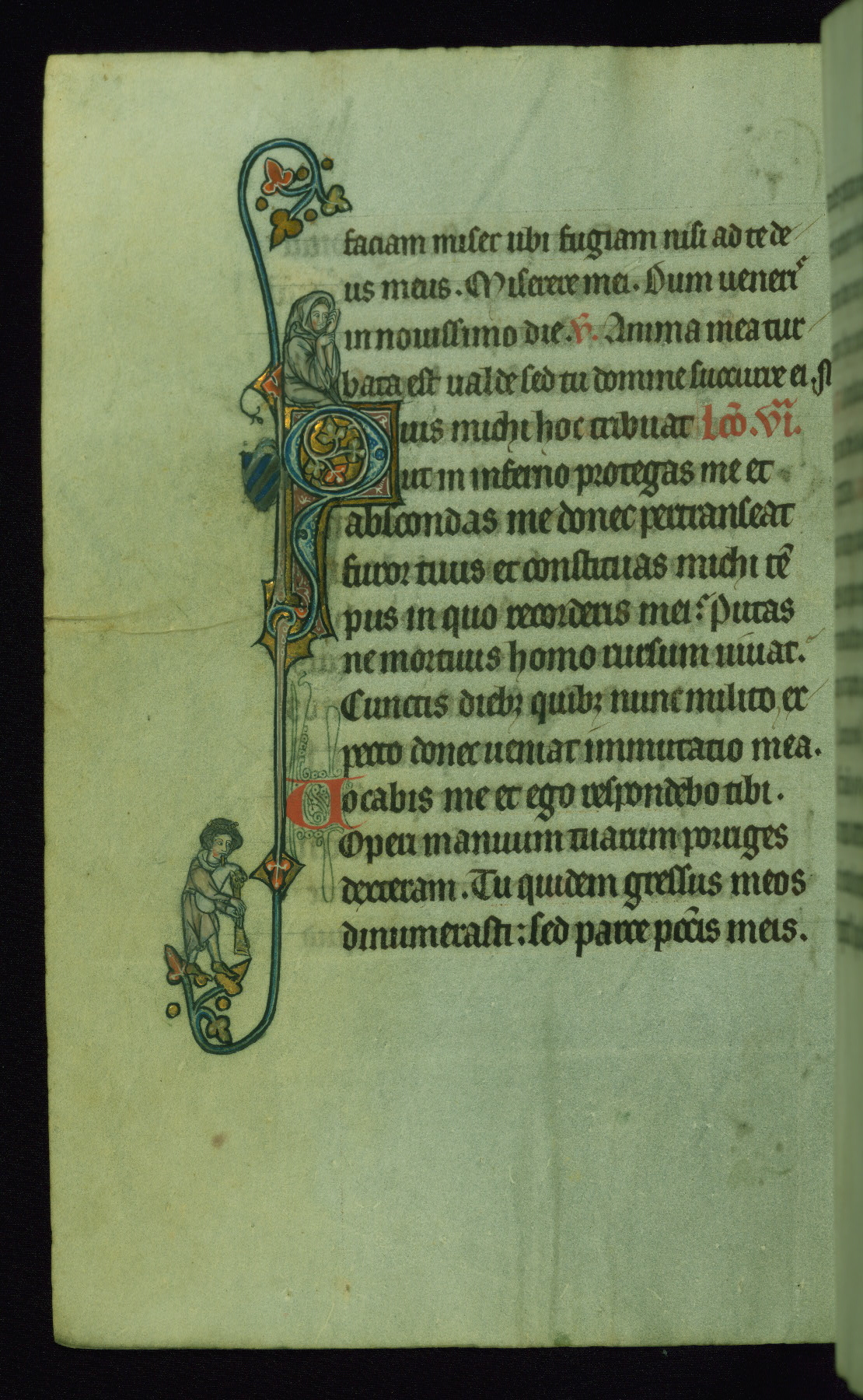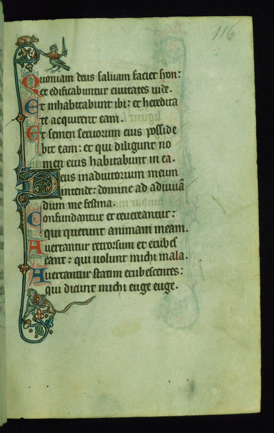 This Psalter, with an additional Office of the Dead, was created in the late thirteenth century in northeastern France. A large quantity of Franciscan saints in the calendar and litany, as well as marginal imagery of them, suggests that the original owner had a strong affinity for that order. The manuscript was likely begun for one patron but finished for another, given a change in scribal and artistic hands and the addition of heraldry from Psalm 109 onward. Arms for the Fieschi family, as well as a birth notice in the calendar, identify the manuscript's first owner as Leonardo dei Fieschi, a Genoese nobleman (d. 1331). Among a multitude of drolleries, the manuscript contains a number of unusual marginal vignettes depicting SS. Francis, Clare, and Elisabeth of Hungary. One image of St. Francis (fol. 139v) is heavily worn, which may be evidence of devotional touching by the manuscript's owner.