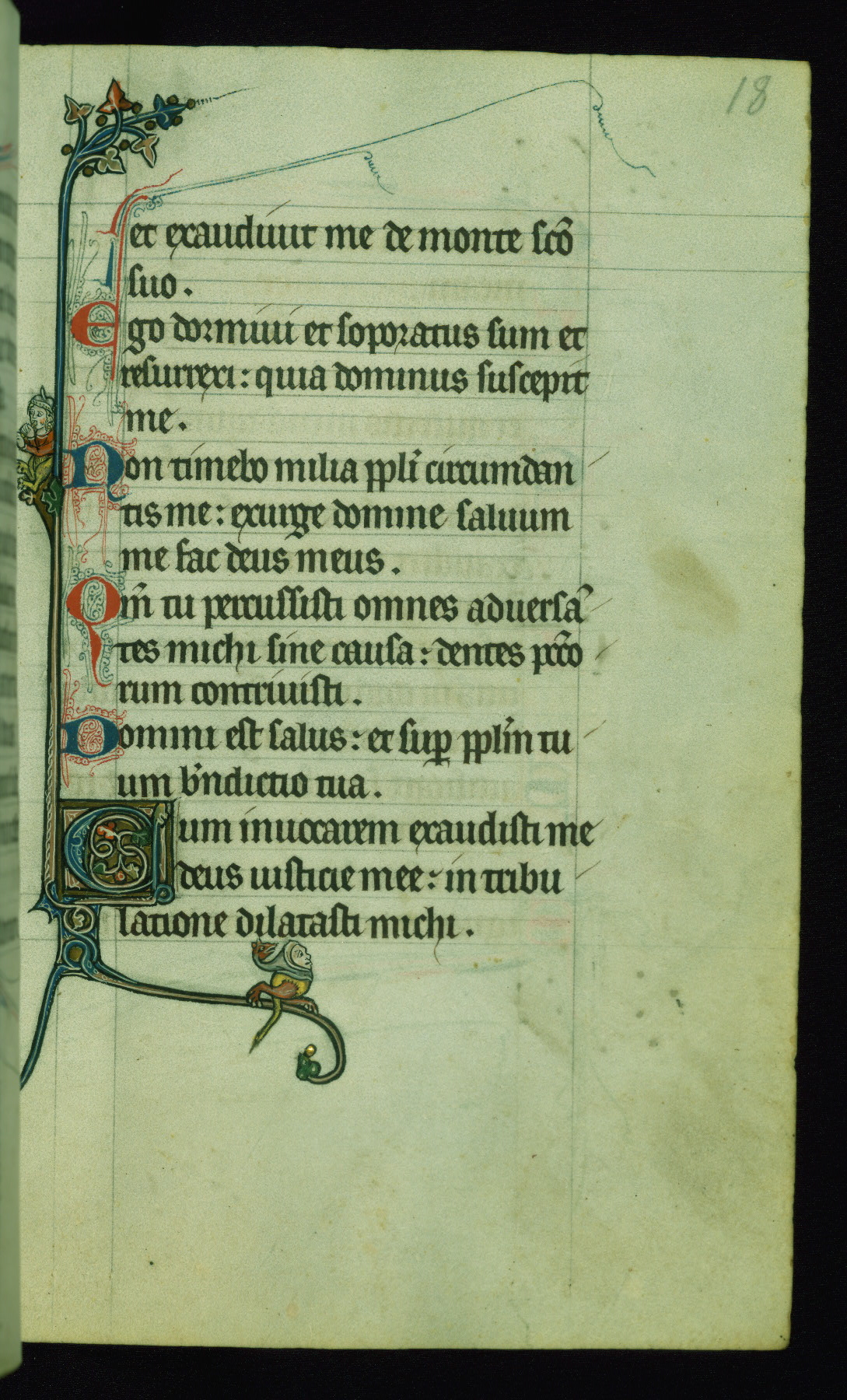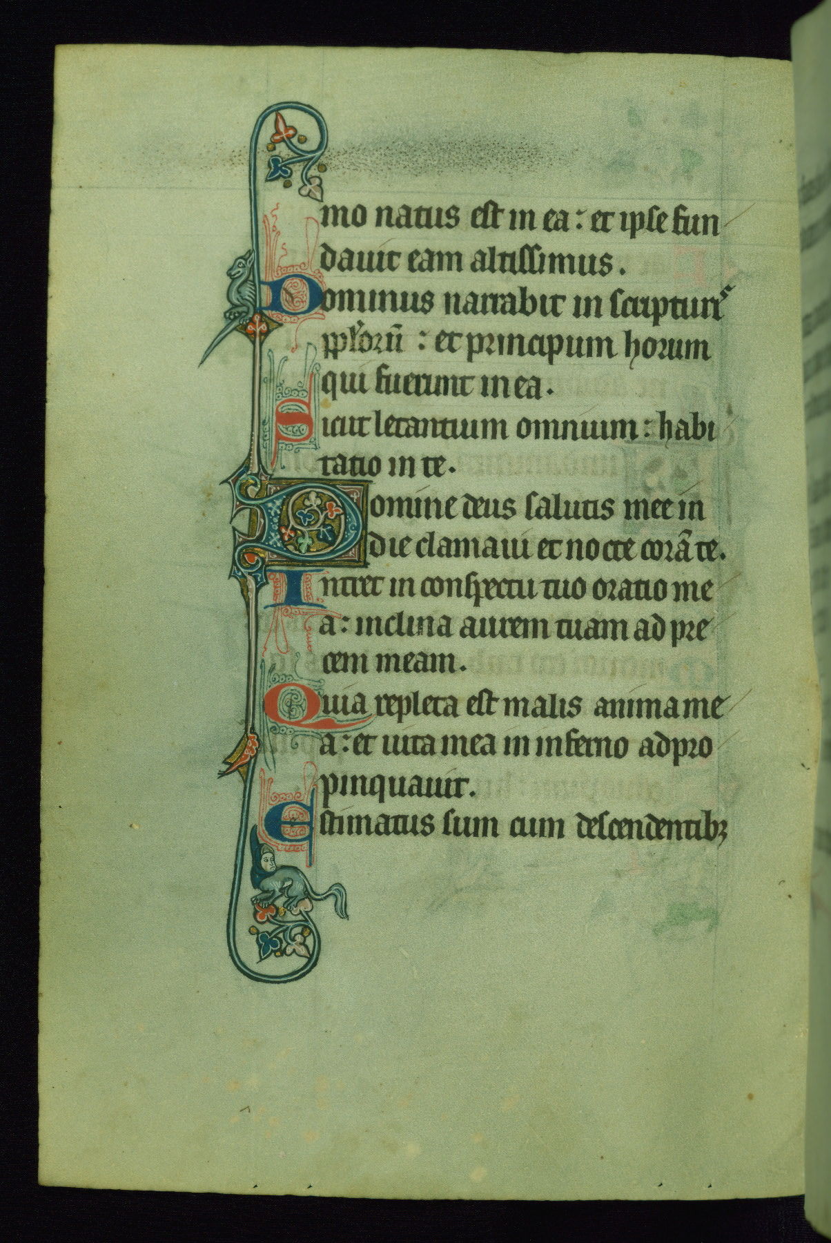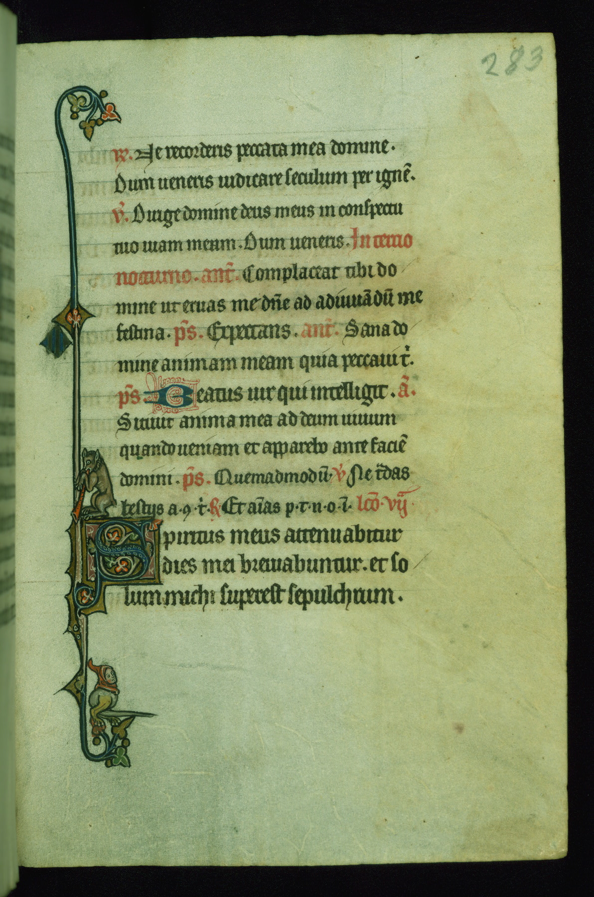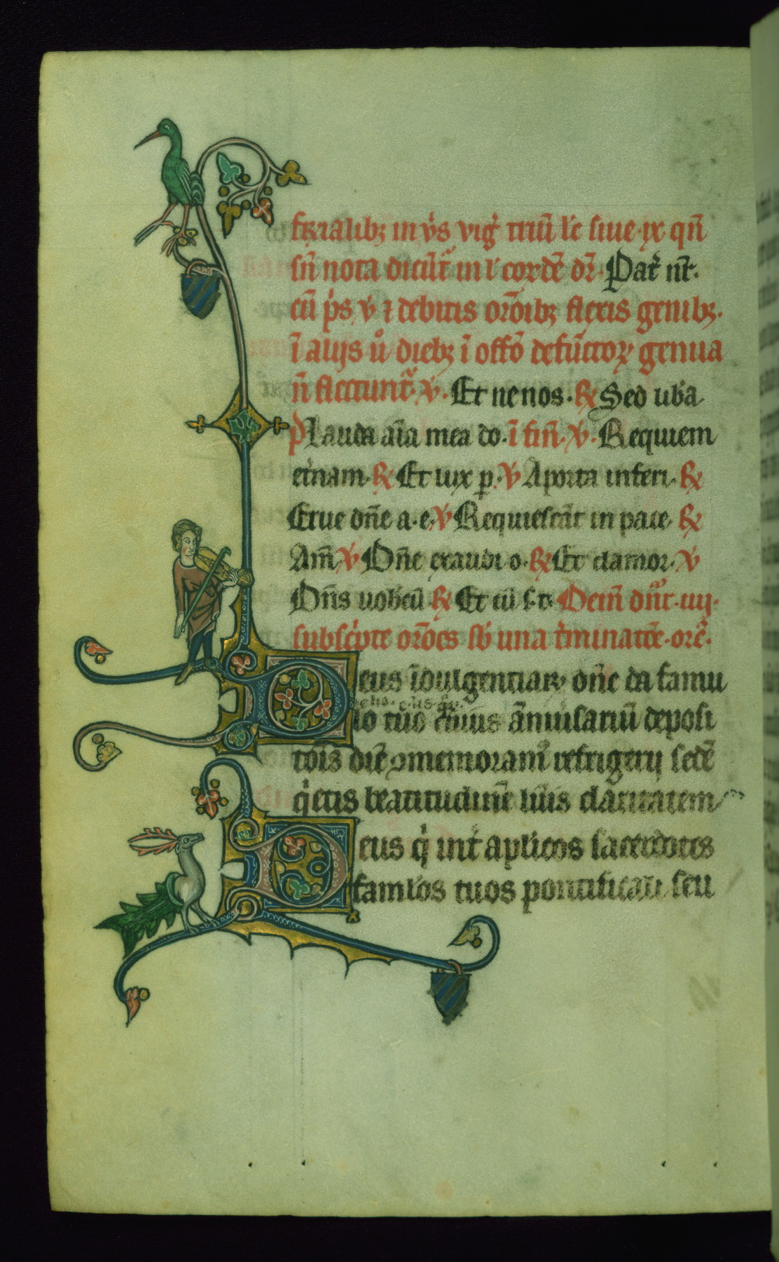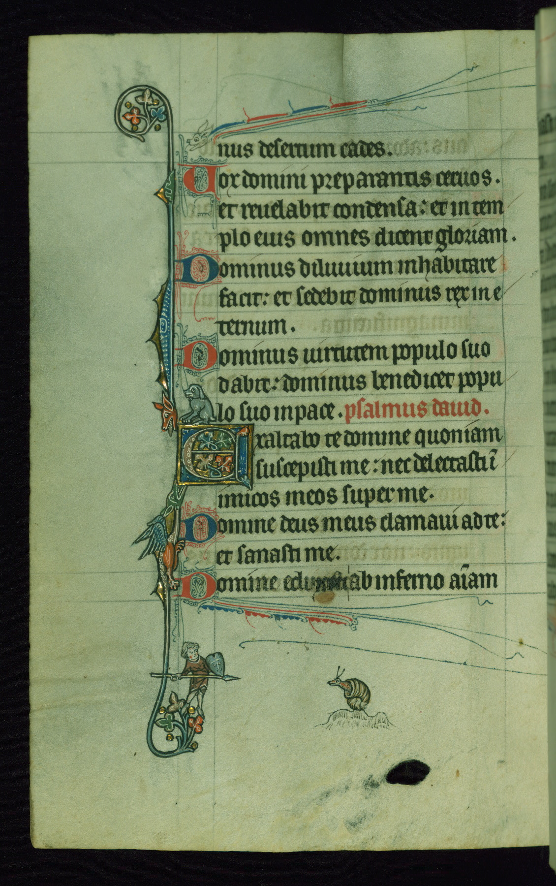 This Psalter, with an additional Office of the Dead, was created in the late thirteenth century in northeastern France. A large quantity of Franciscan saints in the calendar and litany, as well as marginal imagery of them, suggests that the original owner had a strong affinity for that order. The manuscript was likely begun for one patron but finished for another, given a change in scribal and artistic hands and the addition of heraldry from Psalm 109 onward. Arms for the Fieschi family, as well as a birth notice in the calendar, identify the manuscript's first owner as Leonardo dei Fieschi, a Genoese nobleman (d. 1331). Among a multitude of drolleries, the manuscript contains a number of unusual marginal vignettes depicting SS. Francis, Clare, and Elisabeth of Hungary. One image of St. Francis (fol. 139v) is heavily worn, which may be evidence of devotional touching by the manuscript's owner.