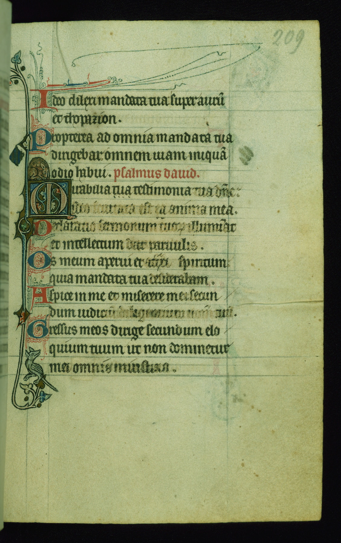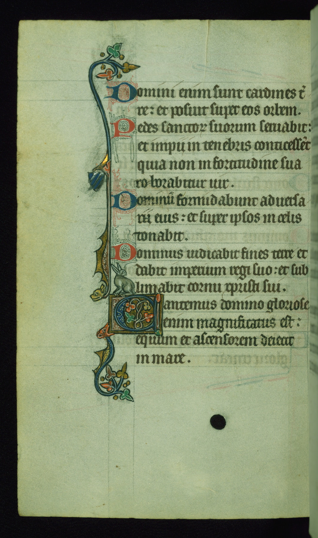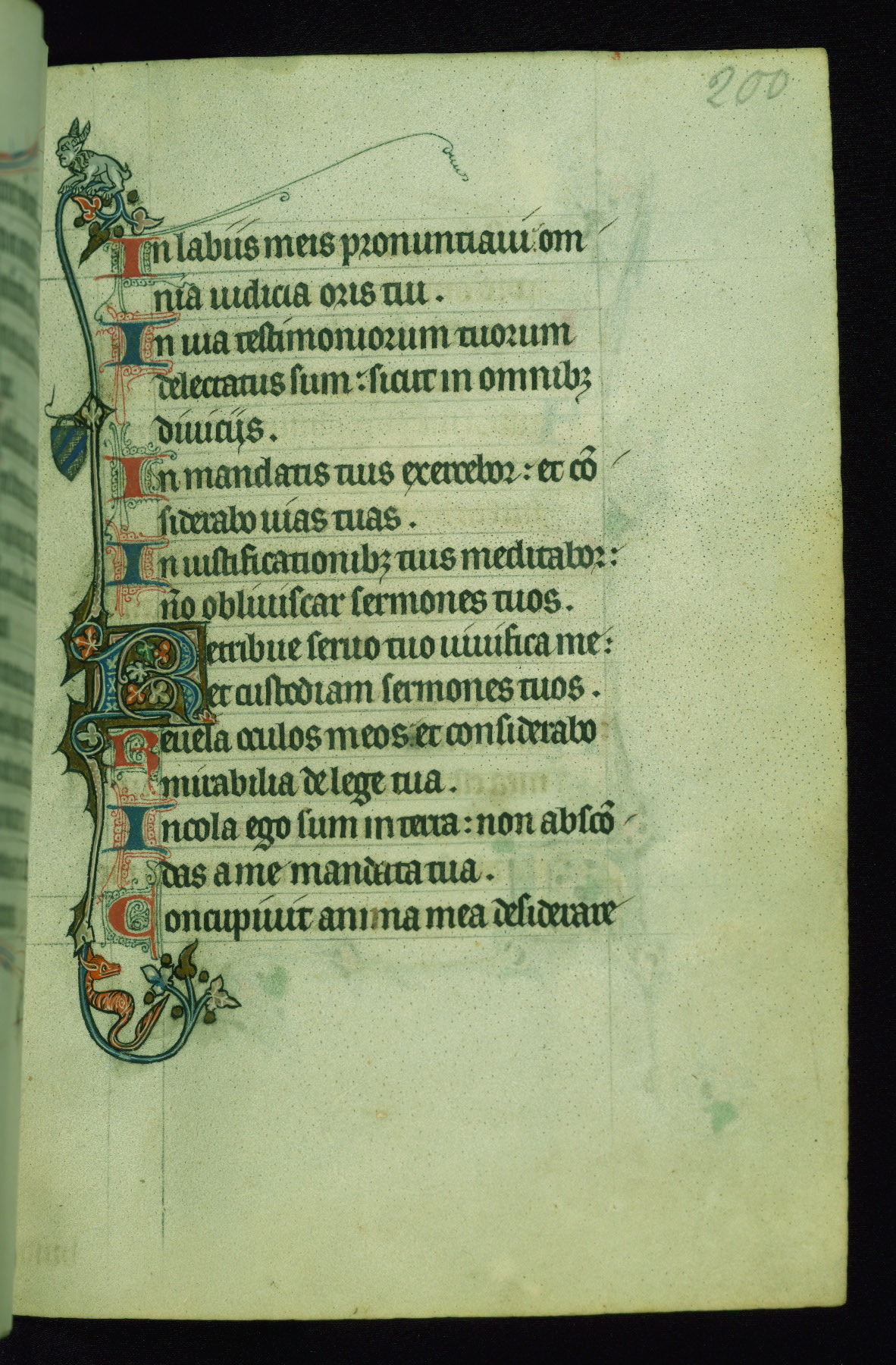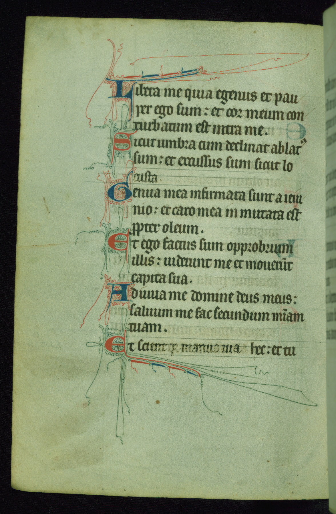 This Psalter, with an additional Office of the Dead, was created in the late thirteenth century in northeastern France. A large quantity of Franciscan saints in the calendar and litany, as well as marginal imagery of them, suggests that the original owner had a strong affinity for that order. The manuscript was likely begun for one patron but finished for another, given a change in scribal and artistic hands and the addition of heraldry from Psalm 109 onward. Arms for the Fieschi family, as well as a birth notice in the calendar, identify the manuscript's first owner as Leonardo dei Fieschi, a Genoese nobleman (d. 1331). Among a multitude of drolleries, the manuscript contains a number of unusual marginal vignettes depicting SS. Francis, Clare, and Elisabeth of Hungary. One image of St. Francis (fol. 139v) is heavily worn, which may be evidence of devotional touching by the manuscript's owner.