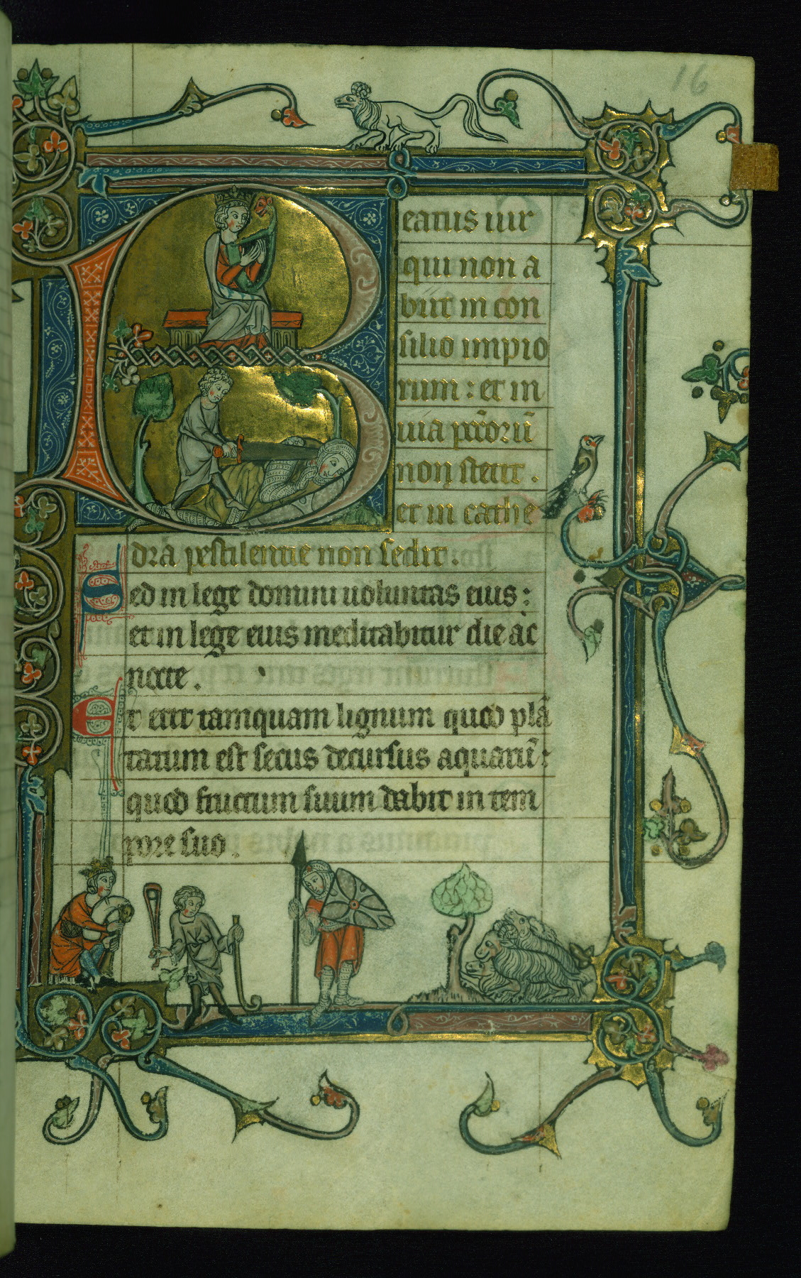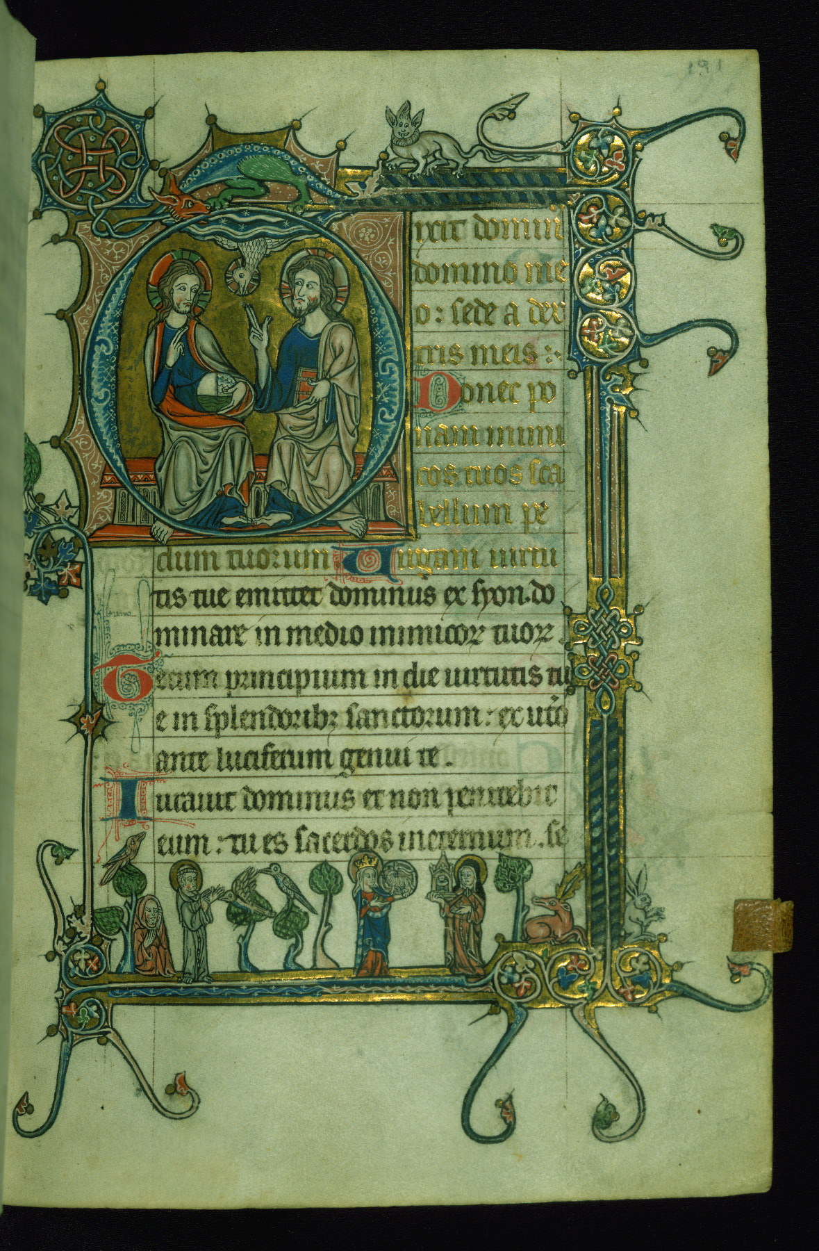 - Decoration note: Eight historiated initials extant (8 lines), one missing before Psalm 97 between fols. 163 and 164; marginal drolleries throughout, although more substantial on pages with historiated initials; enlarged decorated initials throughout, including "KL" in calendar and secondary text divisions, in gold, red, rose, and blue with white detailing (2 to 3 lines); borders in same colors usually spring from initials and contain flora and/or fauna; incipits for Psalms 1 and 109 written in gold; psalm versals begun with alternating red and blue pen flourished initials (1 line); line fillers almost entirely missing; rubrics in red; text in black ink
