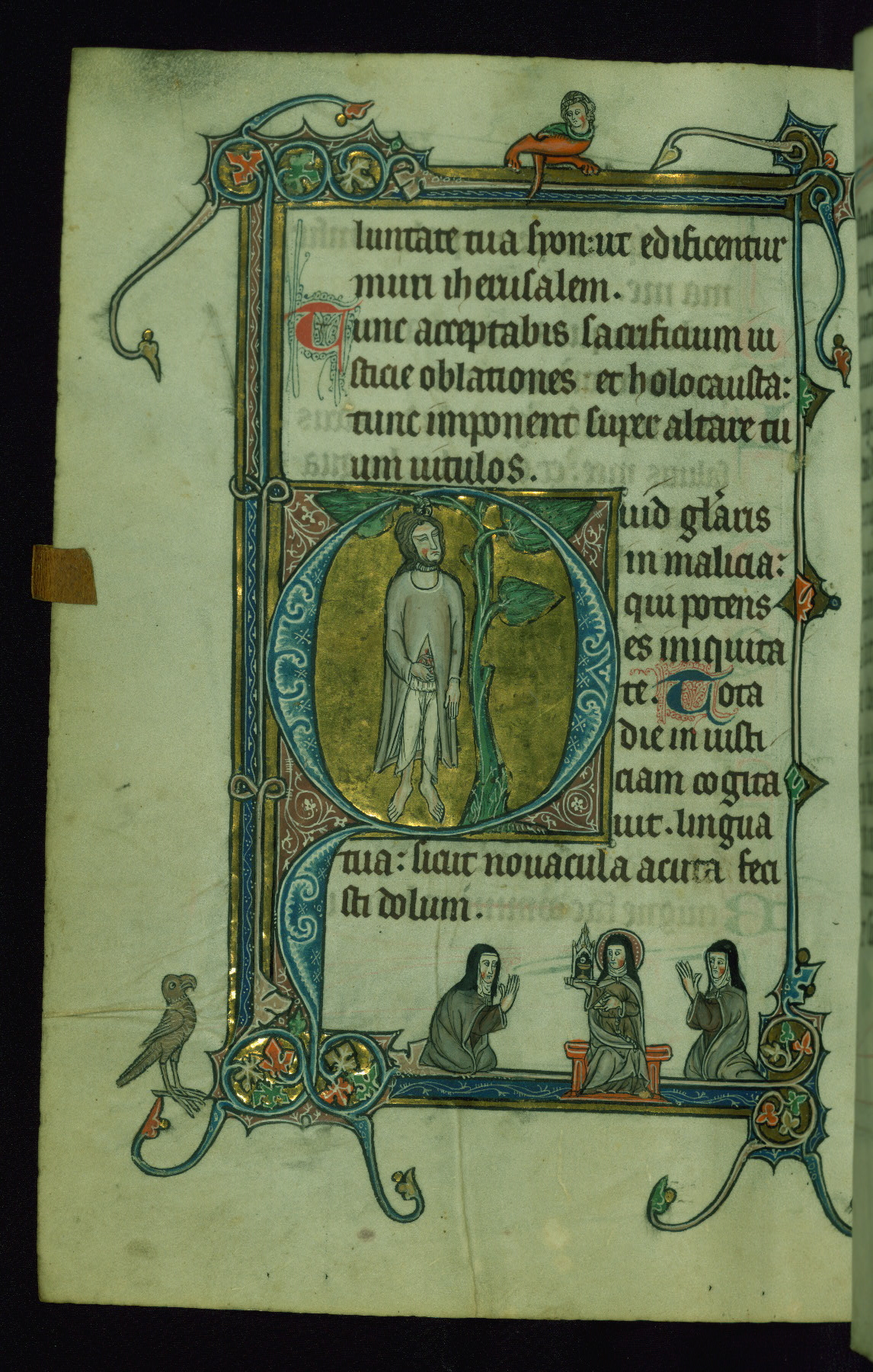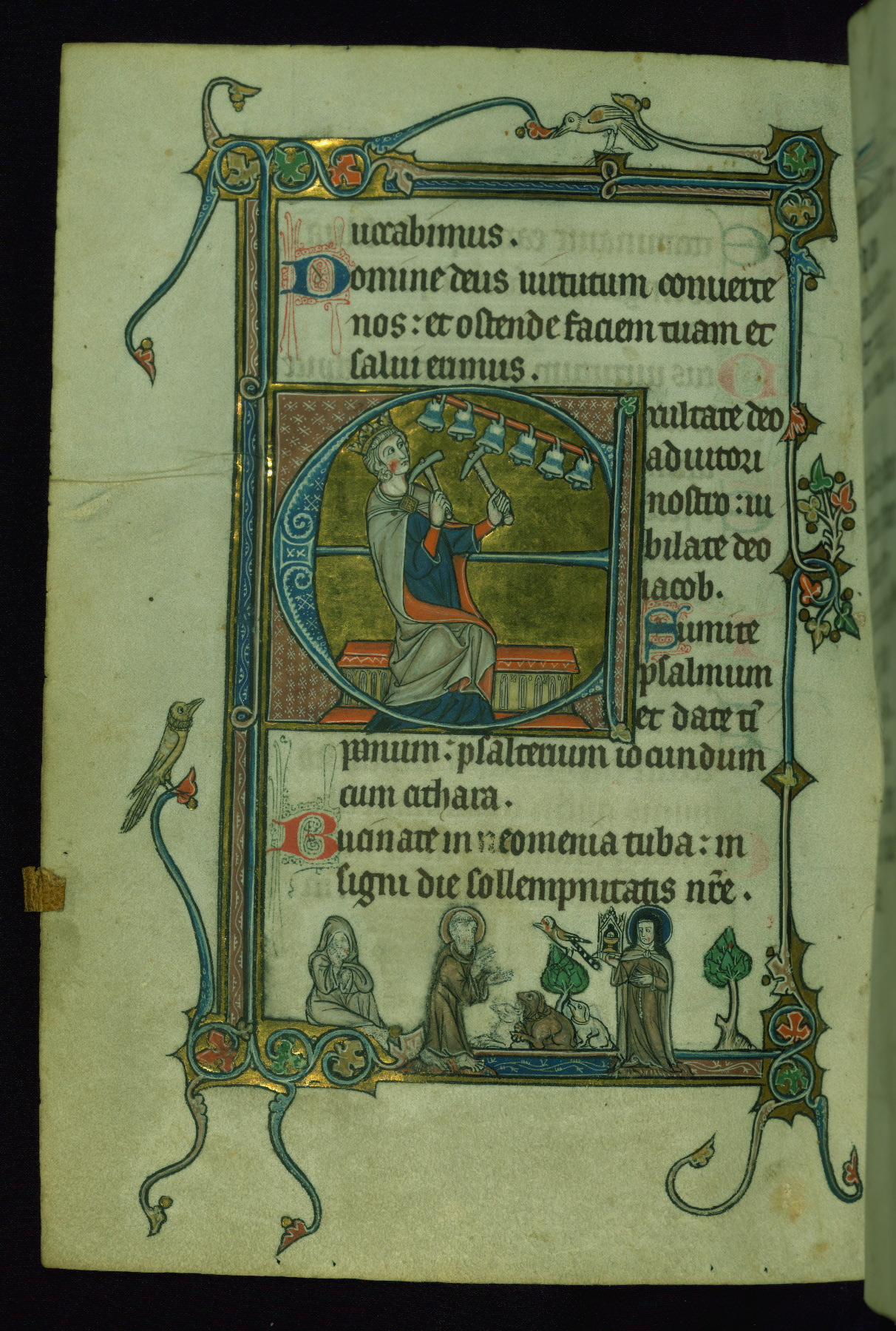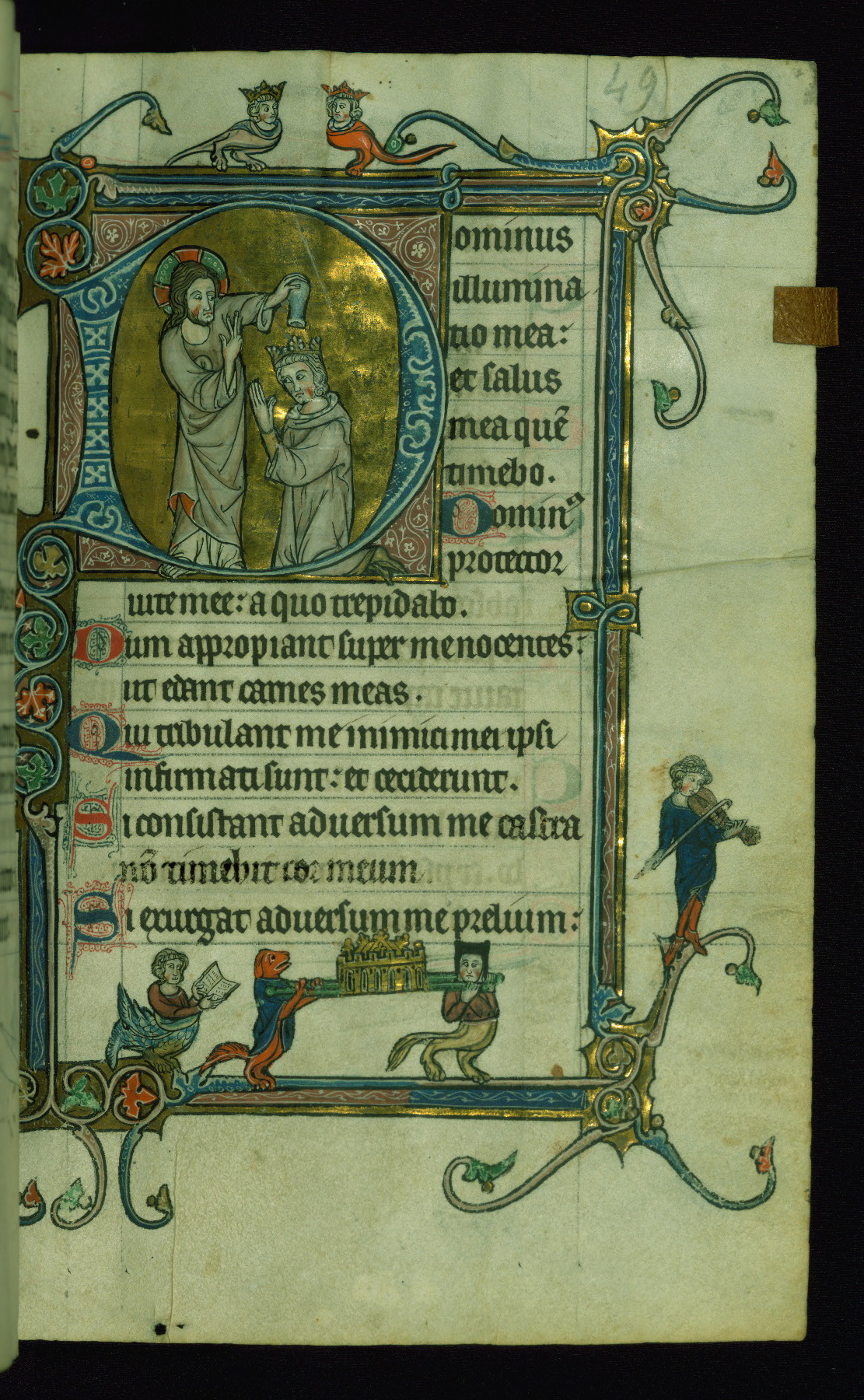 - Title: Initial "D" with Christ anointing David; man plays viele, and dog and hybrid man carry reliquary in margin