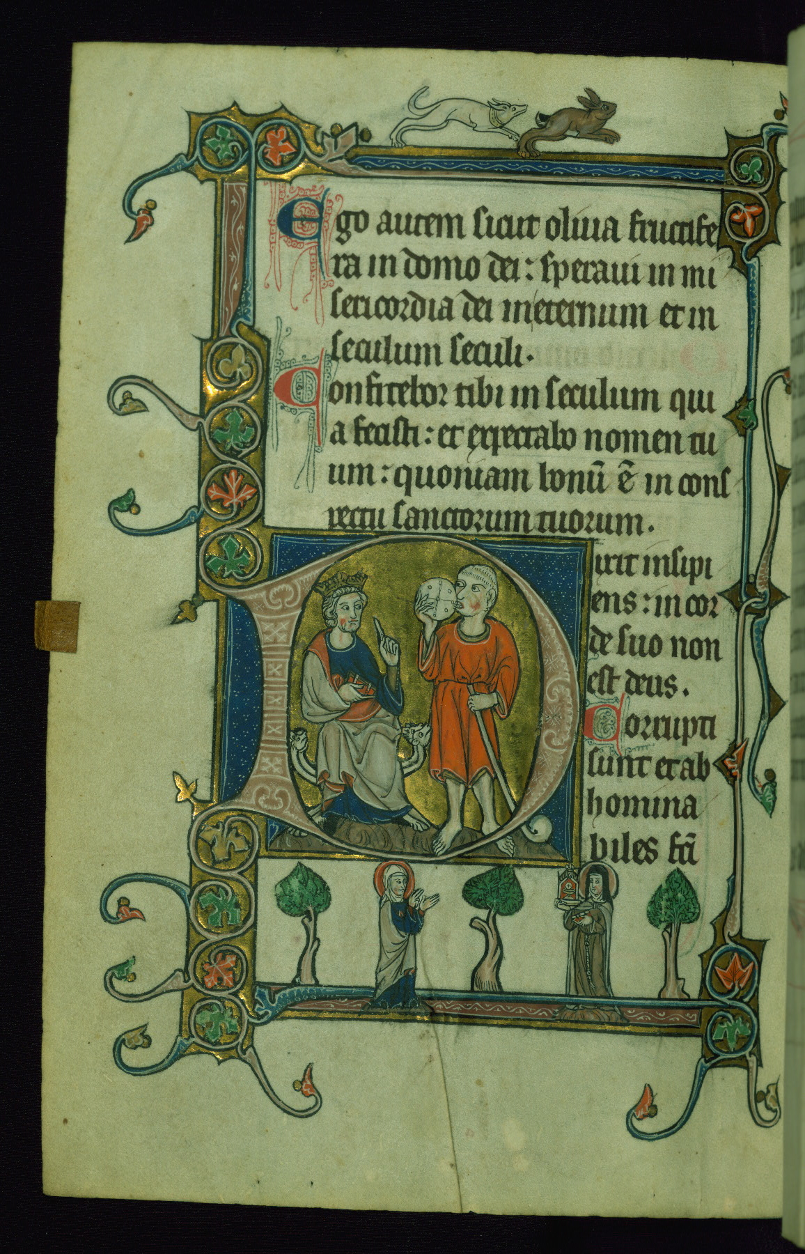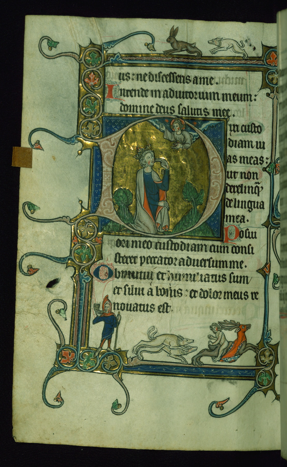 - Title: Initial "D" with David pointing to mouth before God; dogs hunting, man riding stag in margin