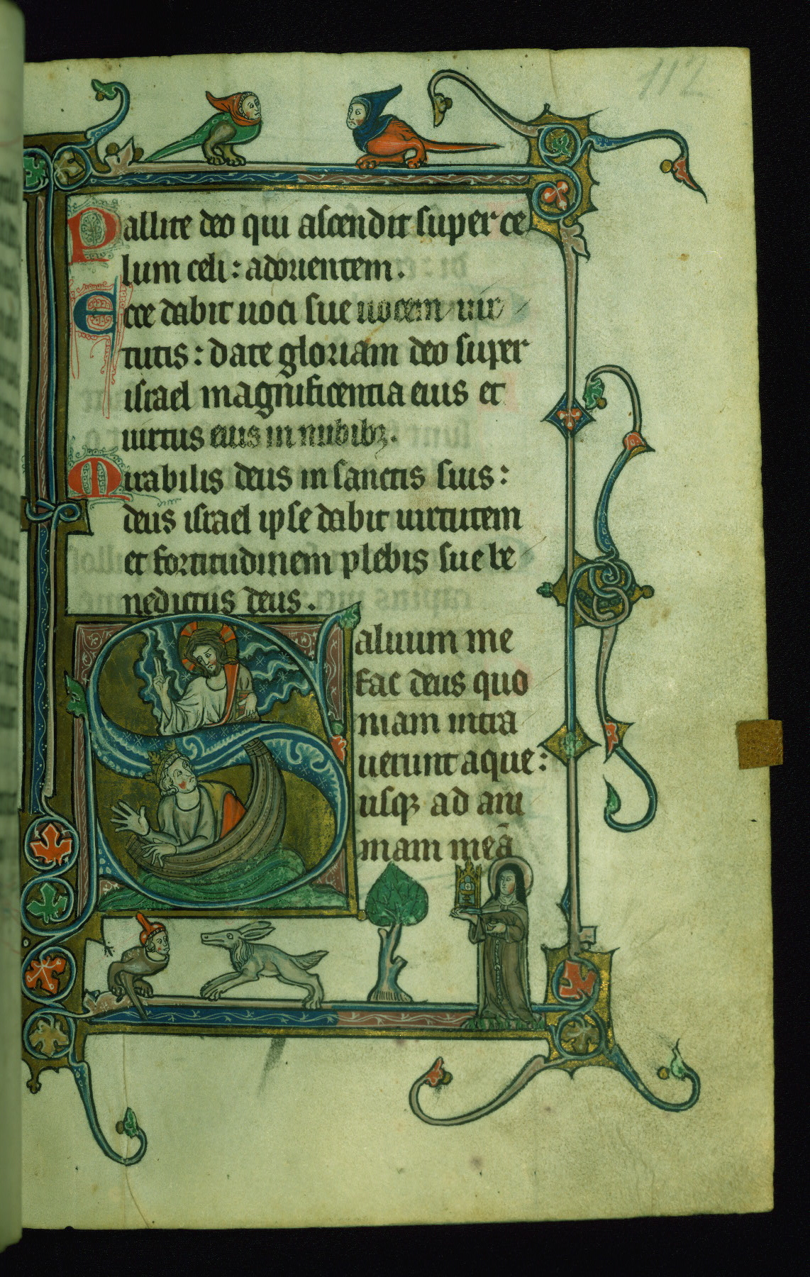 - Title: Initial "S" with Christ blessing above, and David in a boat below; St. Clare holding monstrance in margin