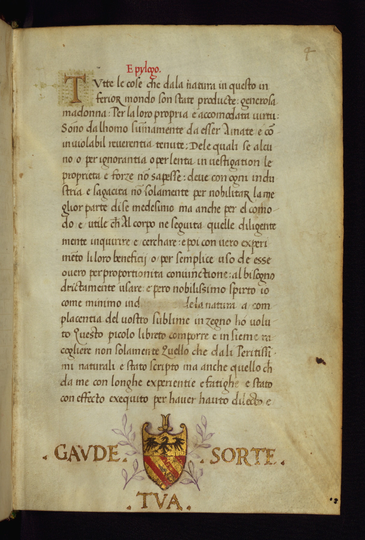- Label: This heraldry perhaps belongs to the first owners of the manuscript. In the main field of the heraldry an eagle sable with outstretched wings is depicted with three "bends gules" (stripes angled to the right) in red and gold below. On either side of the heraldry in purple ink is a foliate motif along with the inscription "Gaude Tua Sorte" in gold leaf.