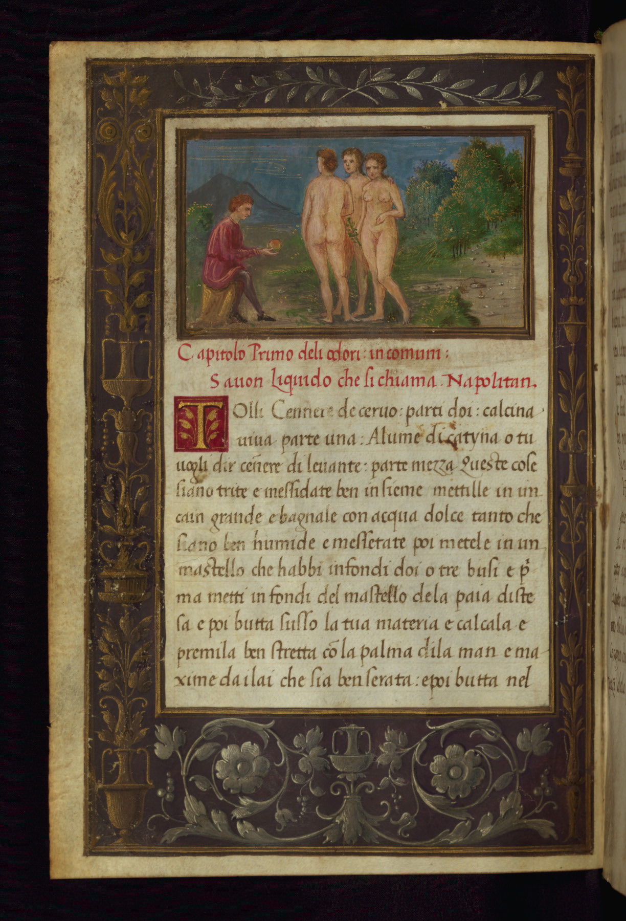 This Italian manuscript, written in Venetian dialect, was produced ca. 1500, and contains various recipes and remedies for the wellbeing and beauty of women. This text, like most cosmetic treatises in the vernacular, is addressed specifically to a female audience. The text's focus on beauty and appearance is emphasized by the miniature on its opening page, where we see the Judgement of Paris. The Trojan hero Paris was asked to judge a beauty contest between Aphrodite, Hera, and Athena. He chose Aphrodite because she promised him the hand of Helen, known as the most beautiful woman in the world. Although the origin of this text is unknown, it follows in the tradition of those which focus specifically on cosmetics. One such example is the 12th century "Trotula" text that is believed to have originated in Salerno (Italy) and is comprised of three distinct works. One of them (De ornatu mulierum) was dedicated to cosmetics, whereas the other two dealt with obstetrics/gynecology and women's diseases respectively. The "Trotula" corpus was immensely popular and survives in nearly 200 copies in both Latin and various vernacular translations. The Walters treatise, on the other hand, survives only in one partial copy at the Wellcome Library (MS 531) in London, which is missing the prologue as well as a significant portion of the book itself.
