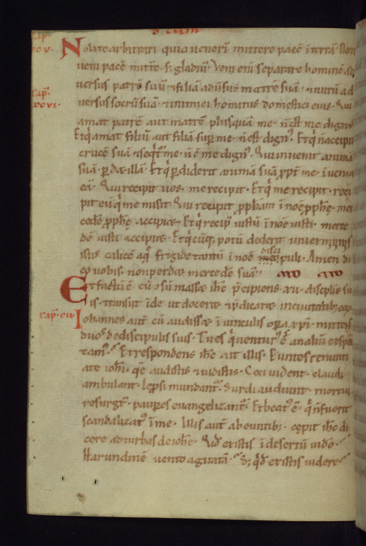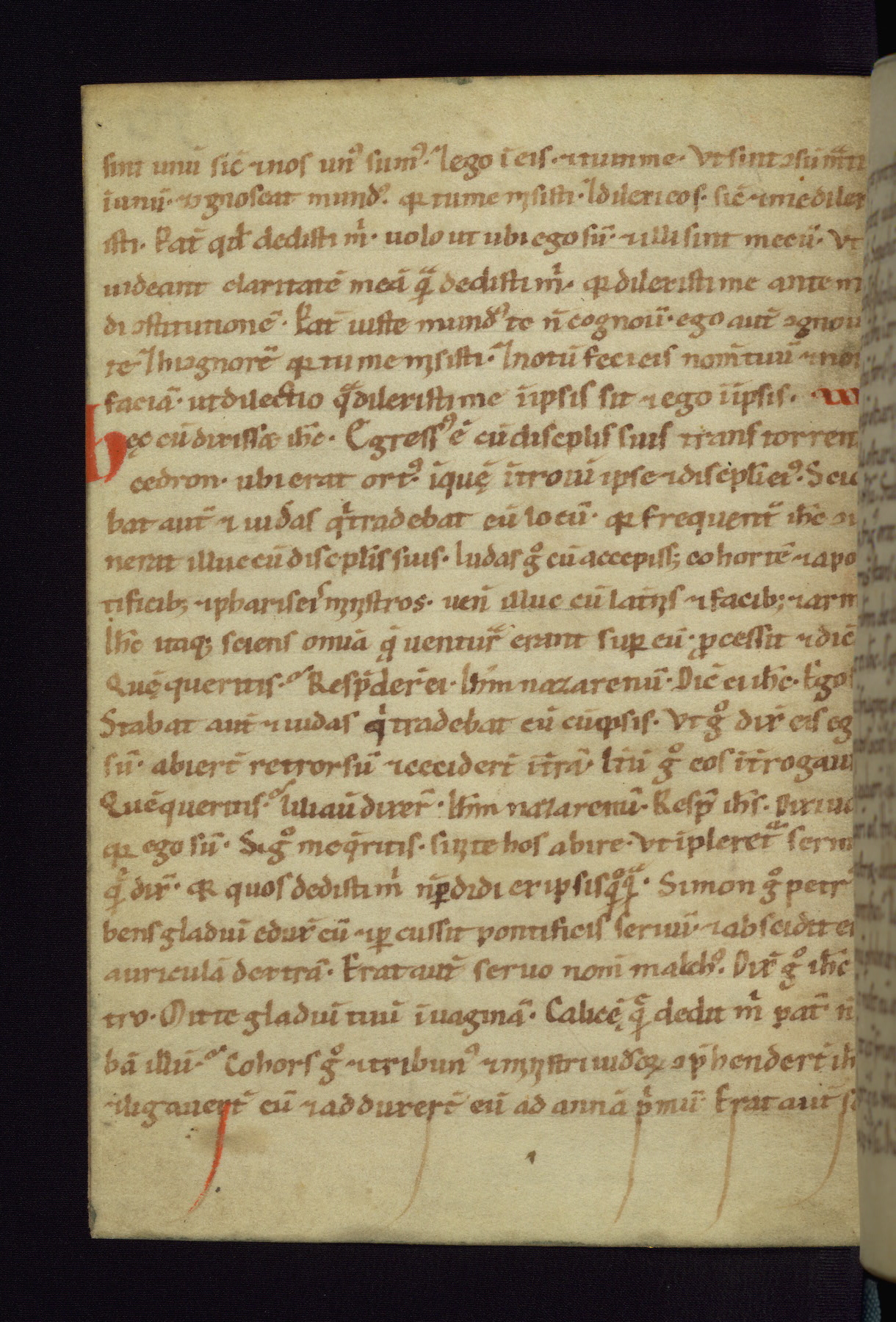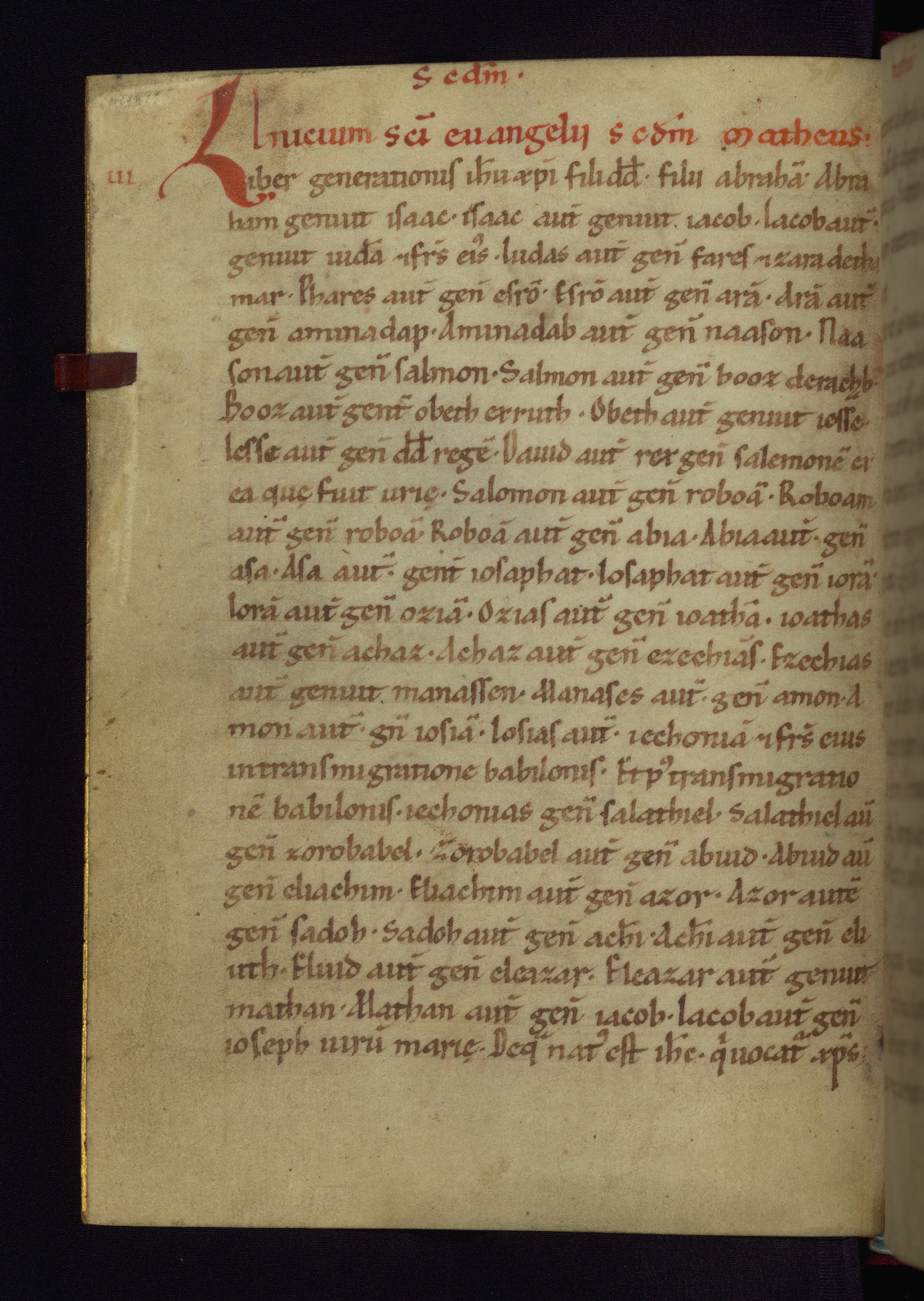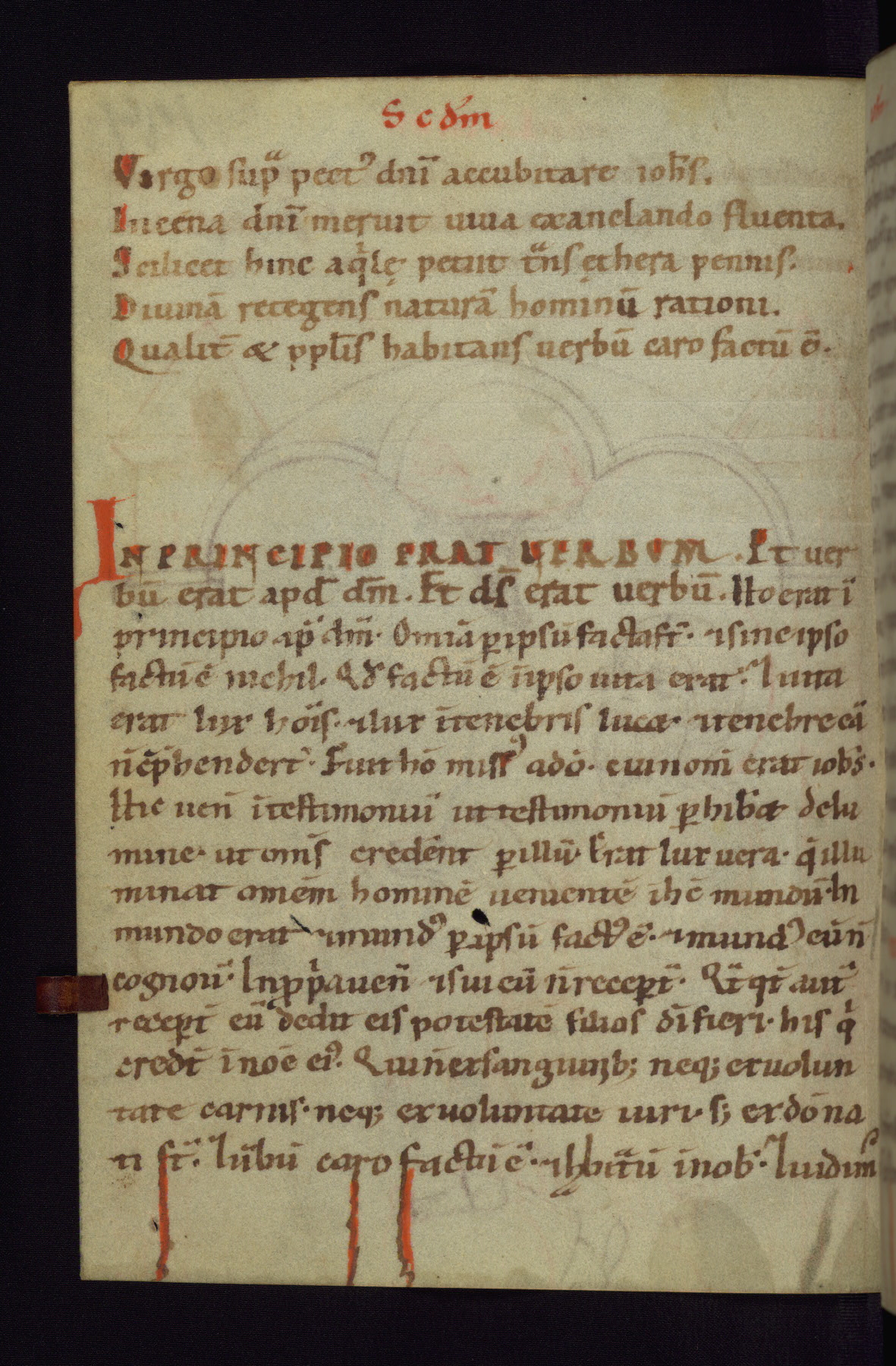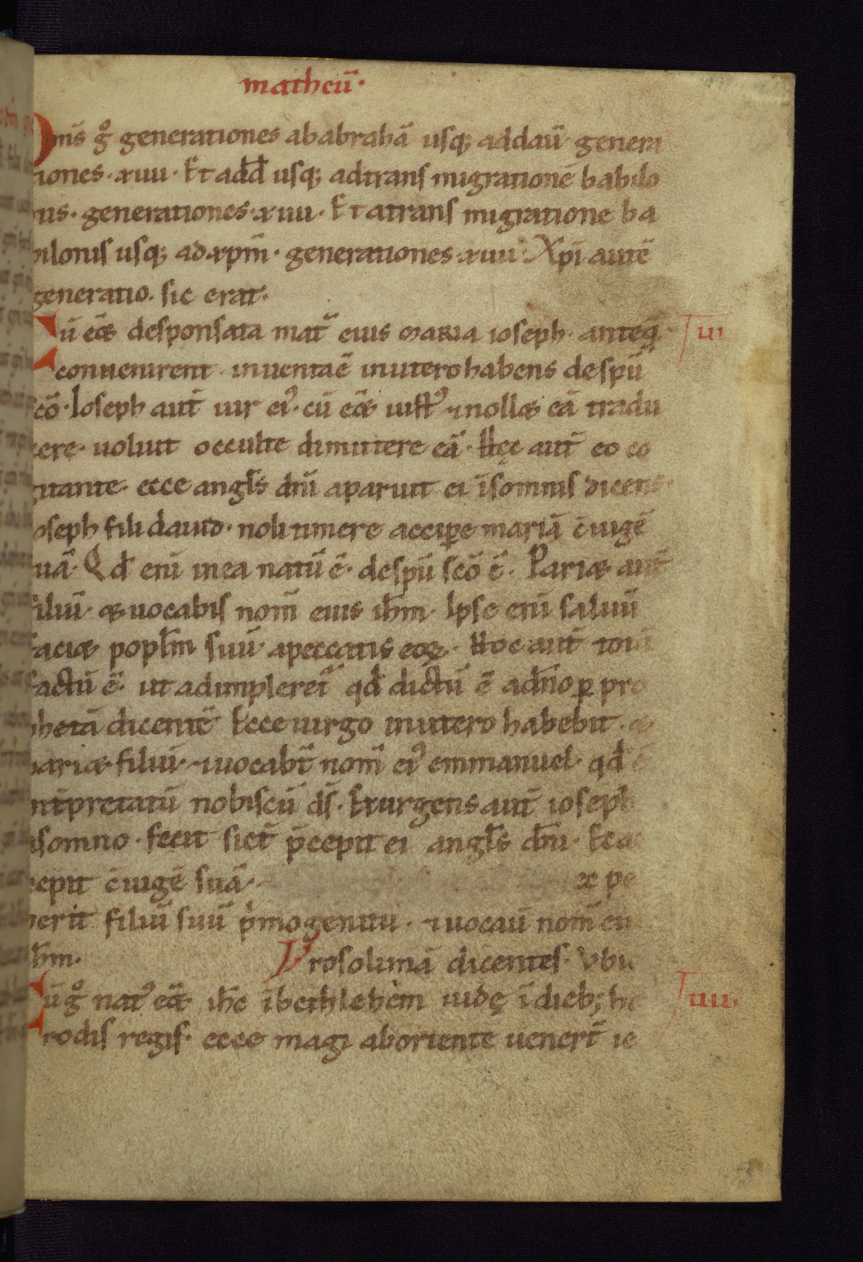 This small Gospel Book was made in Werden, Germany, in the eleventh century. Its size indicates that it was intended for daily, personal use, and a series of ownership inscriptions on the first folio, which trace the ownership of the manuscript among several members of the clergy, provides insight into its use. Although the book contains little decoration, with no canon tables or ornamental initials, the Gospels are introduced by three brown- and red-ink pen drawings of the Evangelists, two of which were embedded into the end of the previous Gospel by the artist. The manuscript is, however, incomplete and lacks the end of Matthew as well as the portrait of Mark, which was likely incorporated into Matthew's explicit page, as was done with the other portraits.