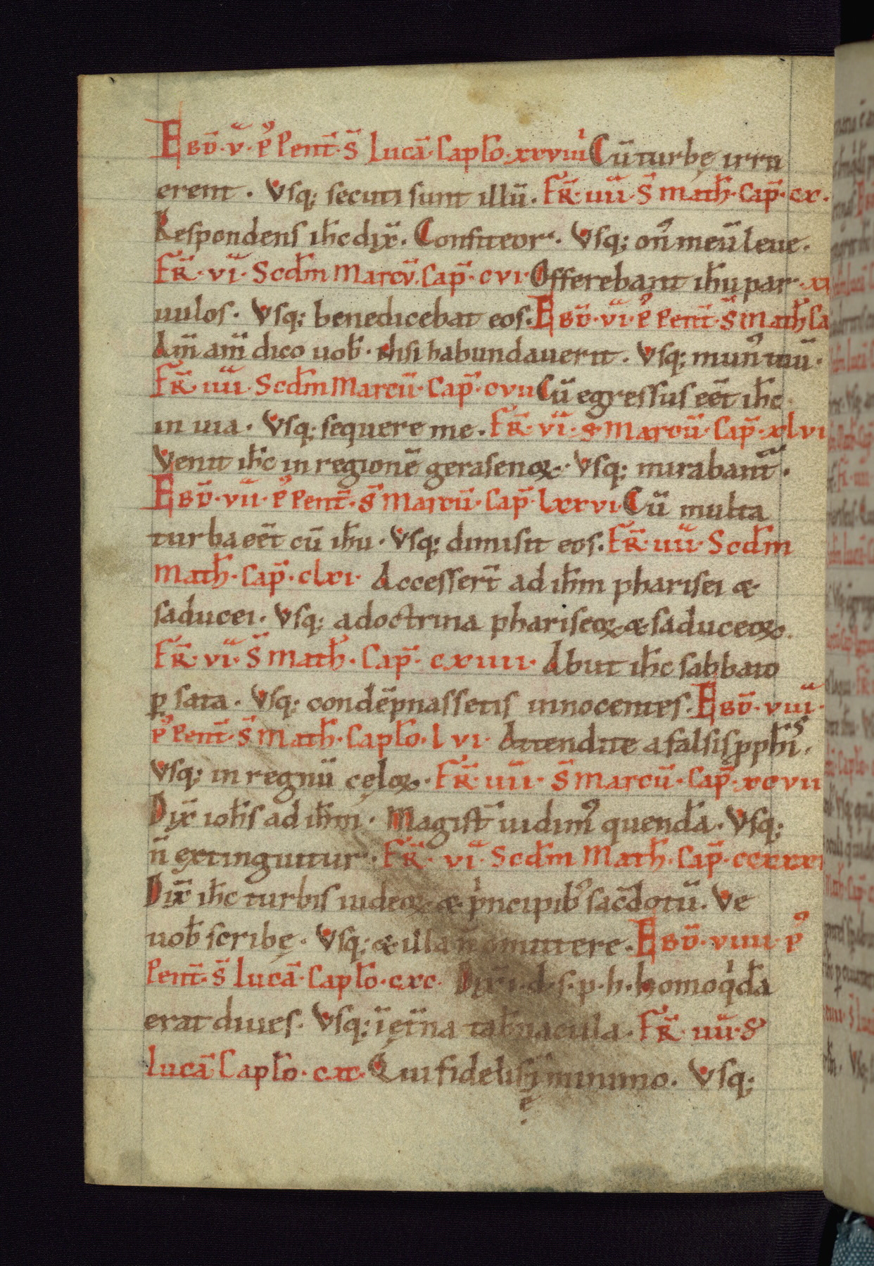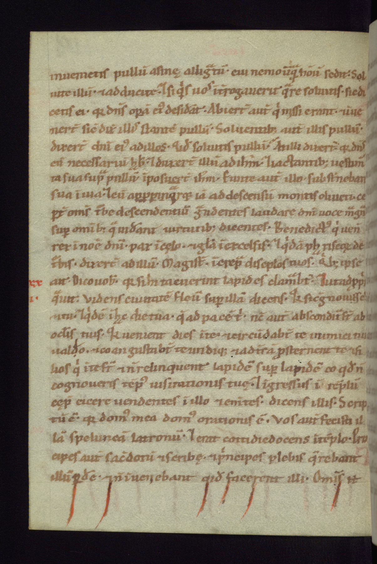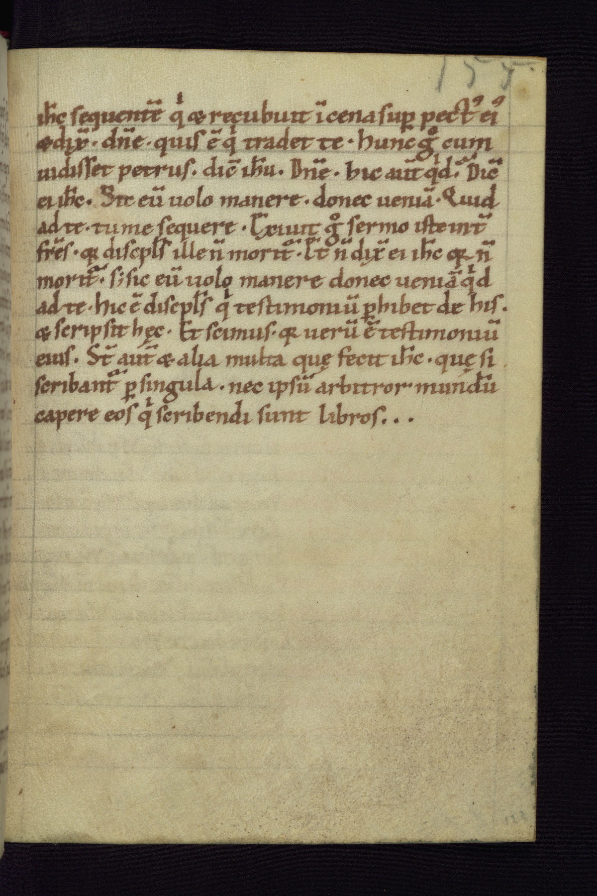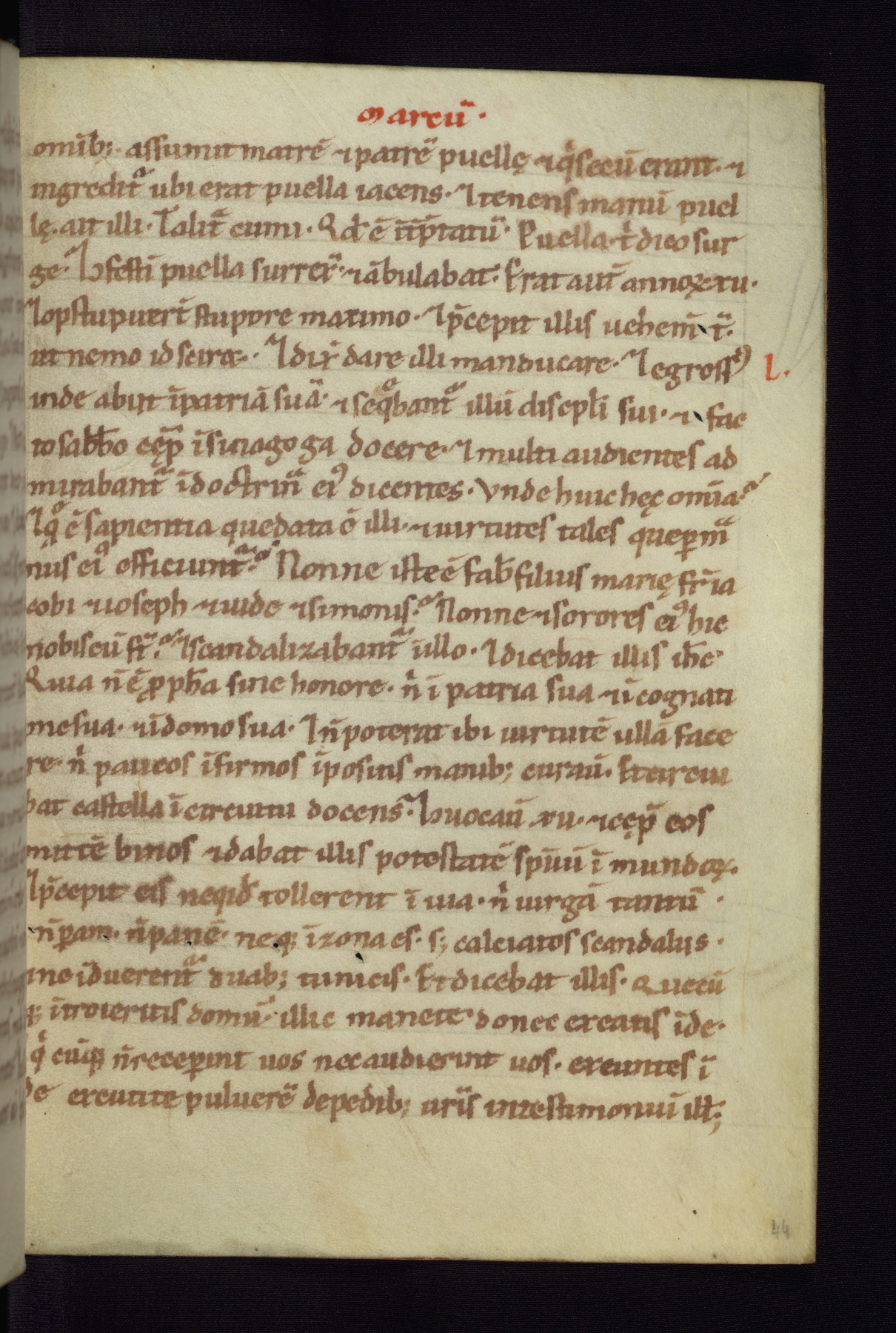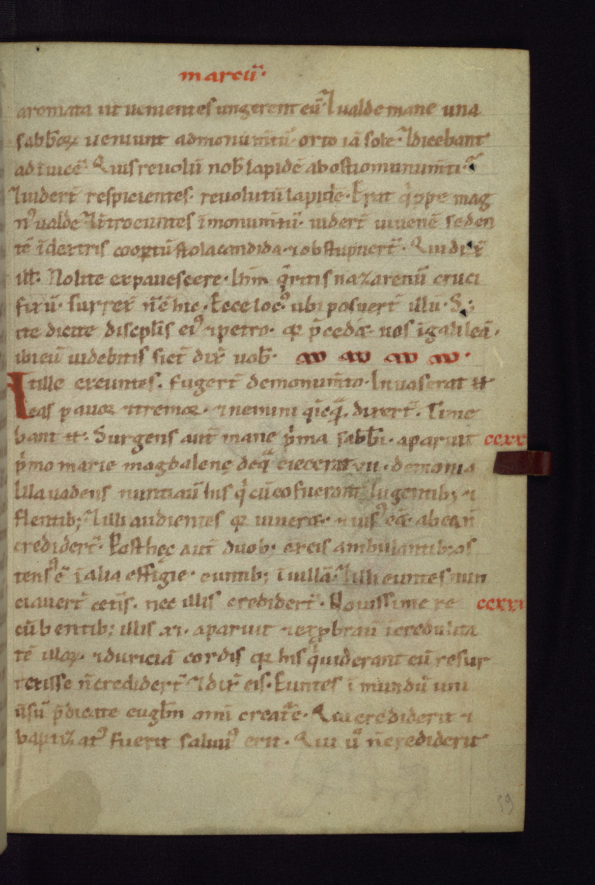This small Gospel Book was made in Werden, Germany, in the eleventh century. Its size indicates that it was intended for daily, personal use, and a series of ownership inscriptions on the first folio, which trace the ownership of the manuscript among several members of the clergy, provides insight into its use. Although the book contains little decoration, with no canon tables or ornamental initials, the Gospels are introduced by three brown- and red-ink pen drawings of the Evangelists, two of which were embedded into the end of the previous Gospel by the artist. The manuscript is, however, incomplete and lacks the end of Matthew as well as the portrait of Mark, which was likely incorporated into Matthew's explicit page, as was done with the other portraits.