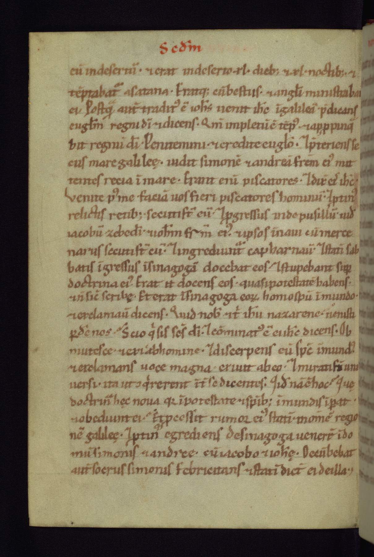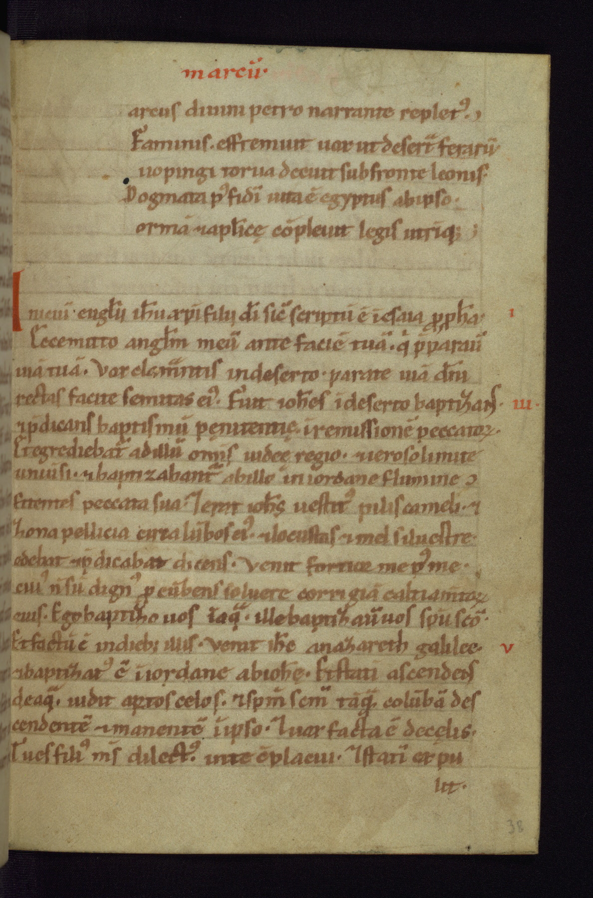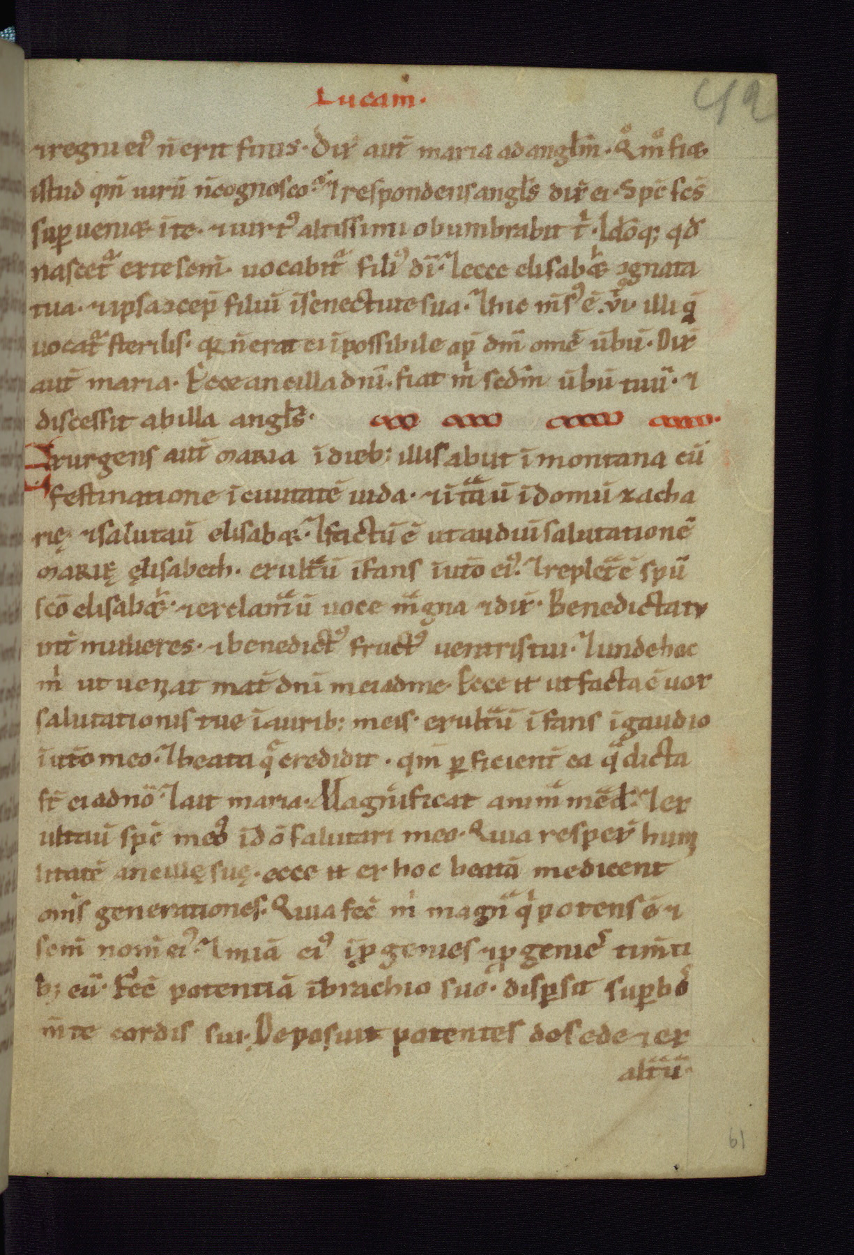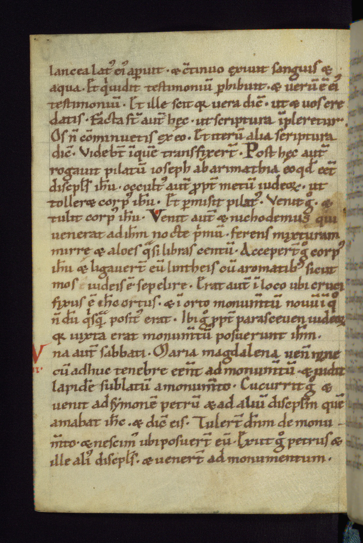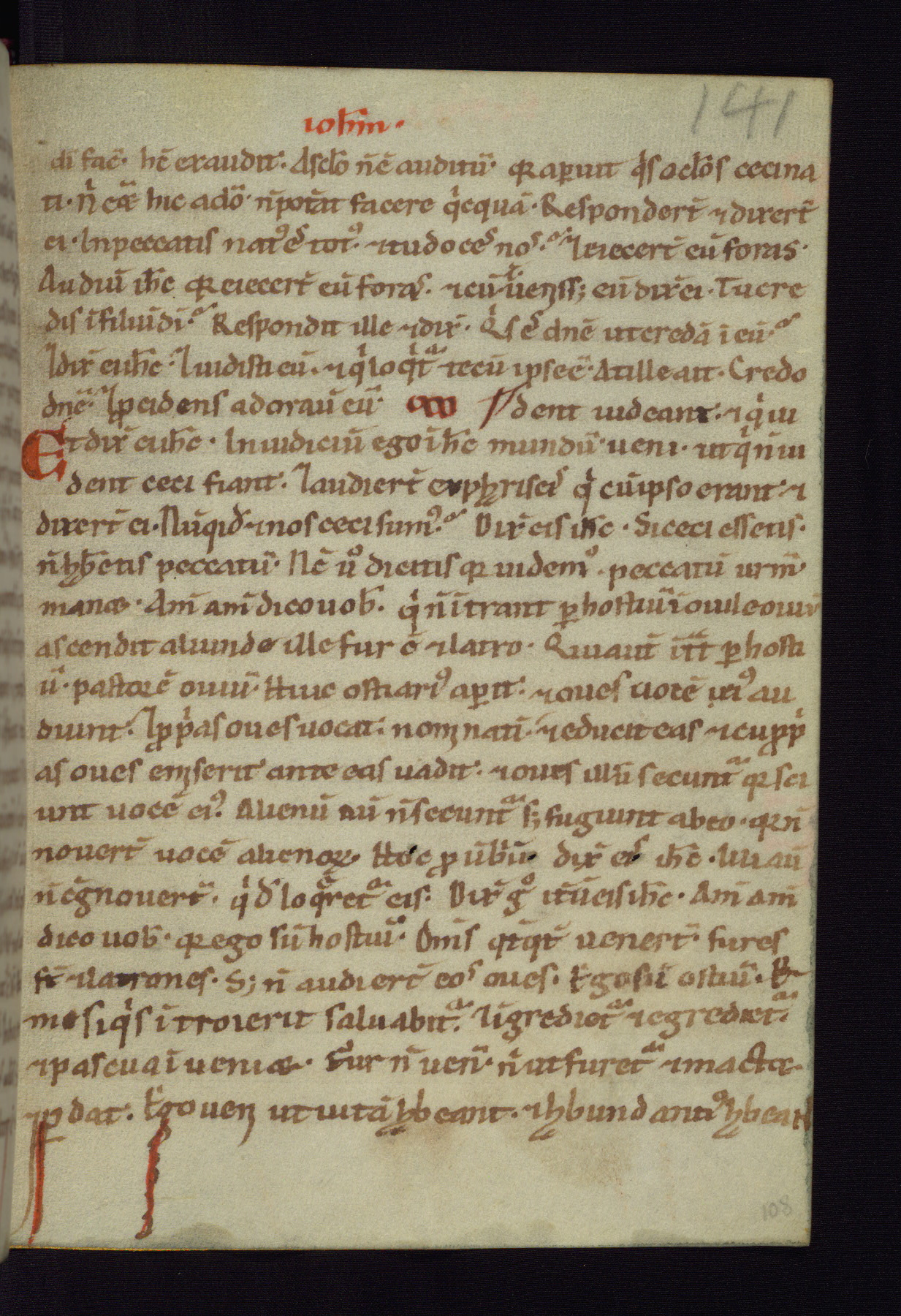 This small Gospel Book was made in Werden, Germany, in the eleventh century. Its size indicates that it was intended for daily, personal use, and a series of ownership inscriptions on the first folio, which trace the ownership of the manuscript among several members of the clergy, provides insight into its use. Although the book contains little decoration, with no canon tables or ornamental initials, the Gospels are introduced by three brown- and red-ink pen drawings of the Evangelists, two of which were embedded into the end of the previous Gospel by the artist. The manuscript is, however, incomplete and lacks the end of Matthew as well as the portrait of Mark, which was likely incorporated into Matthew's explicit page, as was done with the other portraits.