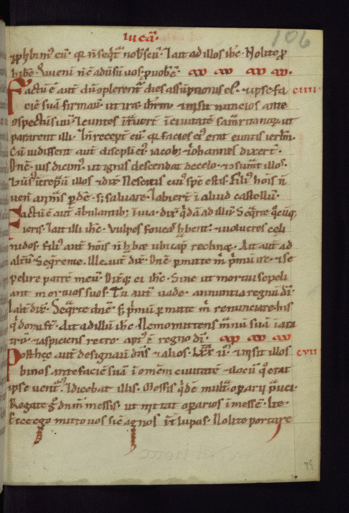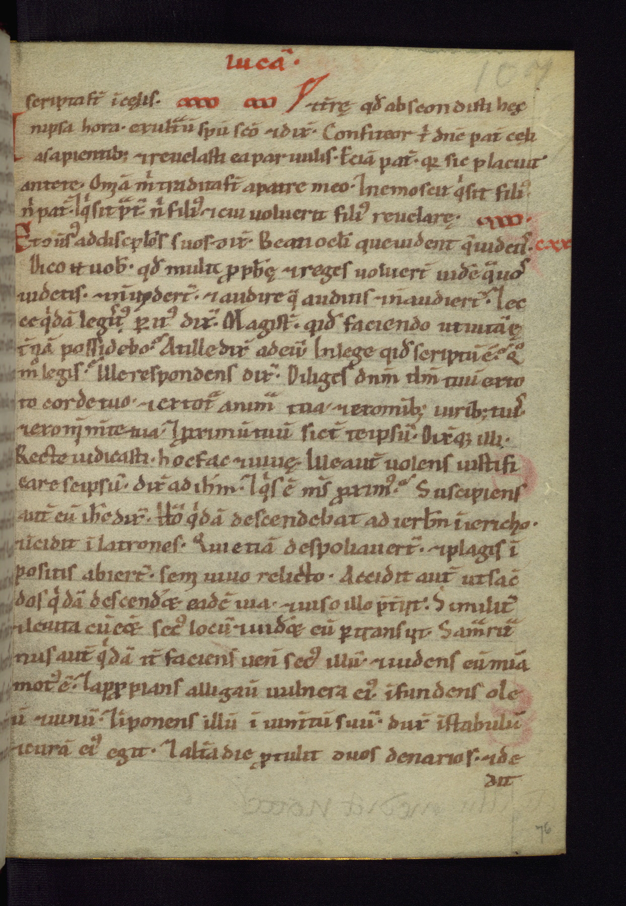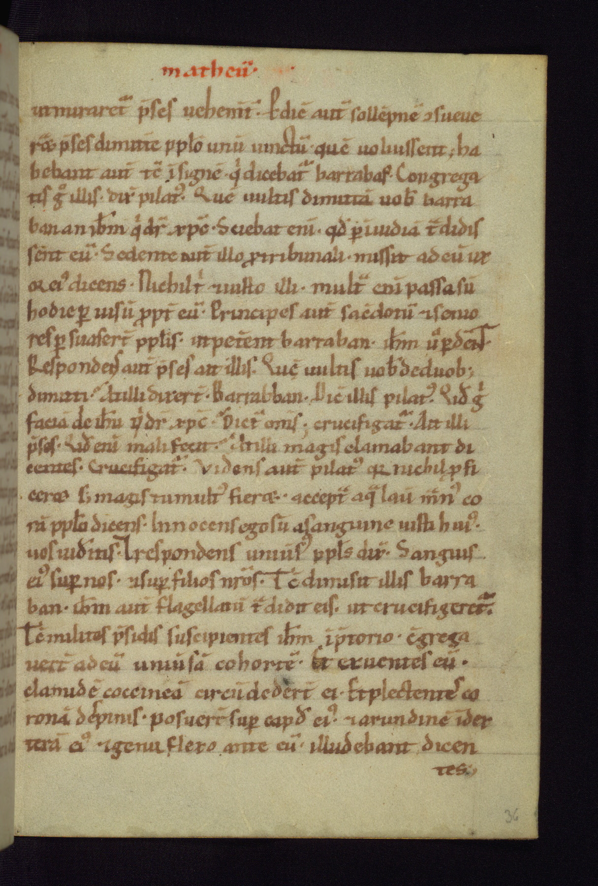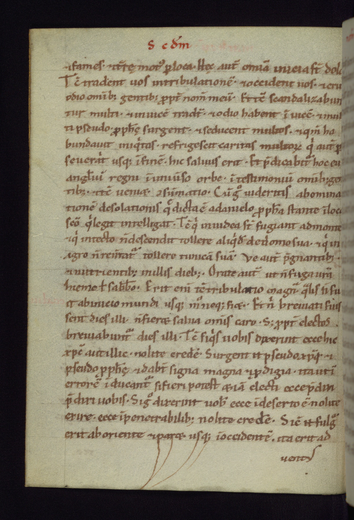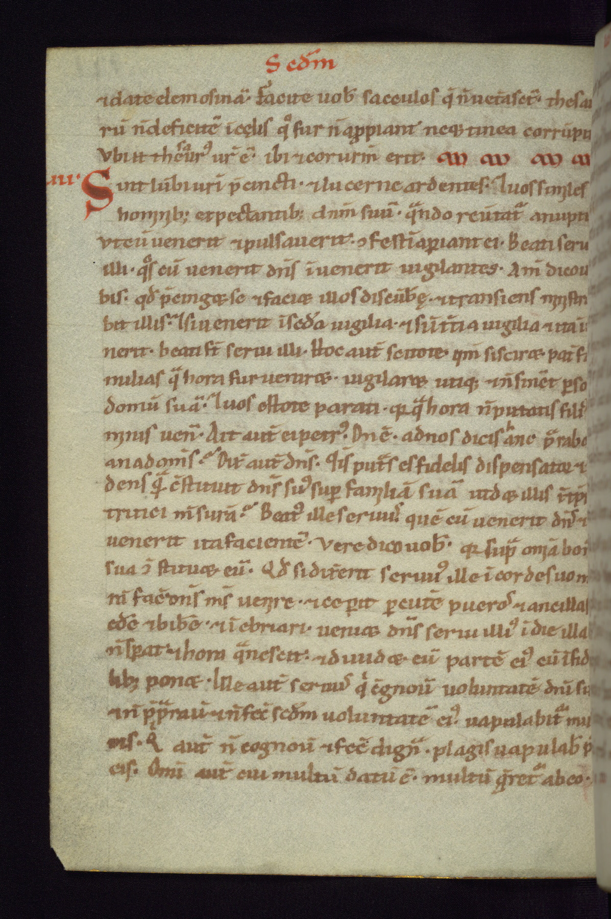 This small Gospel Book was made in Werden, Germany, in the eleventh century. Its size indicates that it was intended for daily, personal use, and a series of ownership inscriptions on the first folio, which trace the ownership of the manuscript among several members of the clergy, provides insight into its use. Although the book contains little decoration, with no canon tables or ornamental initials, the Gospels are introduced by three brown- and red-ink pen drawings of the Evangelists, two of which were embedded into the end of the previous Gospel by the artist. The manuscript is, however, incomplete and lacks the end of Matthew as well as the portrait of Mark, which was likely incorporated into Matthew's explicit page, as was done with the other portraits.