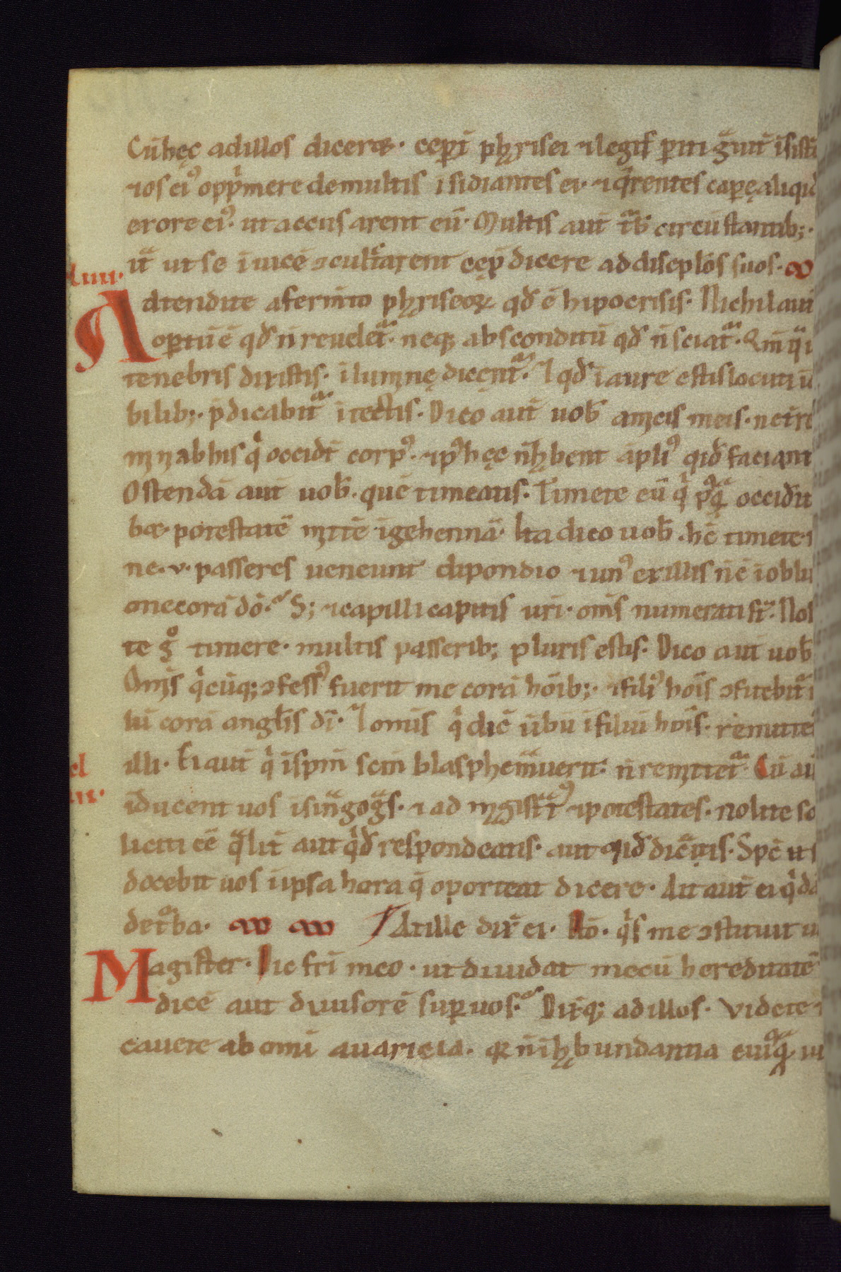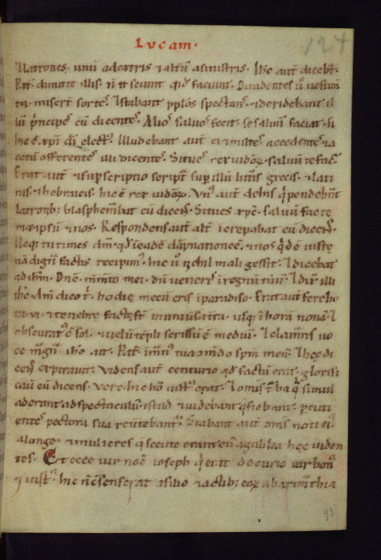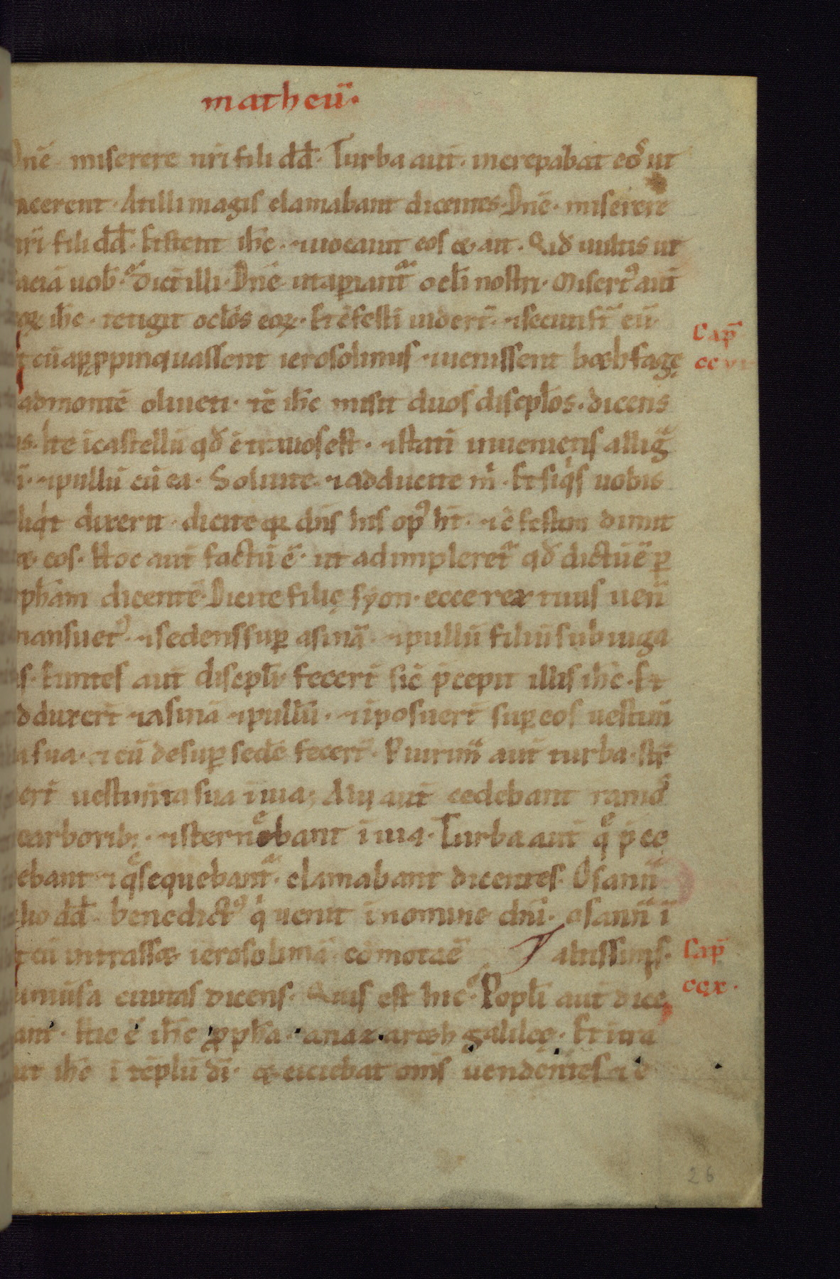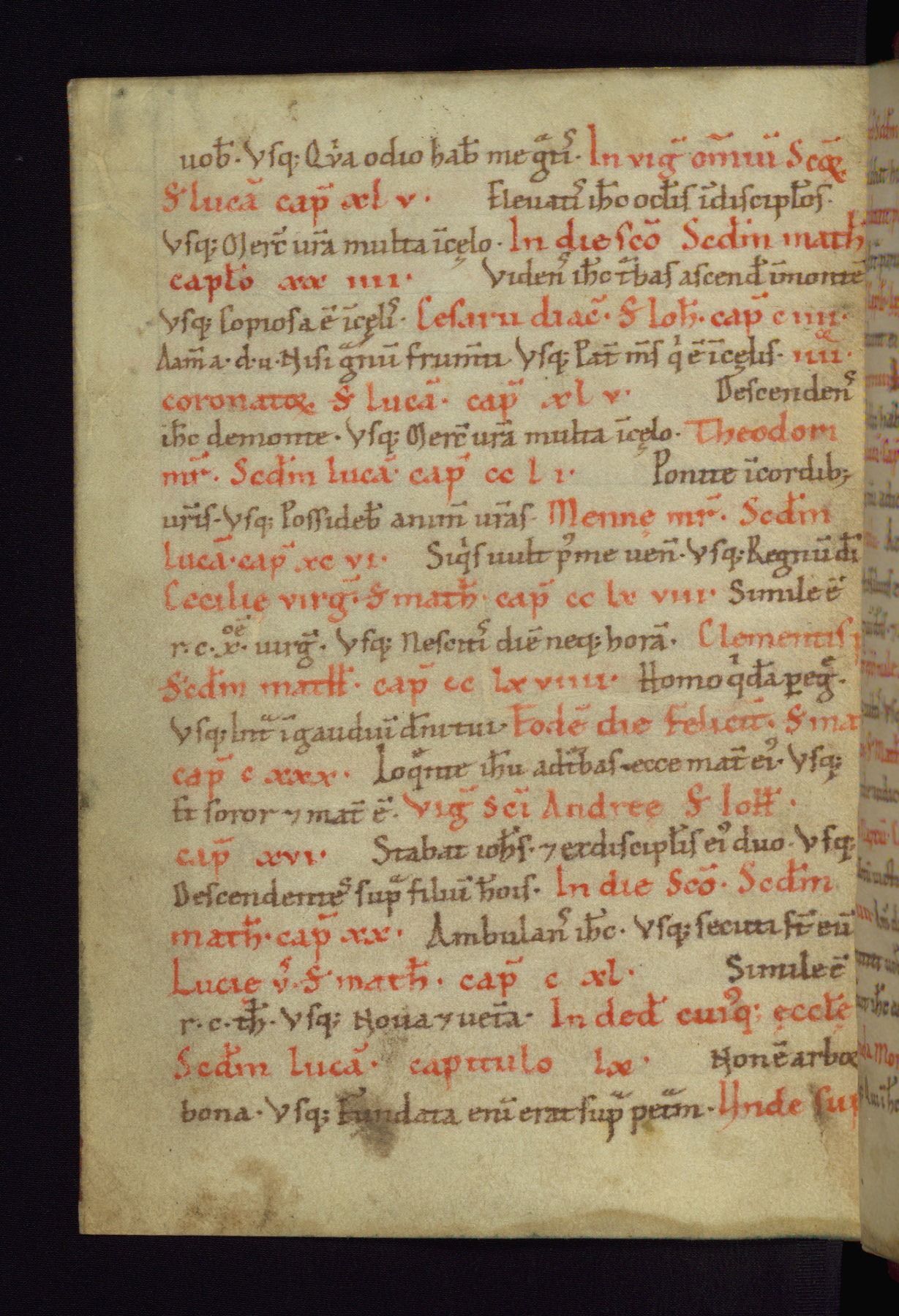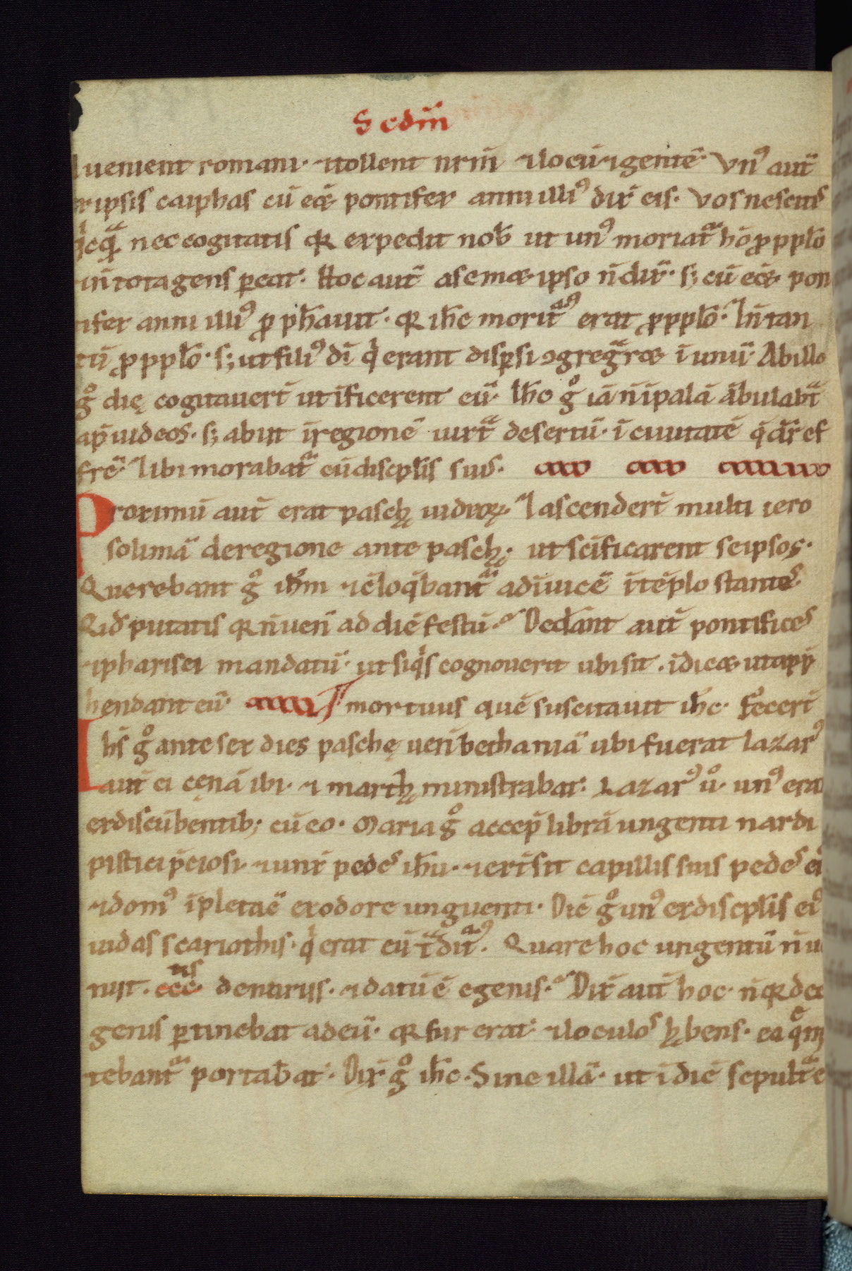 This small Gospel Book was made in Werden, Germany, in the eleventh century. Its size indicates that it was intended for daily, personal use, and a series of ownership inscriptions on the first folio, which trace the ownership of the manuscript among several members of the clergy, provides insight into its use. Although the book contains little decoration, with no canon tables or ornamental initials, the Gospels are introduced by three brown- and red-ink pen drawings of the Evangelists, two of which were embedded into the end of the previous Gospel by the artist. The manuscript is, however, incomplete and lacks the end of Matthew as well as the portrait of Mark, which was likely incorporated into Matthew's explicit page, as was done with the other portraits.