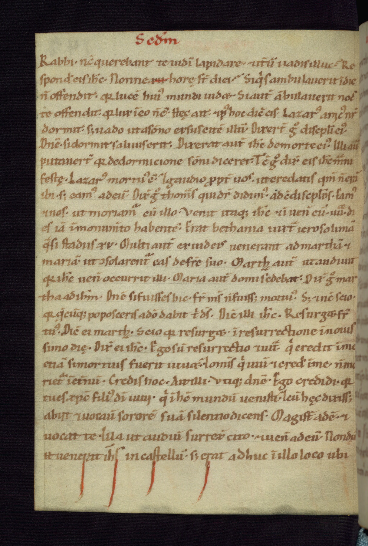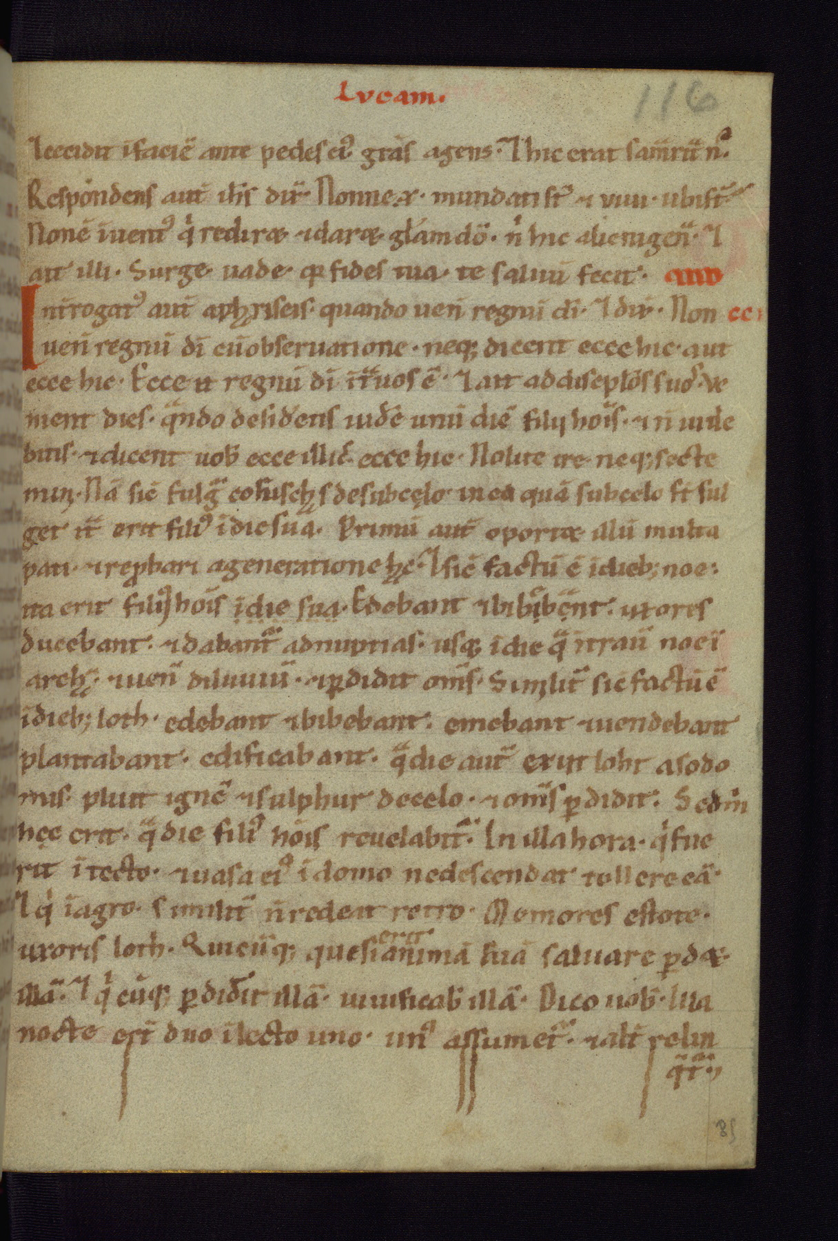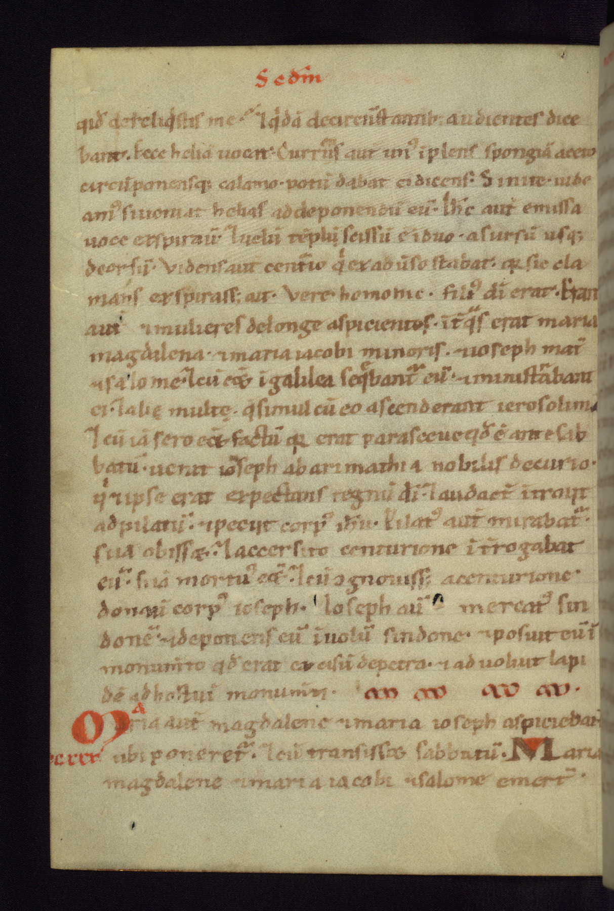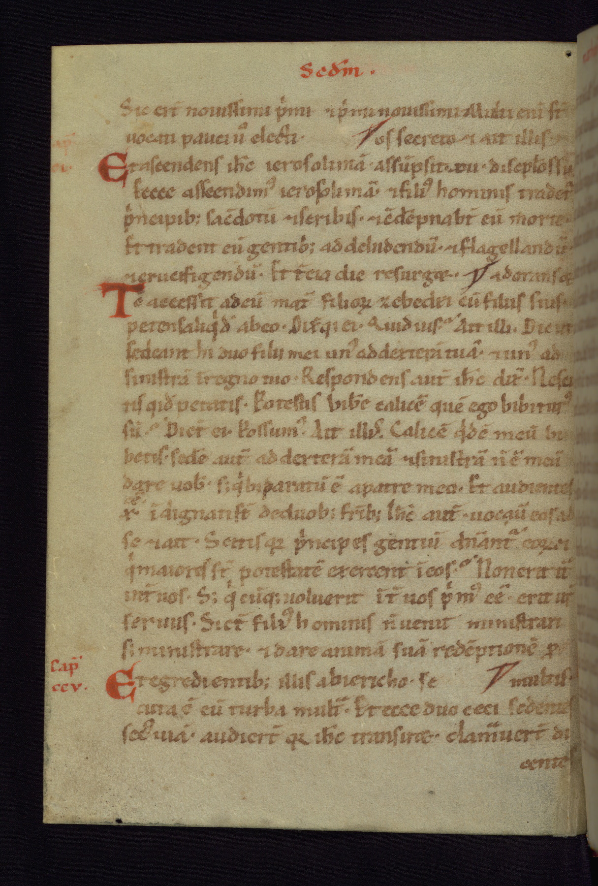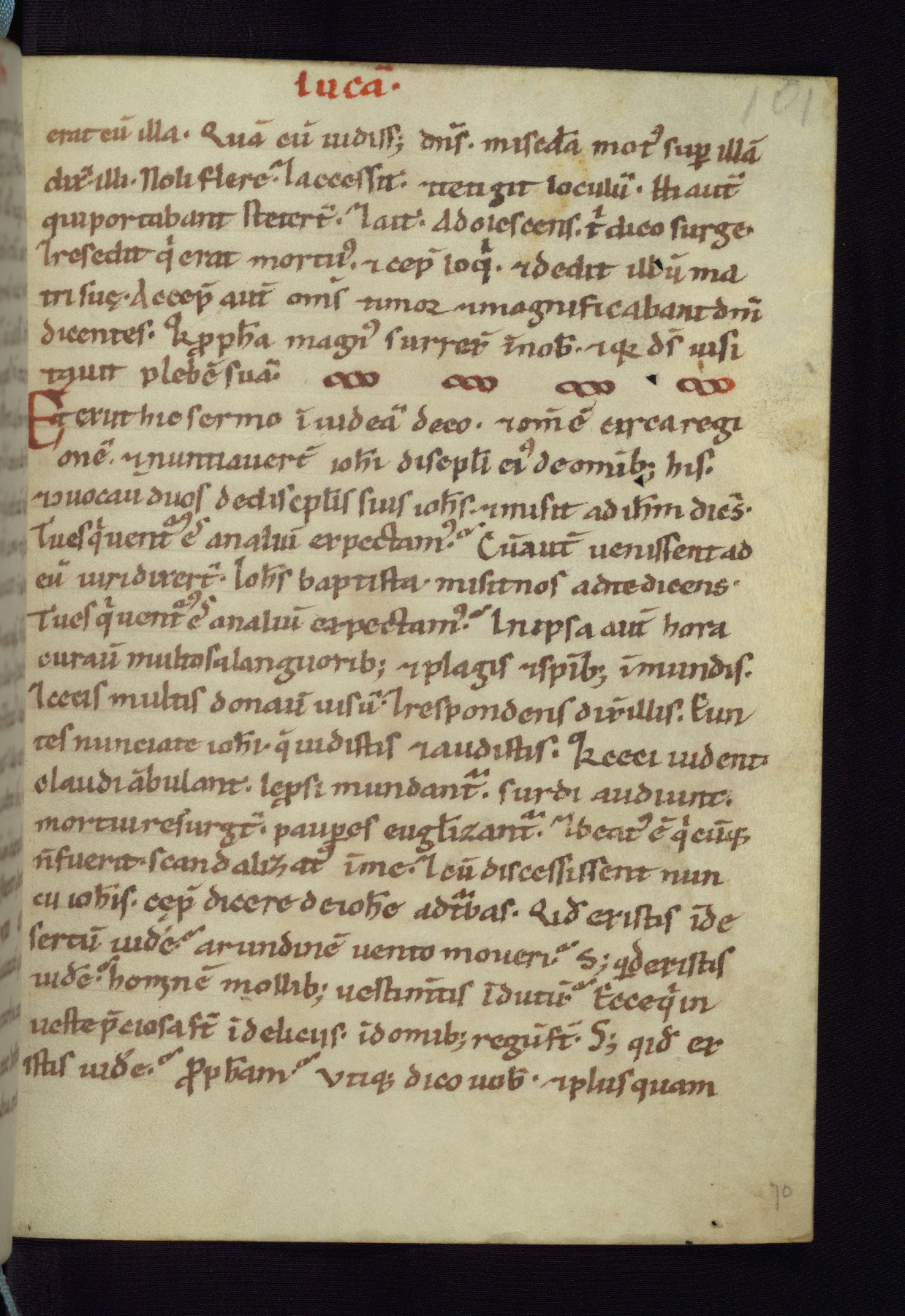 This small Gospel Book was made in Werden, Germany, in the eleventh century. Its size indicates that it was intended for daily, personal use, and a series of ownership inscriptions on the first folio, which trace the ownership of the manuscript among several members of the clergy, provides insight into its use. Although the book contains little decoration, with no canon tables or ornamental initials, the Gospels are introduced by three brown- and red-ink pen drawings of the Evangelists, two of which were embedded into the end of the previous Gospel by the artist. The manuscript is, however, incomplete and lacks the end of Matthew as well as the portrait of Mark, which was likely incorporated into Matthew's explicit page, as was done with the other portraits.