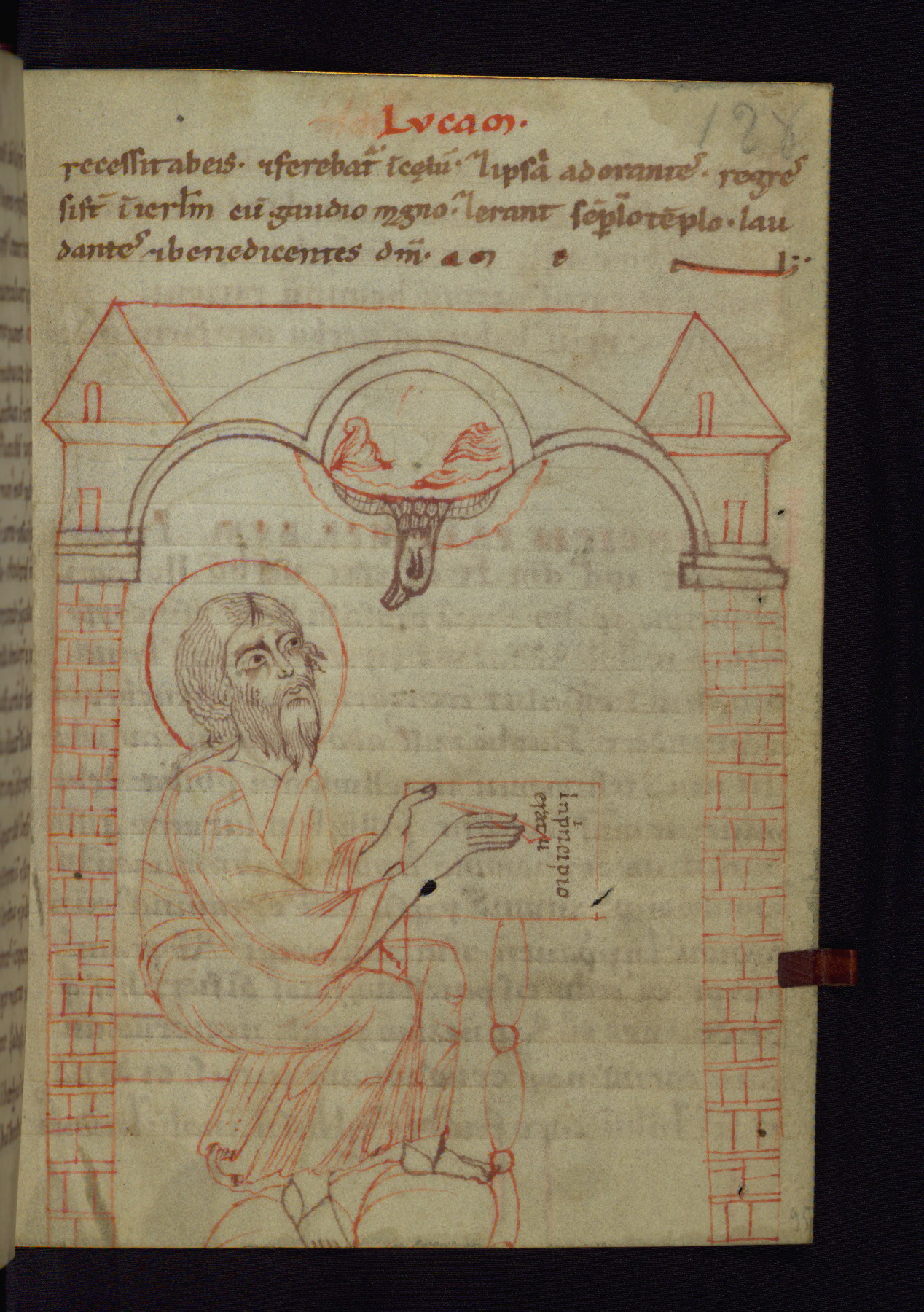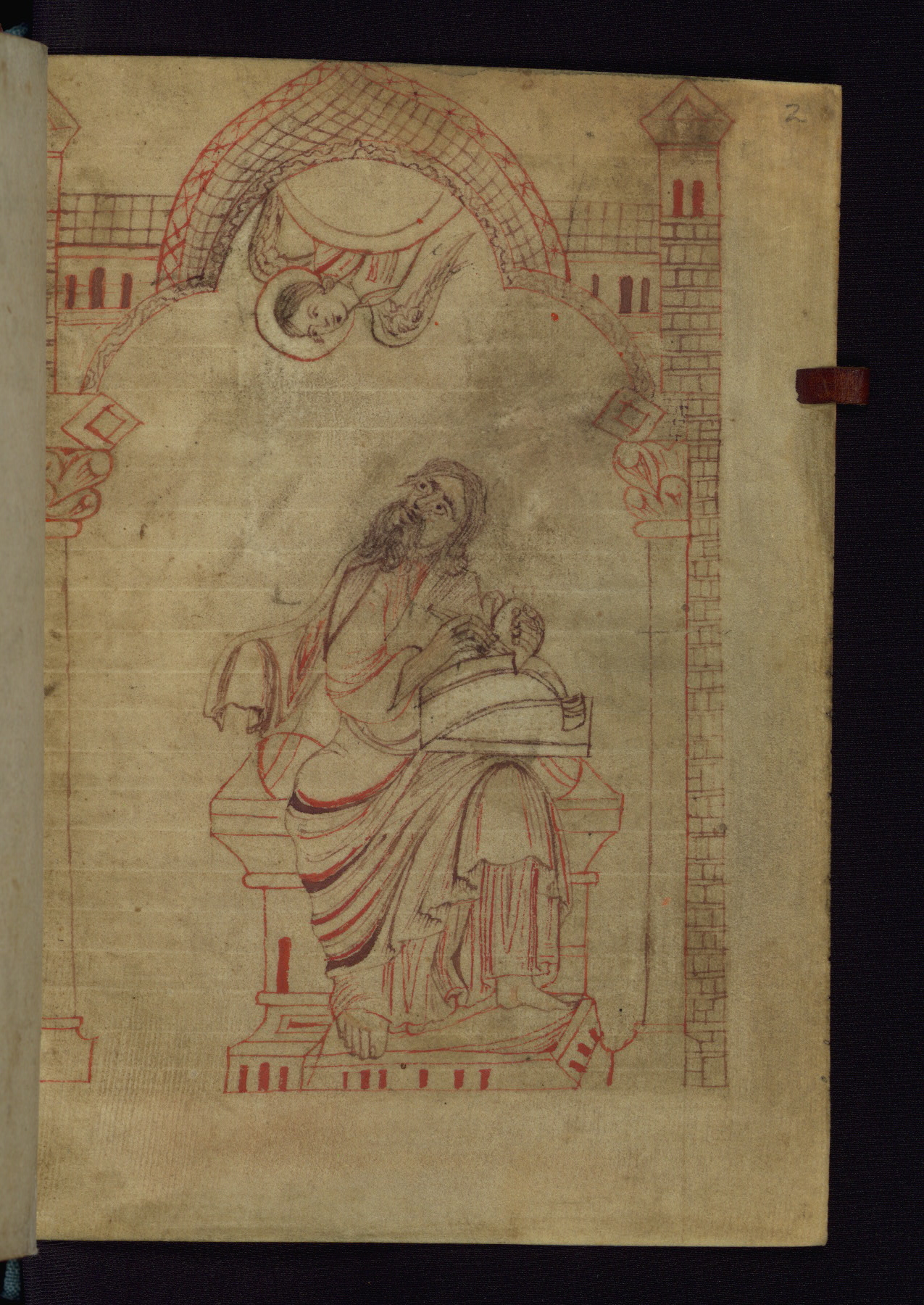 - Decoration note: Full-page Evangelist portrait before Matthew (fol. 2r), 3/4-page portraits of Luke, embedded in end of Mark (fol. 59v), and John, embedded in end of Luke (fol. 95r); portrait for Mark is lacking, and likely was lost along with end of Matthew; Luke's portrait has Mark's lion symbol instead of the bull