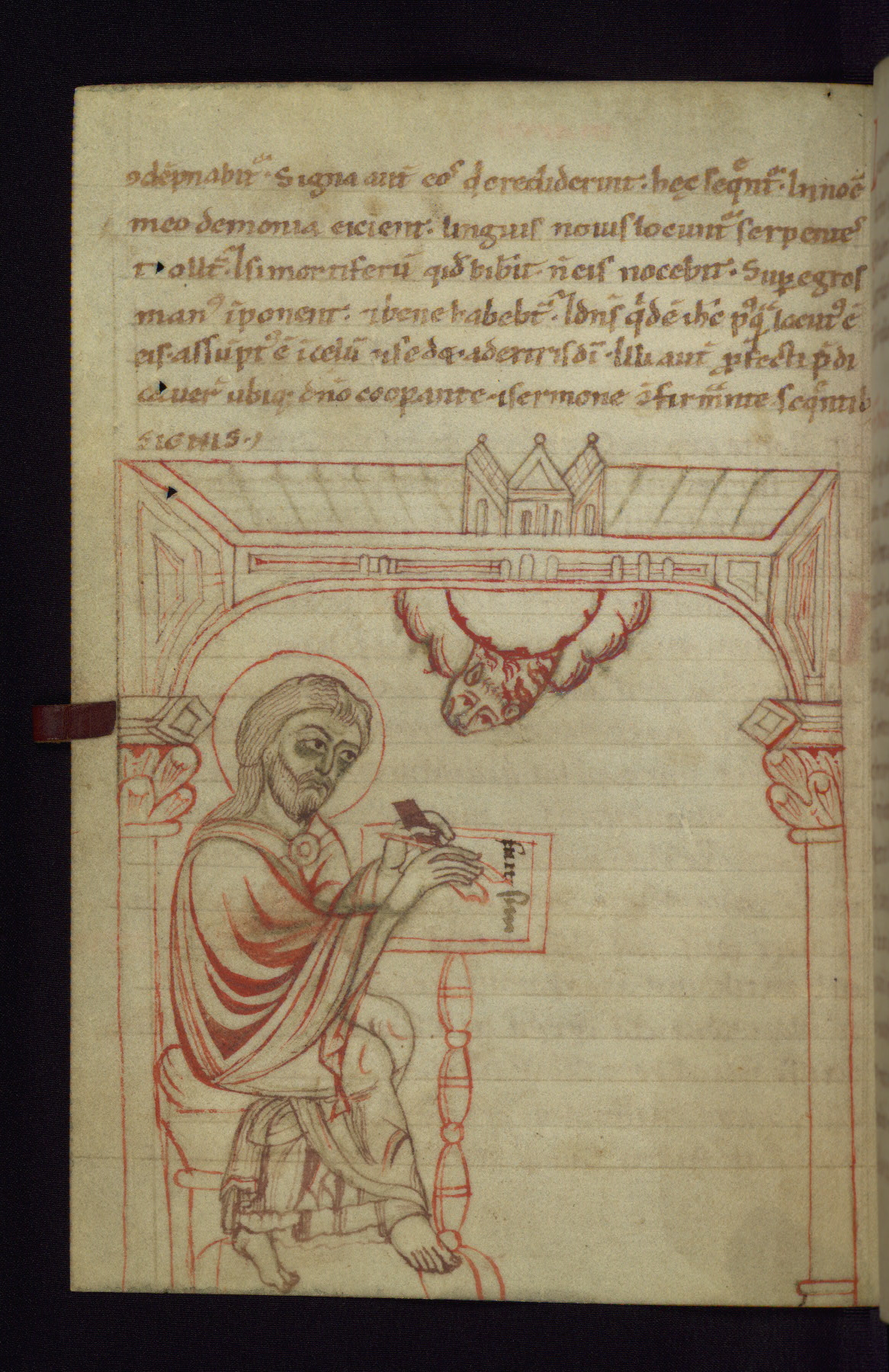 This small Gospel Book was made in Werden, Germany, in the eleventh century. Its size indicates that it was intended for daily, personal use, and a series of ownership inscriptions on the first folio, which trace the ownership of the manuscript among several members of the clergy, provides insight into its use. Although the book contains little decoration, with no canon tables or ornamental initials, the Gospels are introduced by three brown- and red-ink pen drawings of the Evangelists, two of which were embedded into the end of the previous Gospel by the artist. The manuscript is, however, incomplete and lacks the end of Matthew as well as the portrait of Mark, which was likely incorporated into Matthew's explicit page, as was done with the other portraits.