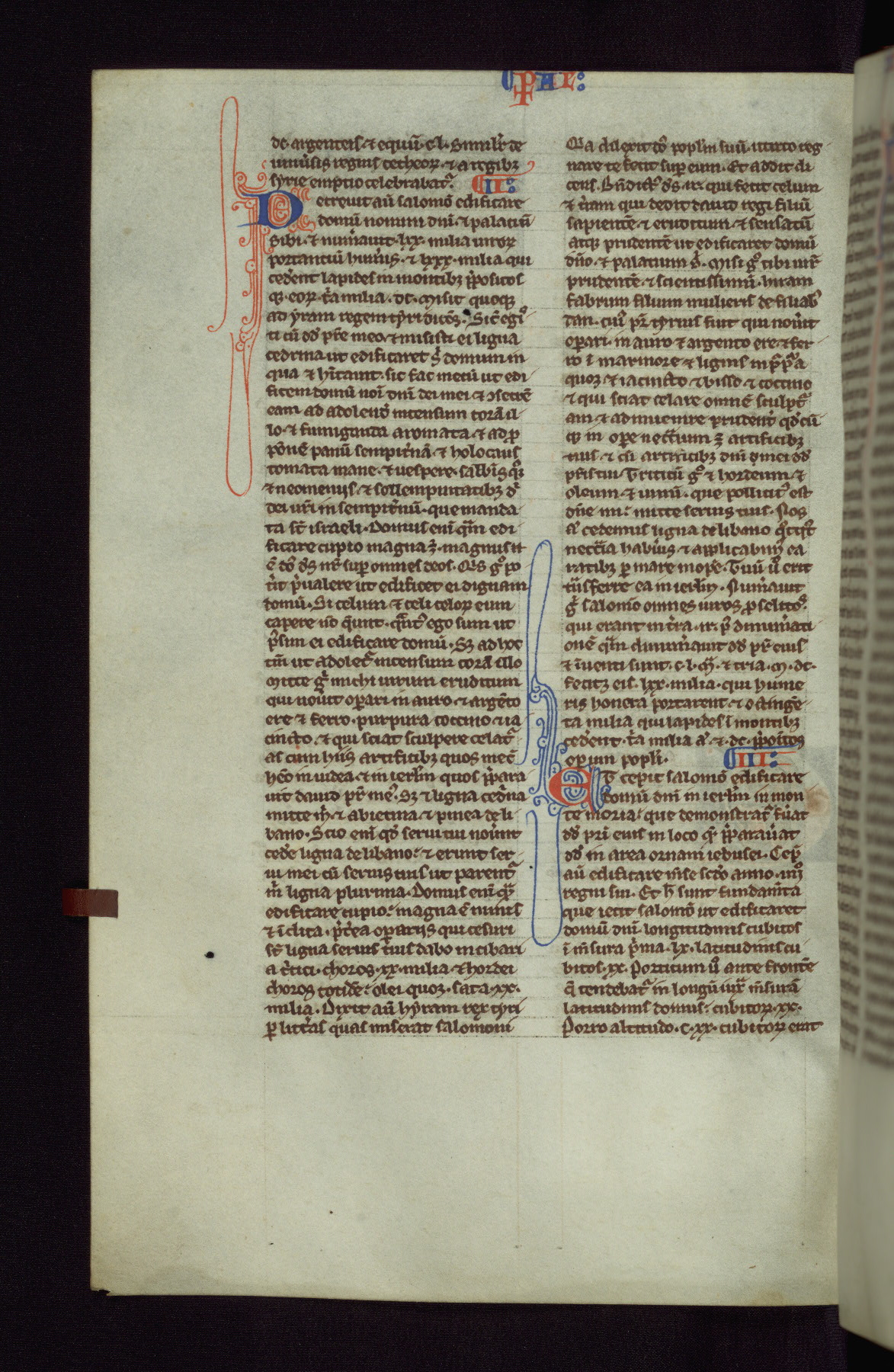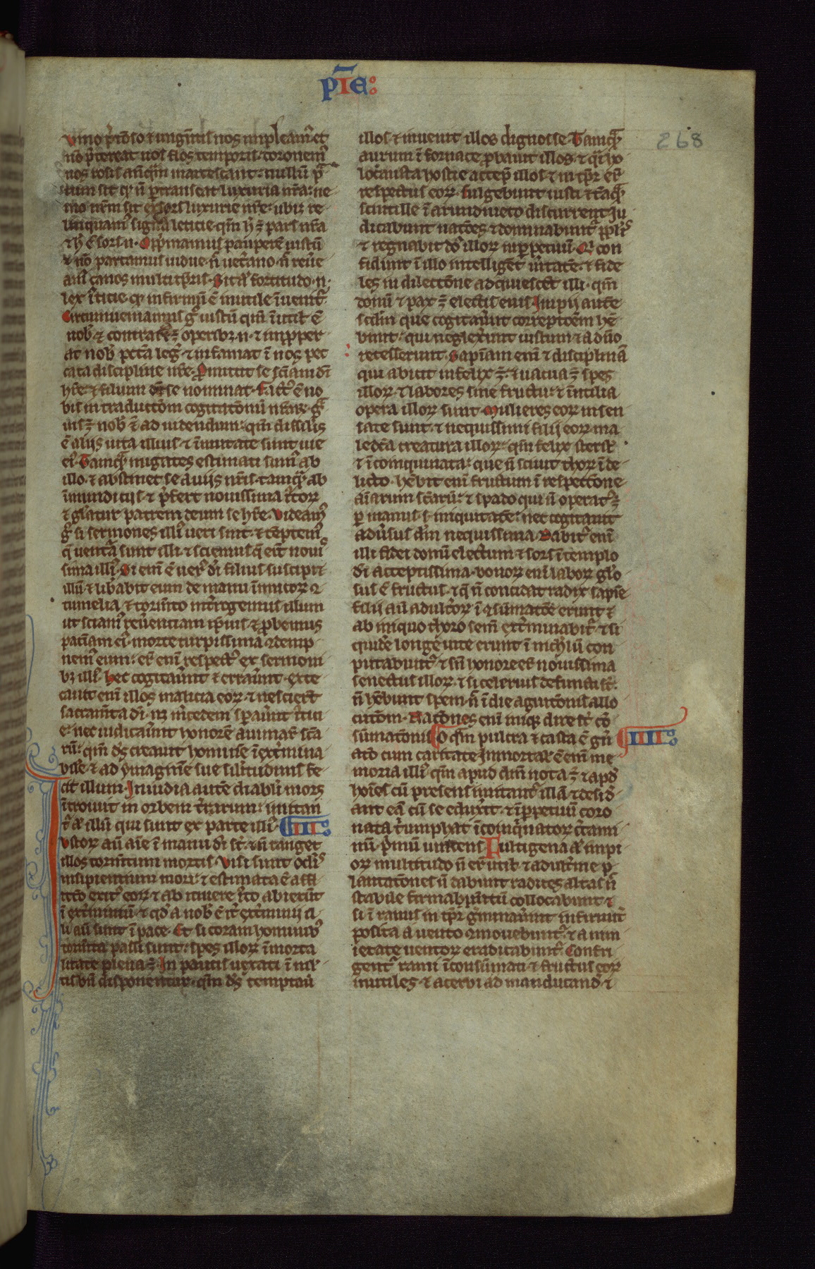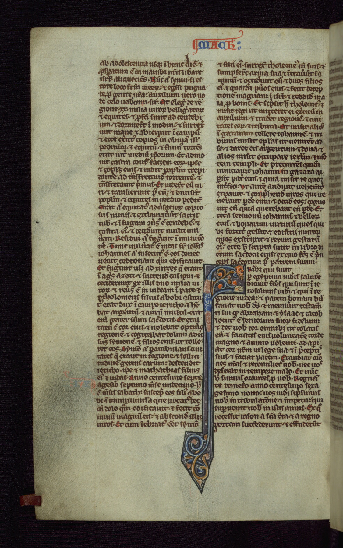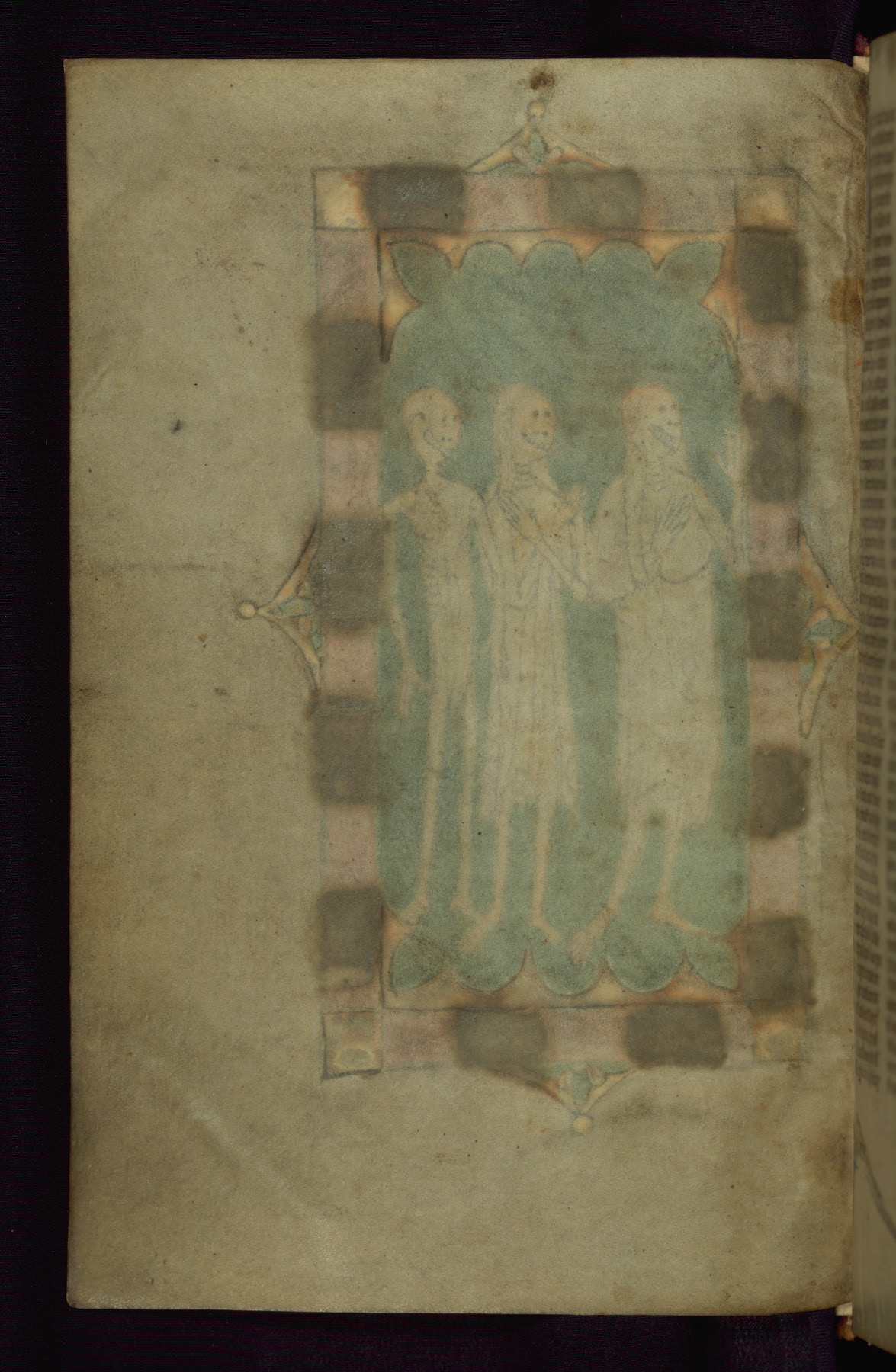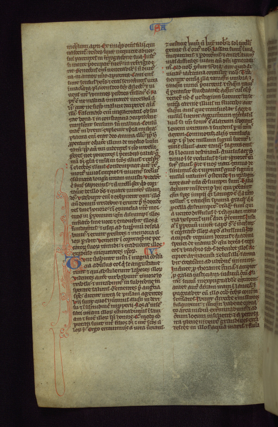This pocket-size Bible was created around the middle of the thirteenth century in England. It contains the Vulgate text of the Old and New Testaments, arranged in order and divided into chapters. Such Bibles, designed for individual rather than institutional use, began to be created on a large scale during the thirteenth century, especially in Paris. This manuscript is illuminated with a large number of small historiated initials, and also includes a somewhat later image of the Three Living and the Three Dead, a popular scene based on a French poem of the same century.