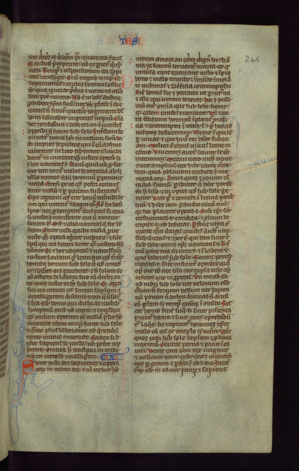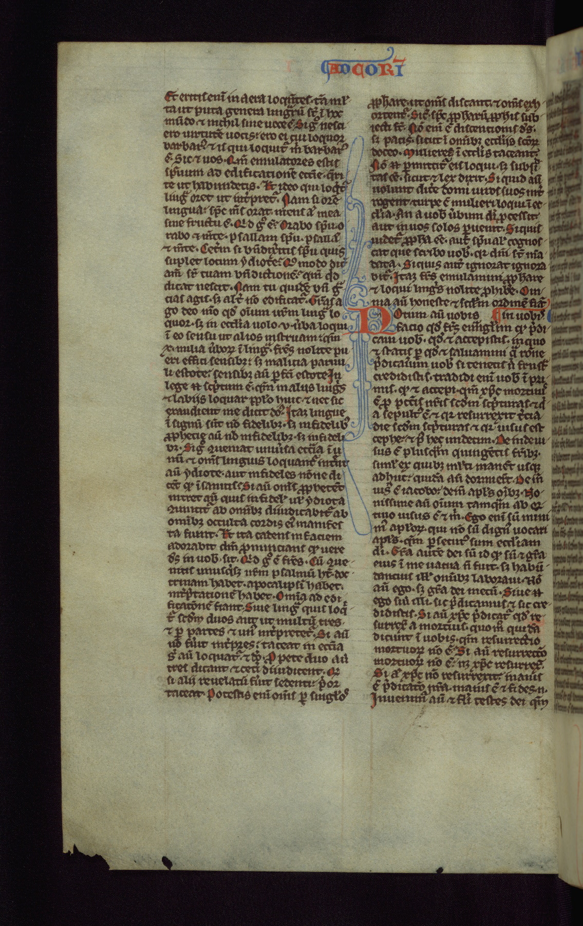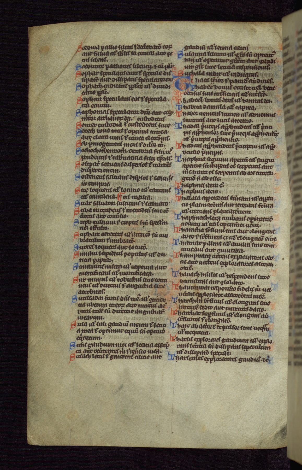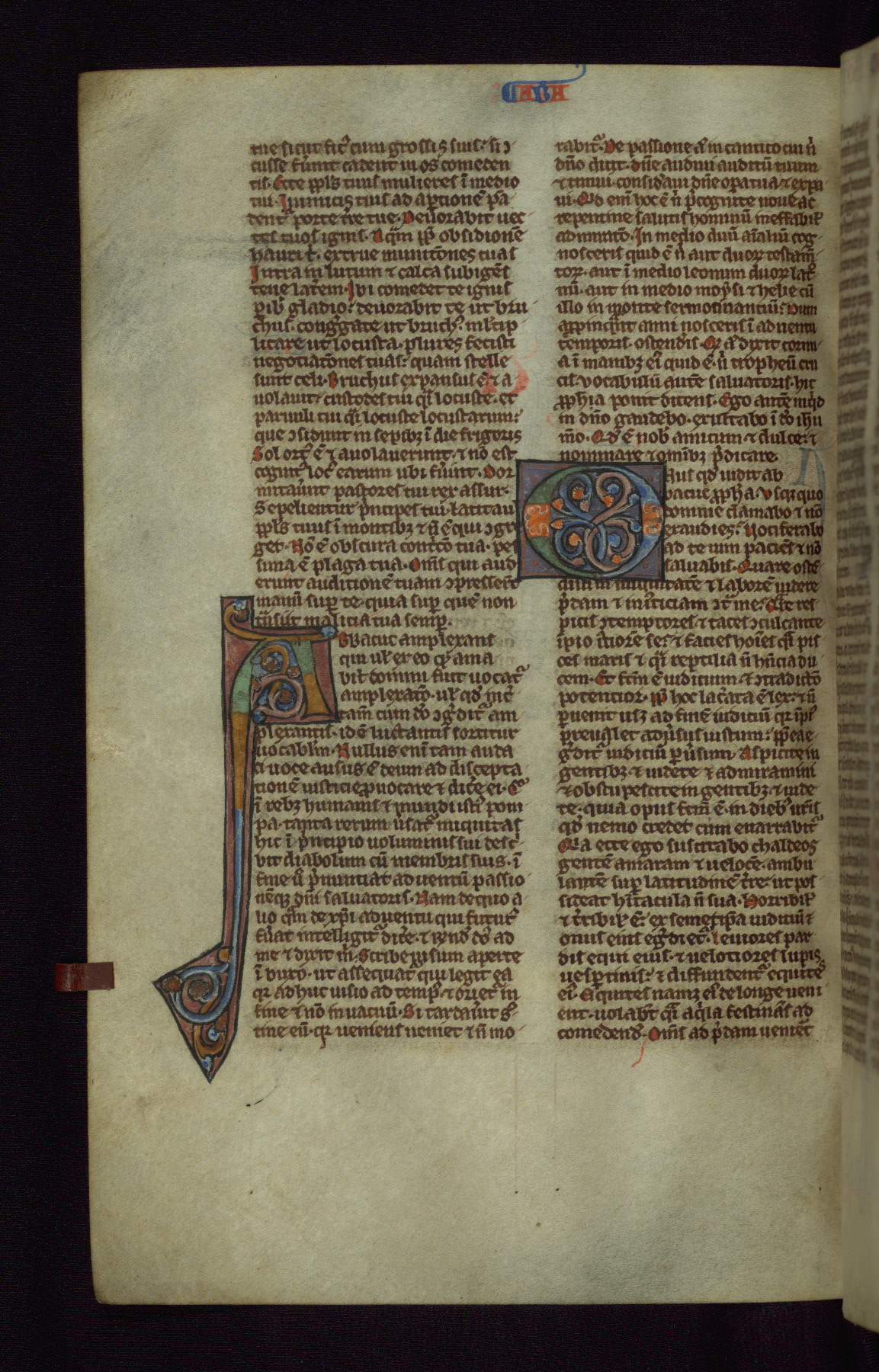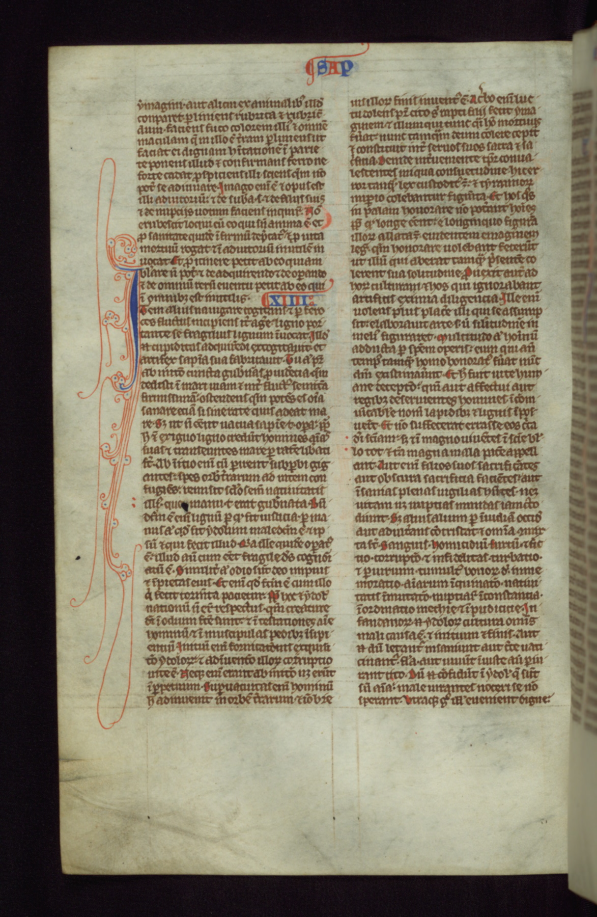 This pocket-size Bible was created around the middle of the thirteenth century in England. It contains the Vulgate text of the Old and New Testaments, arranged in order and divided into chapters. Such Bibles, designed for individual rather than institutional use, began to be created on a large scale during the thirteenth century, especially in Paris. This manuscript is illuminated with a large number of small historiated initials, and also includes a somewhat later image of the Three Living and the Three Dead, a popular scene based on a French poem of the same century.