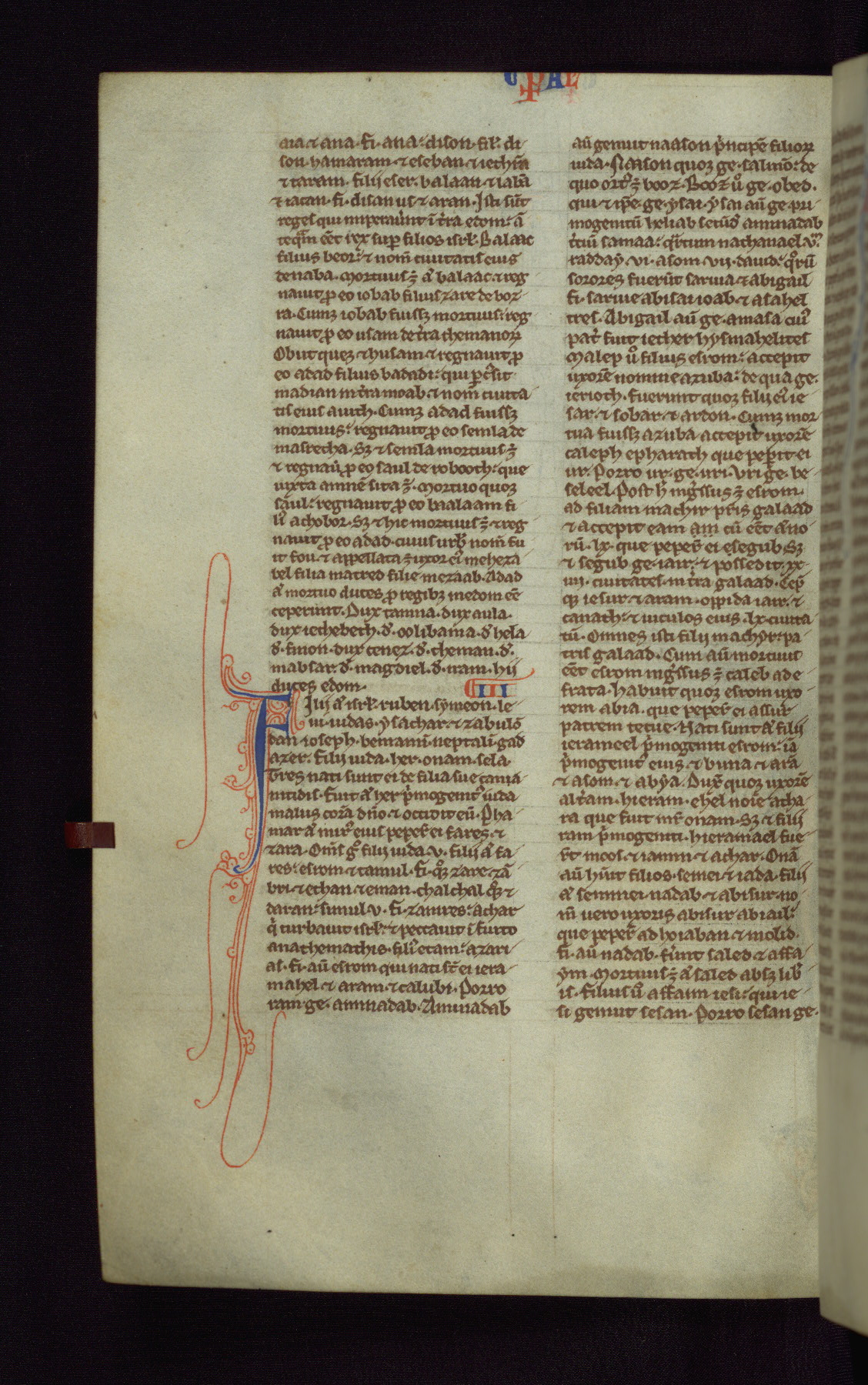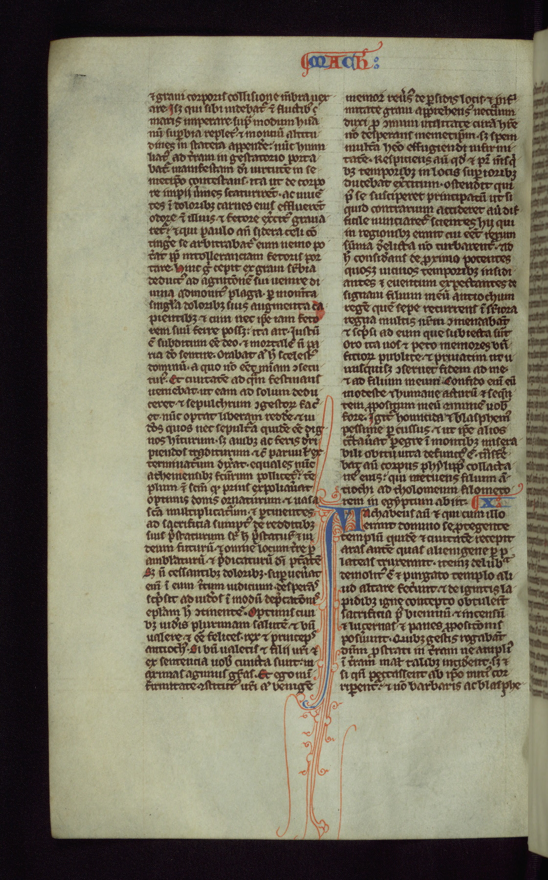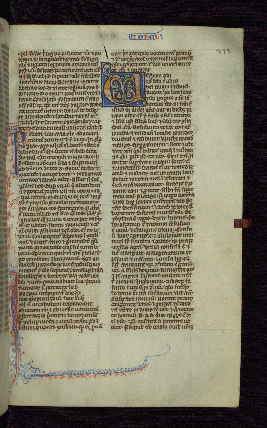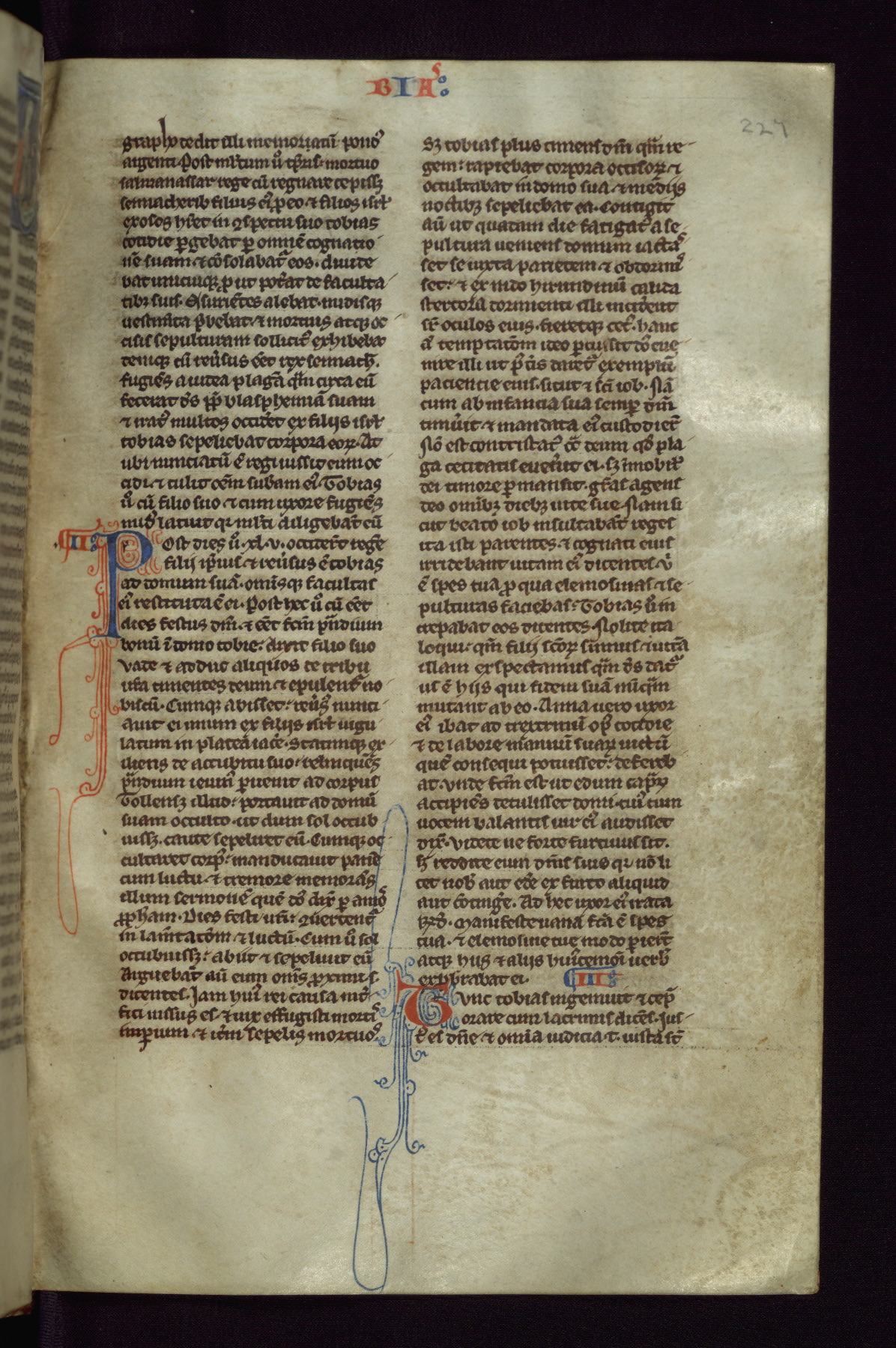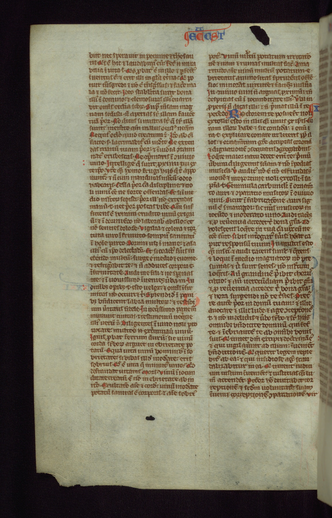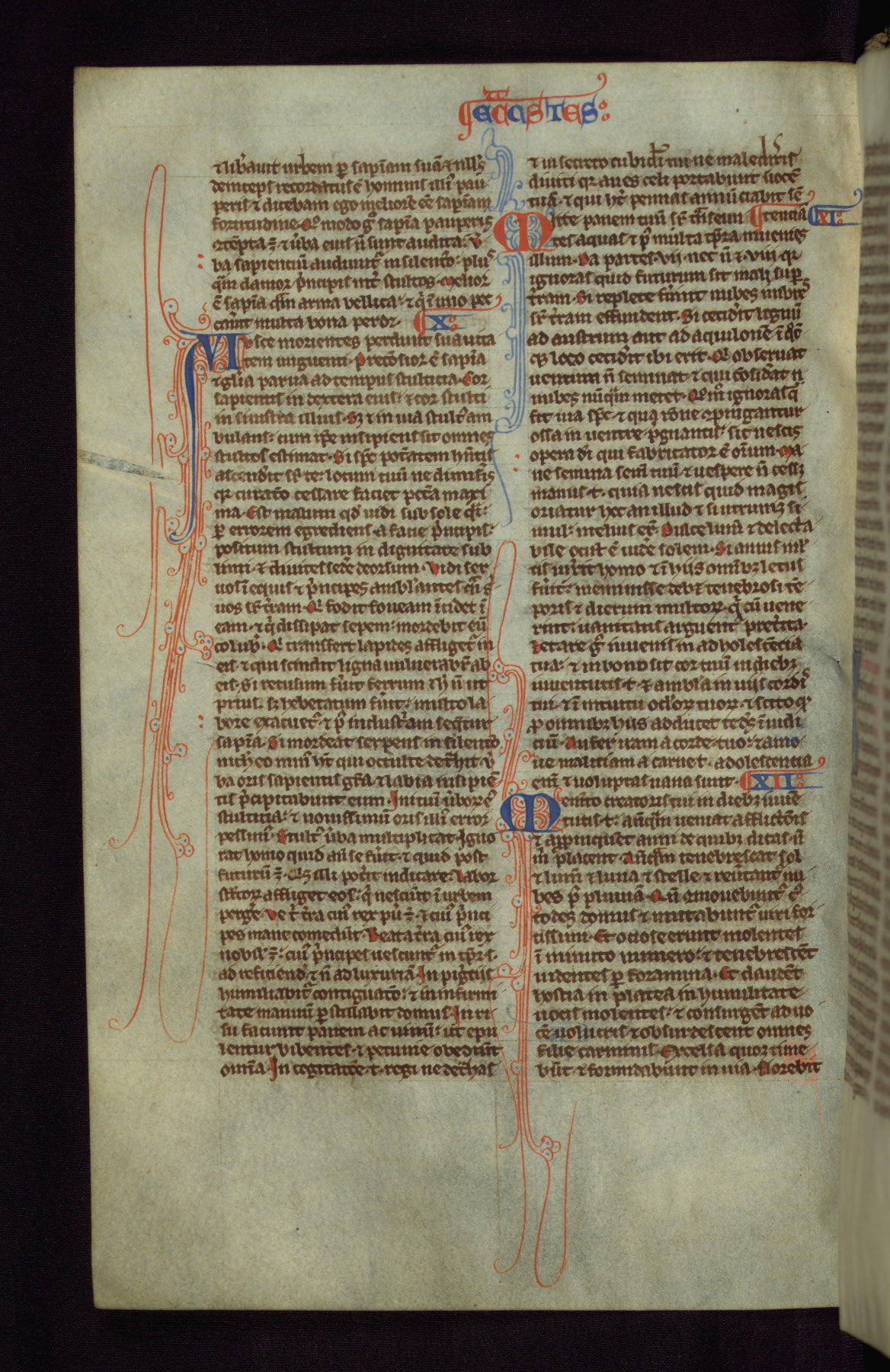 This pocket-size Bible was created around the middle of the thirteenth century in England. It contains the Vulgate text of the Old and New Testaments, arranged in order and divided into chapters. Such Bibles, designed for individual rather than institutional use, began to be created on a large scale during the thirteenth century, especially in Paris. This manuscript is illuminated with a large number of small historiated initials, and also includes a somewhat later image of the Three Living and the Three Dead, a popular scene based on a French poem of the same century.