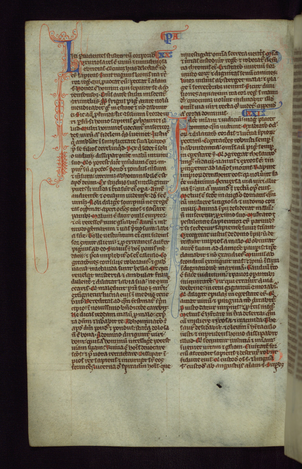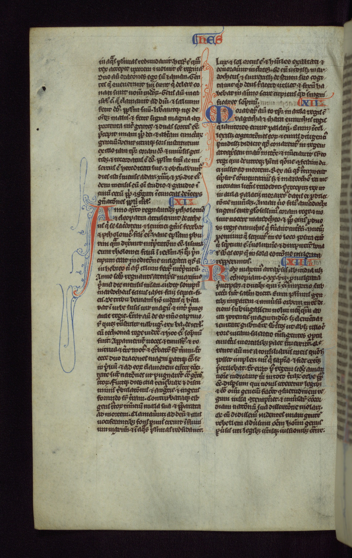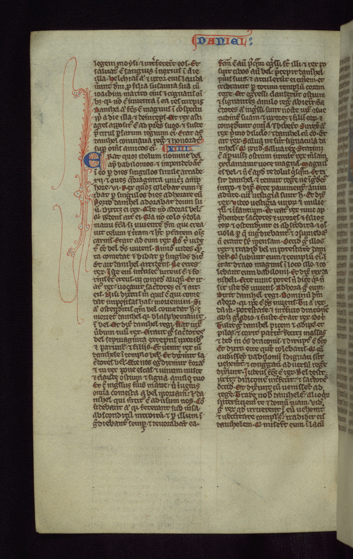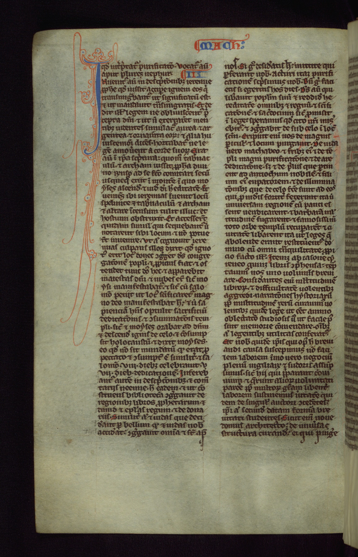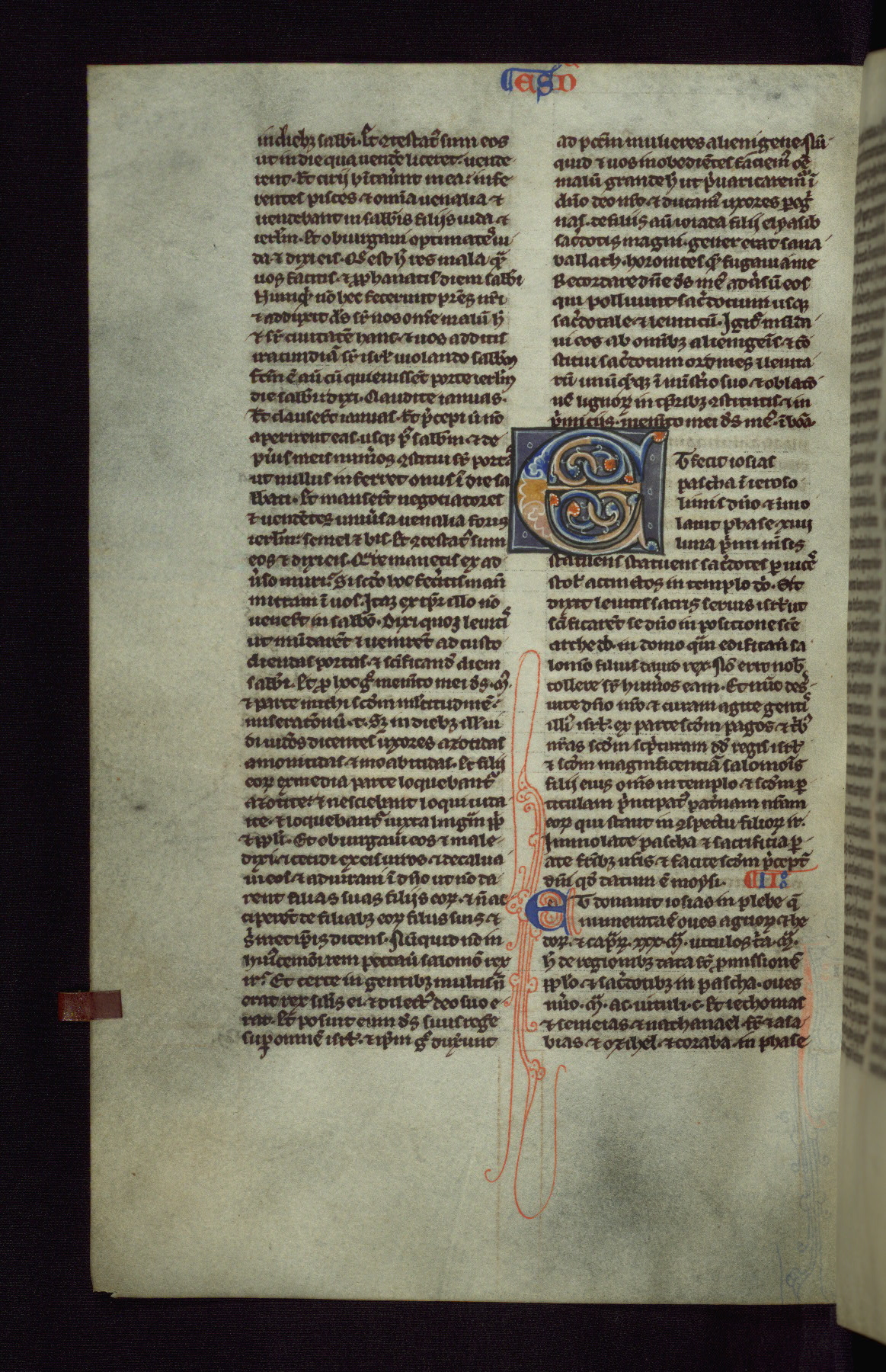 This pocket-size Bible was created around the middle of the thirteenth century in England. It contains the Vulgate text of the Old and New Testaments, arranged in order and divided into chapters. Such Bibles, designed for individual rather than institutional use, began to be created on a large scale during the thirteenth century, especially in Paris. This manuscript is illuminated with a large number of small historiated initials, and also includes a somewhat later image of the Three Living and the Three Dead, a popular scene based on a French poem of the same century.