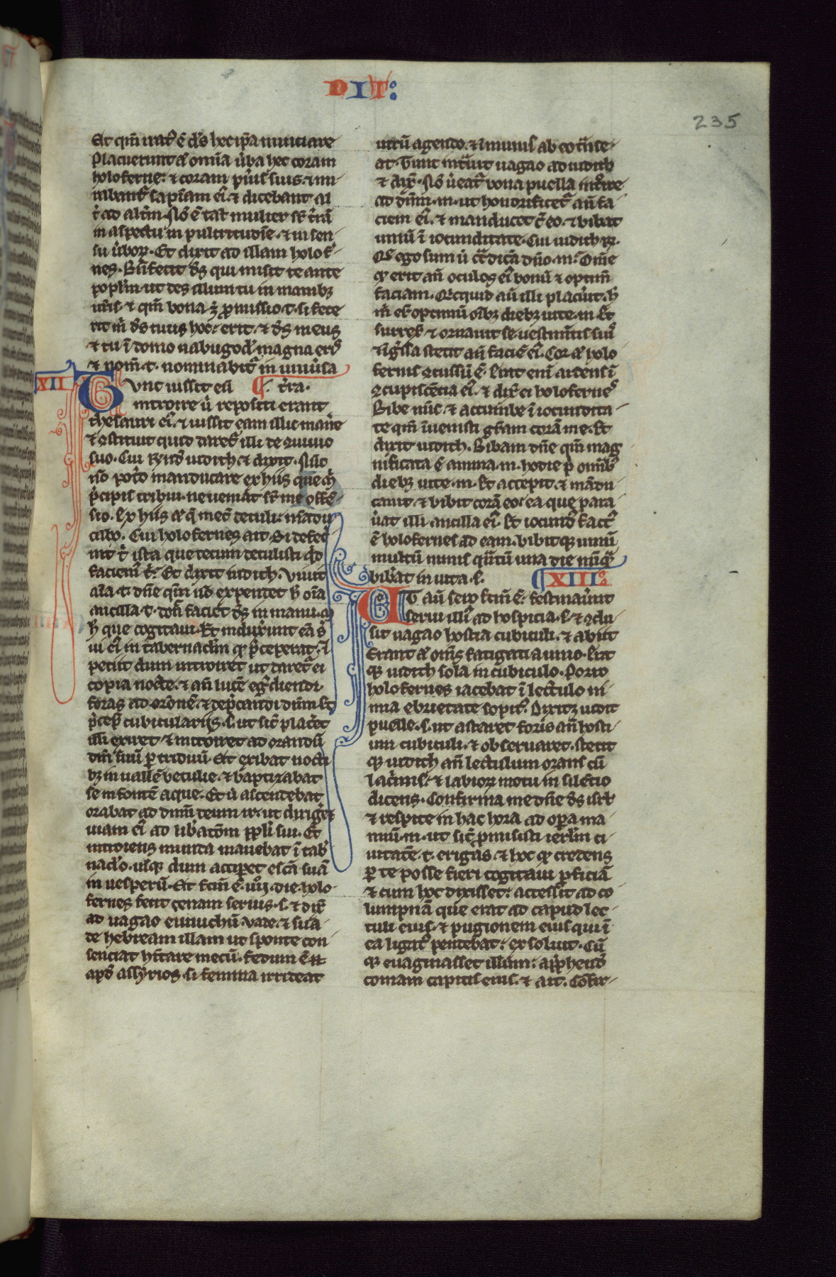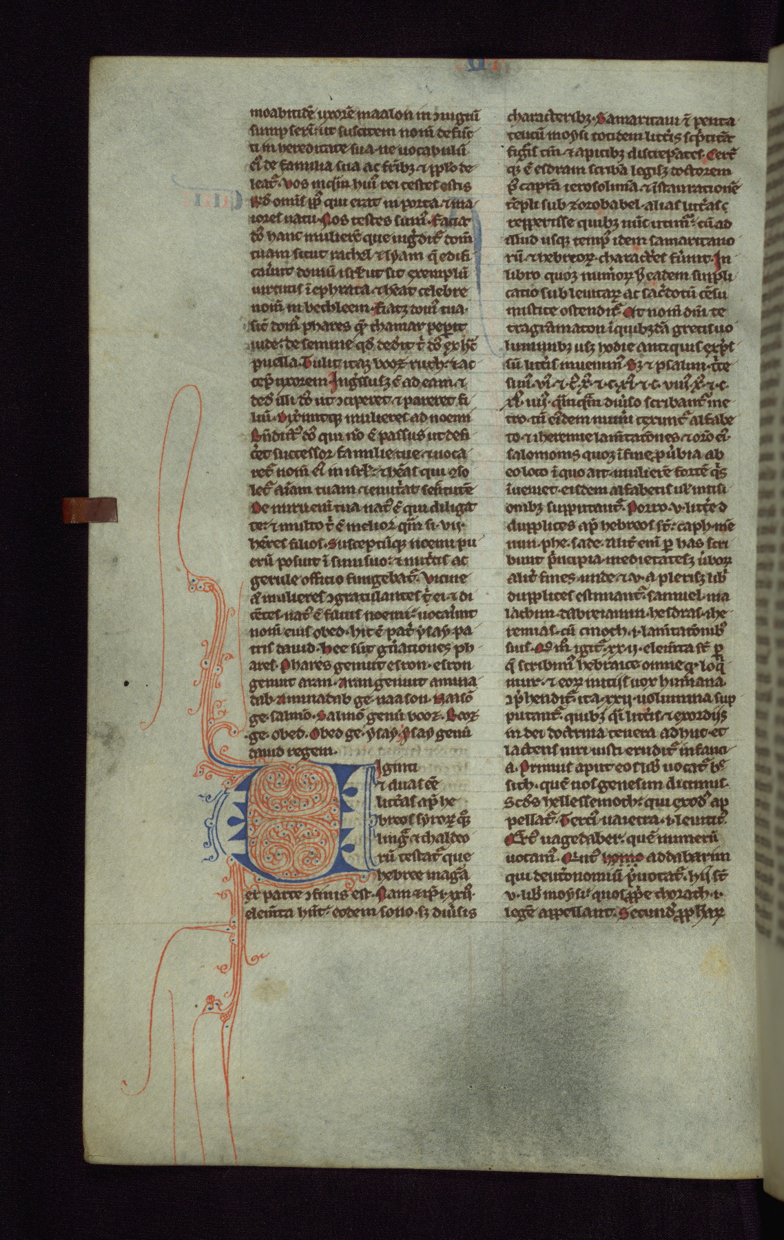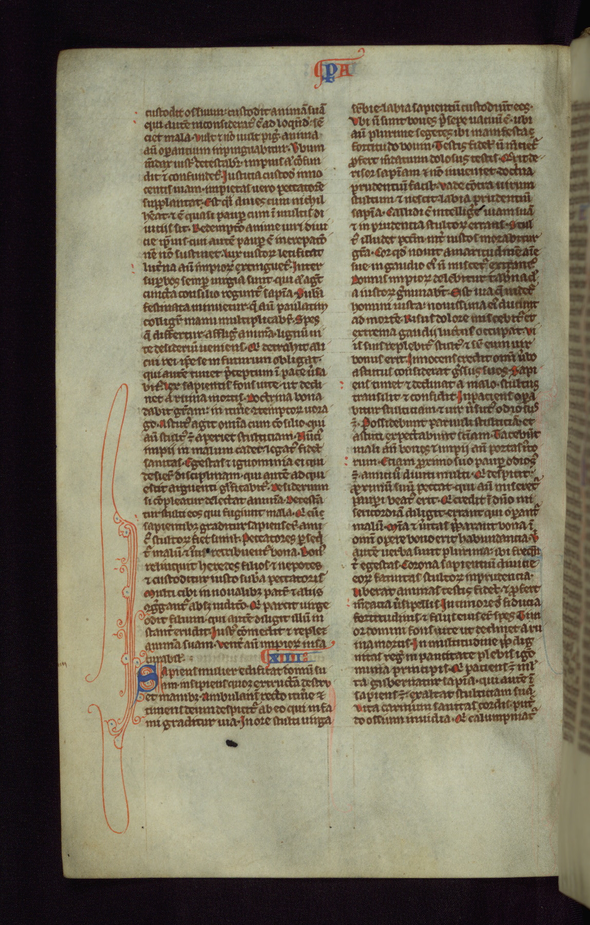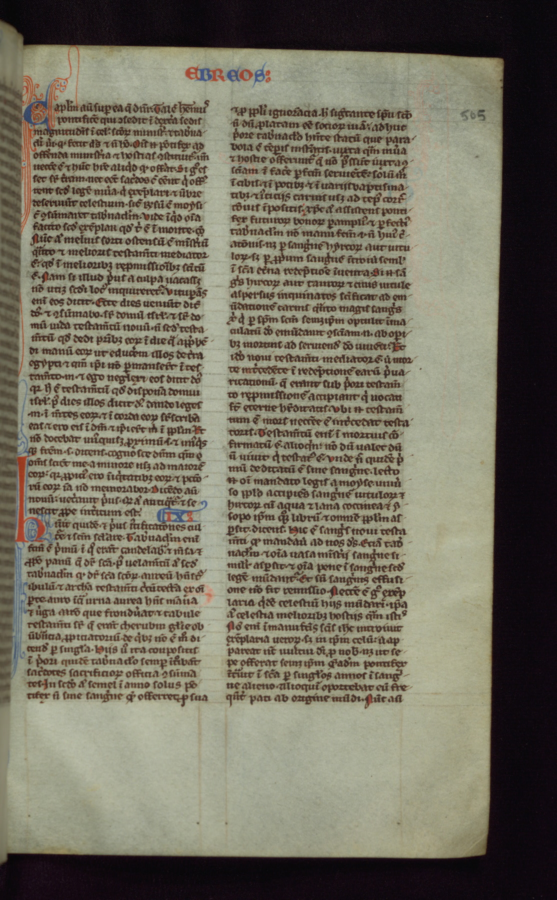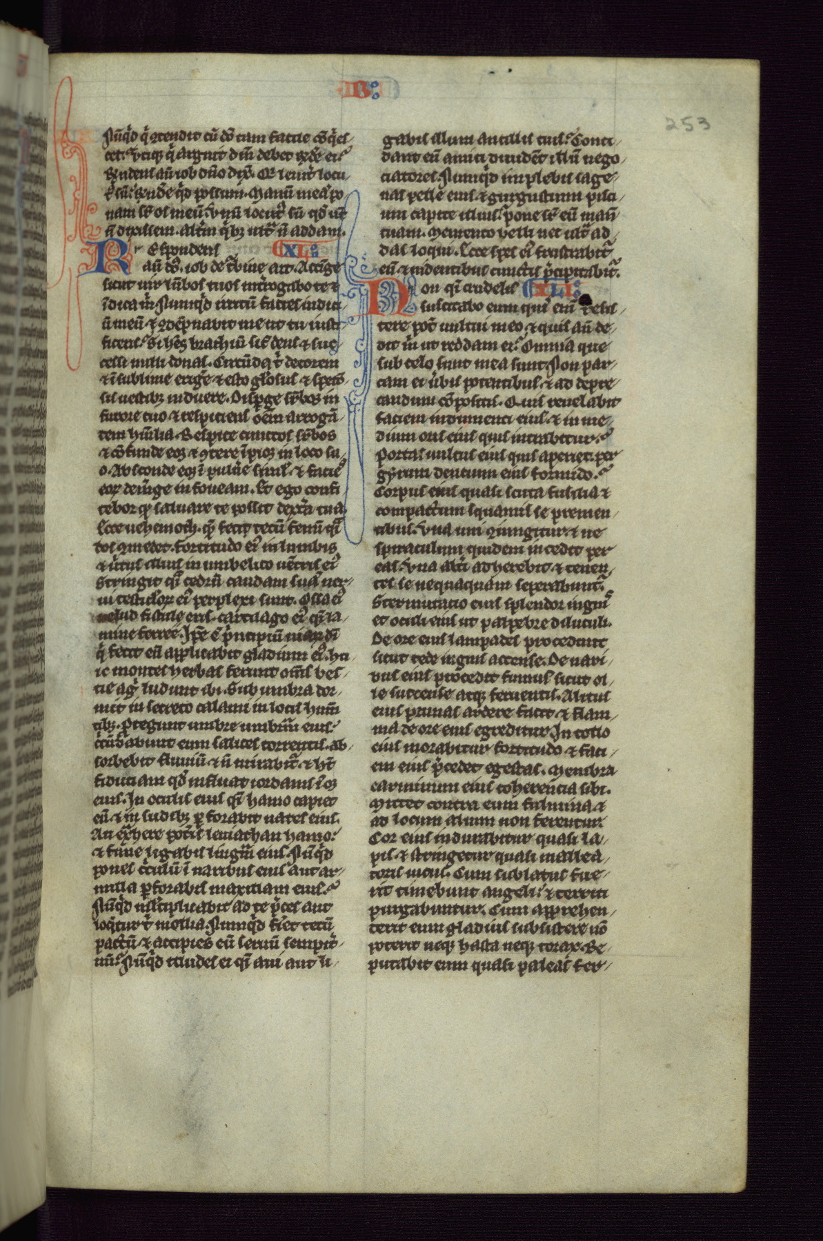 This pocket-size Bible was created around the middle of the thirteenth century in England. It contains the Vulgate text of the Old and New Testaments, arranged in order and divided into chapters. Such Bibles, designed for individual rather than institutional use, began to be created on a large scale during the thirteenth century, especially in Paris. This manuscript is illuminated with a large number of small historiated initials, and also includes a somewhat later image of the Three Living and the Three Dead, a popular scene based on a French poem of the same century.