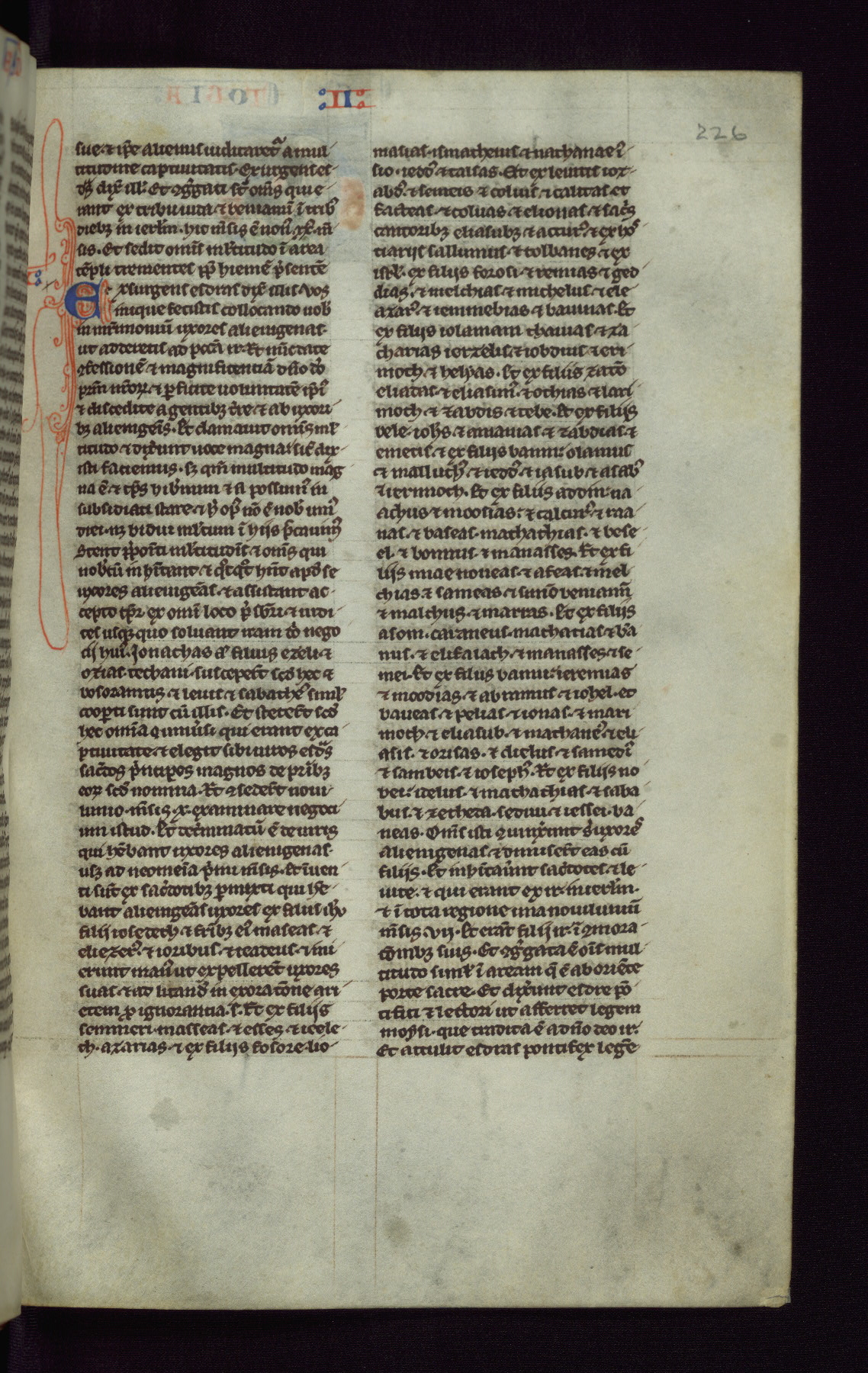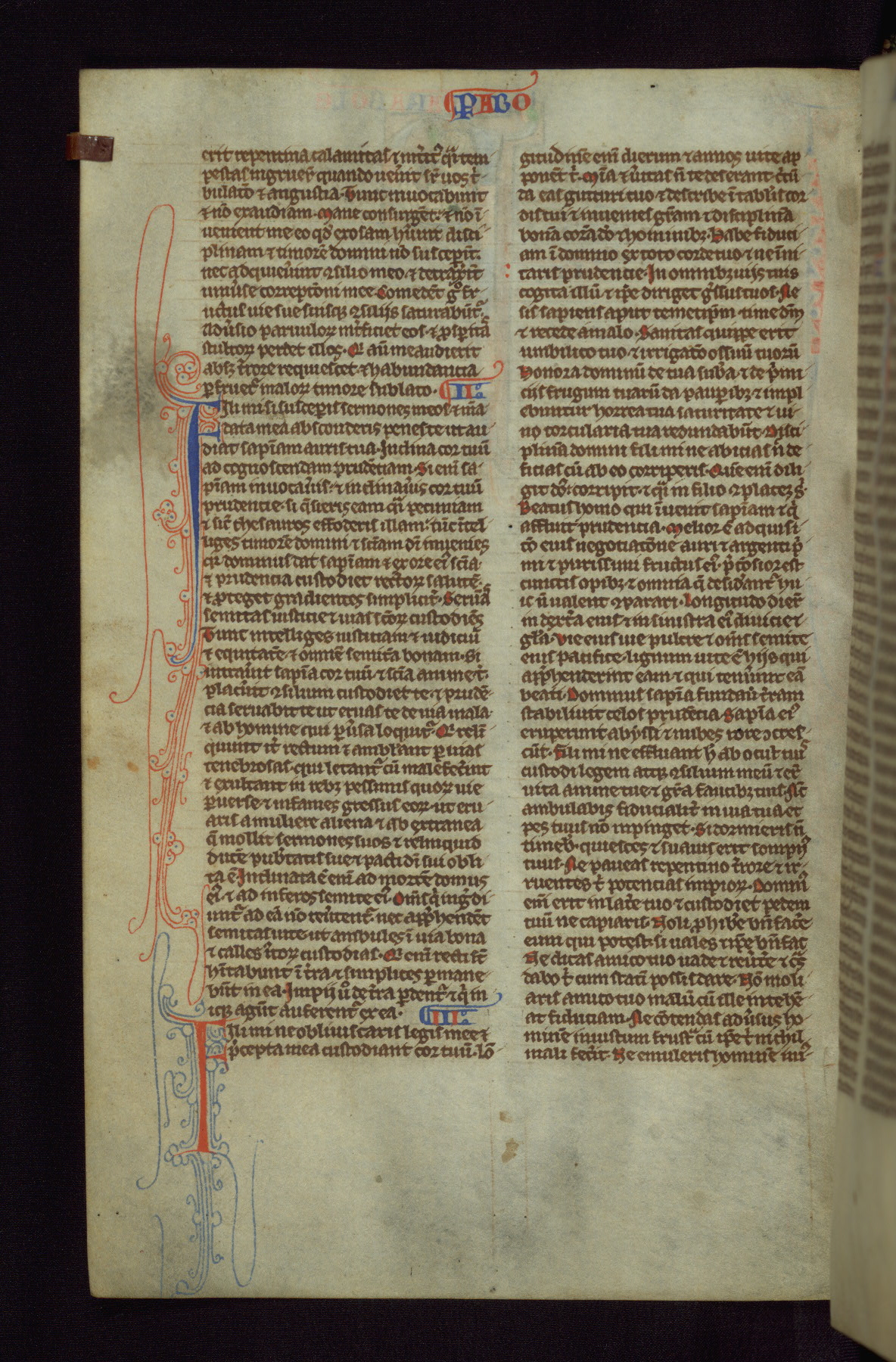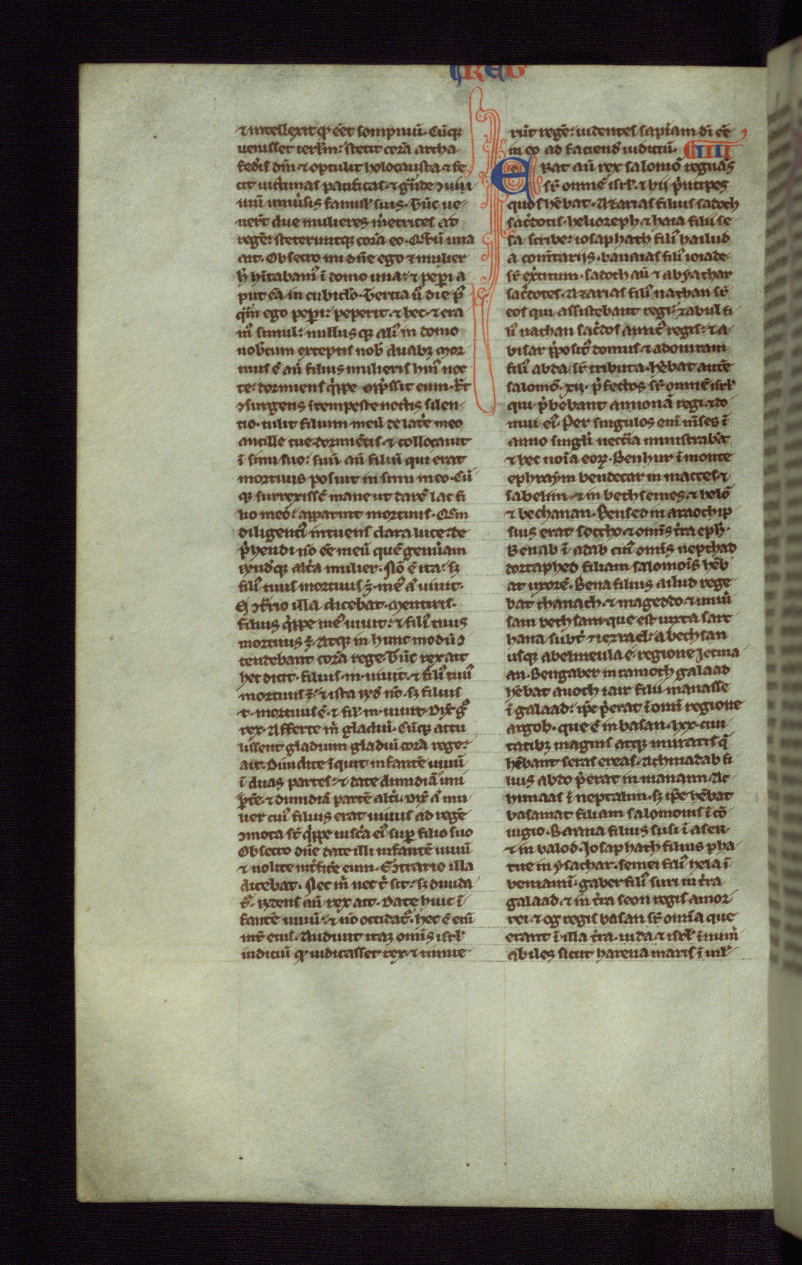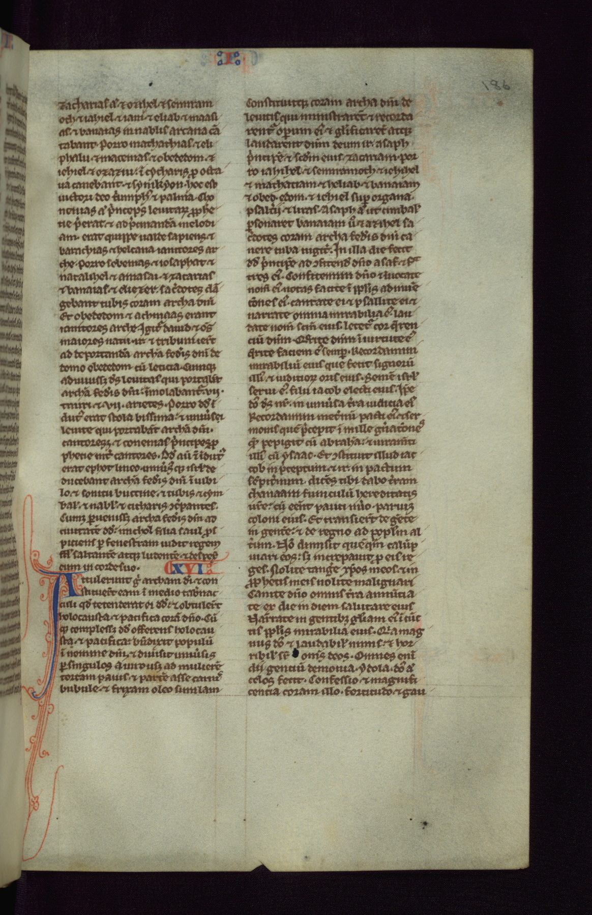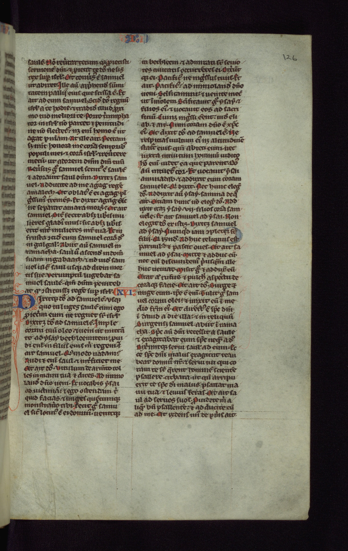 This pocket-size Bible was created around the middle of the thirteenth century in England. It contains the Vulgate text of the Old and New Testaments, arranged in order and divided into chapters. Such Bibles, designed for individual rather than institutional use, began to be created on a large scale during the thirteenth century, especially in Paris. This manuscript is illuminated with a large number of small historiated initials, and also includes a somewhat later image of the Three Living and the Three Dead, a popular scene based on a French poem of the same century.