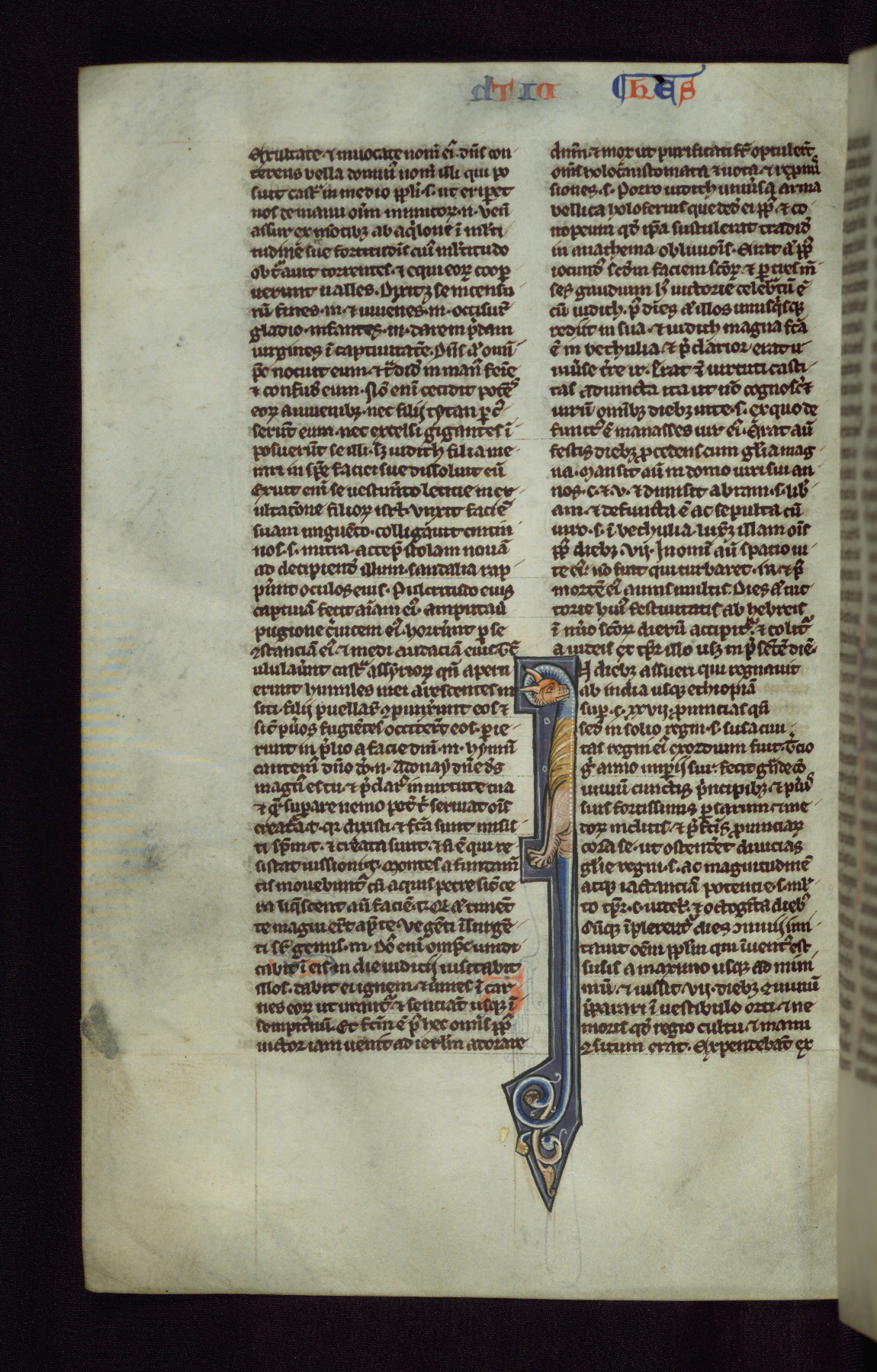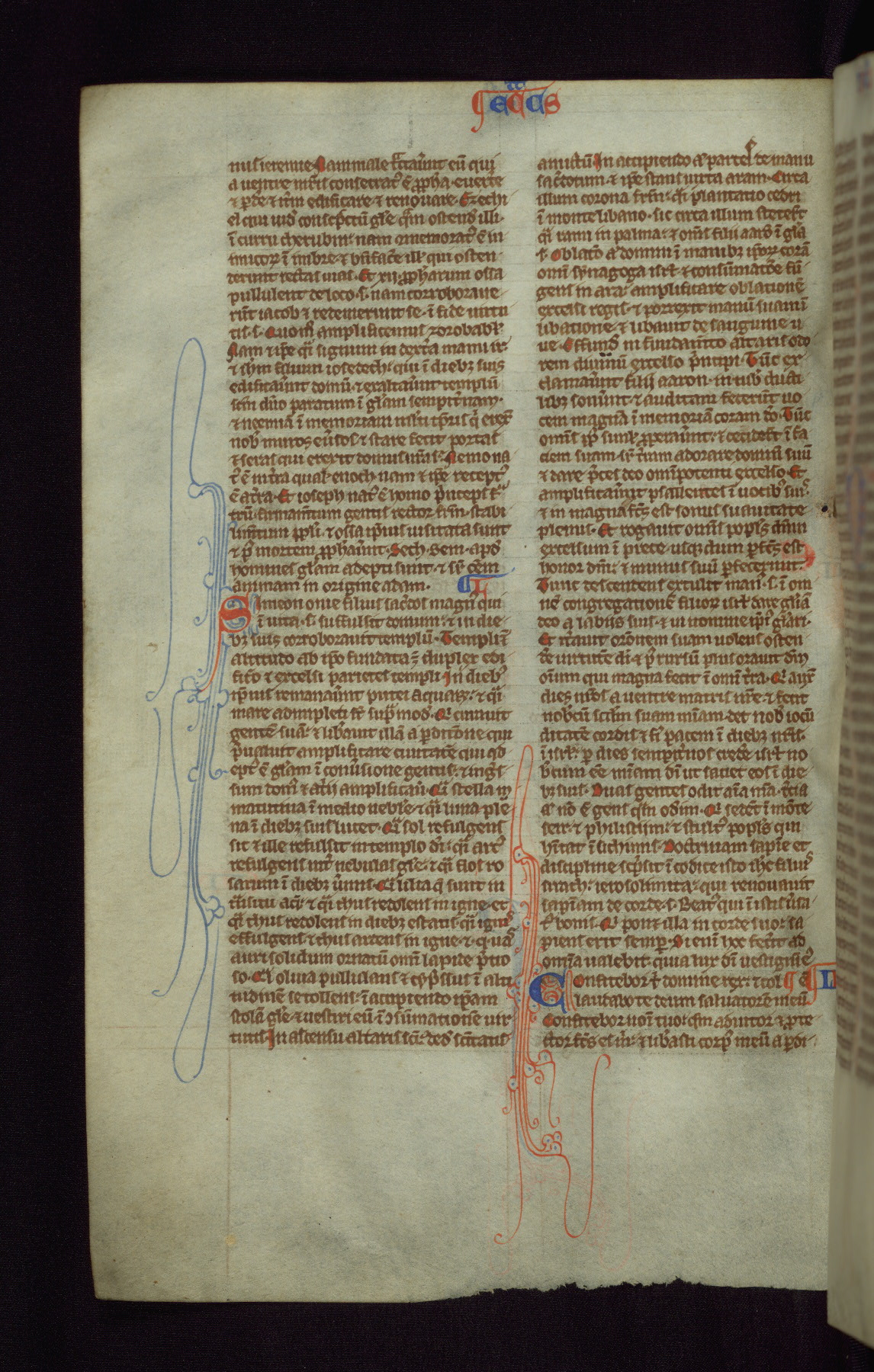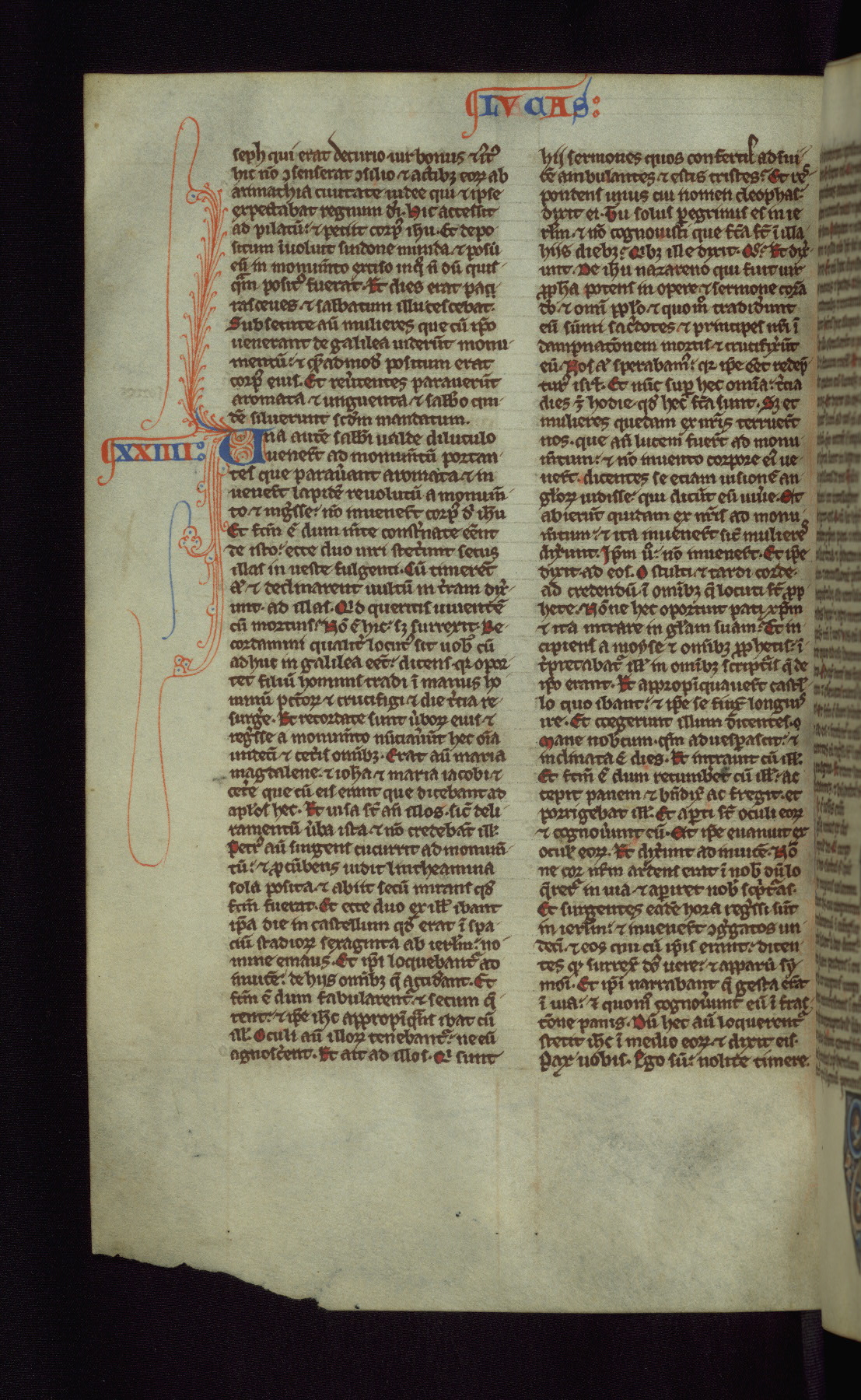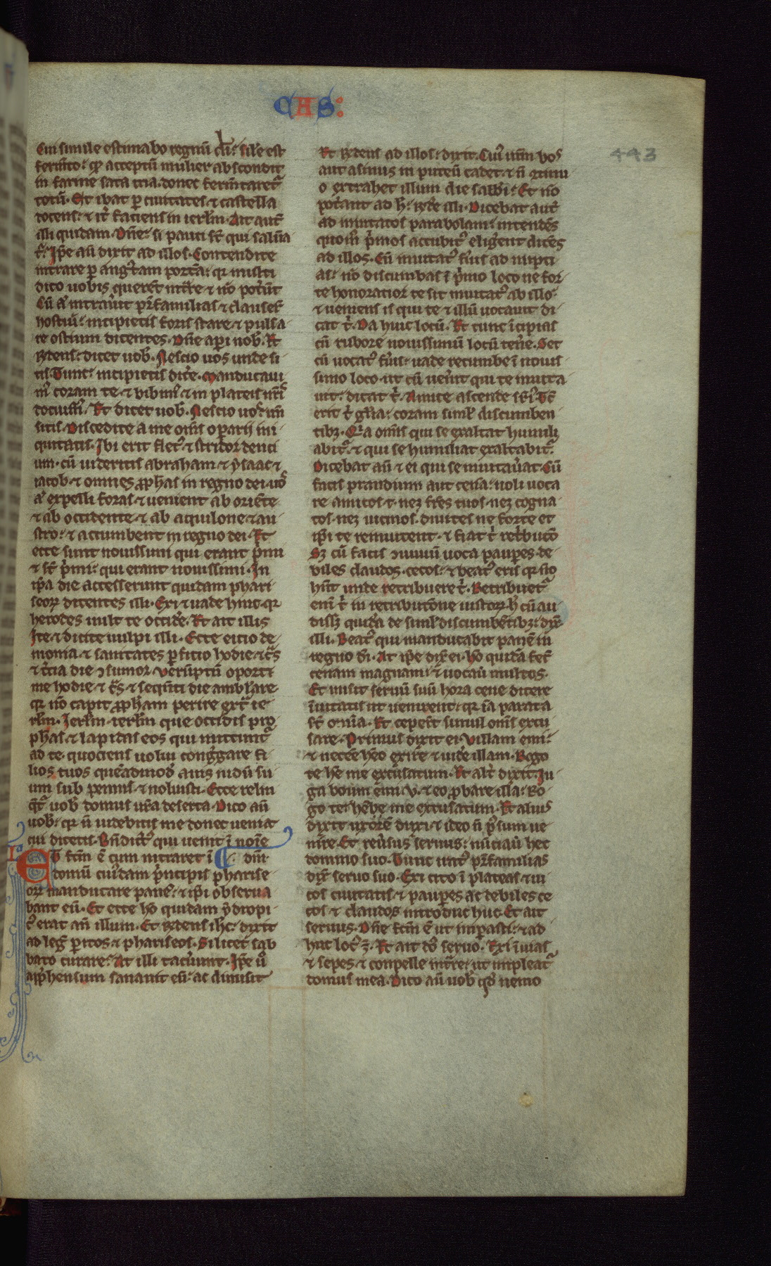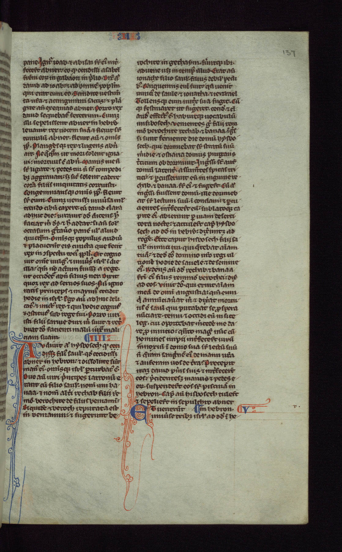 This pocket-size Bible was created around the middle of the thirteenth century in England. It contains the Vulgate text of the Old and New Testaments, arranged in order and divided into chapters. Such Bibles, designed for individual rather than institutional use, began to be created on a large scale during the thirteenth century, especially in Paris. This manuscript is illuminated with a large number of small historiated initials, and also includes a somewhat later image of the Three Living and the Three Dead, a popular scene based on a French poem of the same century.