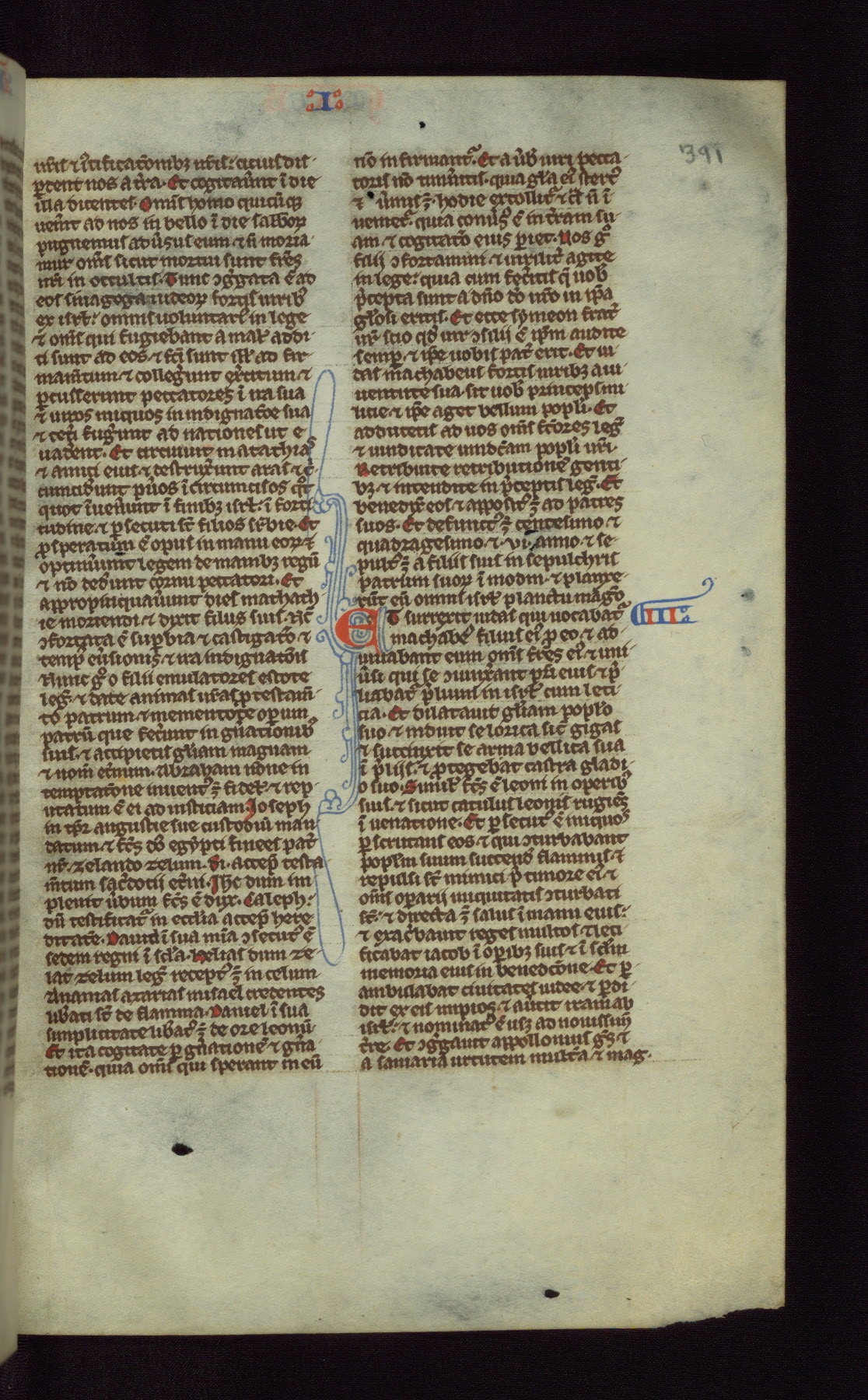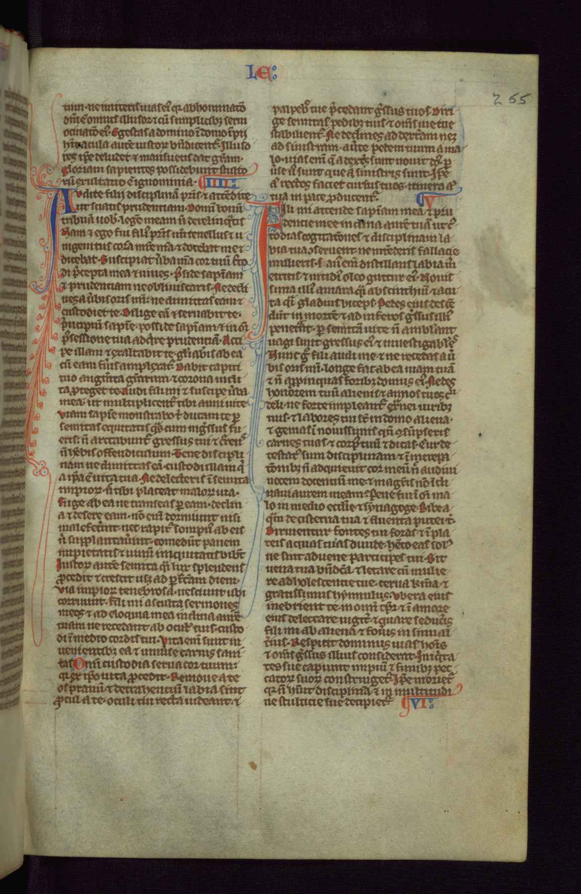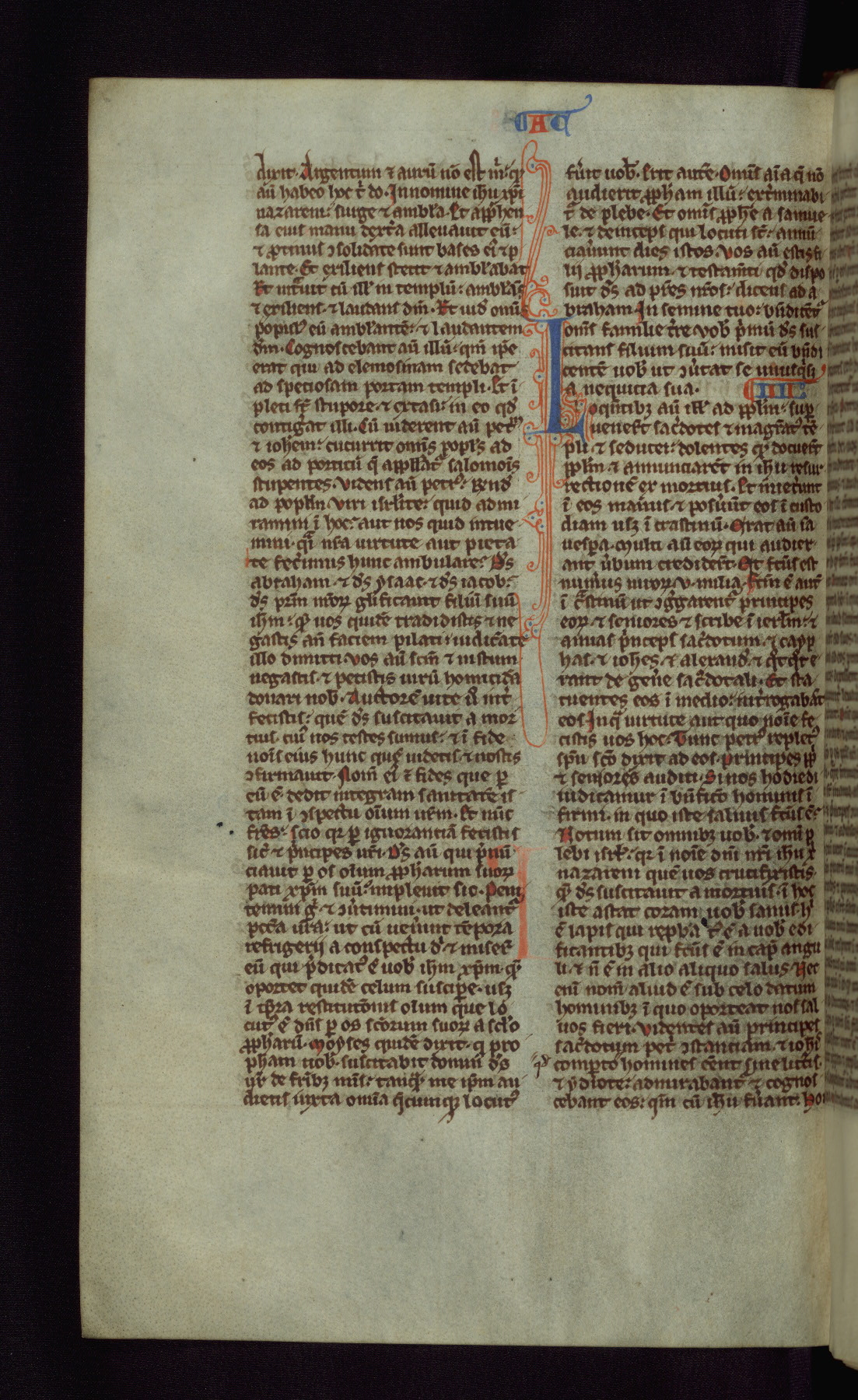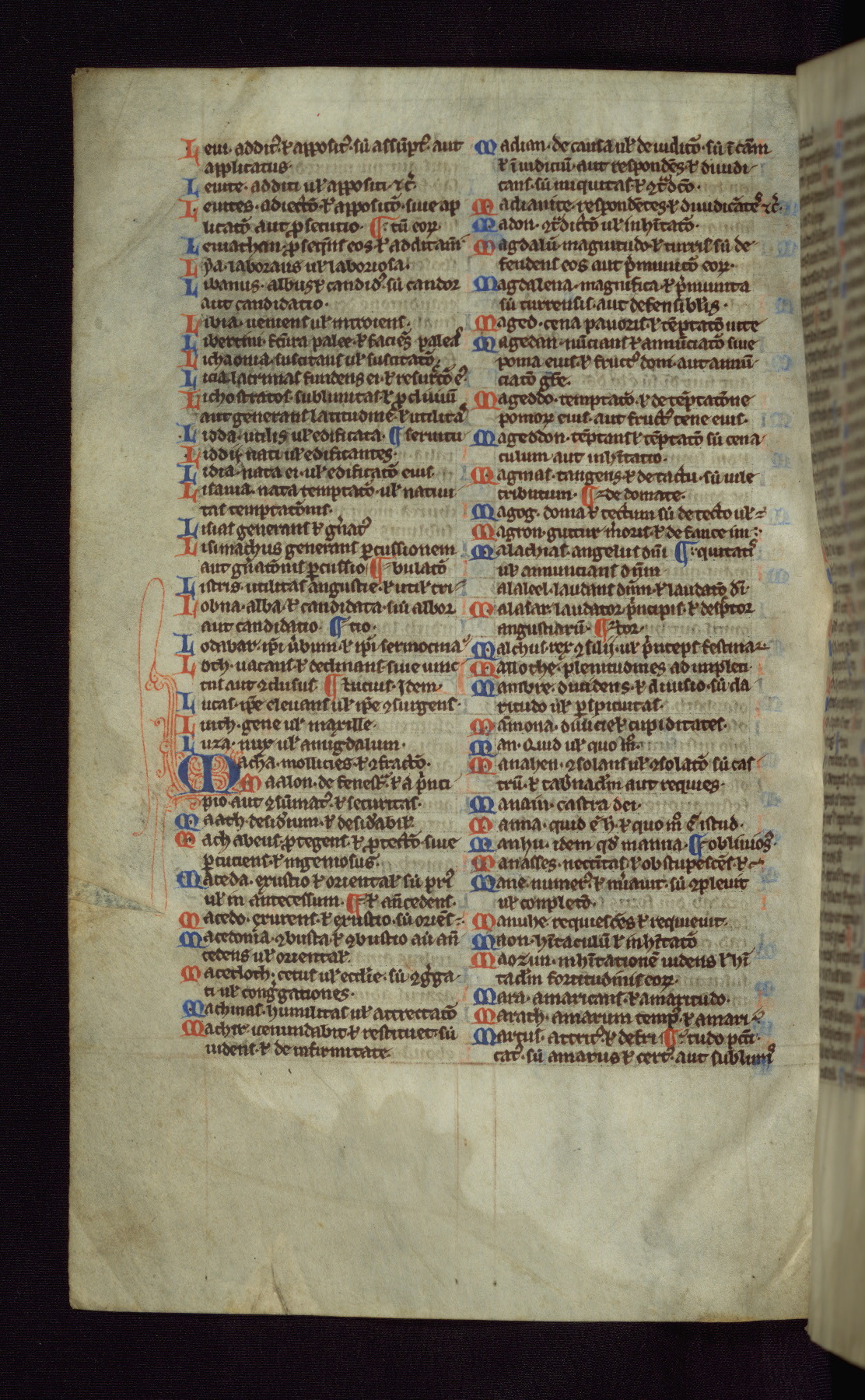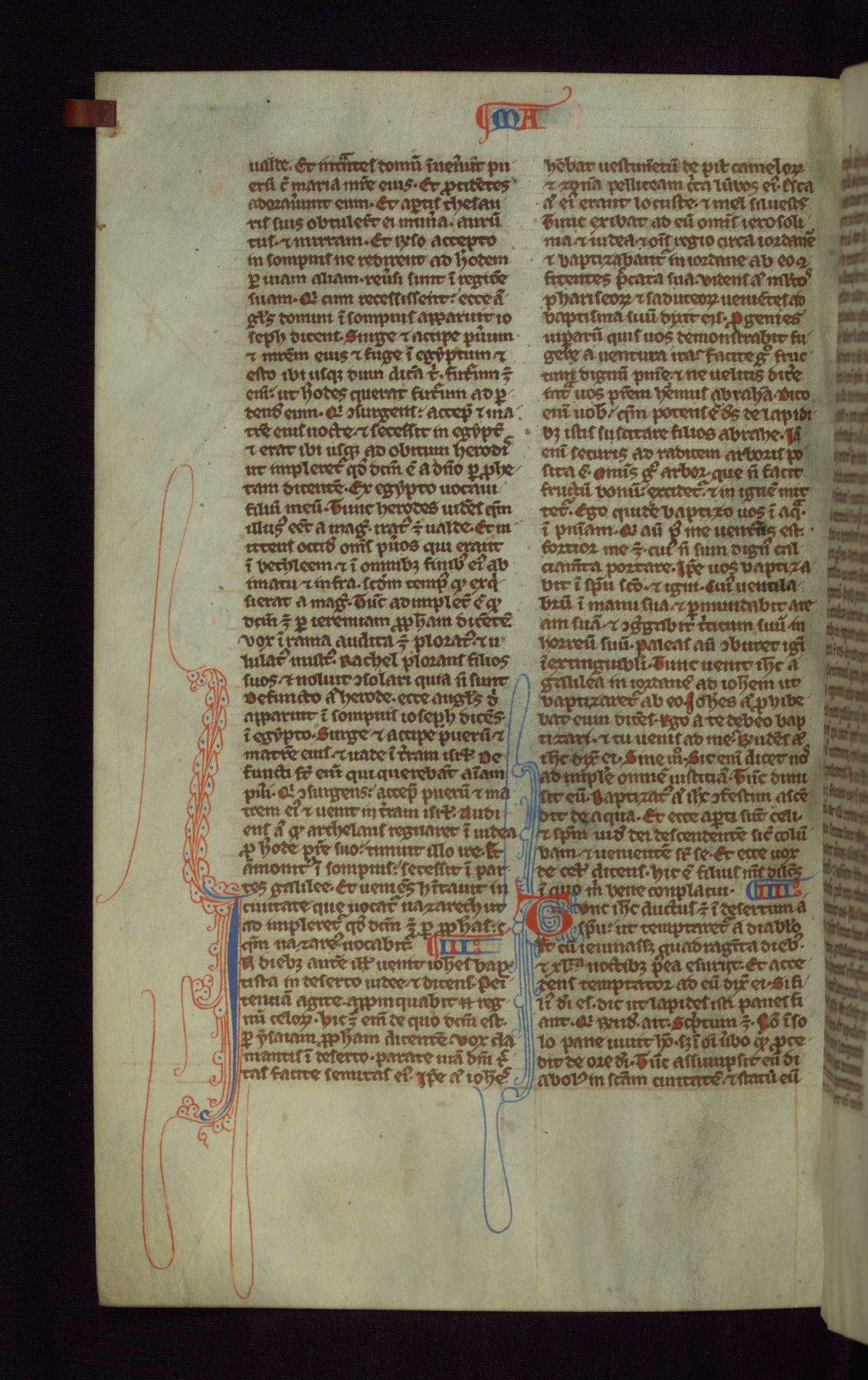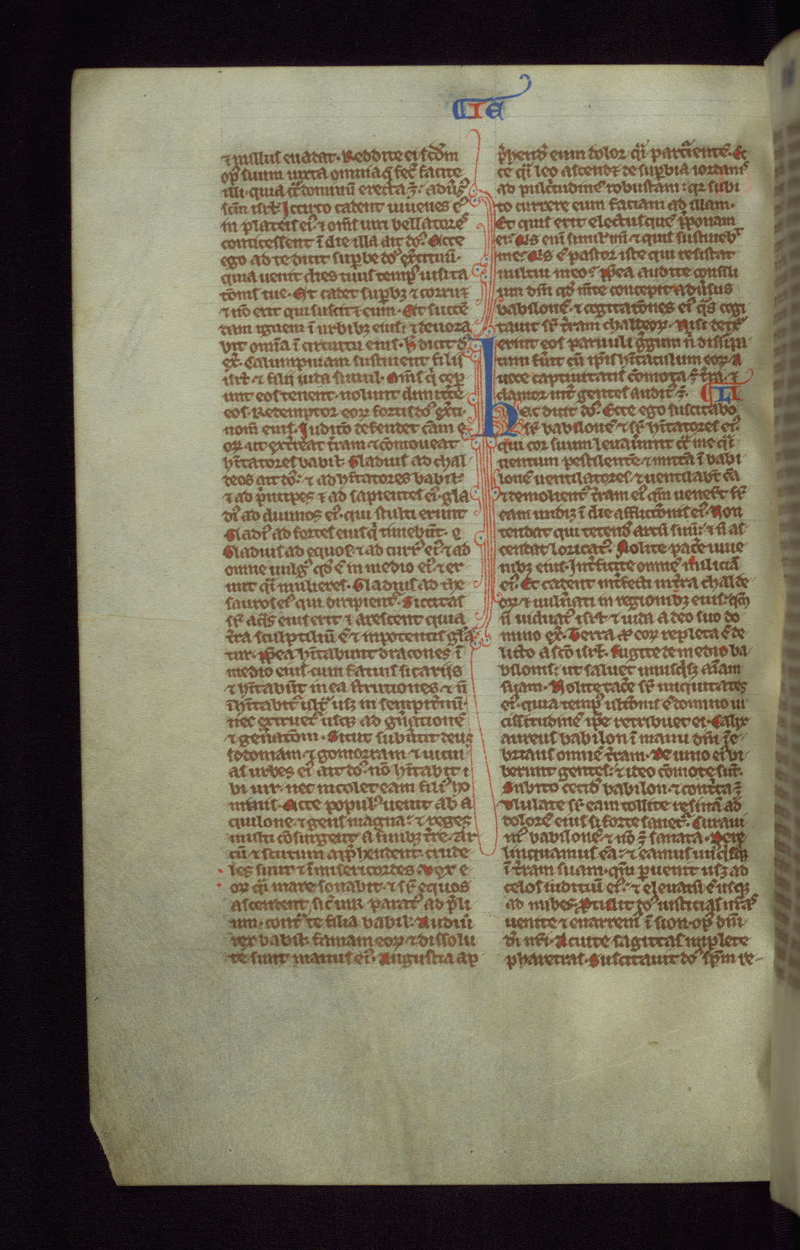 This pocket-size Bible was created around the middle of the thirteenth century in England. It contains the Vulgate text of the Old and New Testaments, arranged in order and divided into chapters. Such Bibles, designed for individual rather than institutional use, began to be created on a large scale during the thirteenth century, especially in Paris. This manuscript is illuminated with a large number of small historiated initials, and also includes a somewhat later image of the Three Living and the Three Dead, a popular scene based on a French poem of the same century.