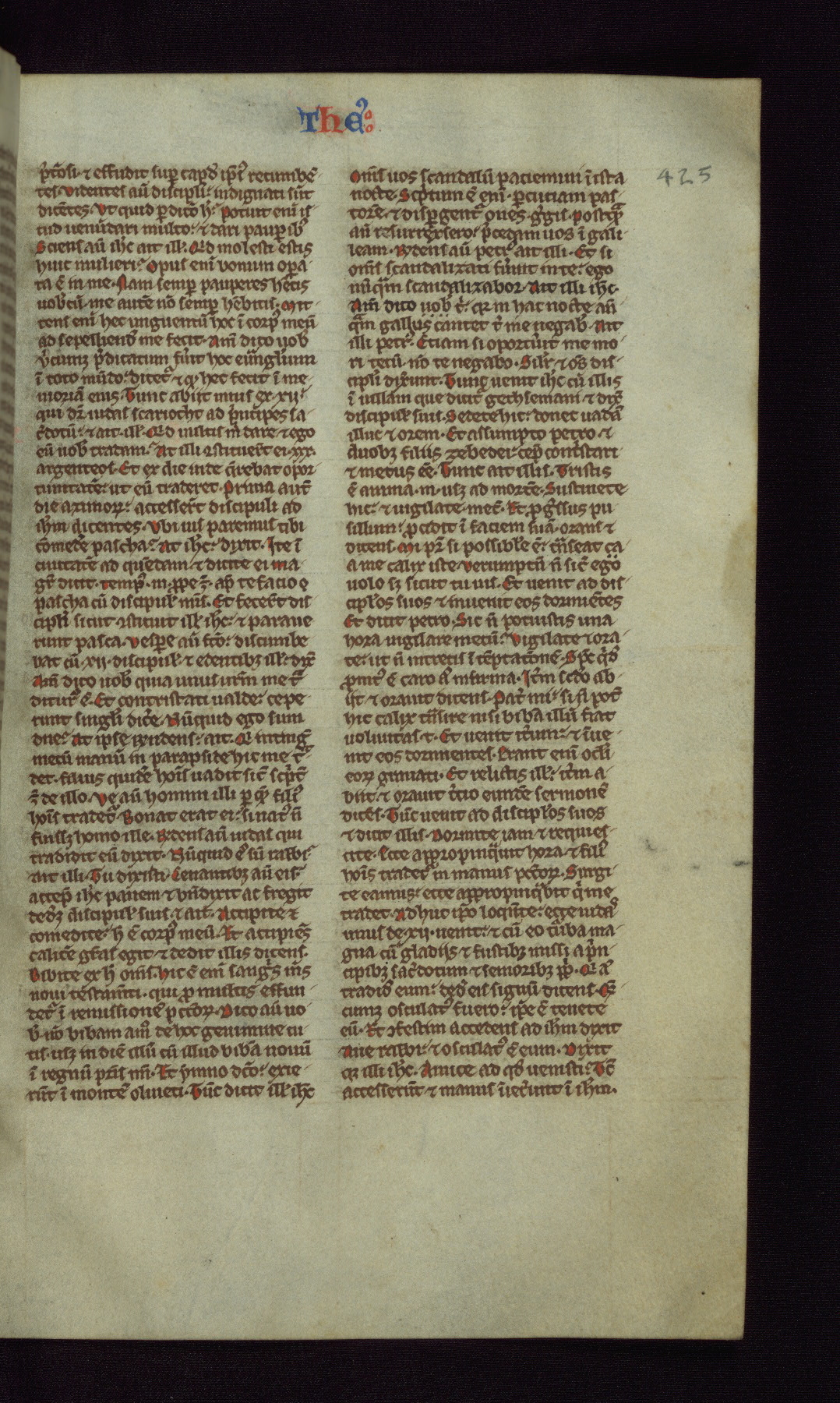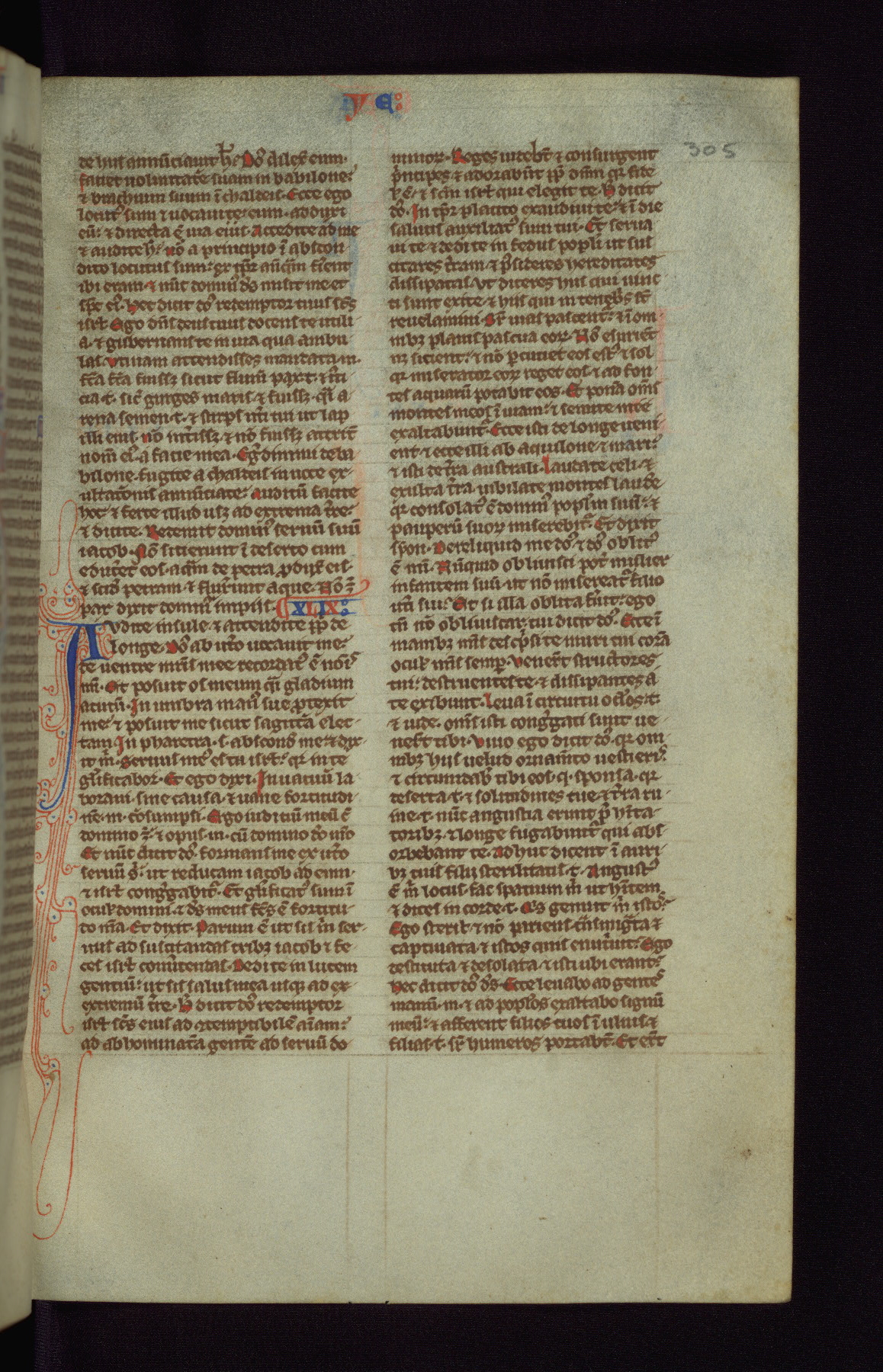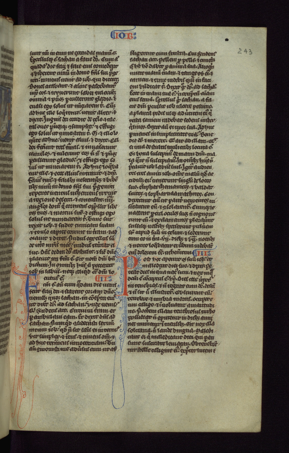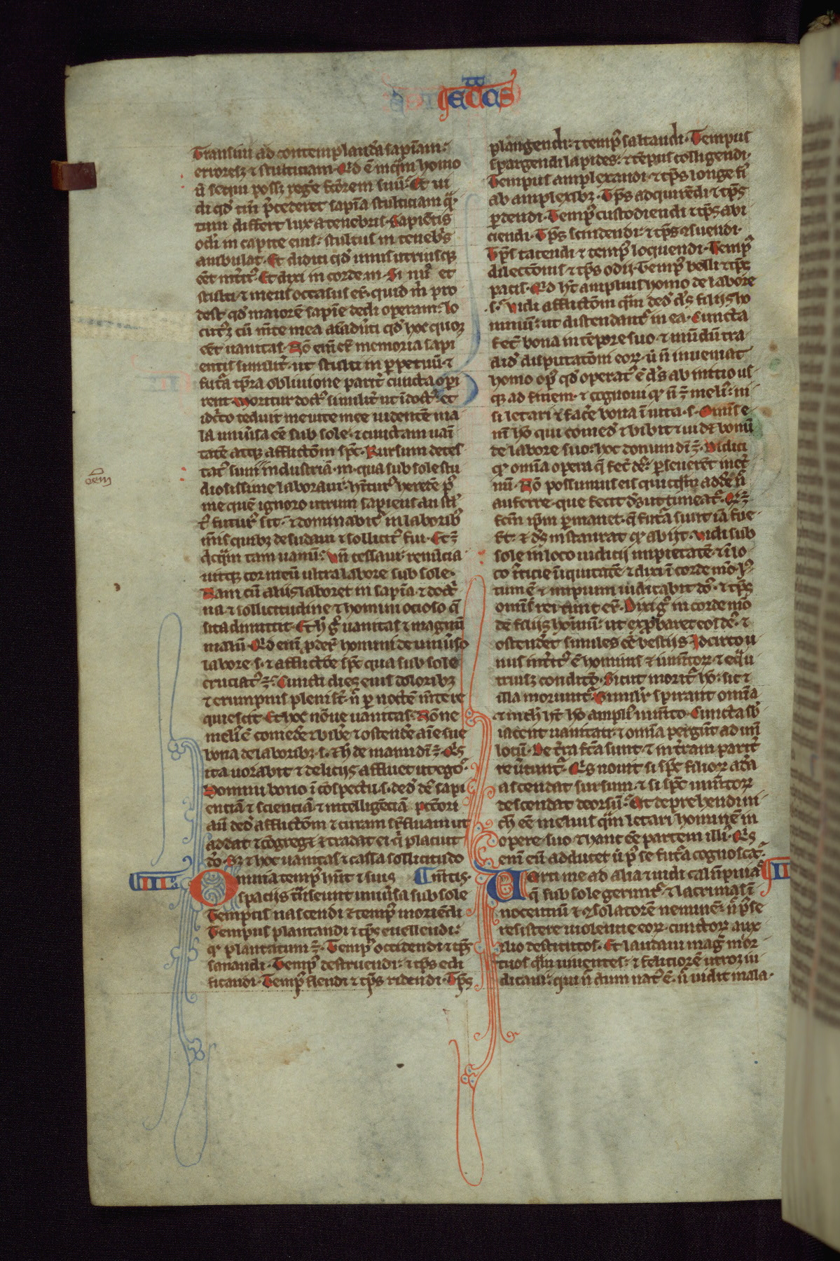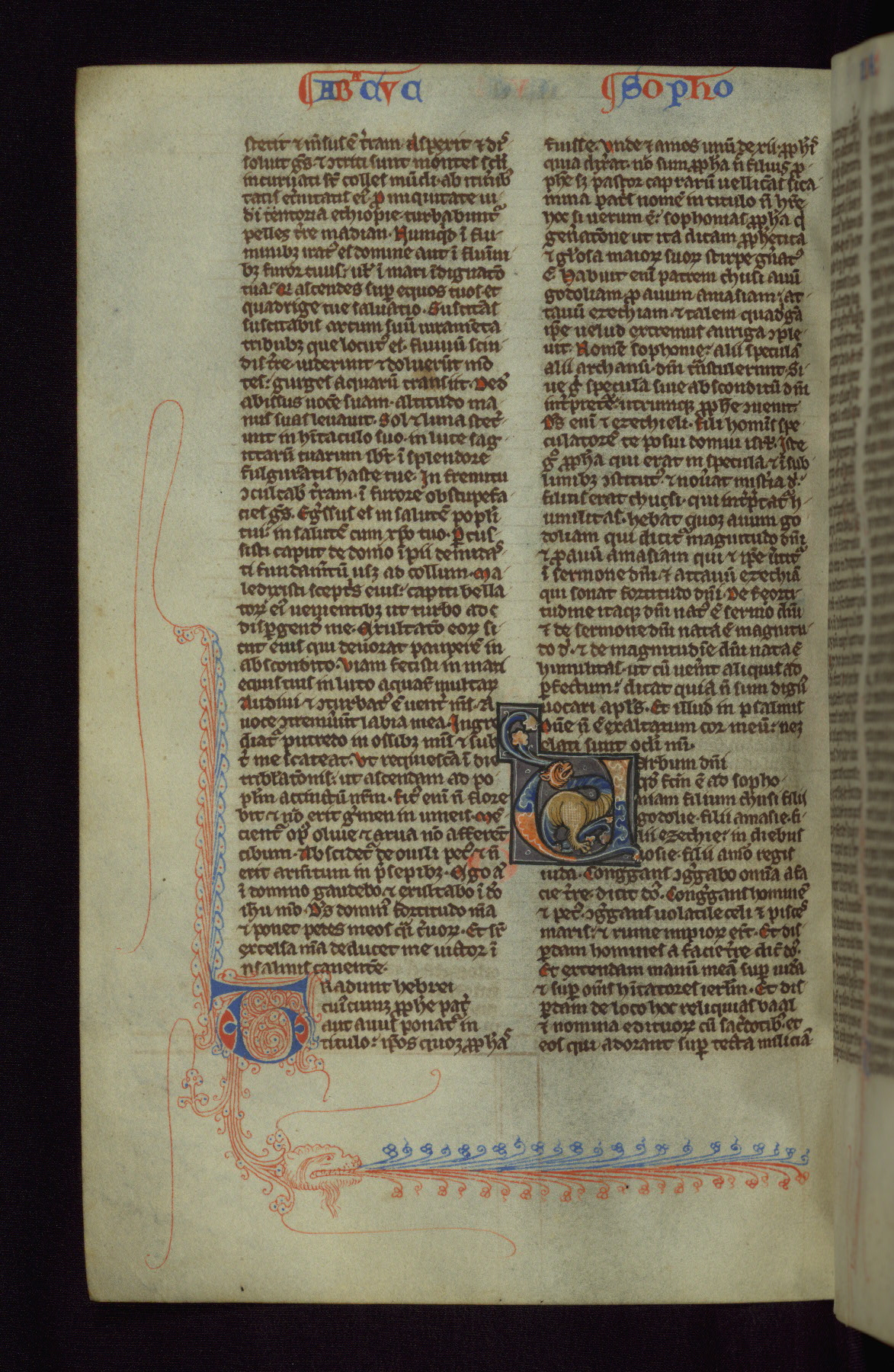 This pocket-size Bible was created around the middle of the thirteenth century in England. It contains the Vulgate text of the Old and New Testaments, arranged in order and divided into chapters. Such Bibles, designed for individual rather than institutional use, began to be created on a large scale during the thirteenth century, especially in Paris. This manuscript is illuminated with a large number of small historiated initials, and also includes a somewhat later image of the Three Living and the Three Dead, a popular scene based on a French poem of the same century.