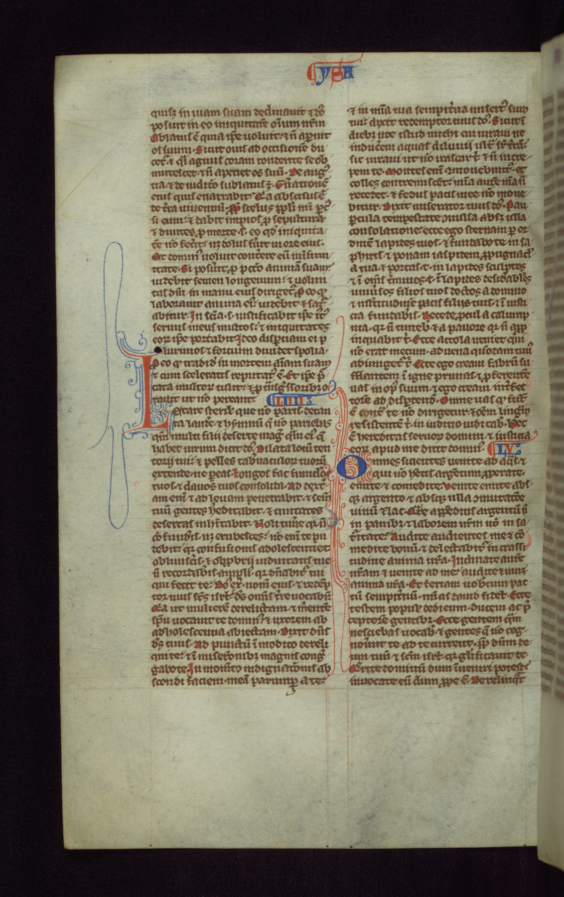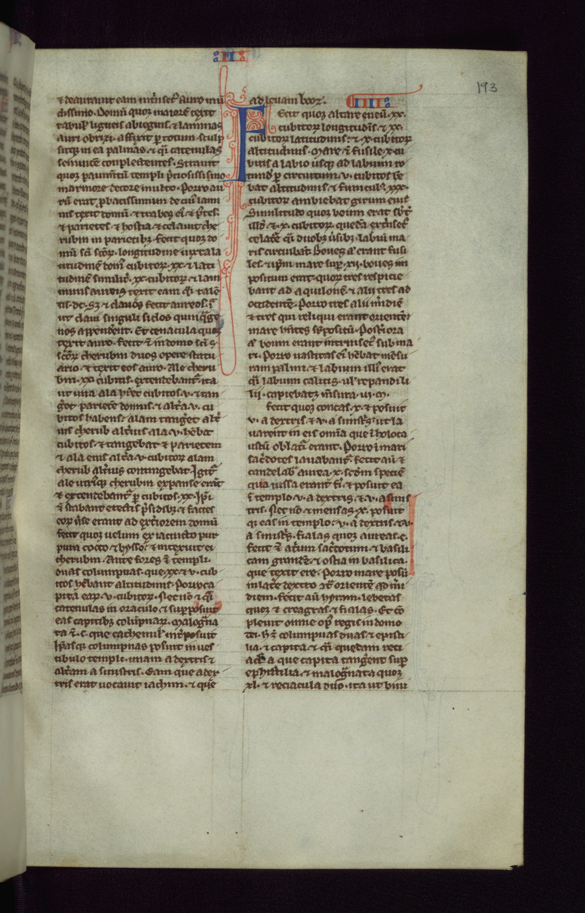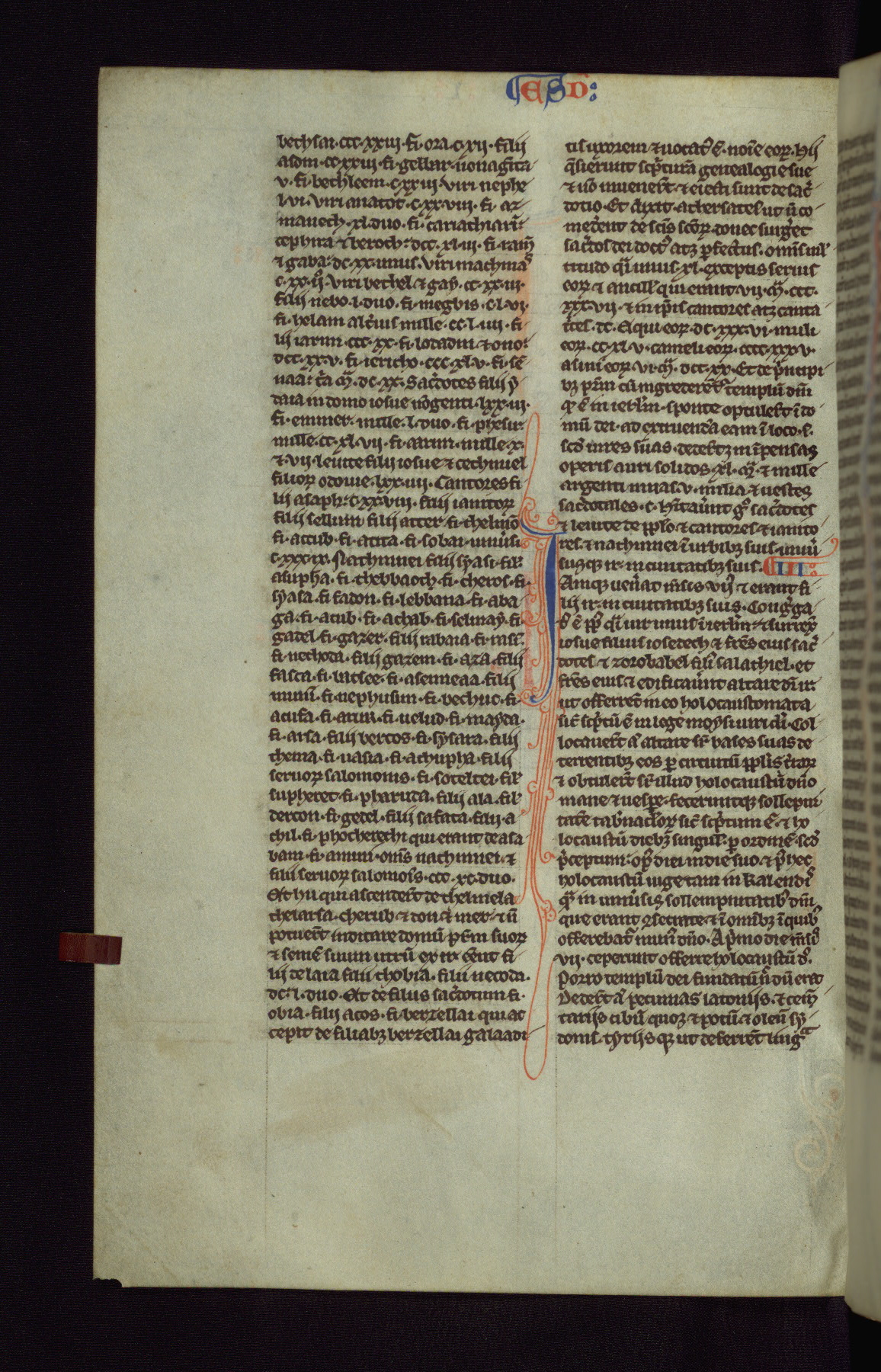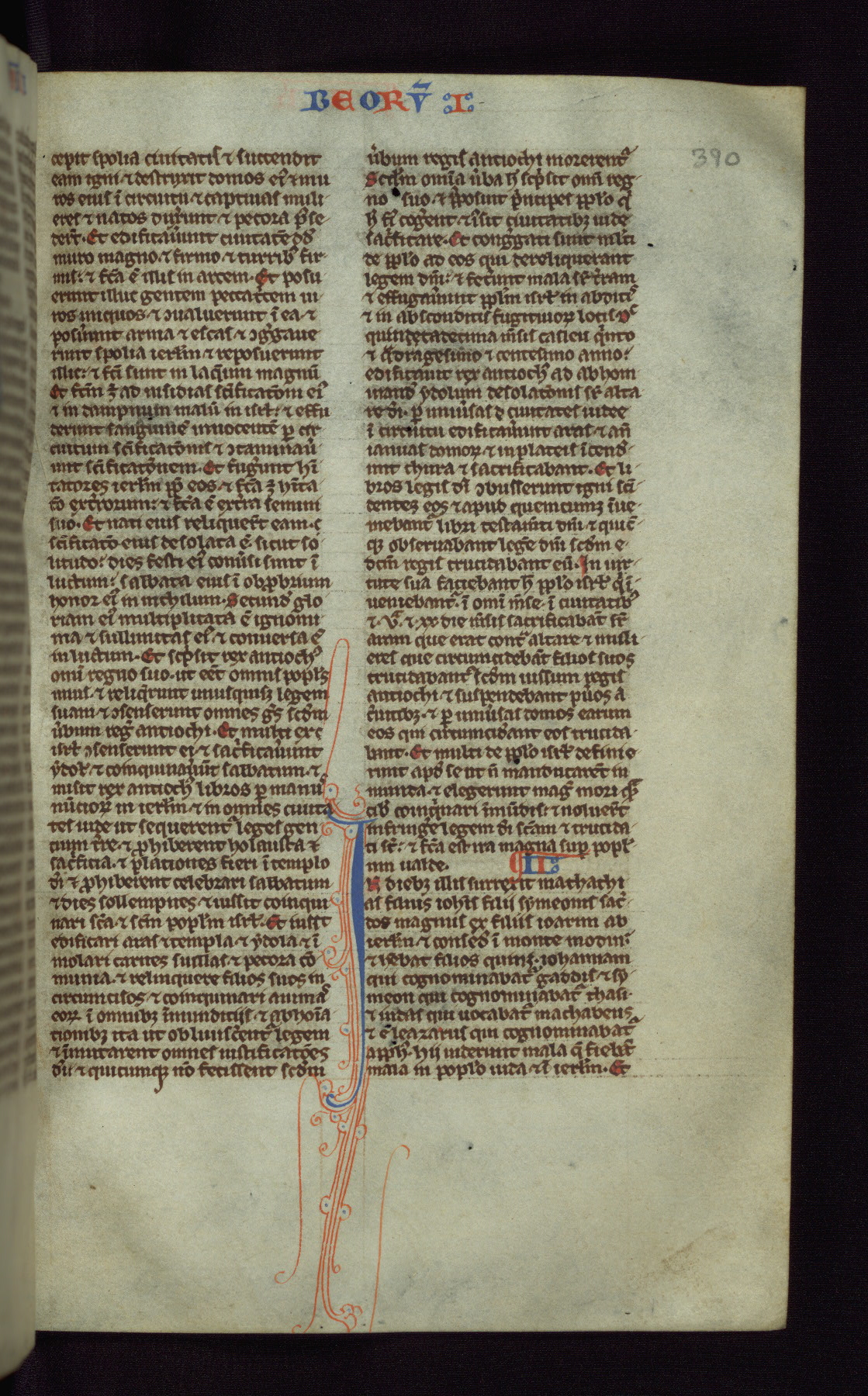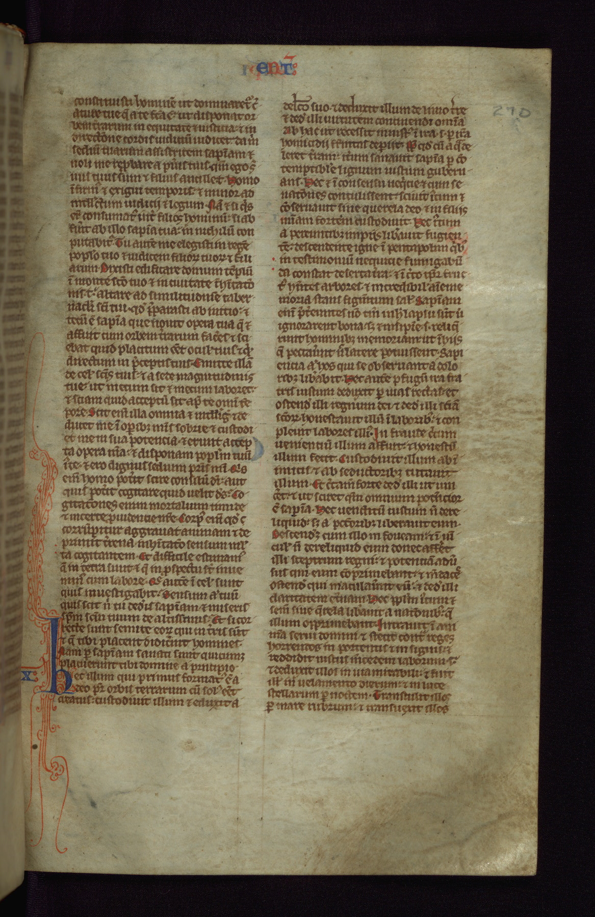 This pocket-size Bible was created around the middle of the thirteenth century in England. It contains the Vulgate text of the Old and New Testaments, arranged in order and divided into chapters. Such Bibles, designed for individual rather than institutional use, began to be created on a large scale during the thirteenth century, especially in Paris. This manuscript is illuminated with a large number of small historiated initials, and also includes a somewhat later image of the Three Living and the Three Dead, a popular scene based on a French poem of the same century.