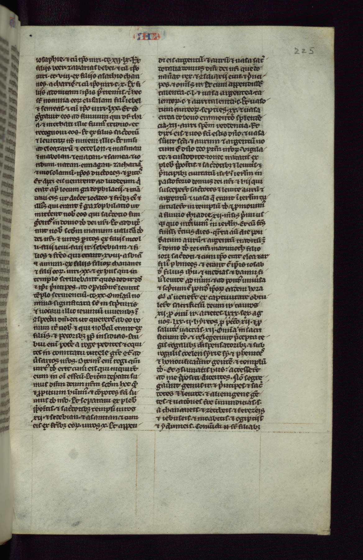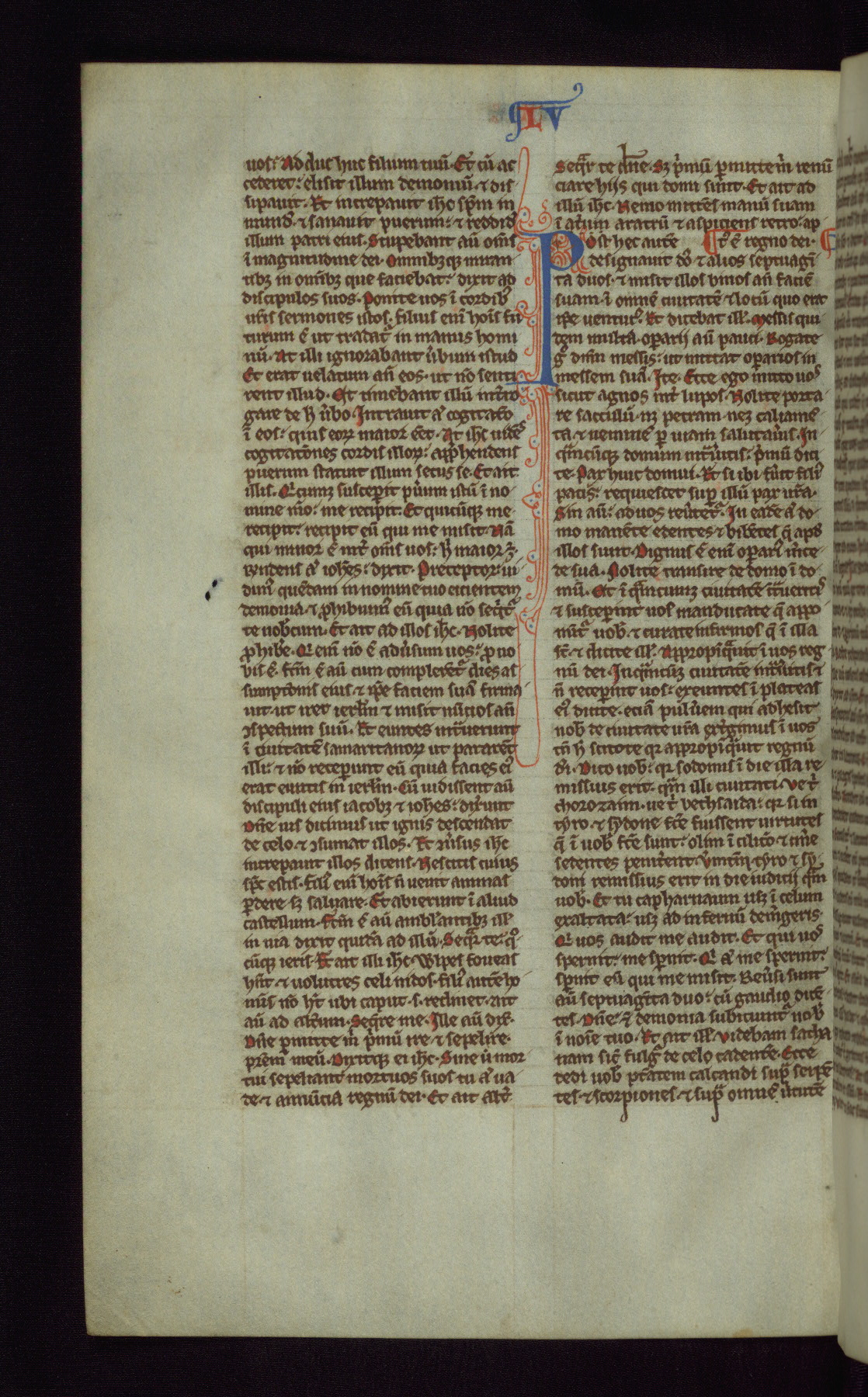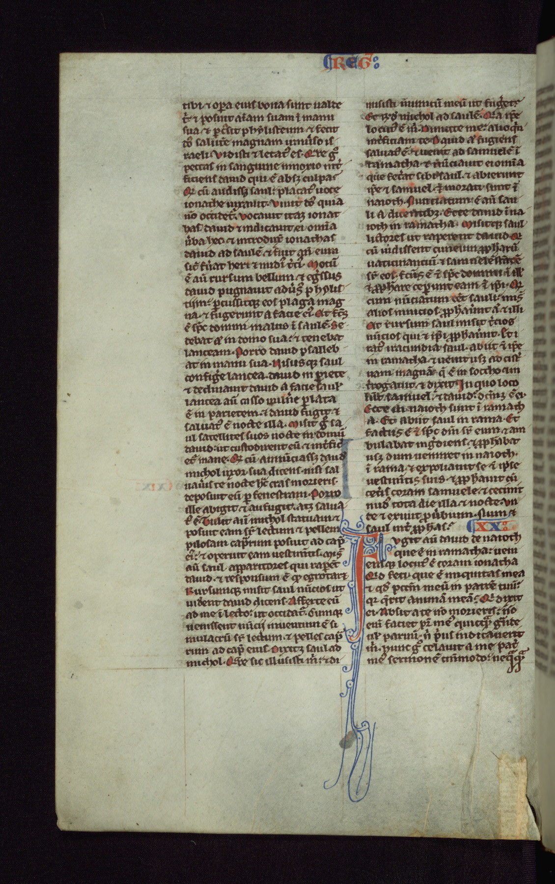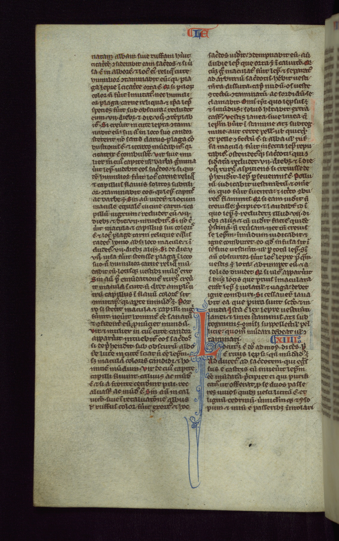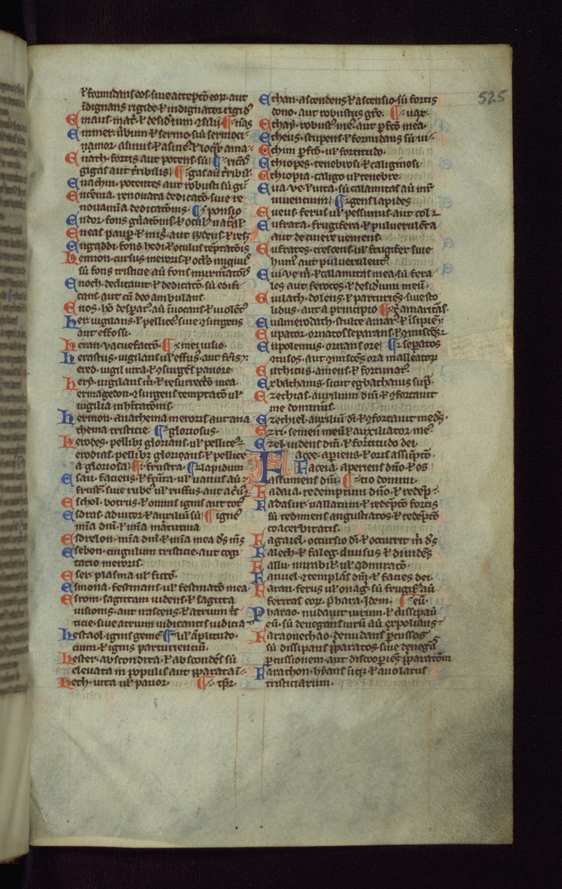 This pocket-size Bible was created around the middle of the thirteenth century in England. It contains the Vulgate text of the Old and New Testaments, arranged in order and divided into chapters. Such Bibles, designed for individual rather than institutional use, began to be created on a large scale during the thirteenth century, especially in Paris. This manuscript is illuminated with a large number of small historiated initials, and also includes a somewhat later image of the Three Living and the Three Dead, a popular scene based on a French poem of the same century.