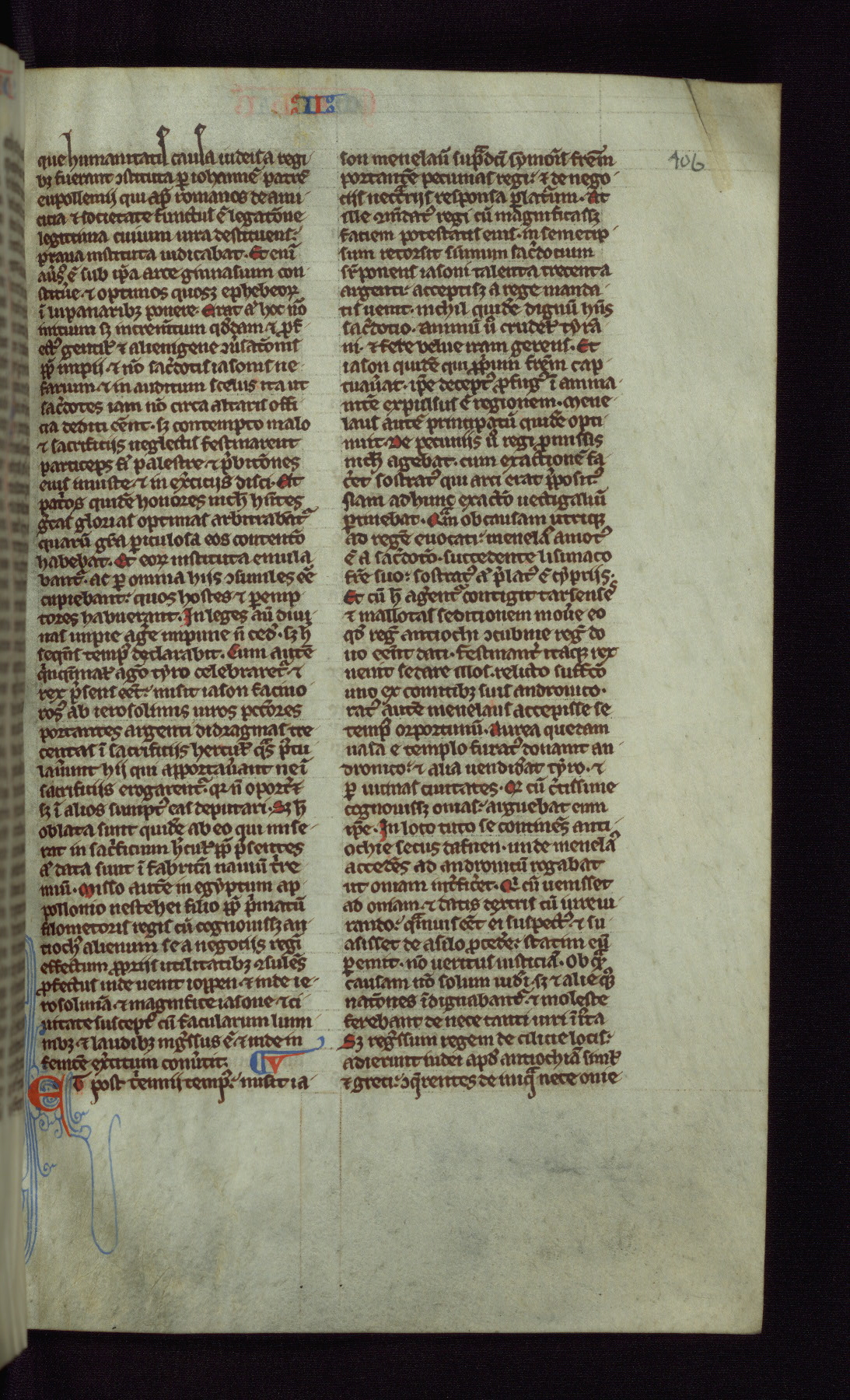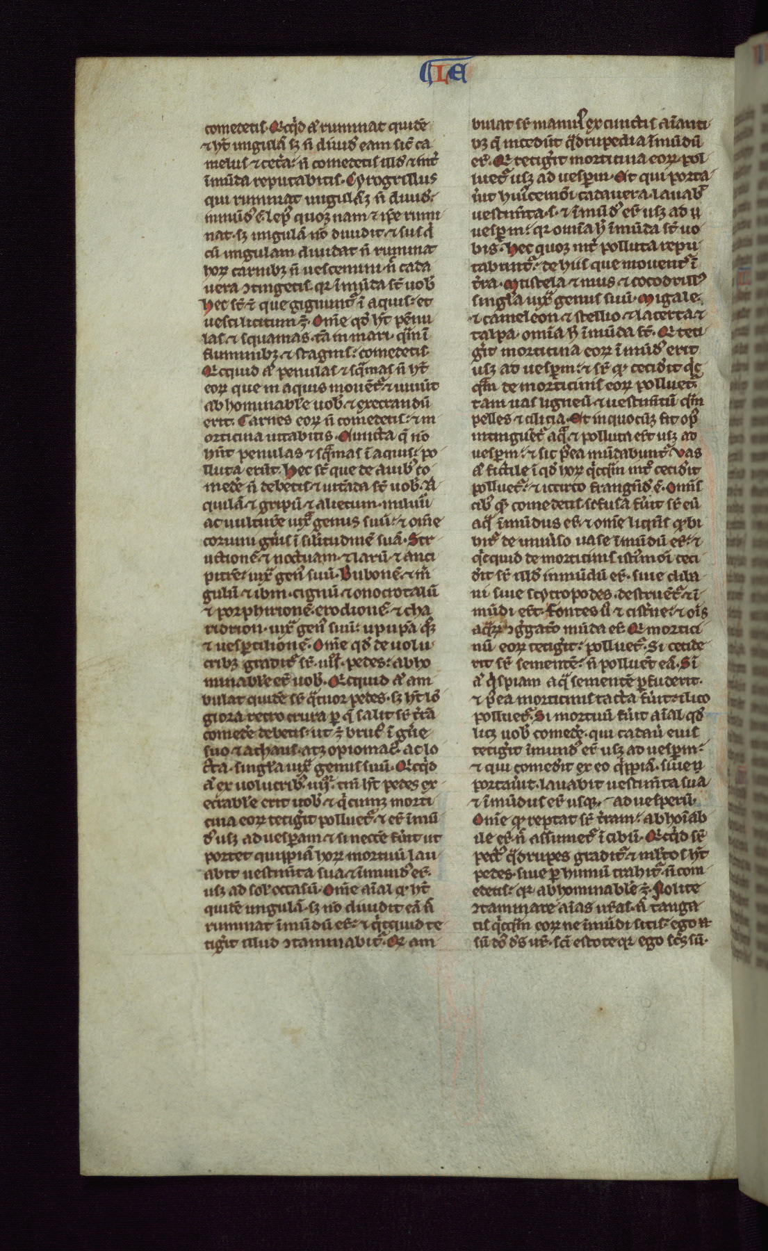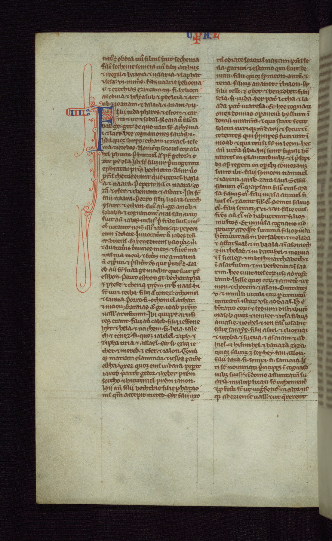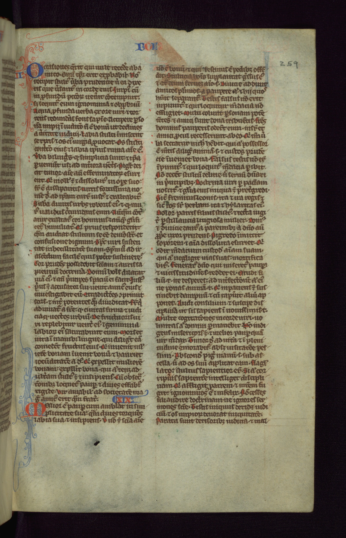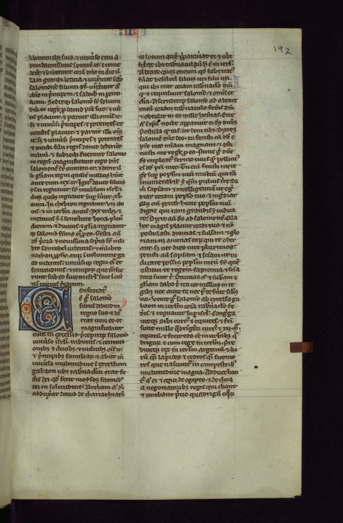 This pocket-size Bible was created around the middle of the thirteenth century in England. It contains the Vulgate text of the Old and New Testaments, arranged in order and divided into chapters. Such Bibles, designed for individual rather than institutional use, began to be created on a large scale during the thirteenth century, especially in Paris. This manuscript is illuminated with a large number of small historiated initials, and also includes a somewhat later image of the Three Living and the Three Dead, a popular scene based on a French poem of the same century.