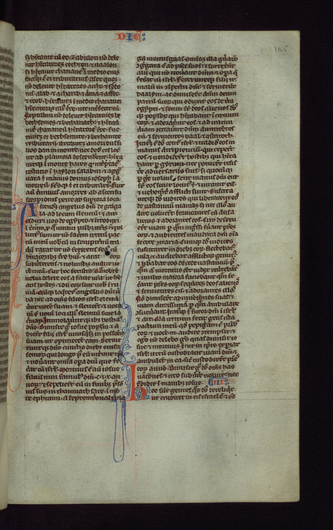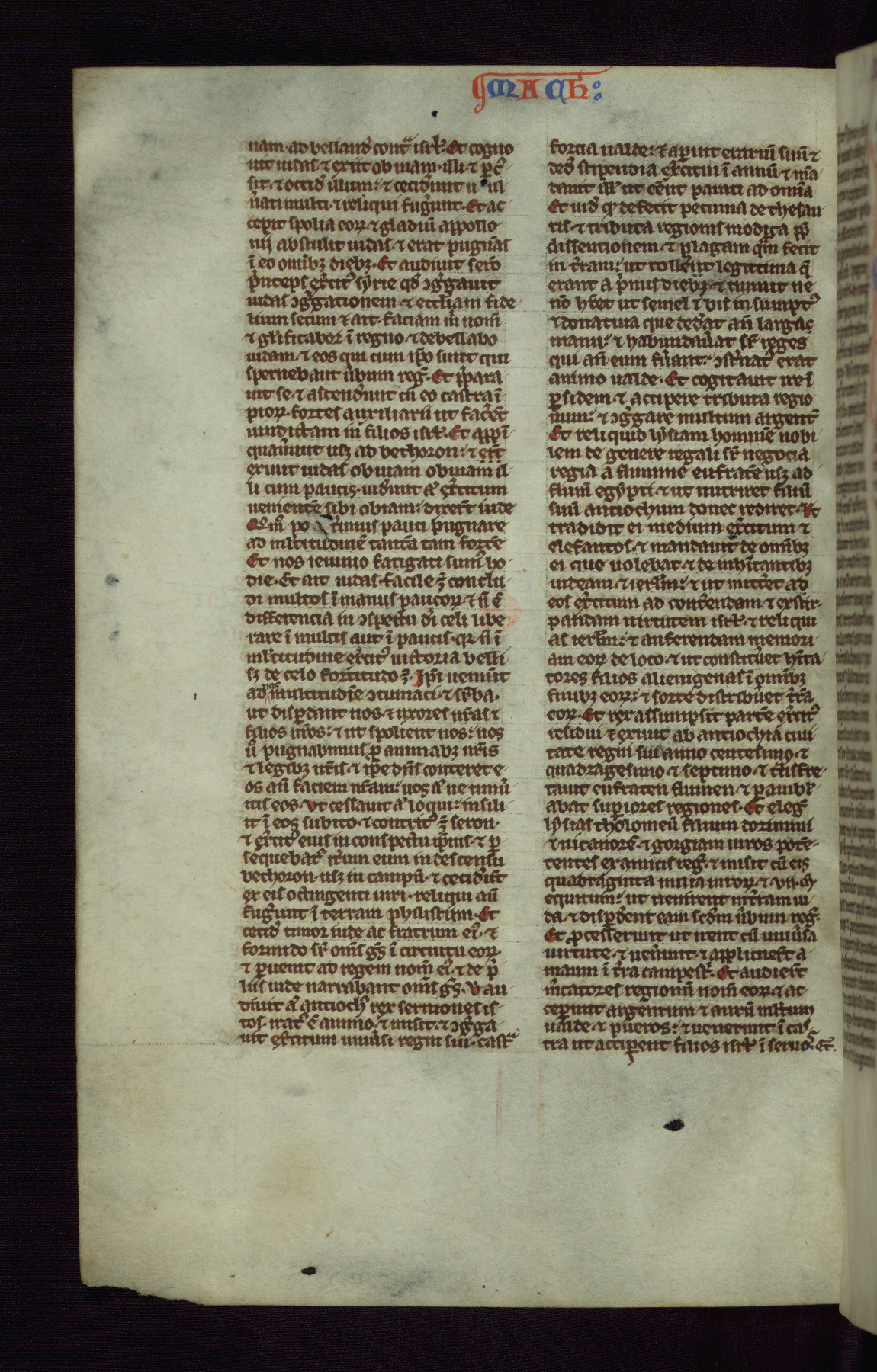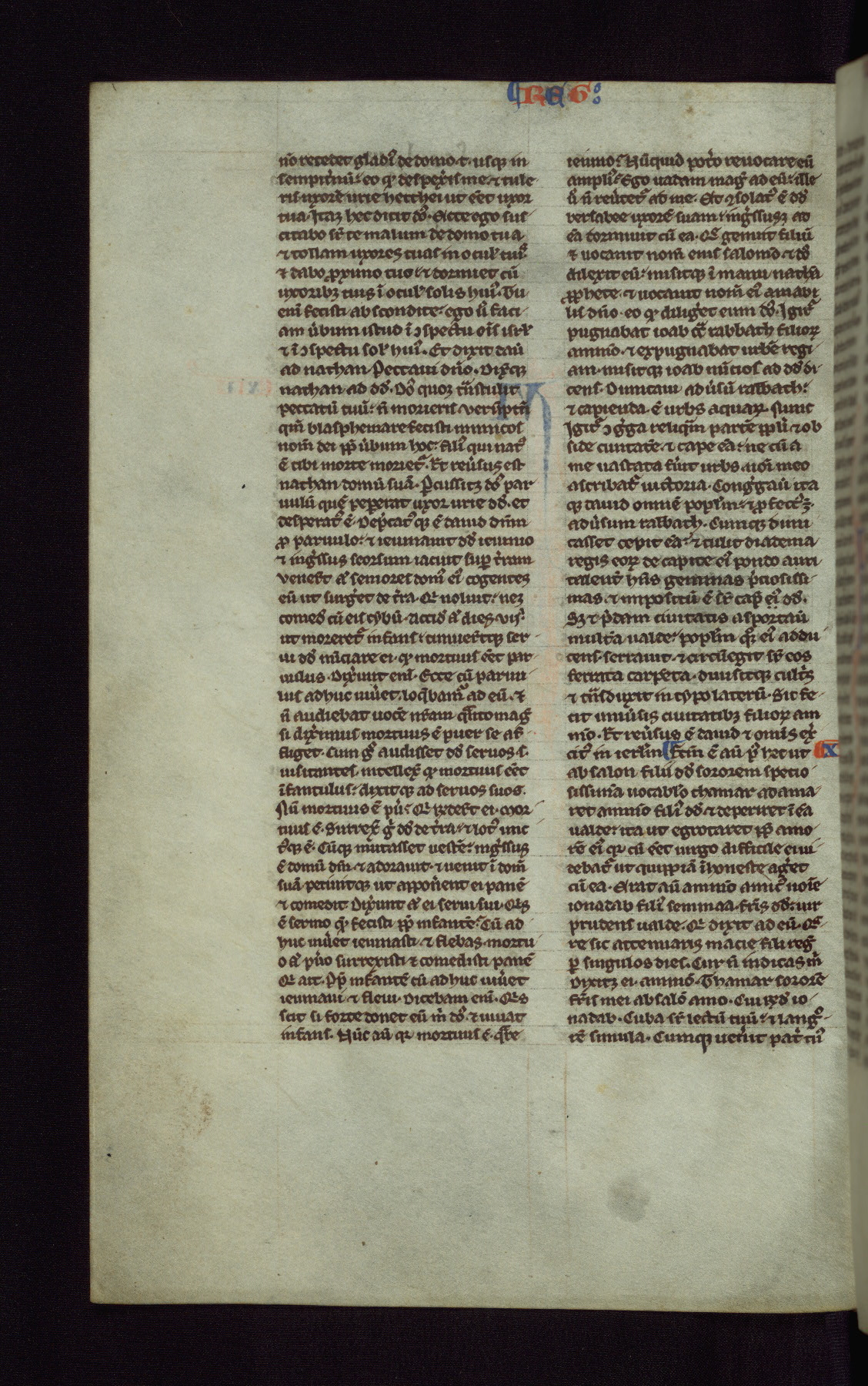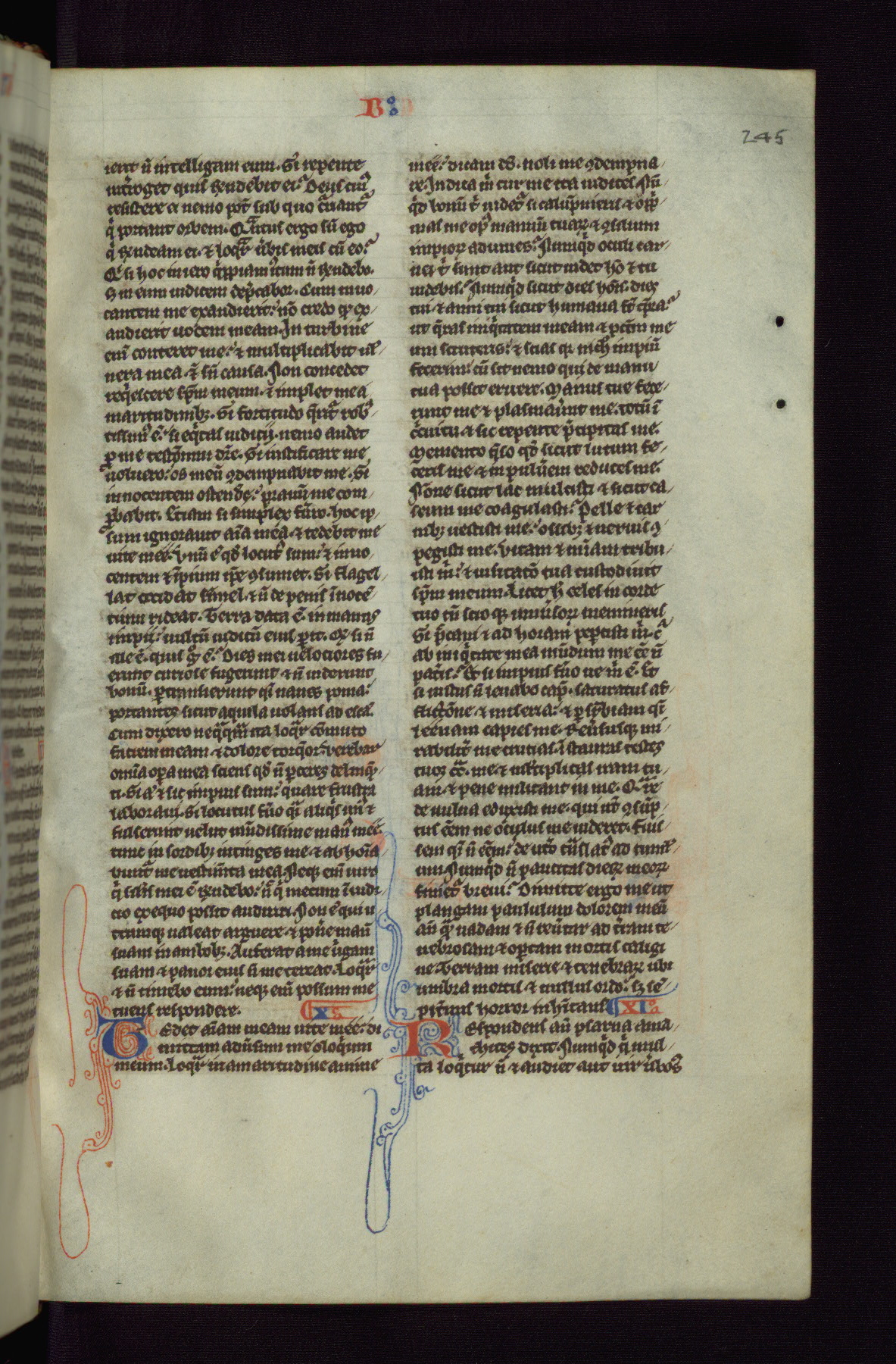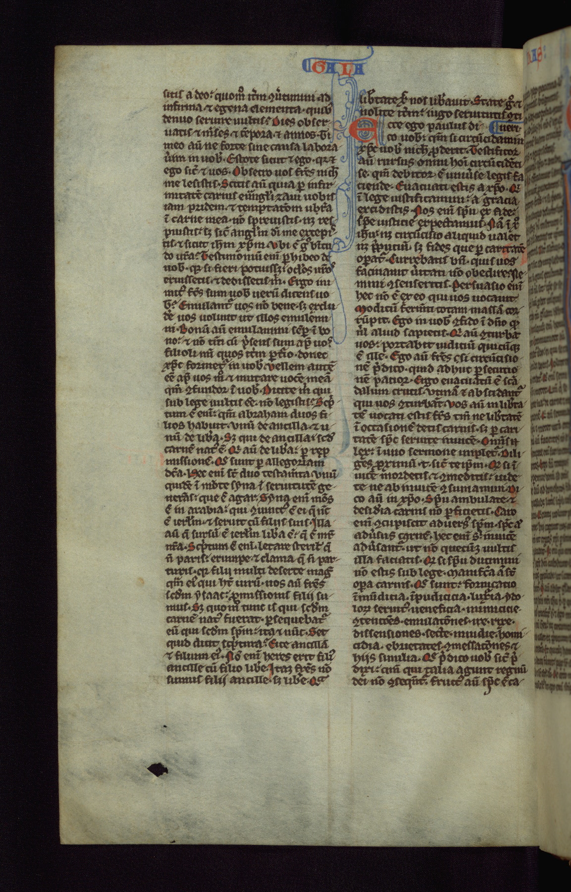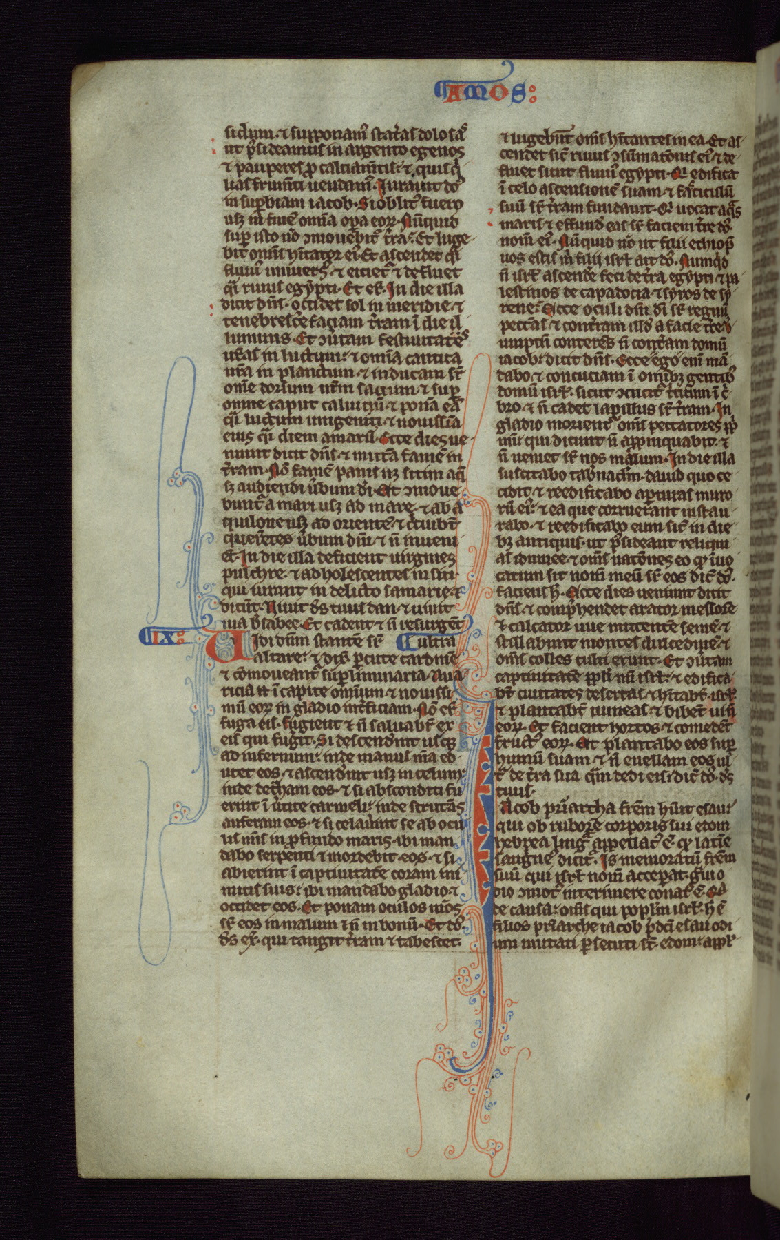 This pocket-size Bible was created around the middle of the thirteenth century in England. It contains the Vulgate text of the Old and New Testaments, arranged in order and divided into chapters. Such Bibles, designed for individual rather than institutional use, began to be created on a large scale during the thirteenth century, especially in Paris. This manuscript is illuminated with a large number of small historiated initials, and also includes a somewhat later image of the Three Living and the Three Dead, a popular scene based on a French poem of the same century.