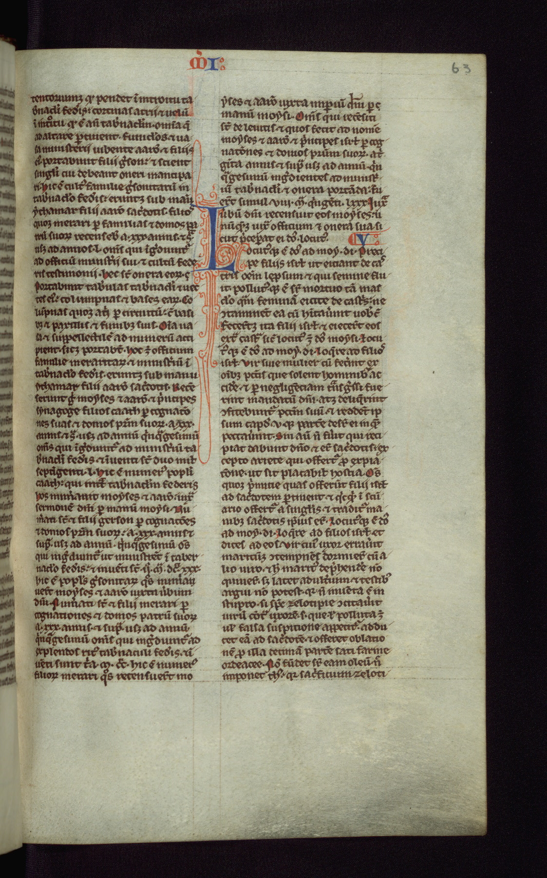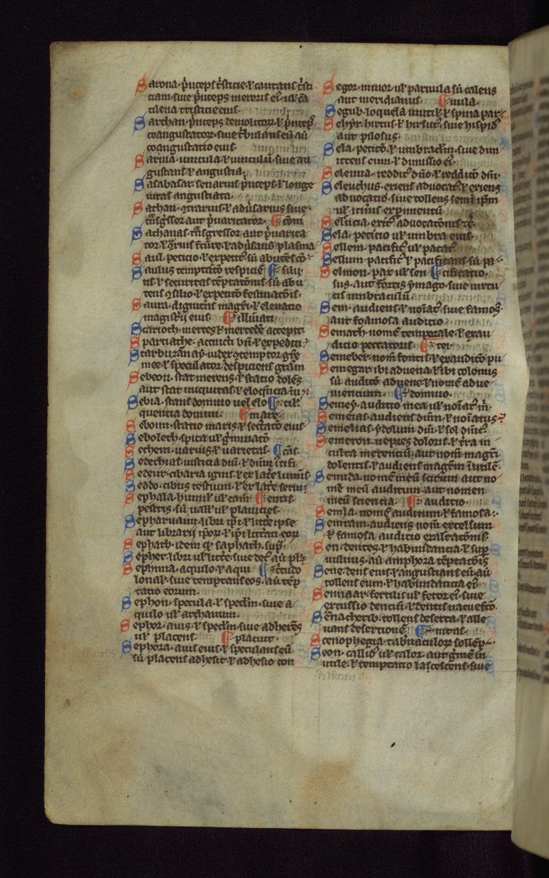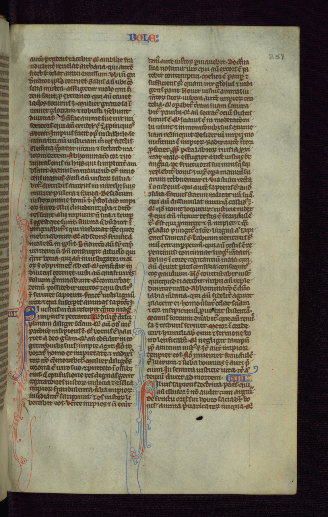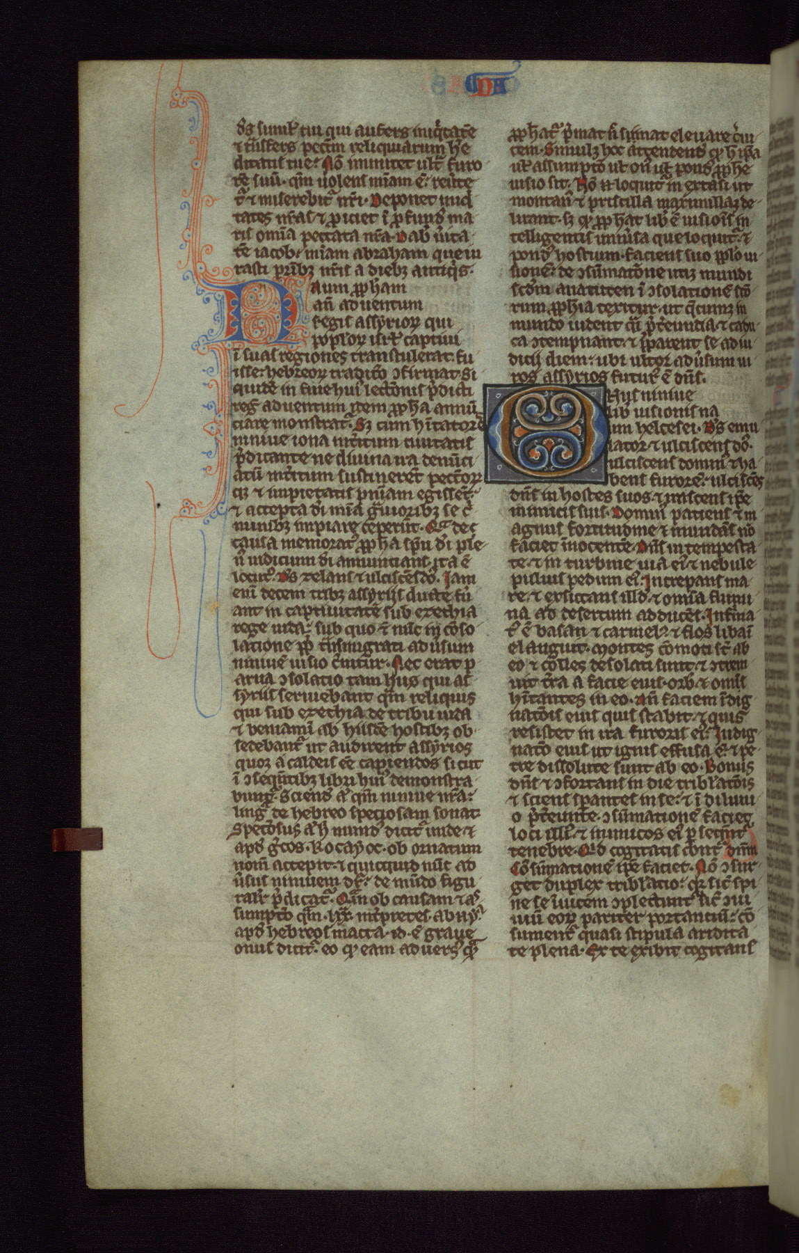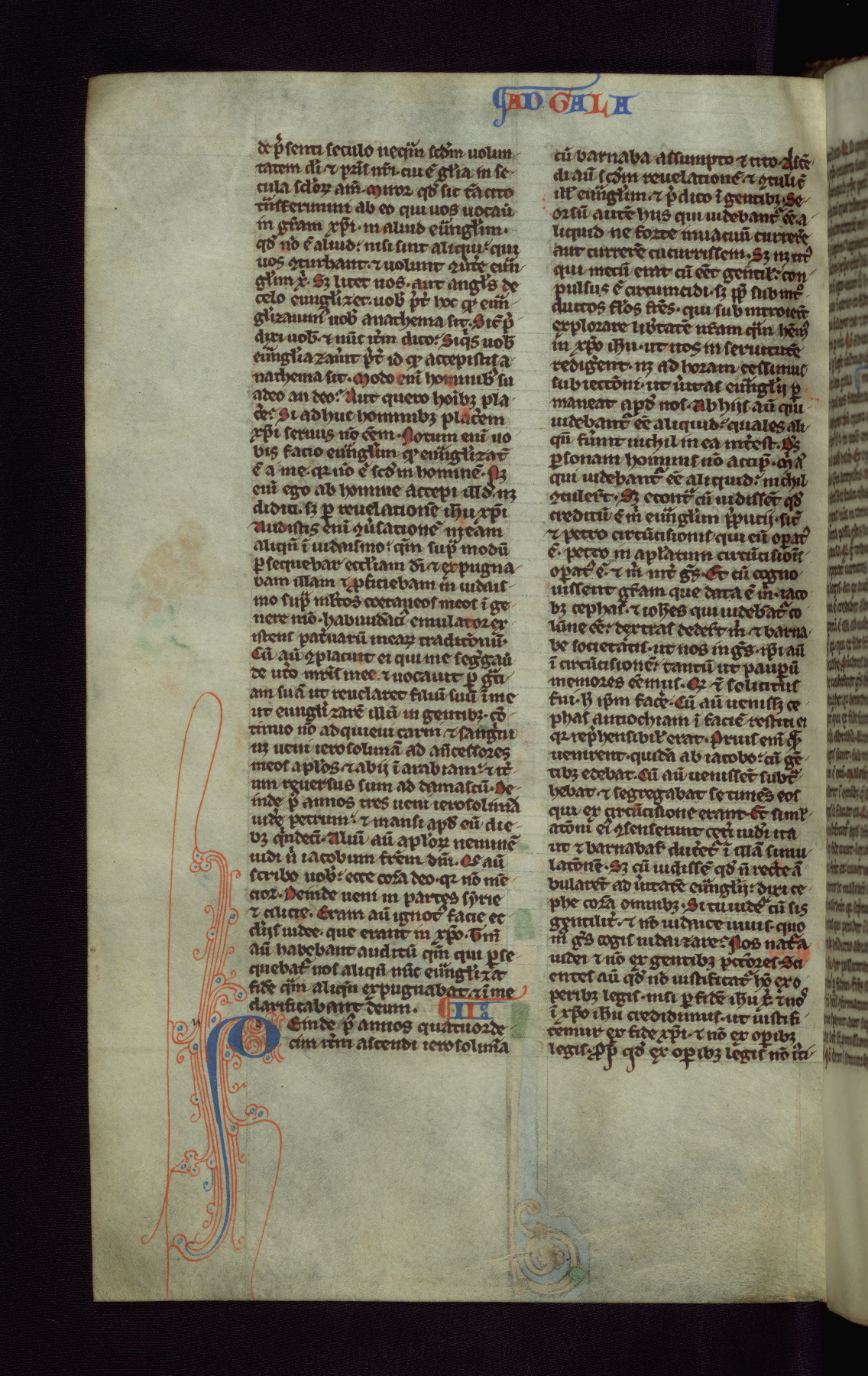 This pocket-size Bible was created around the middle of the thirteenth century in England. It contains the Vulgate text of the Old and New Testaments, arranged in order and divided into chapters. Such Bibles, designed for individual rather than institutional use, began to be created on a large scale during the thirteenth century, especially in Paris. This manuscript is illuminated with a large number of small historiated initials, and also includes a somewhat later image of the Three Living and the Three Dead, a popular scene based on a French poem of the same century.