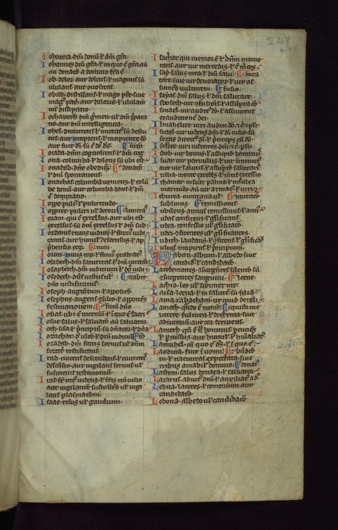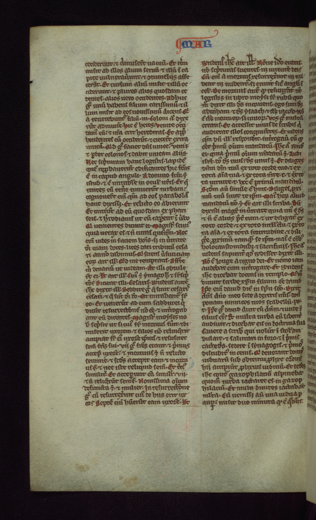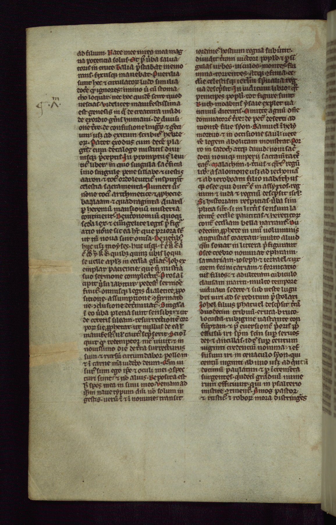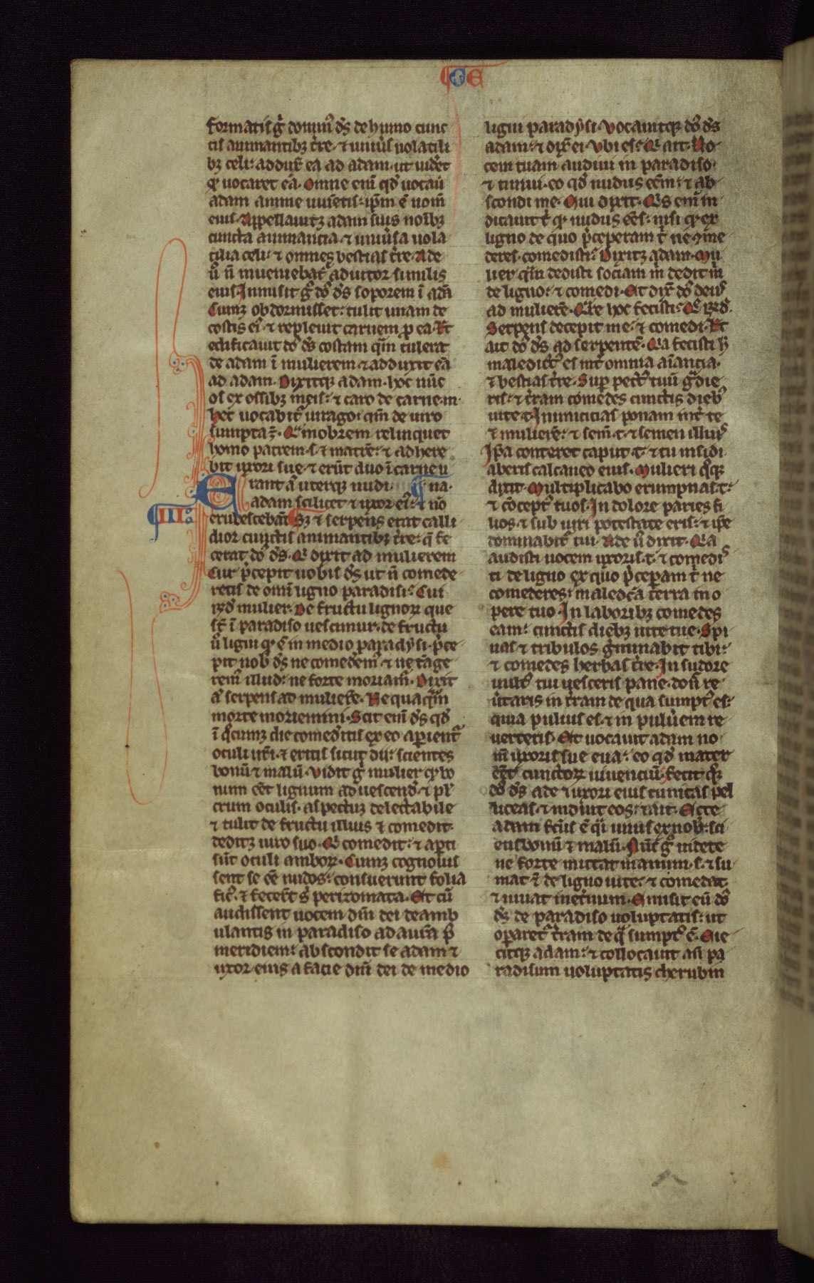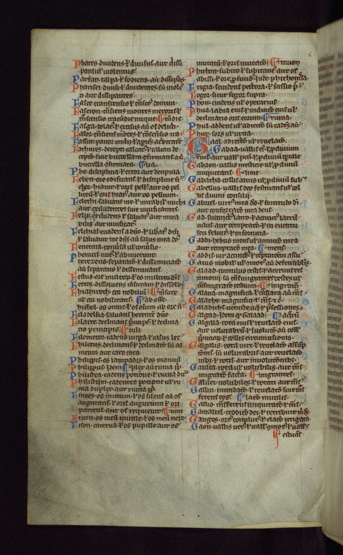 This pocket-size Bible was created around the middle of the thirteenth century in England. It contains the Vulgate text of the Old and New Testaments, arranged in order and divided into chapters. Such Bibles, designed for individual rather than institutional use, began to be created on a large scale during the thirteenth century, especially in Paris. This manuscript is illuminated with a large number of small historiated initials, and also includes a somewhat later image of the Three Living and the Three Dead, a popular scene based on a French poem of the same century.