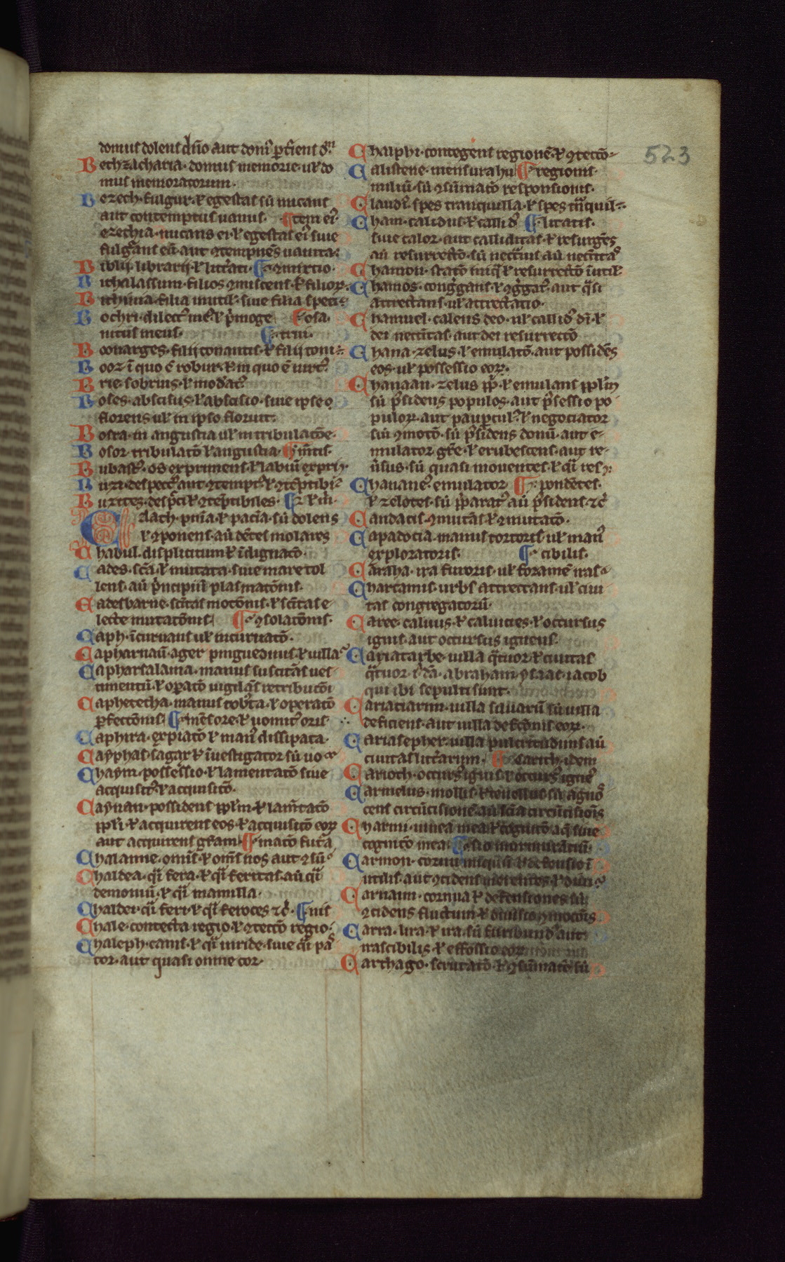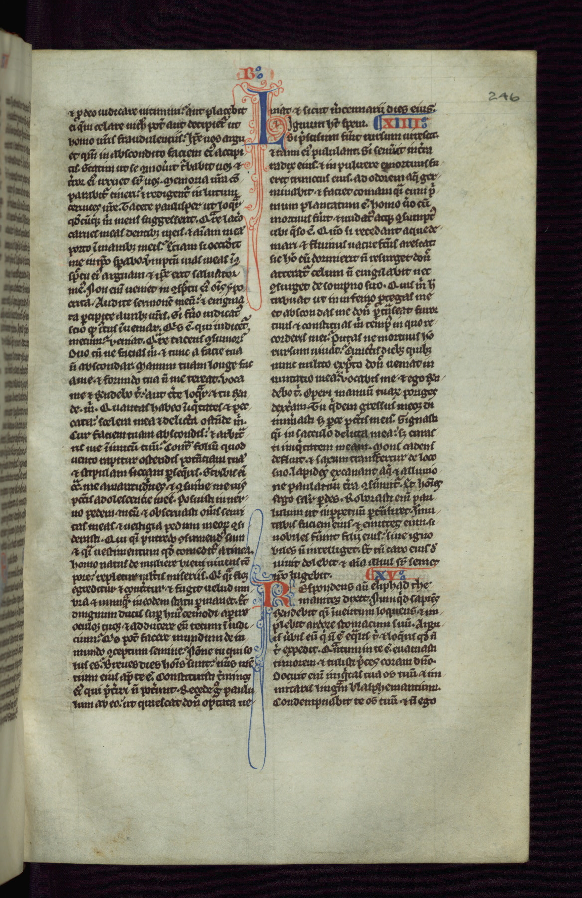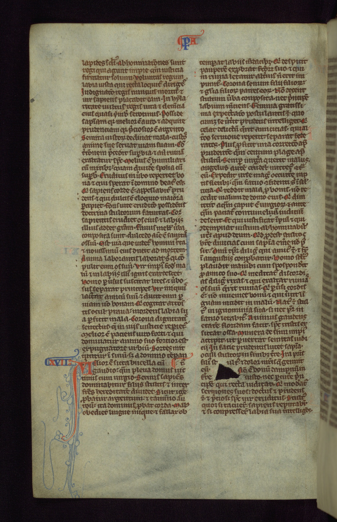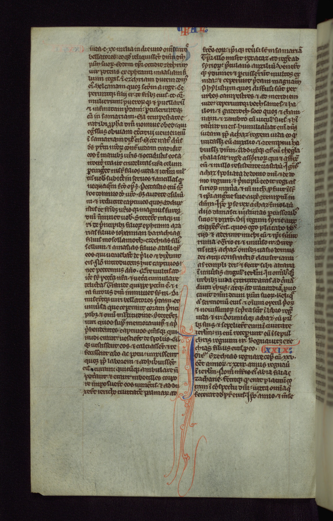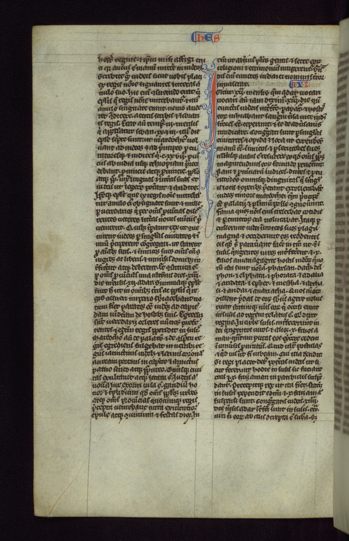 This pocket-size Bible was created around the middle of the thirteenth century in England. It contains the Vulgate text of the Old and New Testaments, arranged in order and divided into chapters. Such Bibles, designed for individual rather than institutional use, began to be created on a large scale during the thirteenth century, especially in Paris. This manuscript is illuminated with a large number of small historiated initials, and also includes a somewhat later image of the Three Living and the Three Dead, a popular scene based on a French poem of the same century.