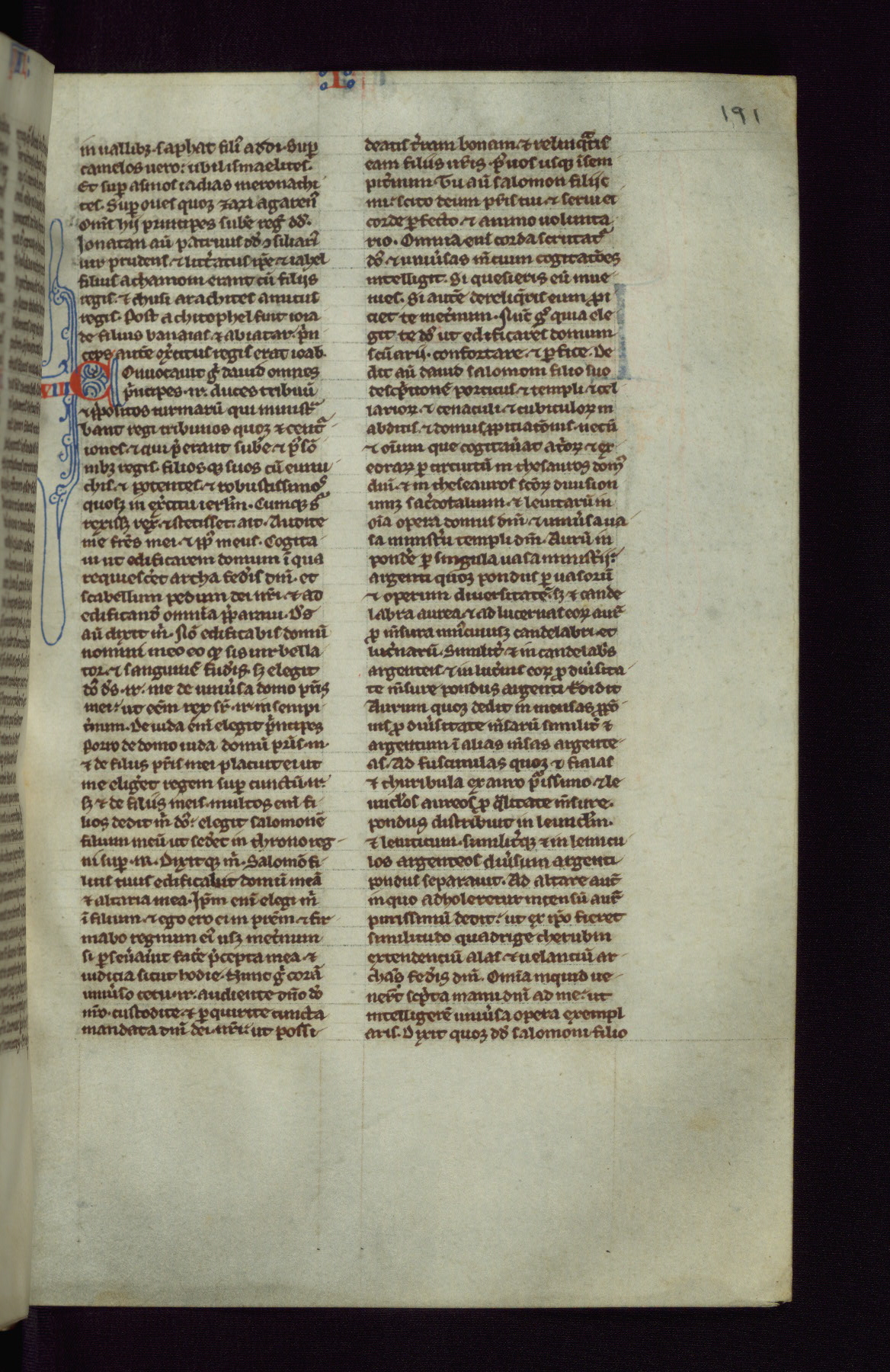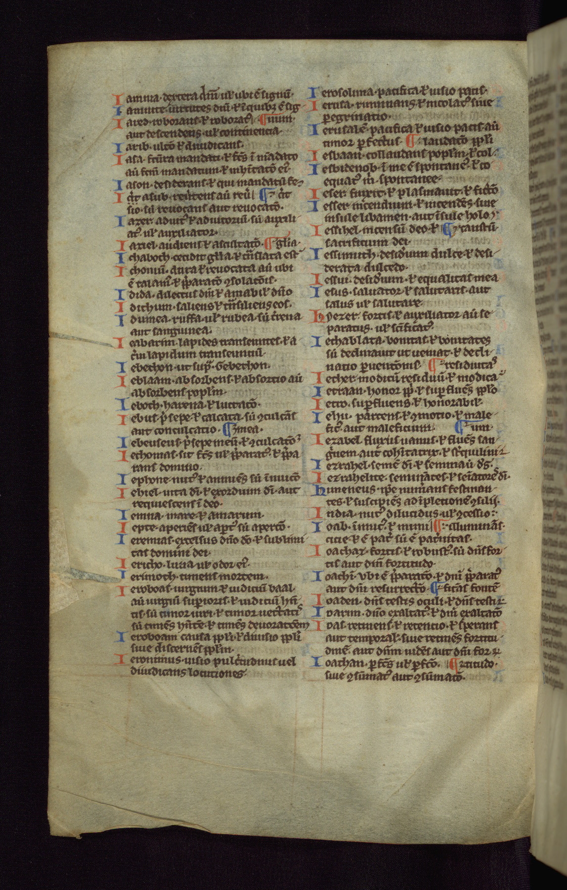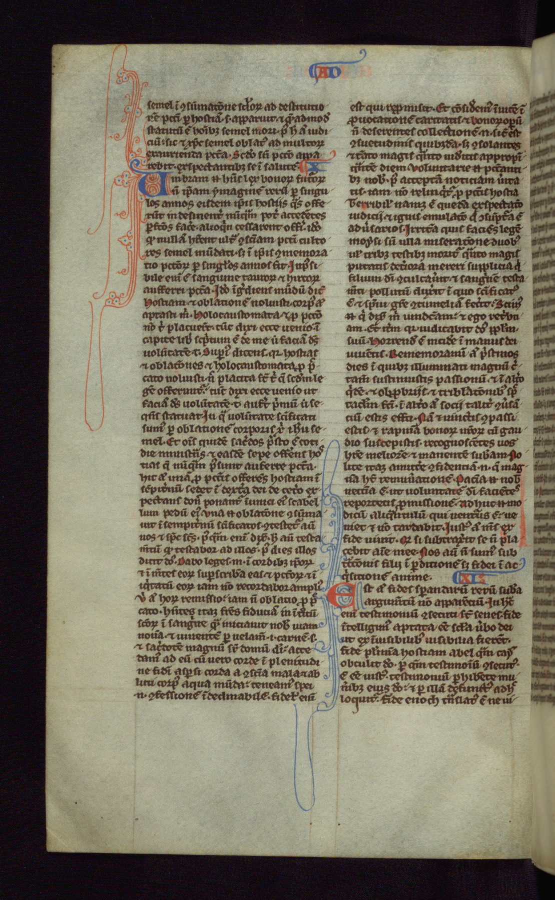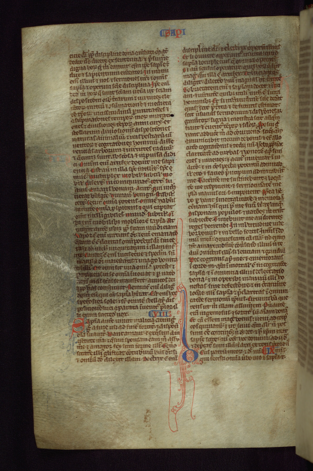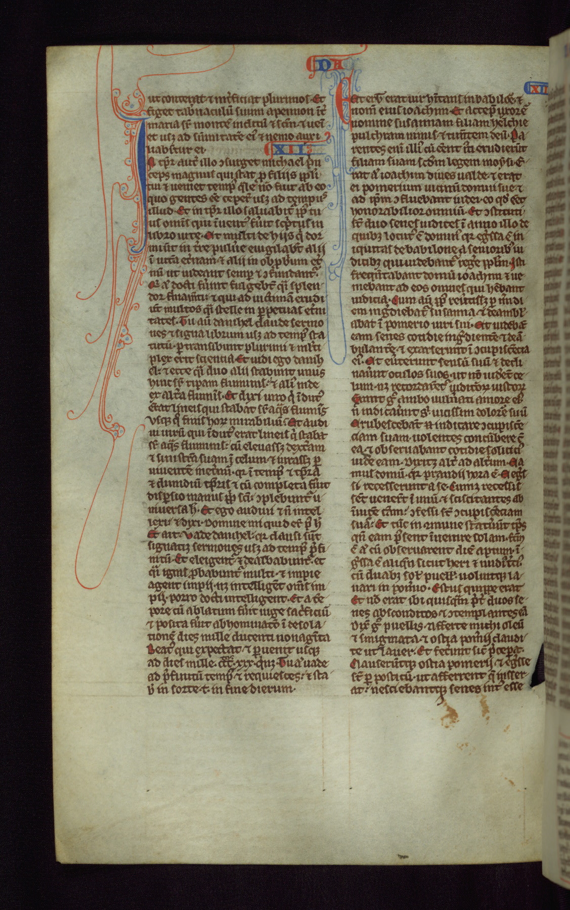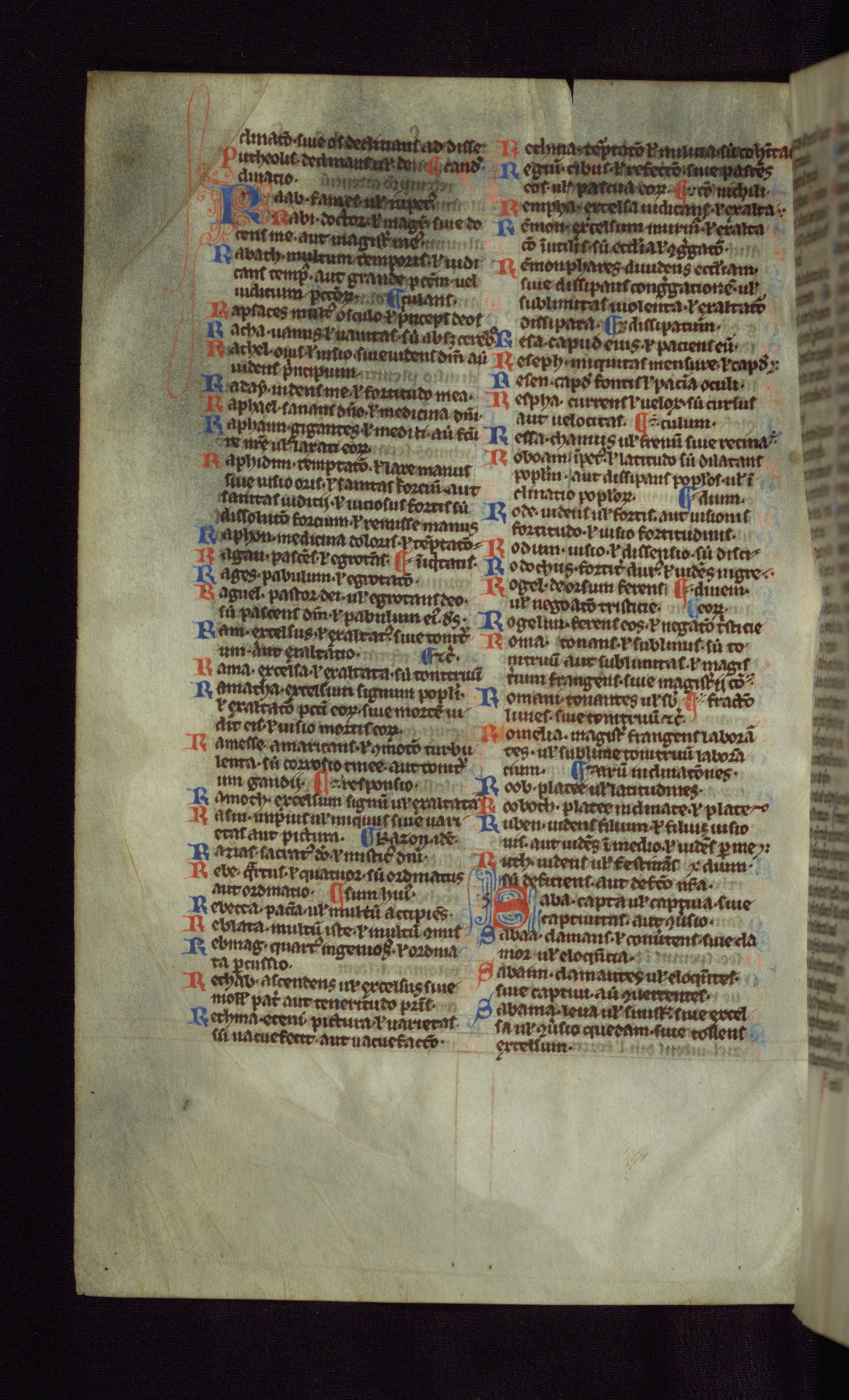 This pocket-size Bible was created around the middle of the thirteenth century in England. It contains the Vulgate text of the Old and New Testaments, arranged in order and divided into chapters. Such Bibles, designed for individual rather than institutional use, began to be created on a large scale during the thirteenth century, especially in Paris. This manuscript is illuminated with a large number of small historiated initials, and also includes a somewhat later image of the Three Living and the Three Dead, a popular scene based on a French poem of the same century.
