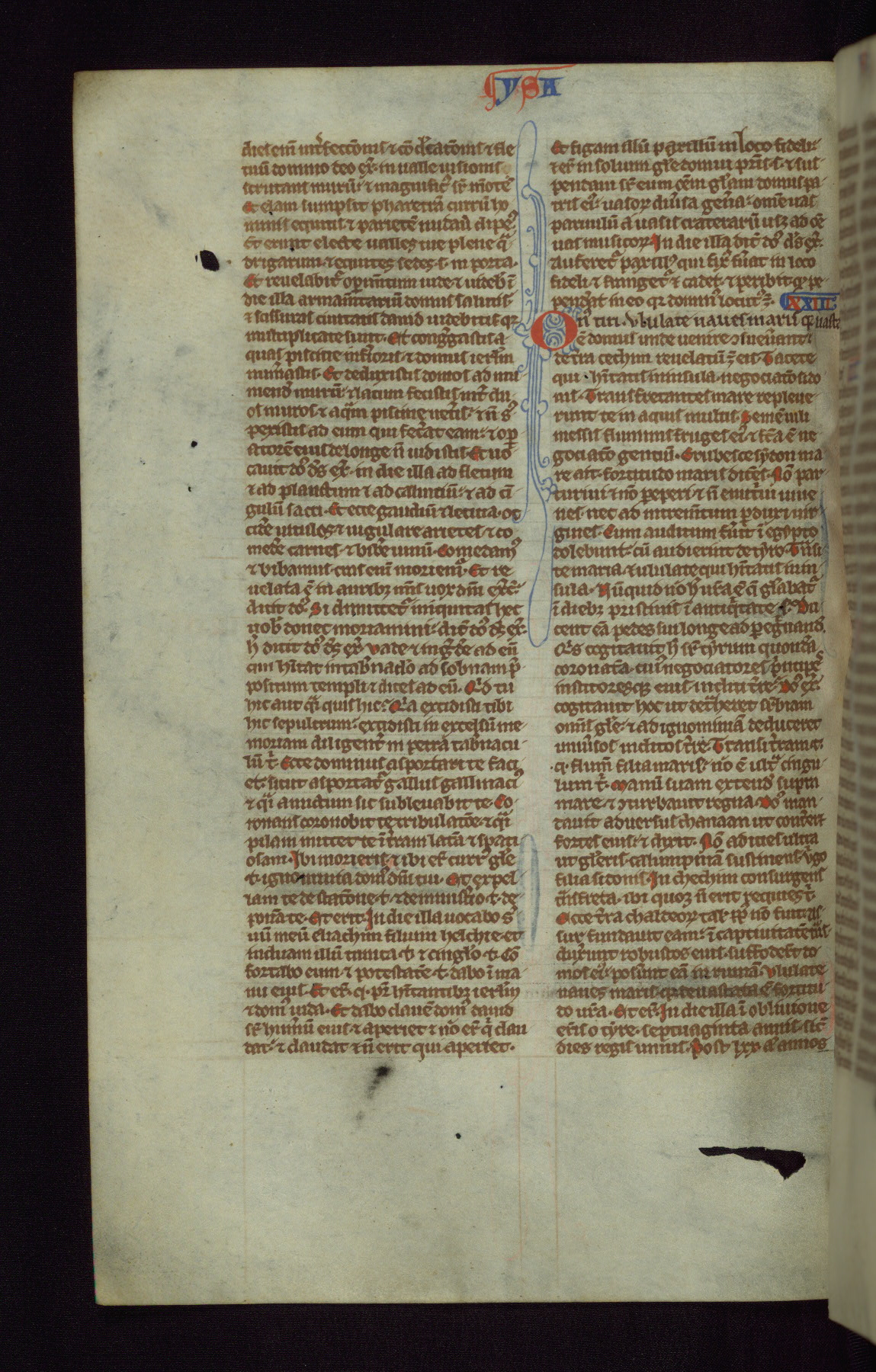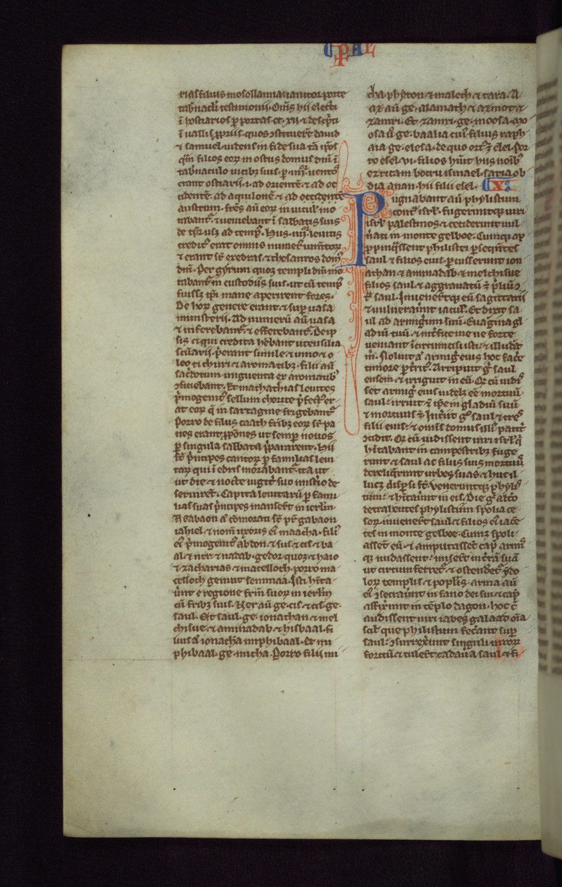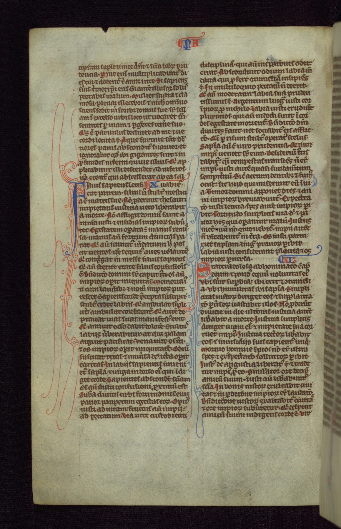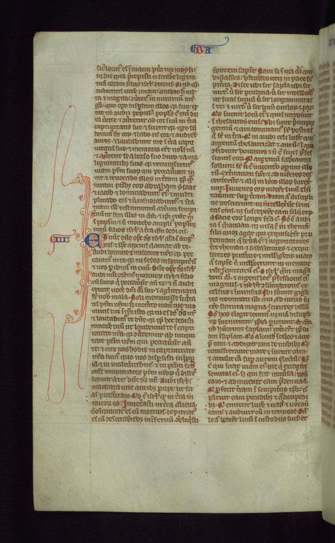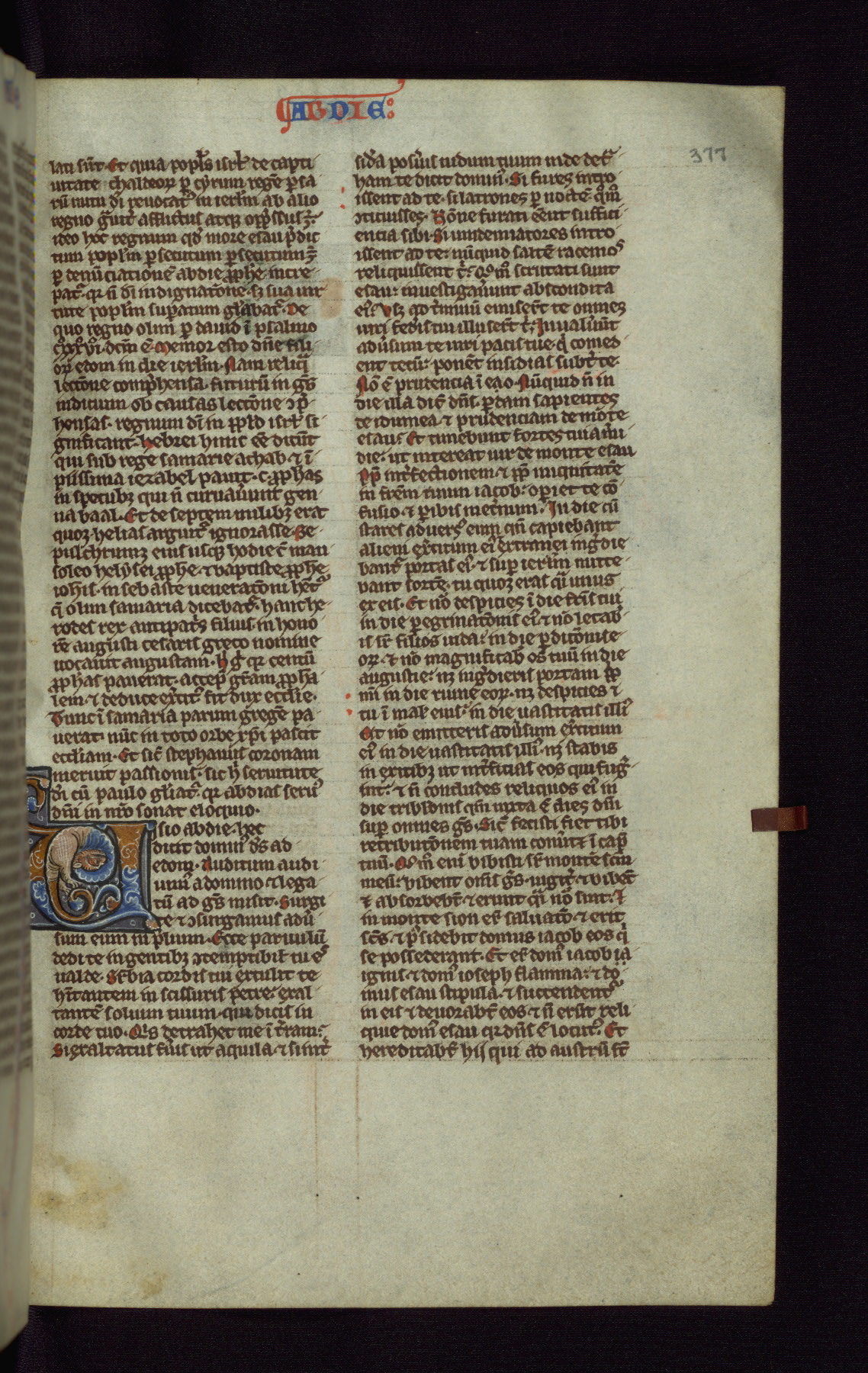 This pocket-size Bible was created around the middle of the thirteenth century in England. It contains the Vulgate text of the Old and New Testaments, arranged in order and divided into chapters. Such Bibles, designed for individual rather than institutional use, began to be created on a large scale during the thirteenth century, especially in Paris. This manuscript is illuminated with a large number of small historiated initials, and also includes a somewhat later image of the Three Living and the Three Dead, a popular scene based on a French poem of the same century.