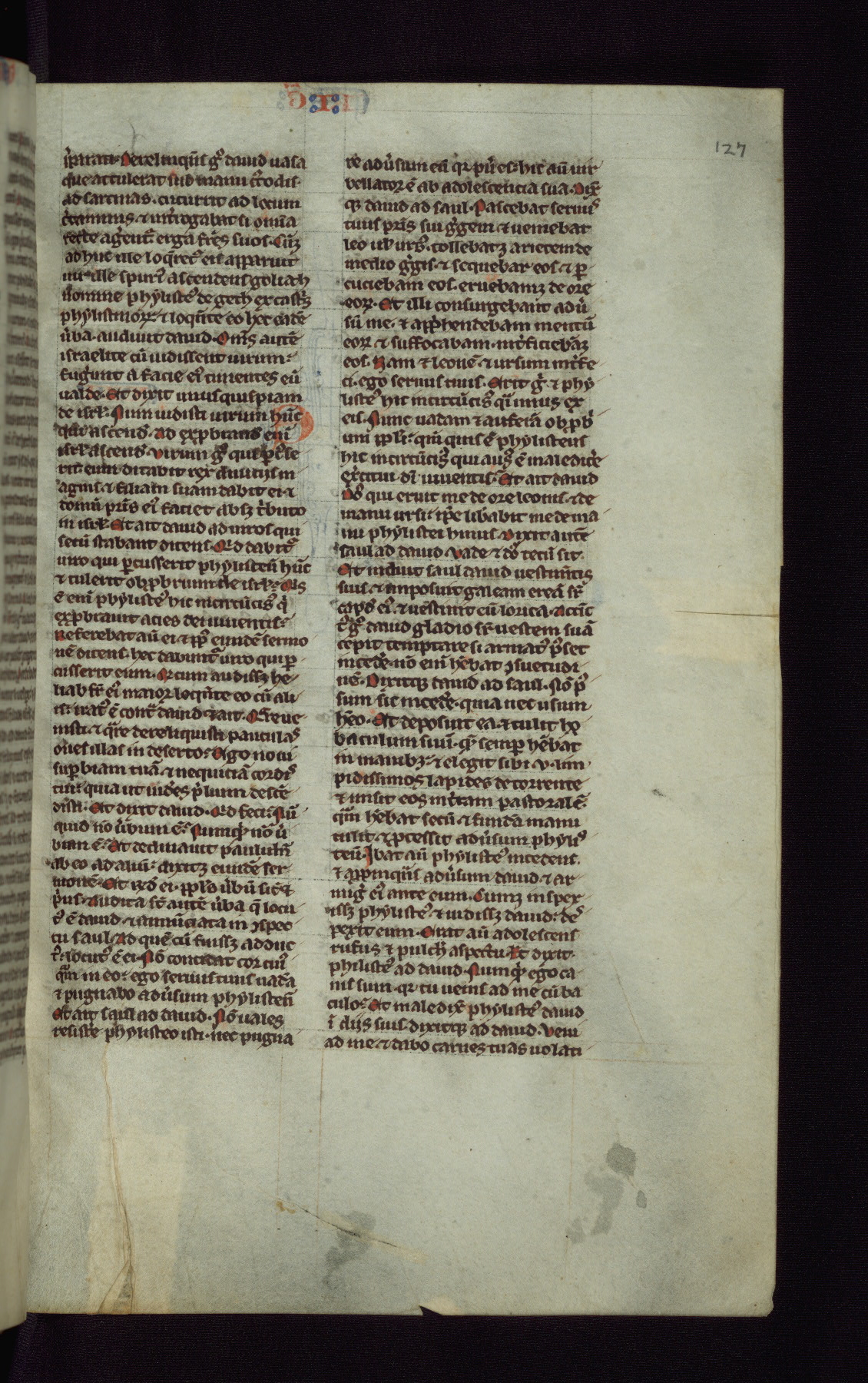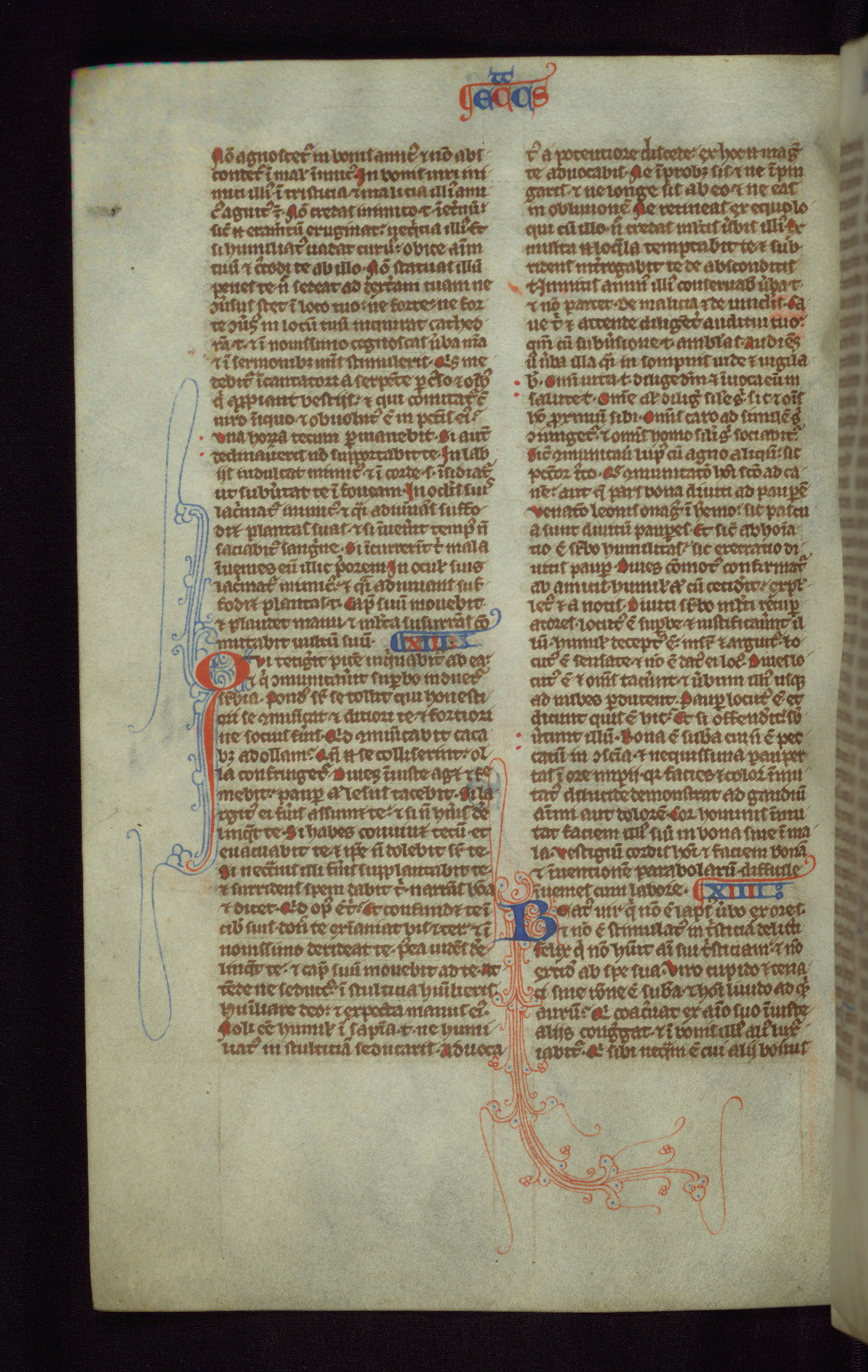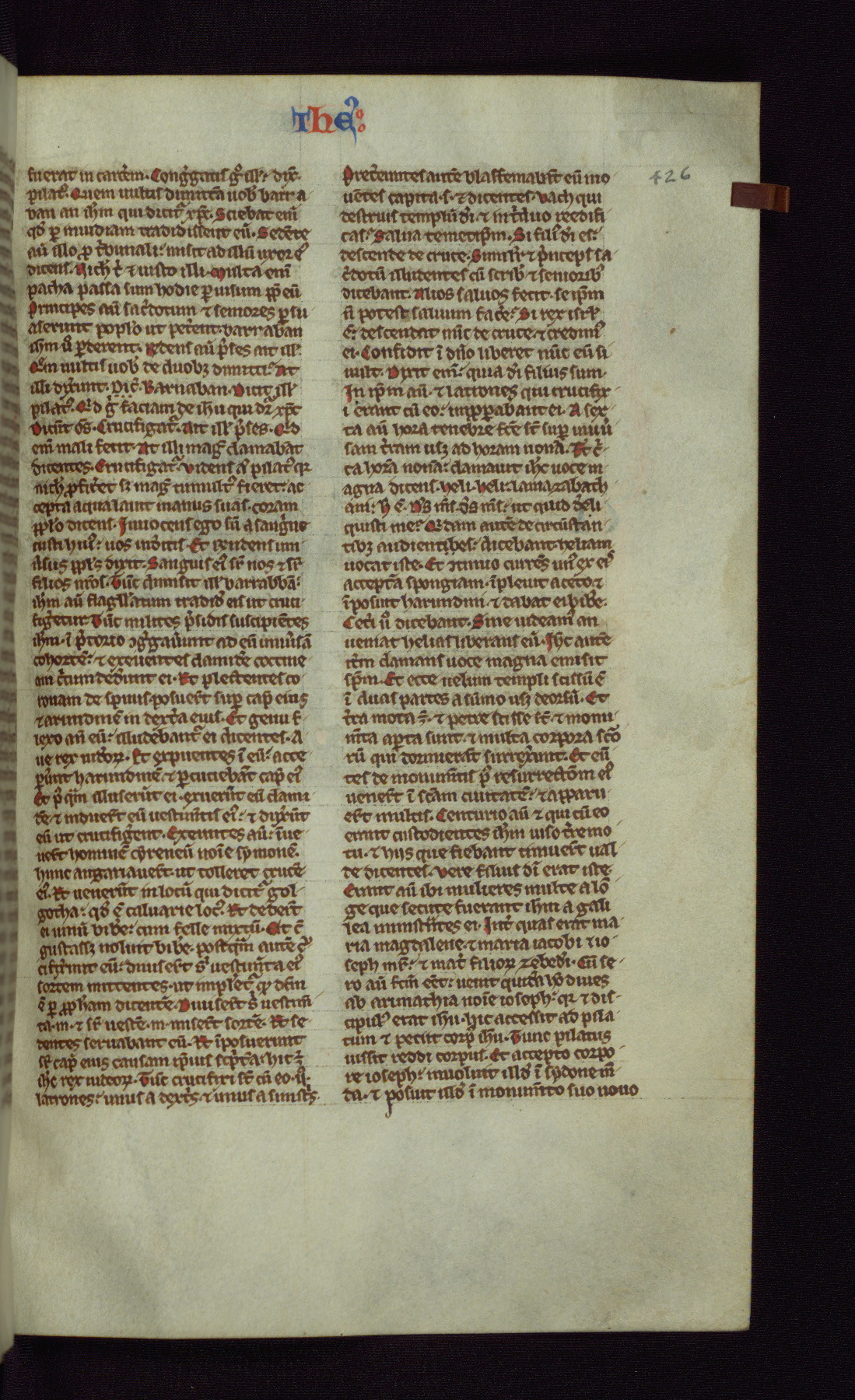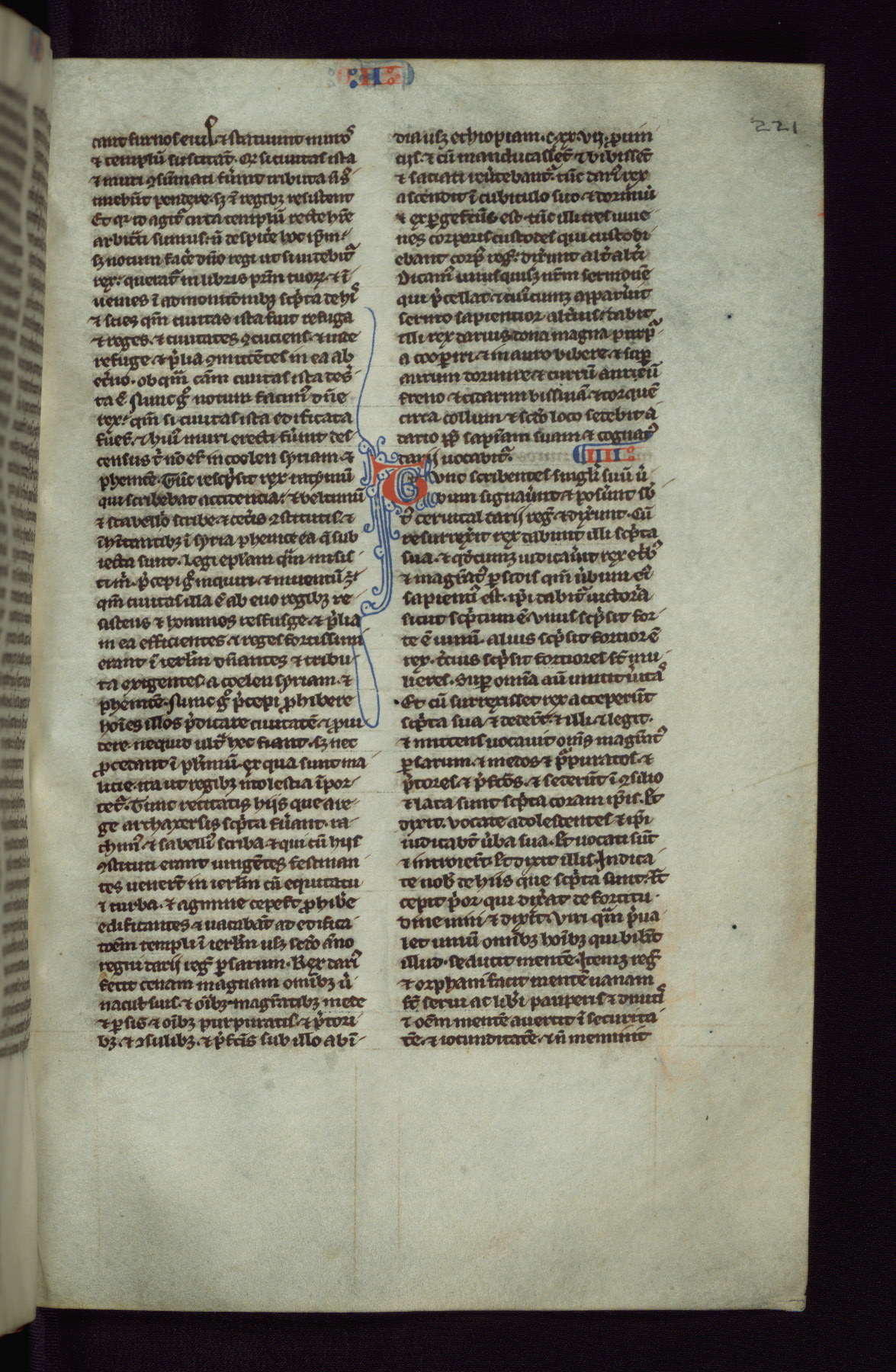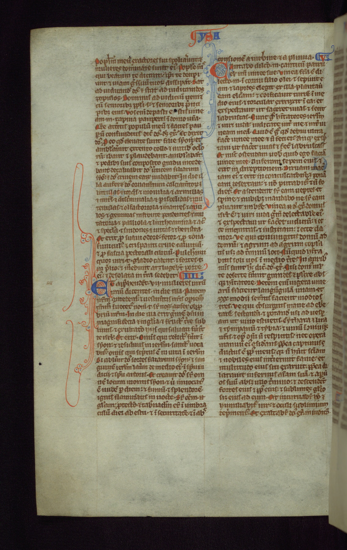 This pocket-size Bible was created around the middle of the thirteenth century in England. It contains the Vulgate text of the Old and New Testaments, arranged in order and divided into chapters. Such Bibles, designed for individual rather than institutional use, began to be created on a large scale during the thirteenth century, especially in Paris. This manuscript is illuminated with a large number of small historiated initials, and also includes a somewhat later image of the Three Living and the Three Dead, a popular scene based on a French poem of the same century.
