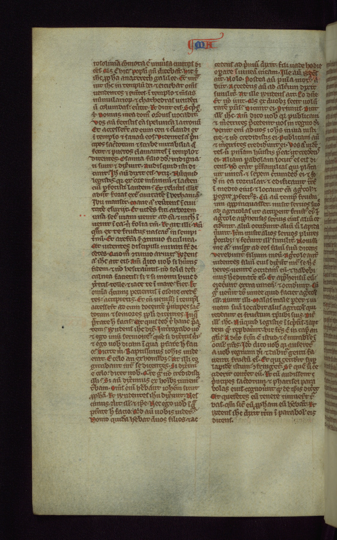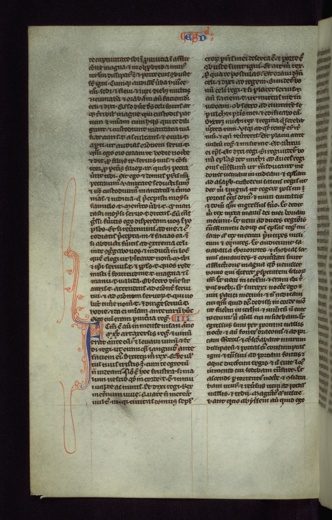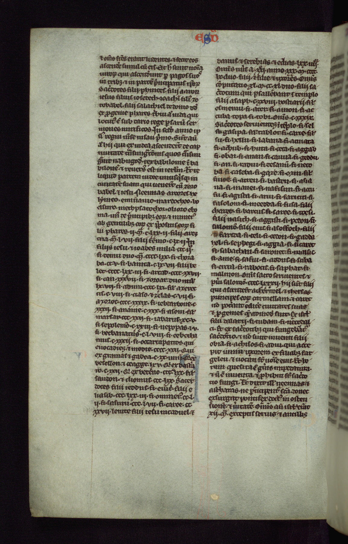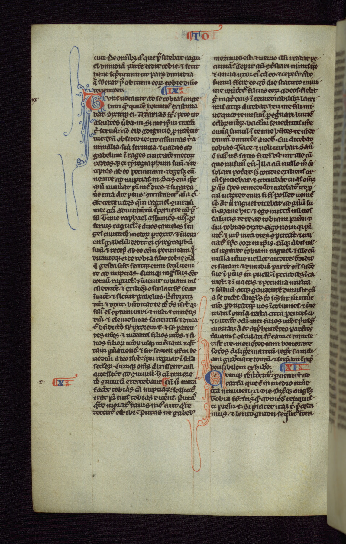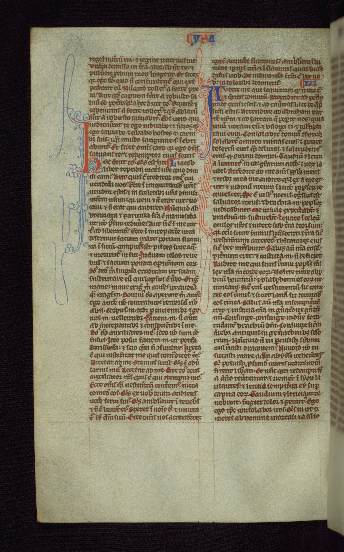 This pocket-size Bible was created around the middle of the thirteenth century in England. It contains the Vulgate text of the Old and New Testaments, arranged in order and divided into chapters. Such Bibles, designed for individual rather than institutional use, began to be created on a large scale during the thirteenth century, especially in Paris. This manuscript is illuminated with a large number of small historiated initials, and also includes a somewhat later image of the Three Living and the Three Dead, a popular scene based on a French poem of the same century.