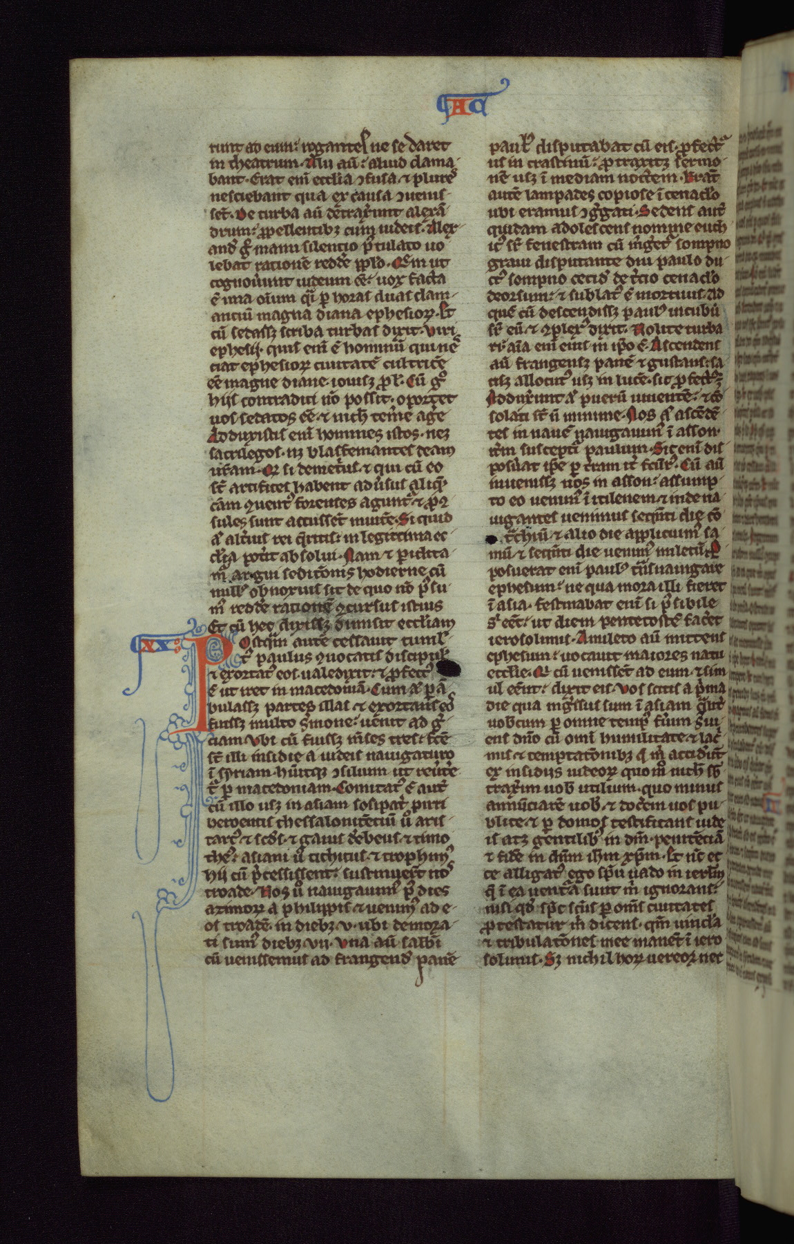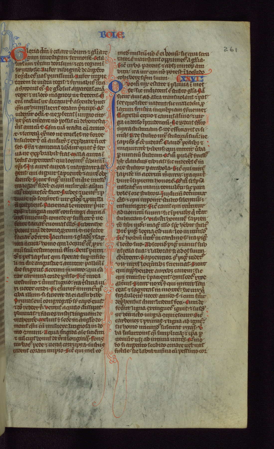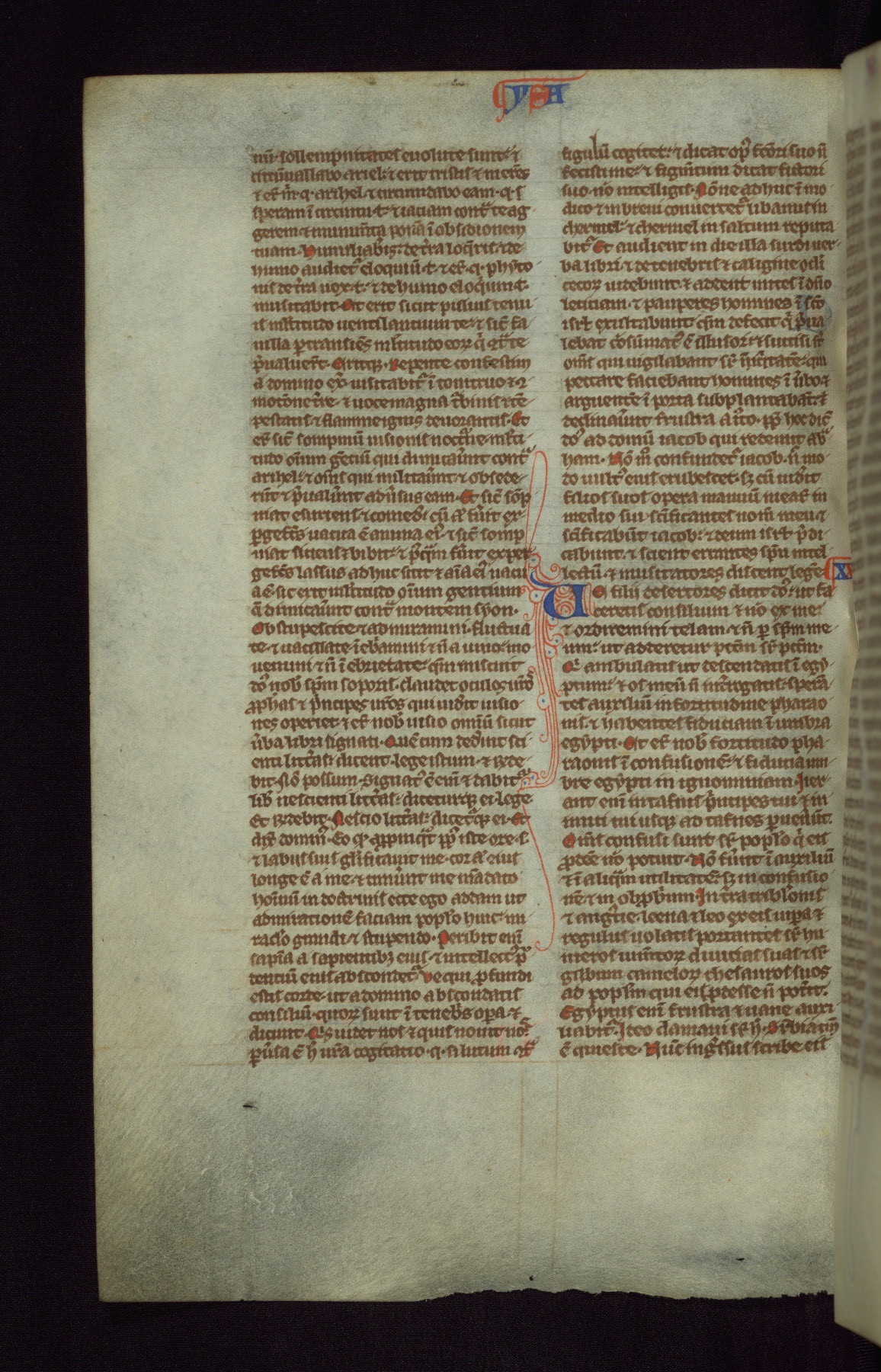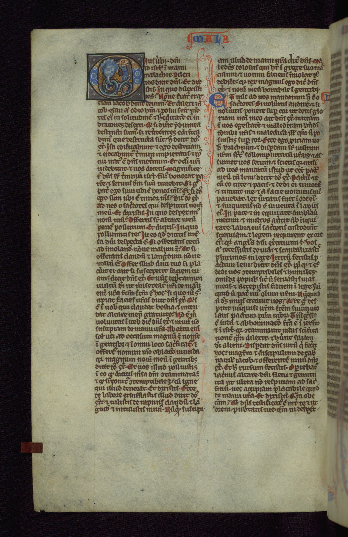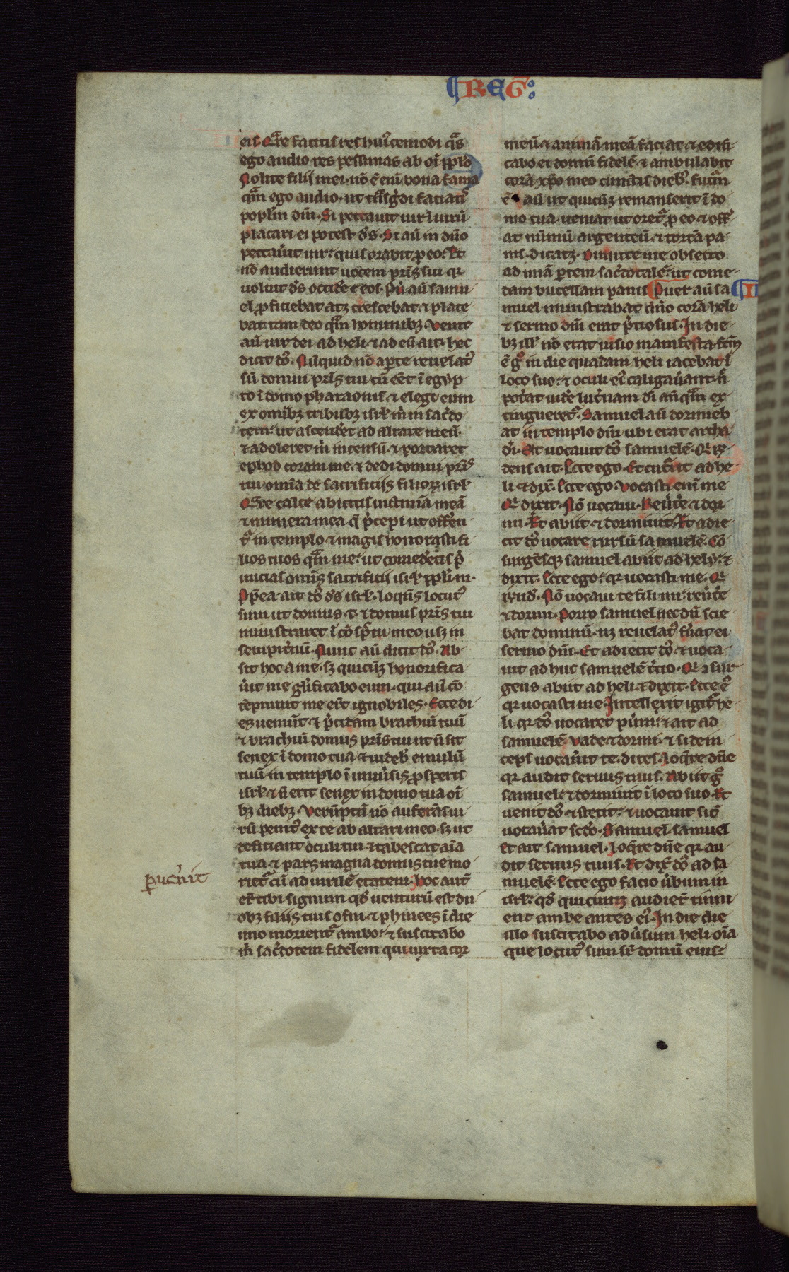 This pocket-size Bible was created around the middle of the thirteenth century in England. It contains the Vulgate text of the Old and New Testaments, arranged in order and divided into chapters. Such Bibles, designed for individual rather than institutional use, began to be created on a large scale during the thirteenth century, especially in Paris. This manuscript is illuminated with a large number of small historiated initials, and also includes a somewhat later image of the Three Living and the Three Dead, a popular scene based on a French poem of the same century.