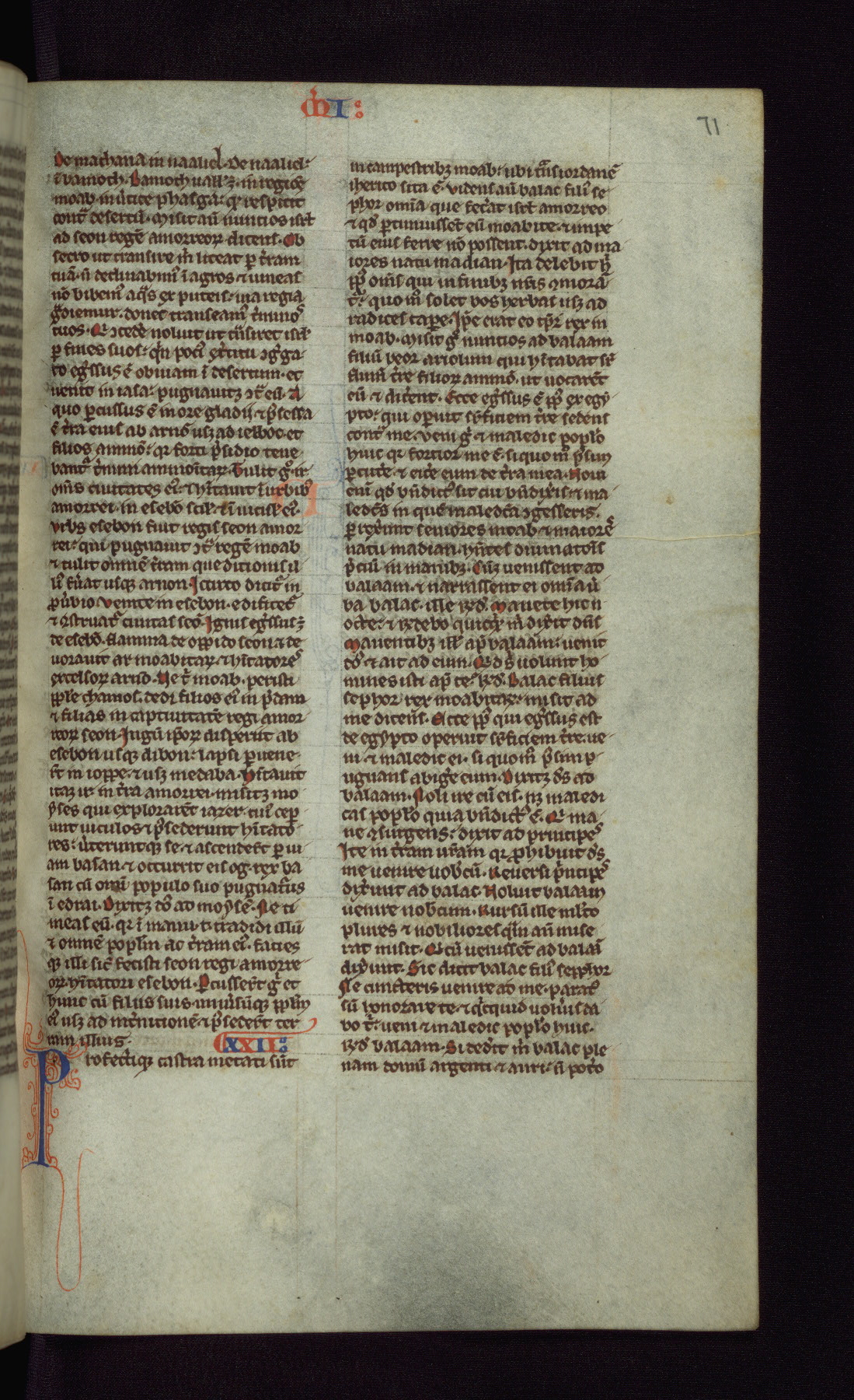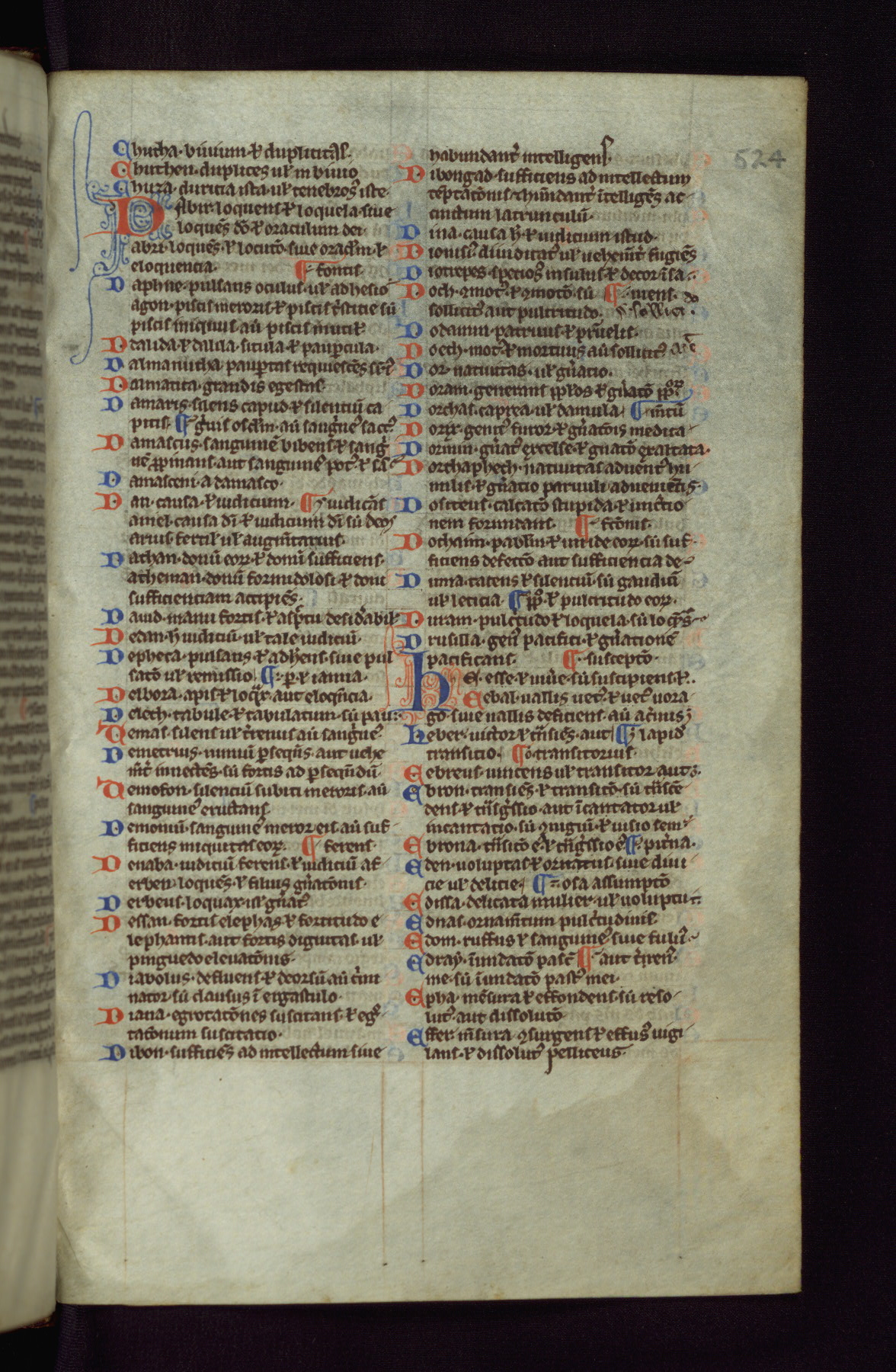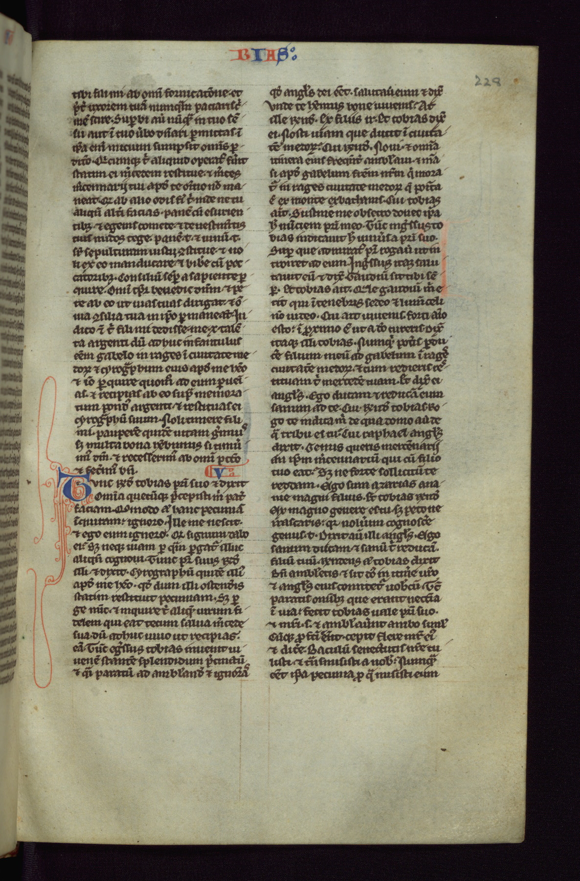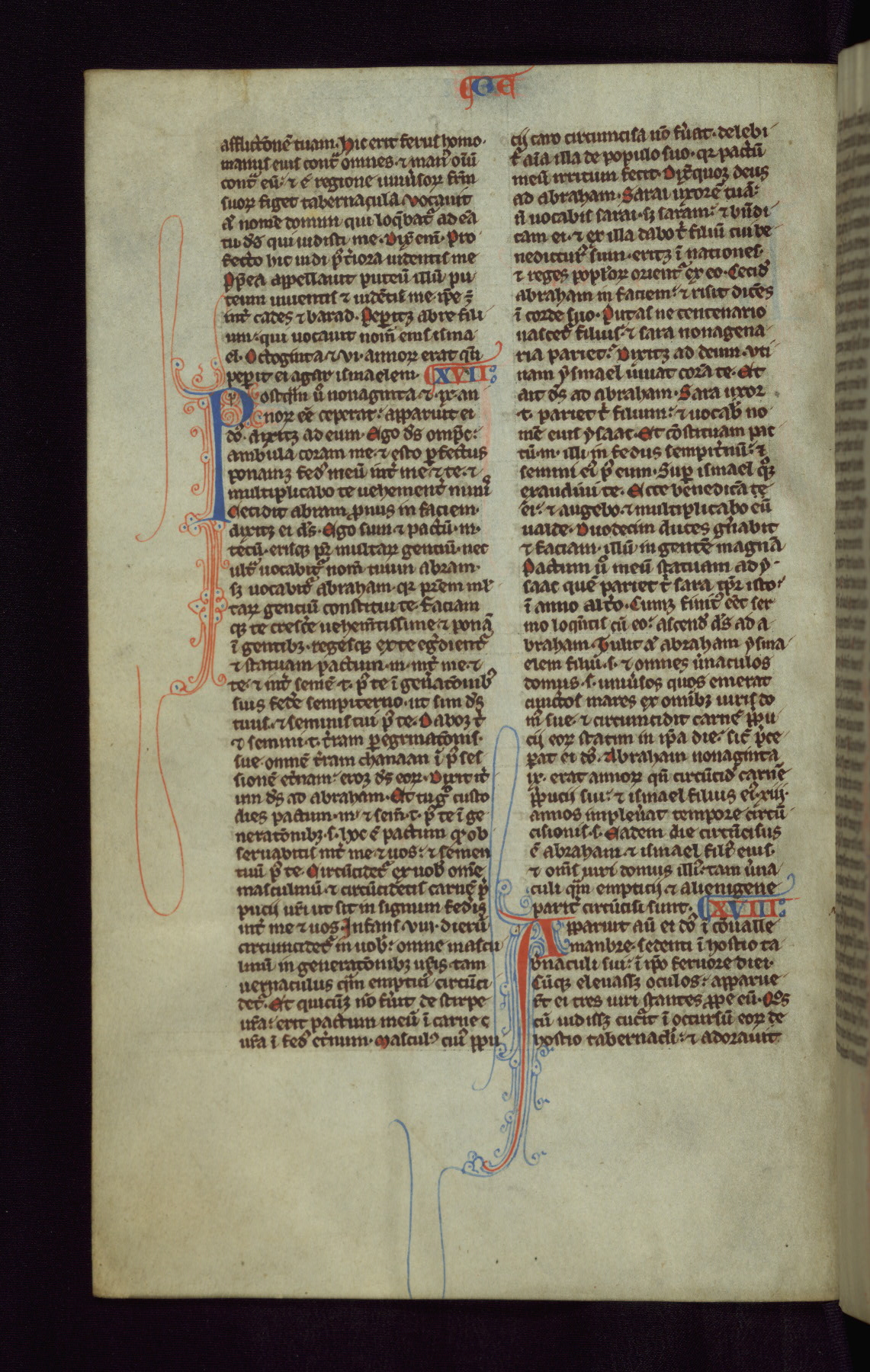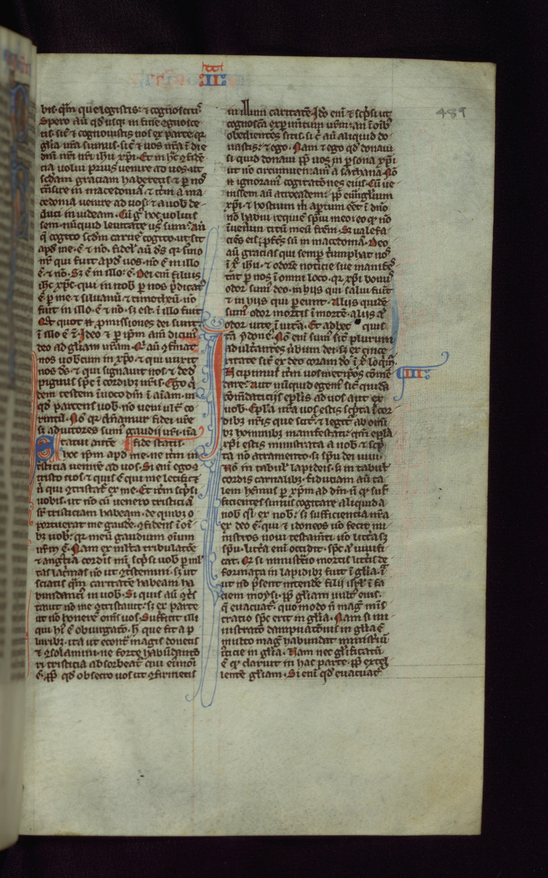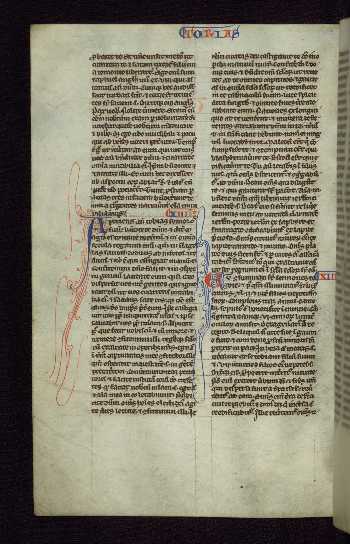 This pocket-size Bible was created around the middle of the thirteenth century in England. It contains the Vulgate text of the Old and New Testaments, arranged in order and divided into chapters. Such Bibles, designed for individual rather than institutional use, began to be created on a large scale during the thirteenth century, especially in Paris. This manuscript is illuminated with a large number of small historiated initials, and also includes a somewhat later image of the Three Living and the Three Dead, a popular scene based on a French poem of the same century.