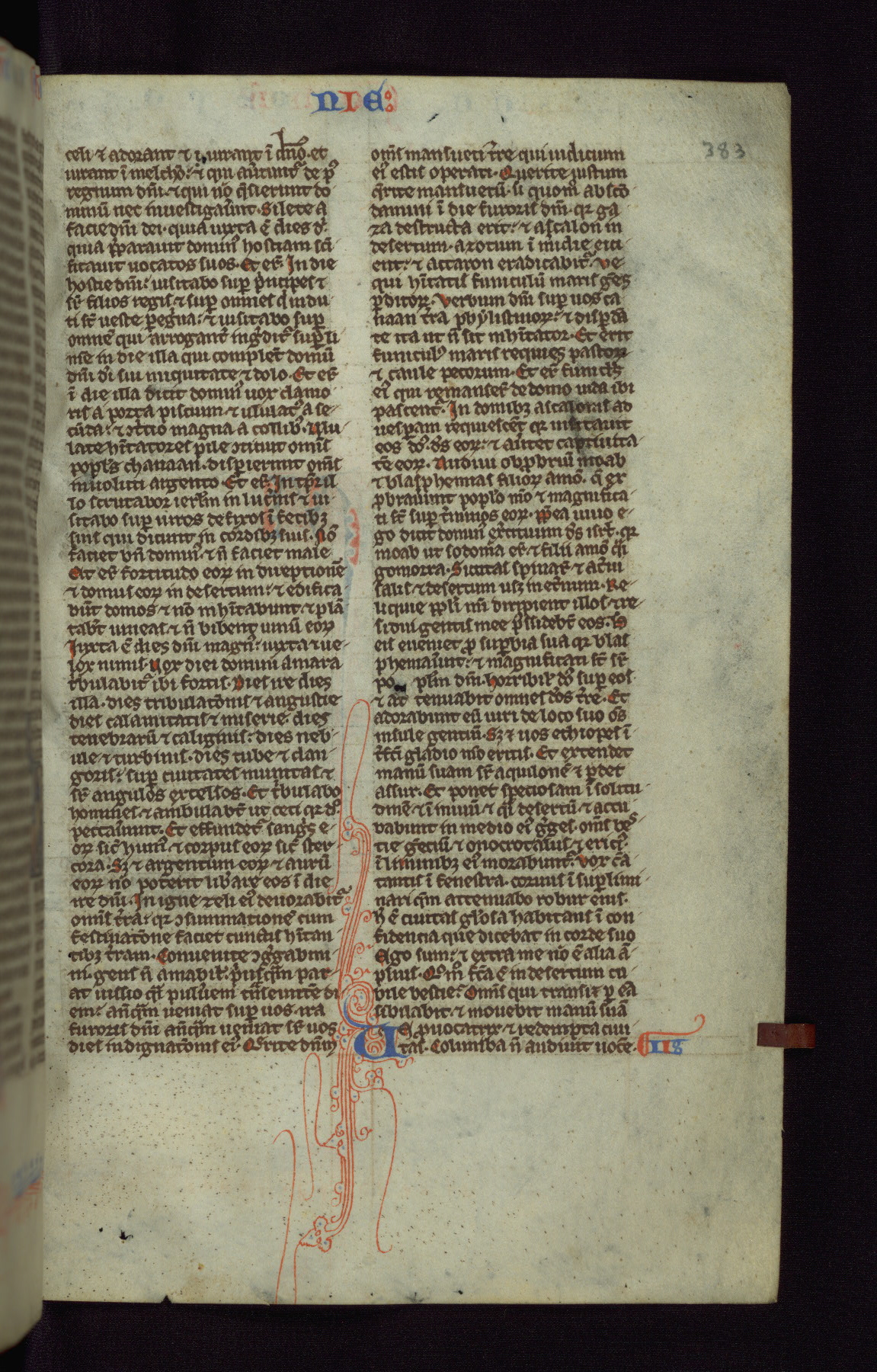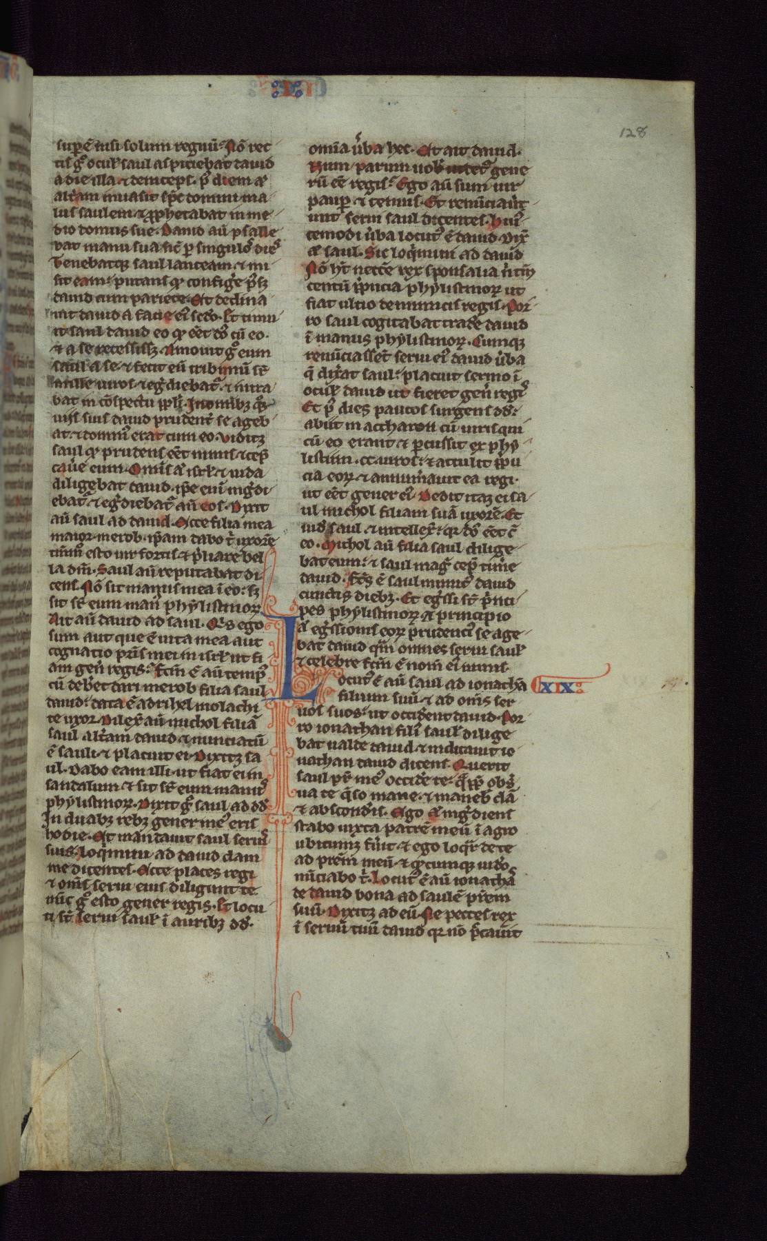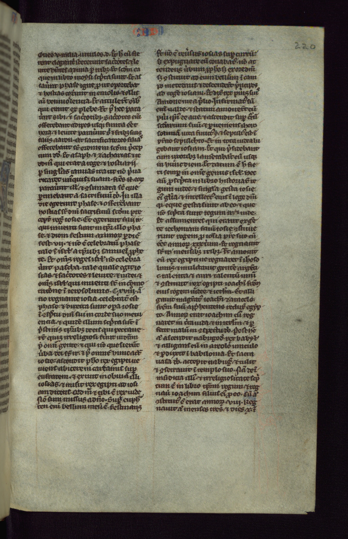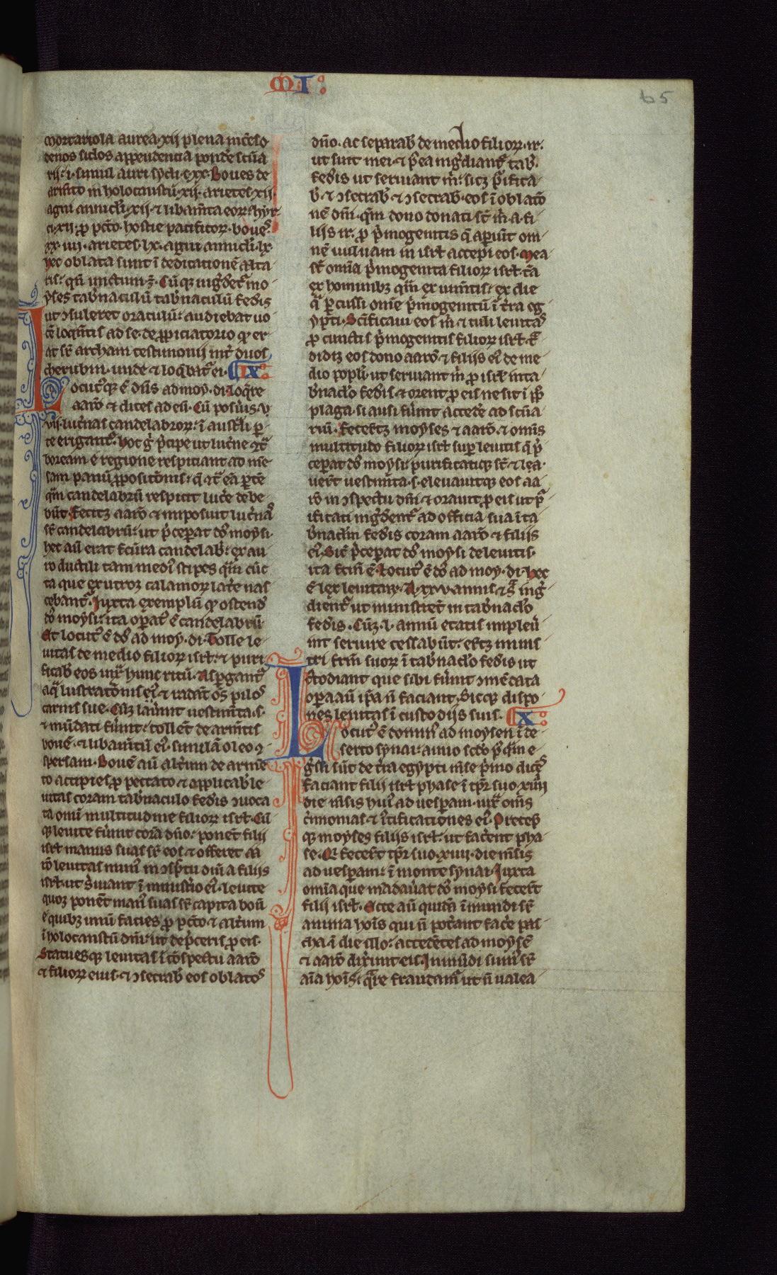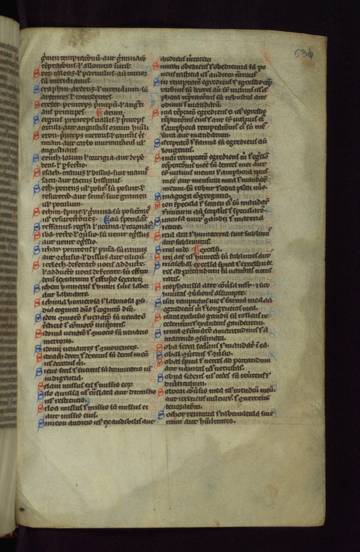 This pocket-size Bible was created around the middle of the thirteenth century in England. It contains the Vulgate text of the Old and New Testaments, arranged in order and divided into chapters. Such Bibles, designed for individual rather than institutional use, began to be created on a large scale during the thirteenth century, especially in Paris. This manuscript is illuminated with a large number of small historiated initials, and also includes a somewhat later image of the Three Living and the Three Dead, a popular scene based on a French poem of the same century.