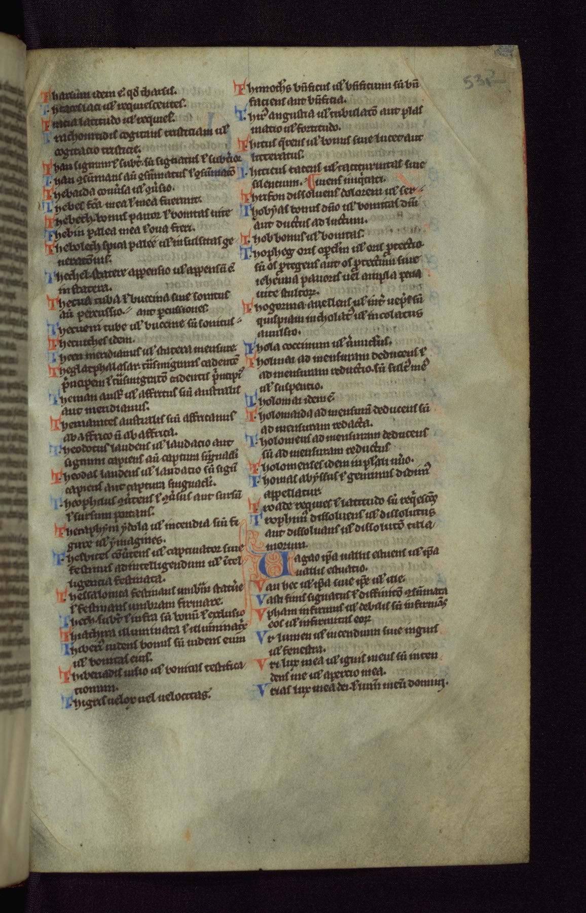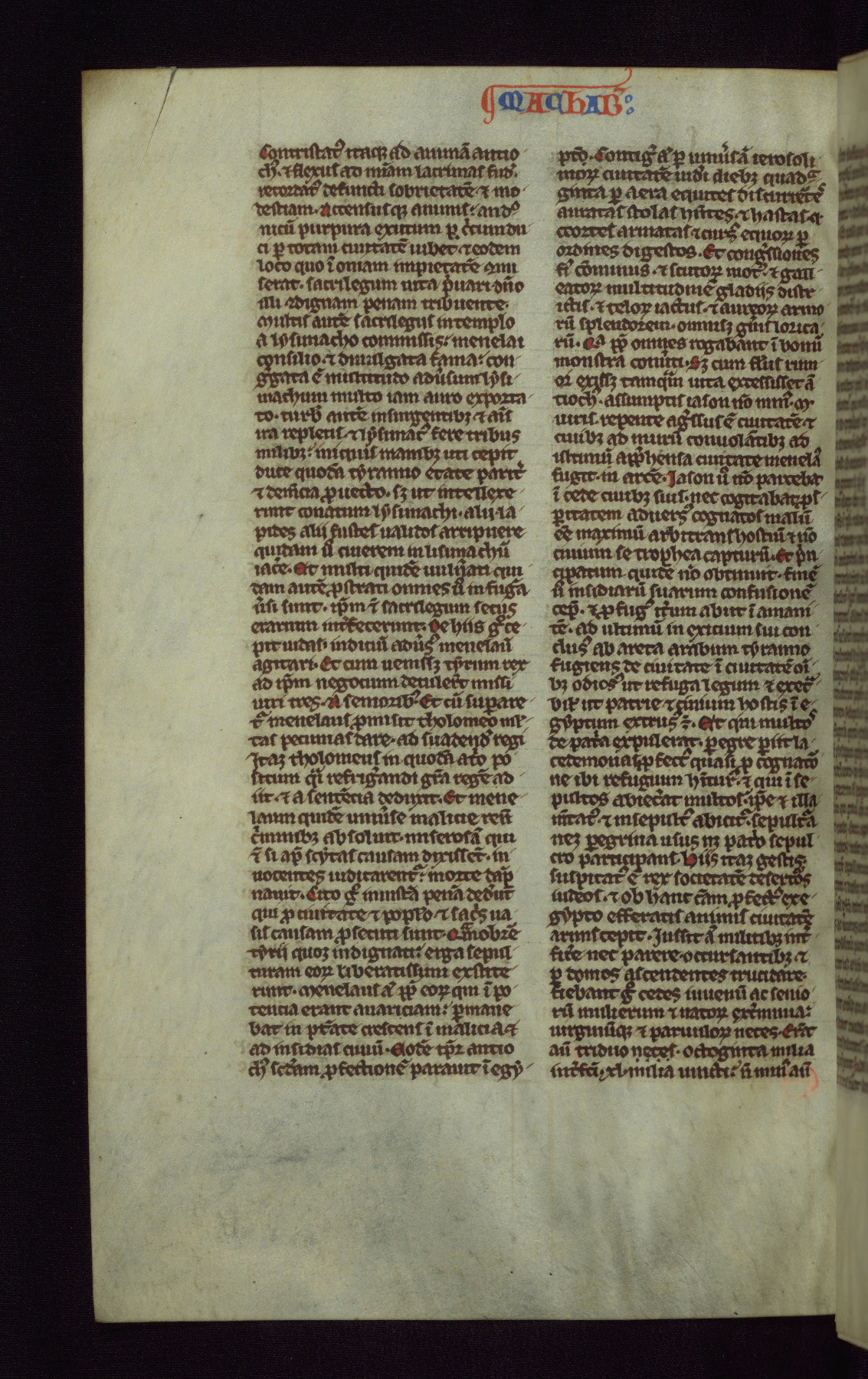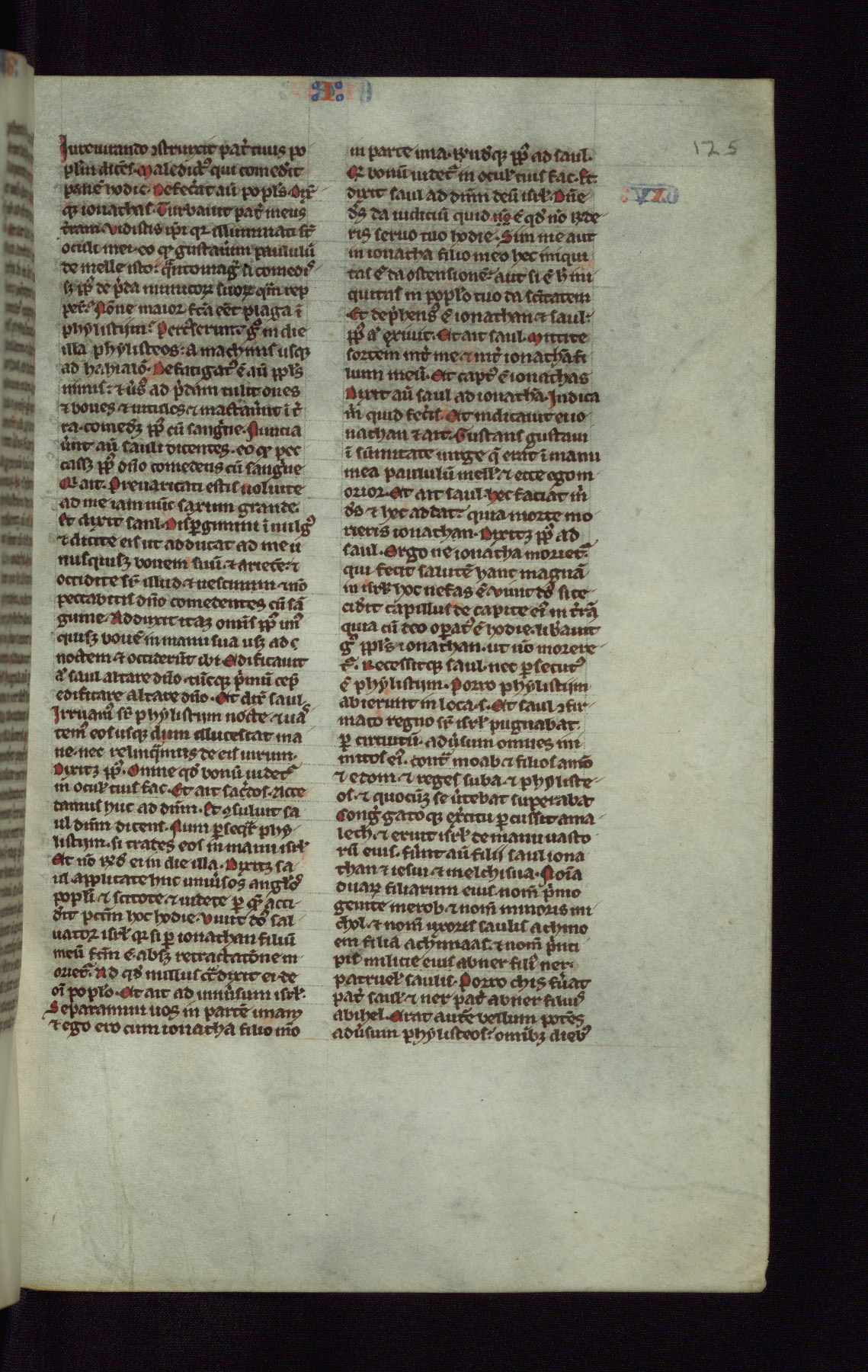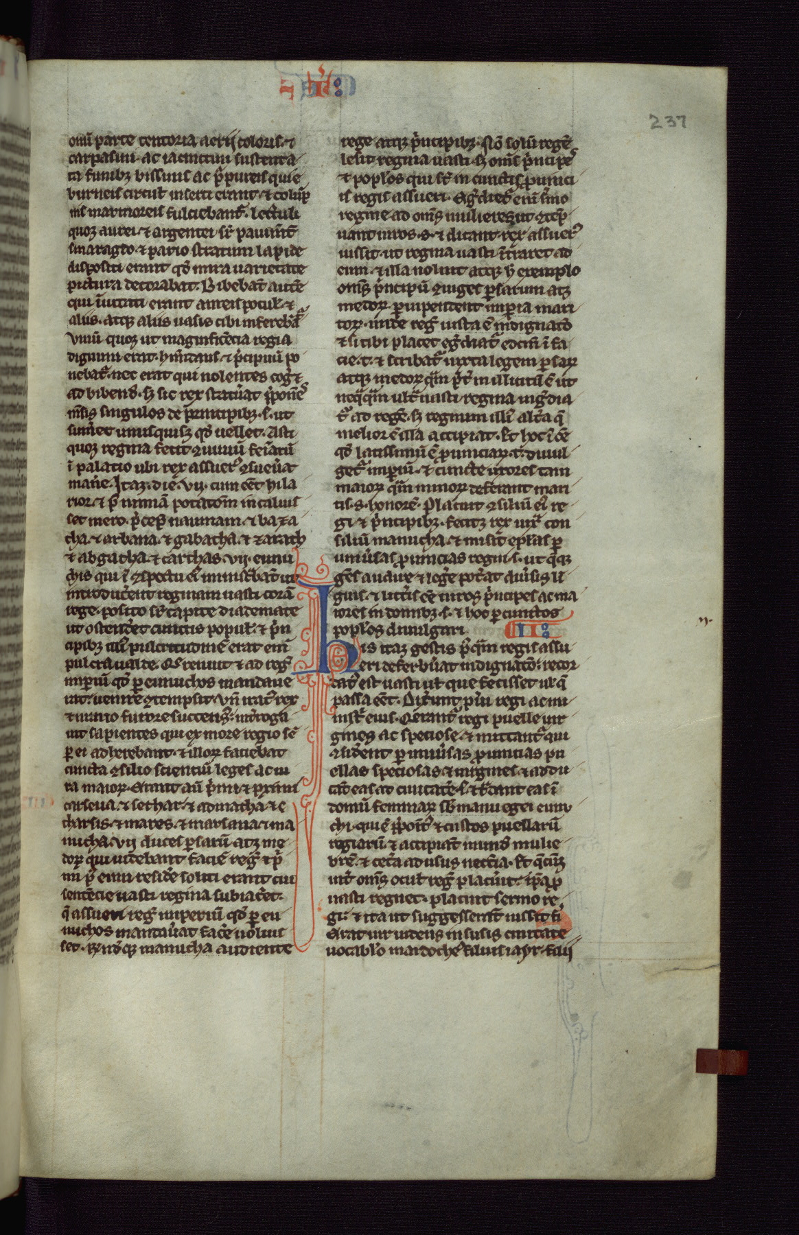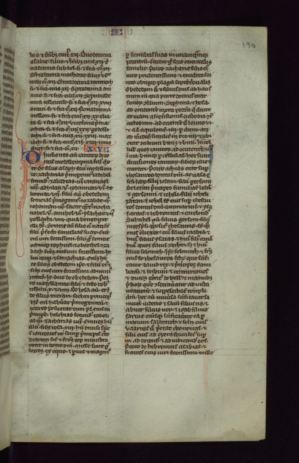 This pocket-size Bible was created around the middle of the thirteenth century in England. It contains the Vulgate text of the Old and New Testaments, arranged in order and divided into chapters. Such Bibles, designed for individual rather than institutional use, began to be created on a large scale during the thirteenth century, especially in Paris. This manuscript is illuminated with a large number of small historiated initials, and also includes a somewhat later image of the Three Living and the Three Dead, a popular scene based on a French poem of the same century.