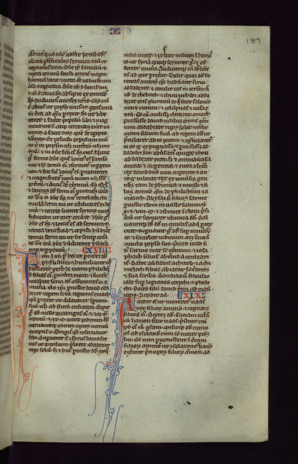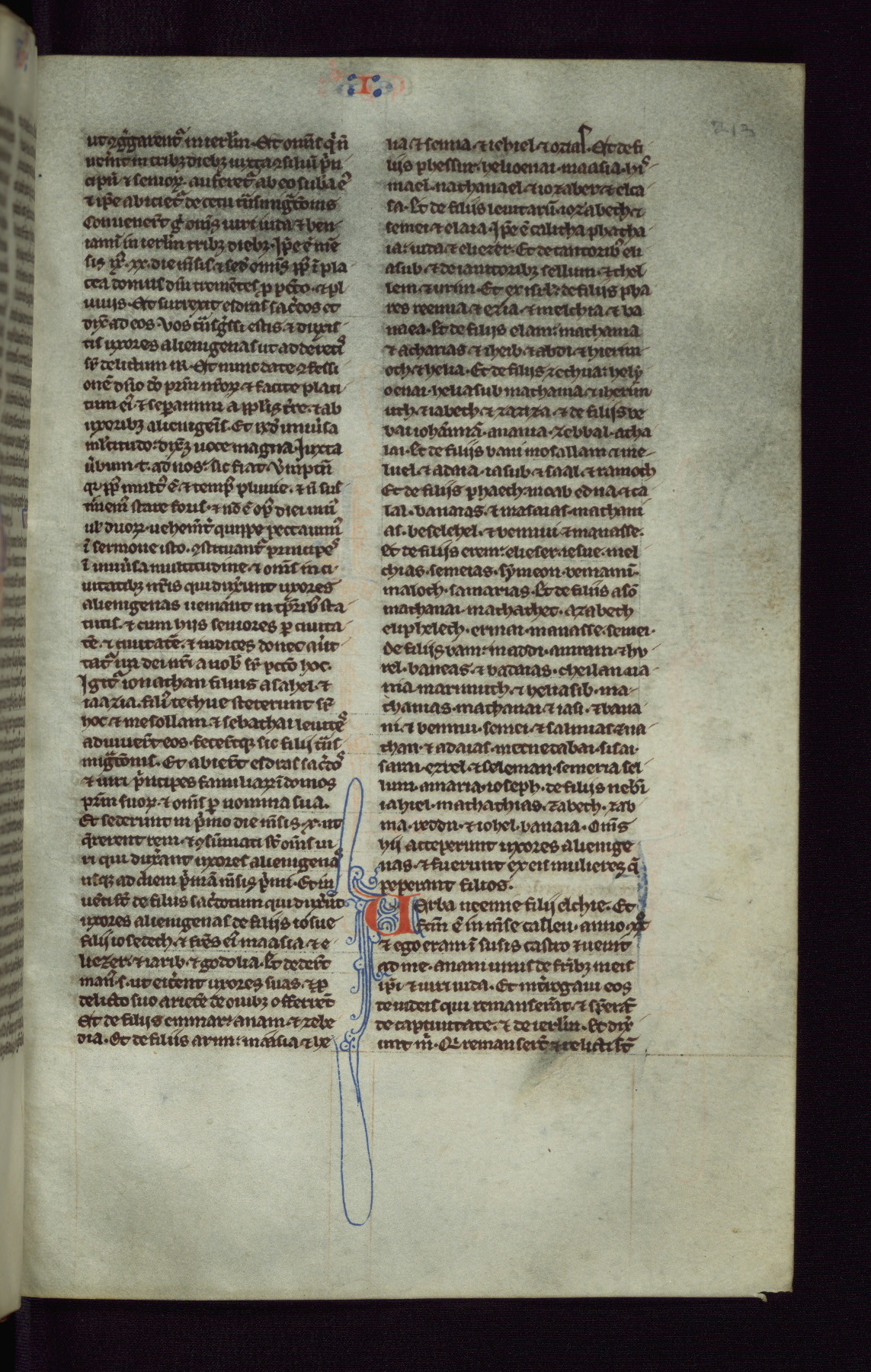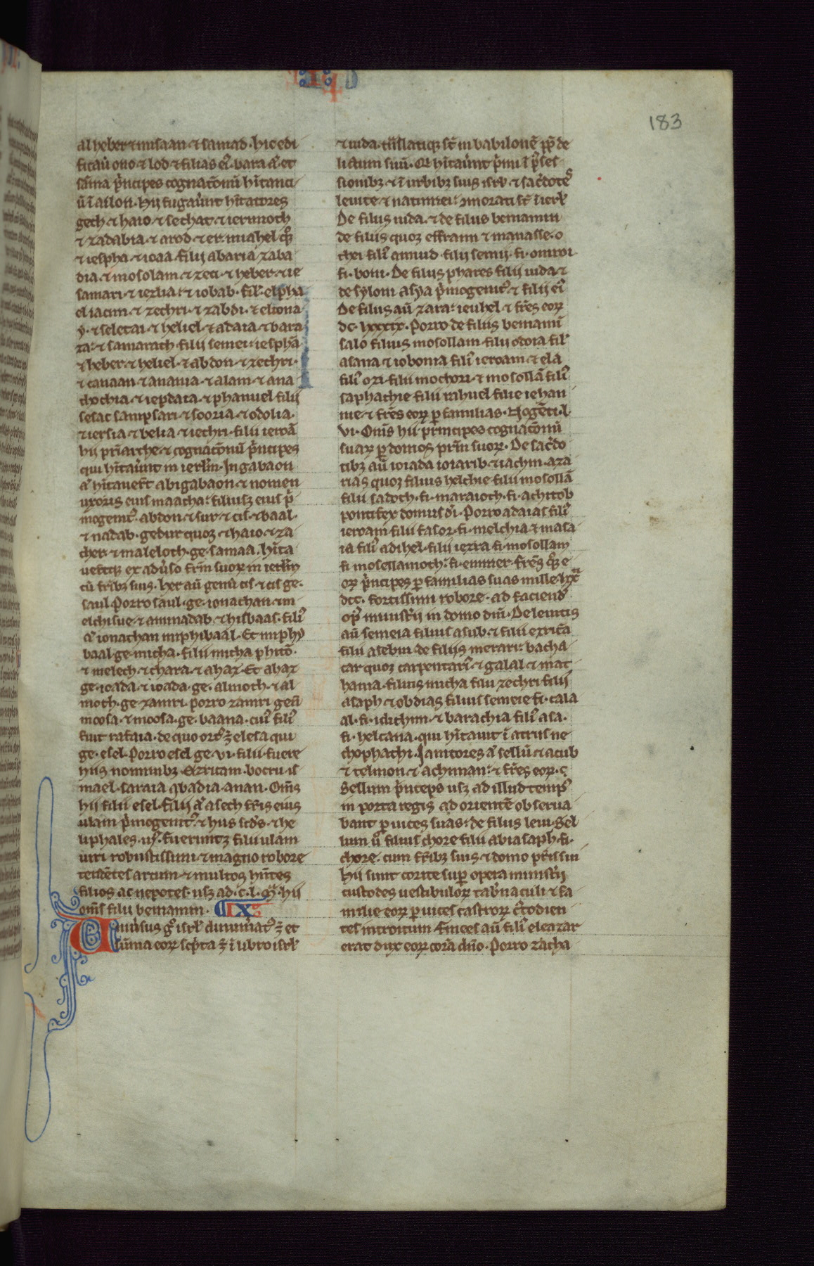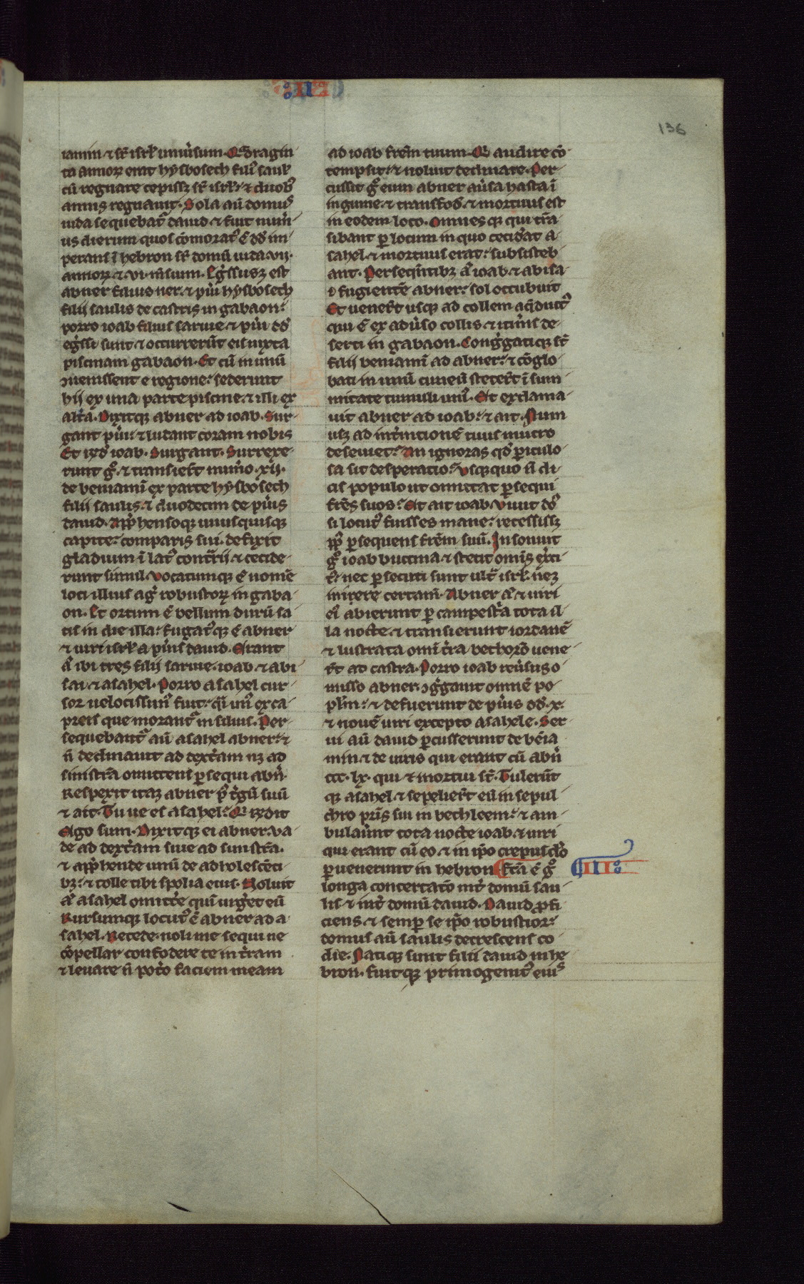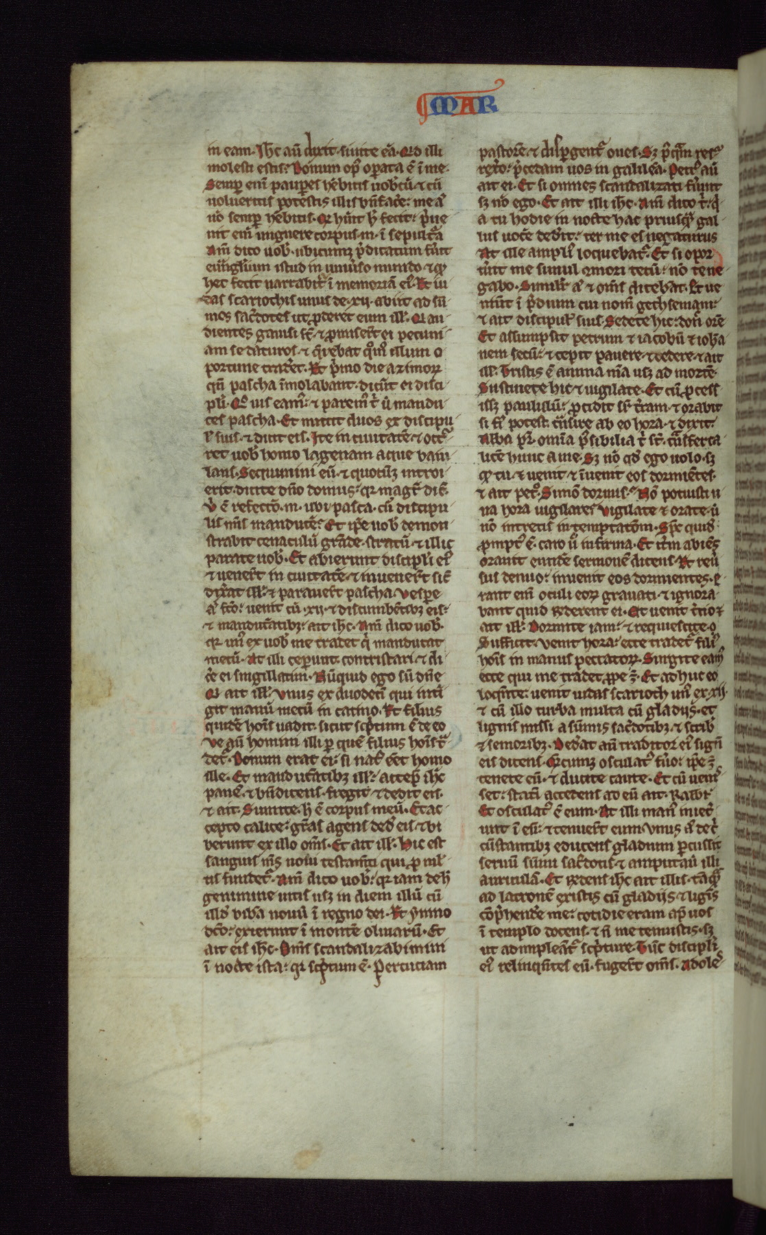 This pocket-size Bible was created around the middle of the thirteenth century in England. It contains the Vulgate text of the Old and New Testaments, arranged in order and divided into chapters. Such Bibles, designed for individual rather than institutional use, began to be created on a large scale during the thirteenth century, especially in Paris. This manuscript is illuminated with a large number of small historiated initials, and also includes a somewhat later image of the Three Living and the Three Dead, a popular scene based on a French poem of the same century.