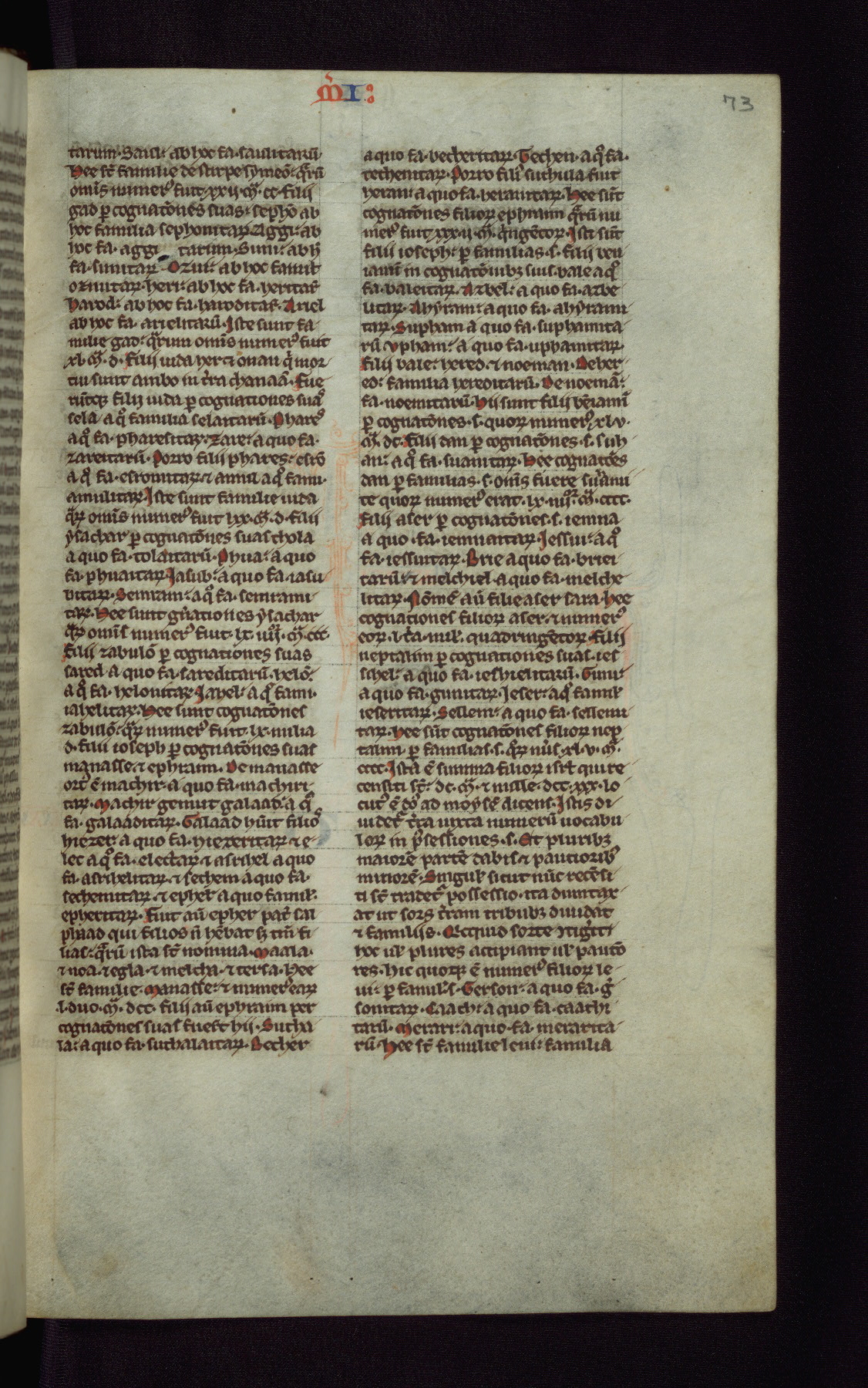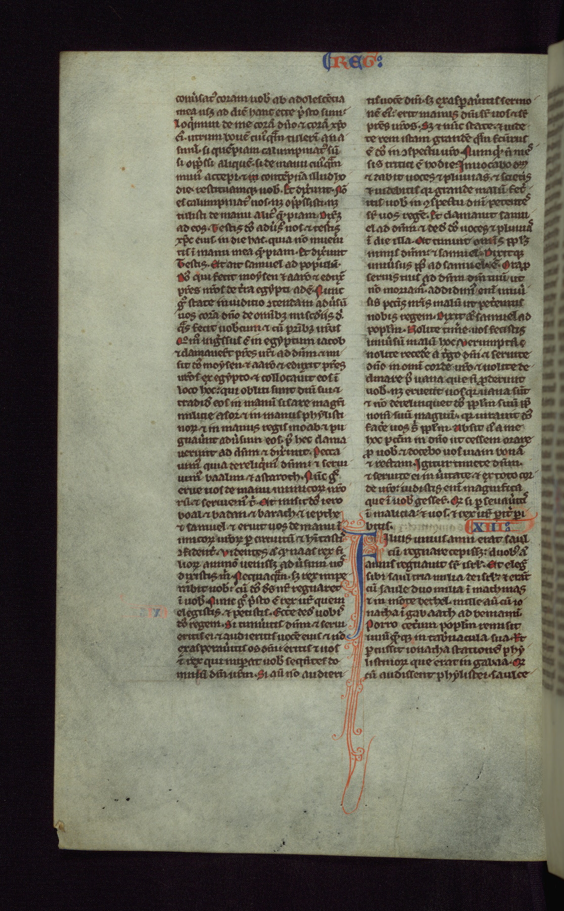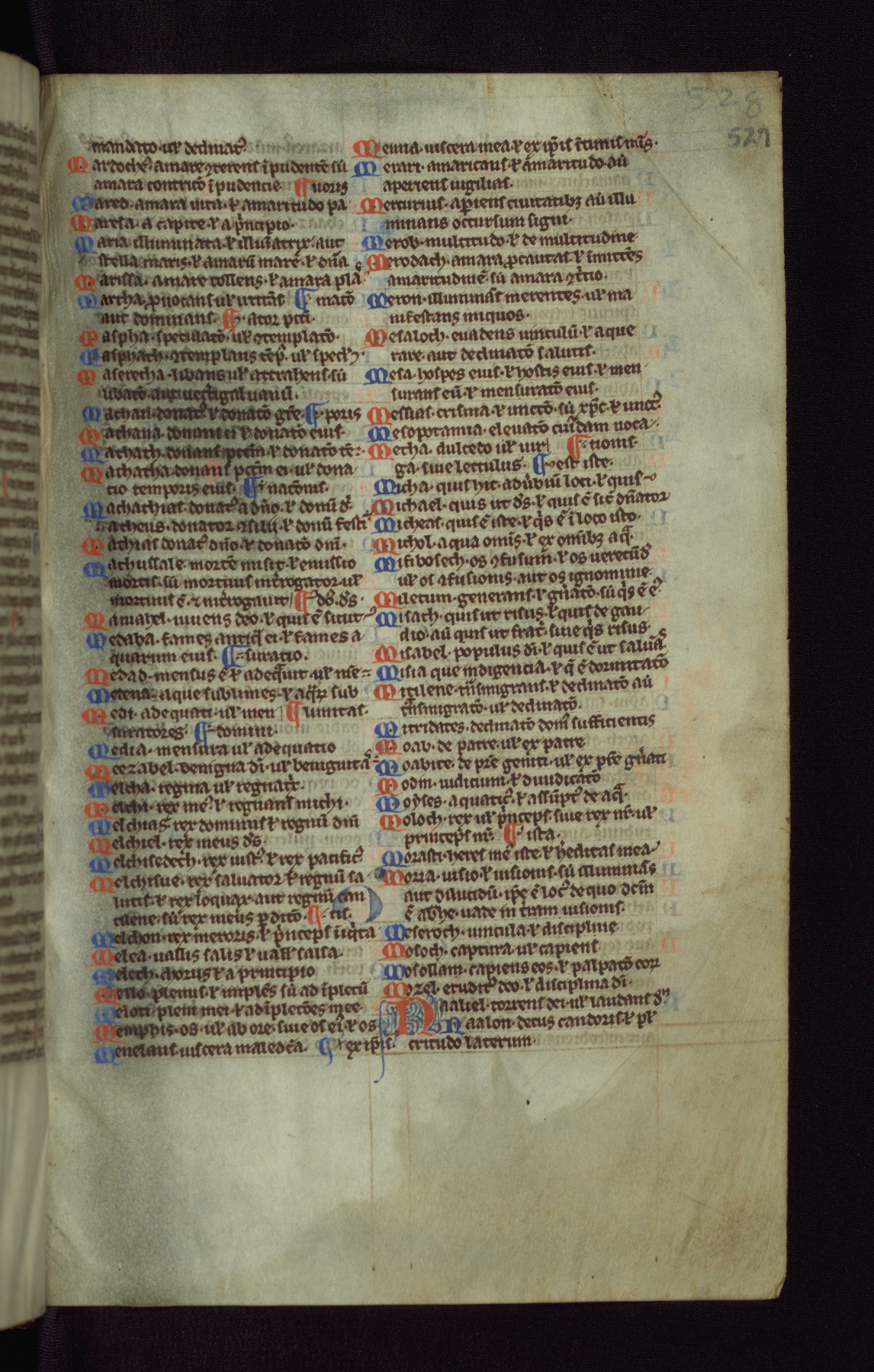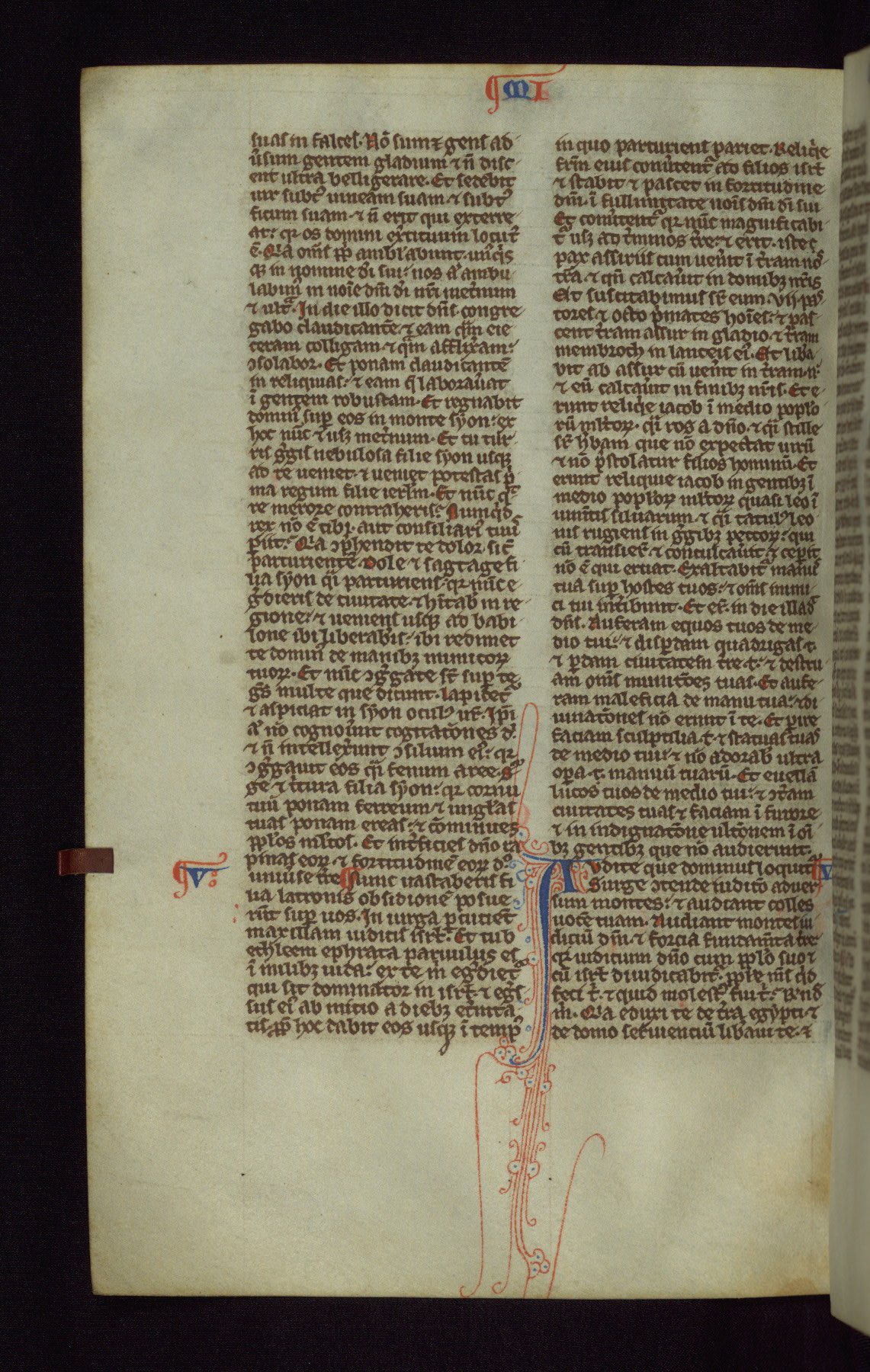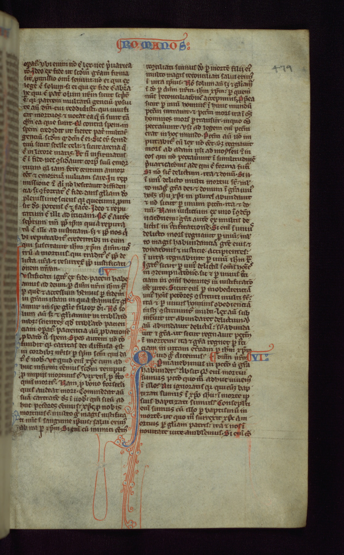 This pocket-size Bible was created around the middle of the thirteenth century in England. It contains the Vulgate text of the Old and New Testaments, arranged in order and divided into chapters. Such Bibles, designed for individual rather than institutional use, began to be created on a large scale during the thirteenth century, especially in Paris. This manuscript is illuminated with a large number of small historiated initials, and also includes a somewhat later image of the Three Living and the Three Dead, a popular scene based on a French poem of the same century.