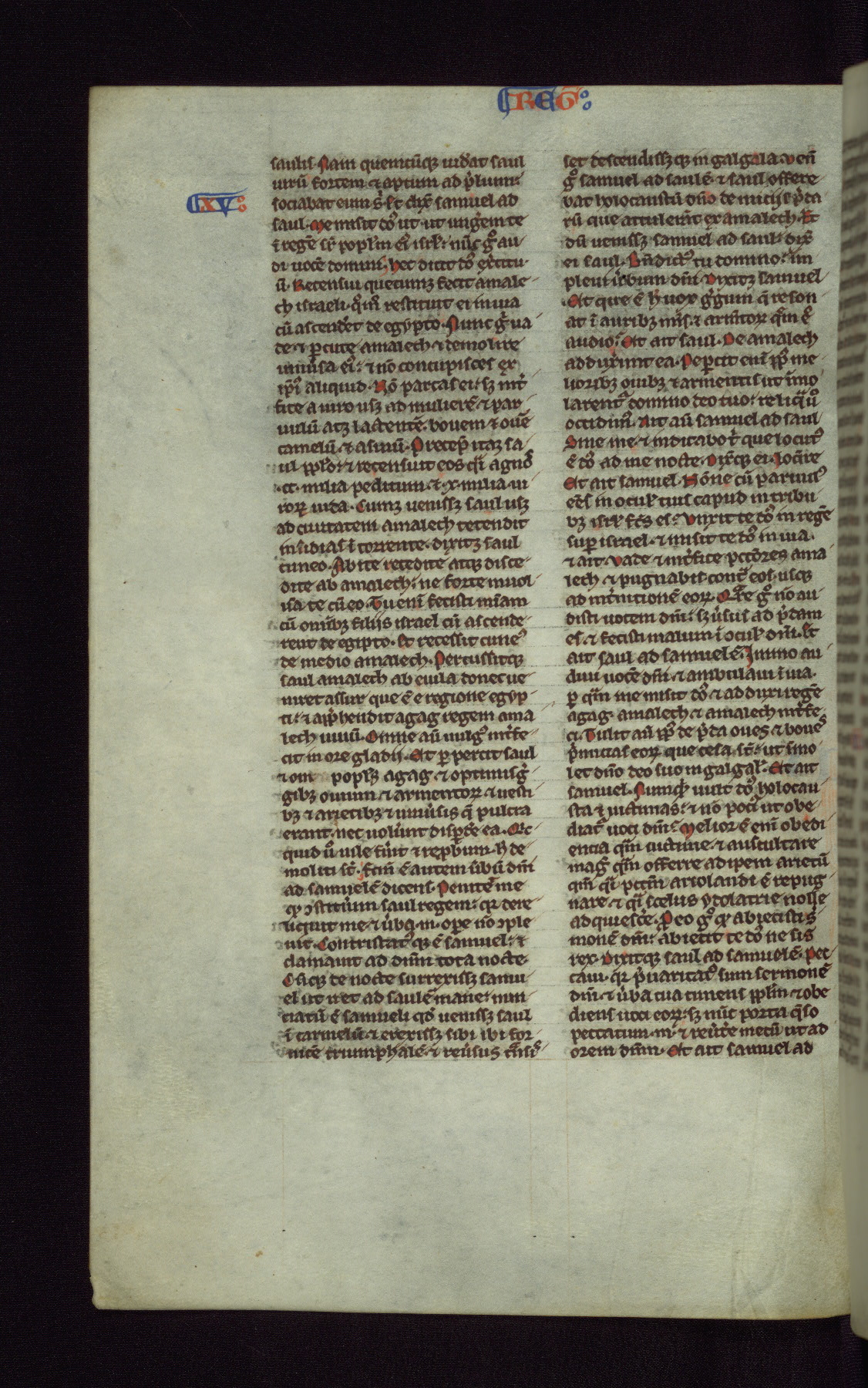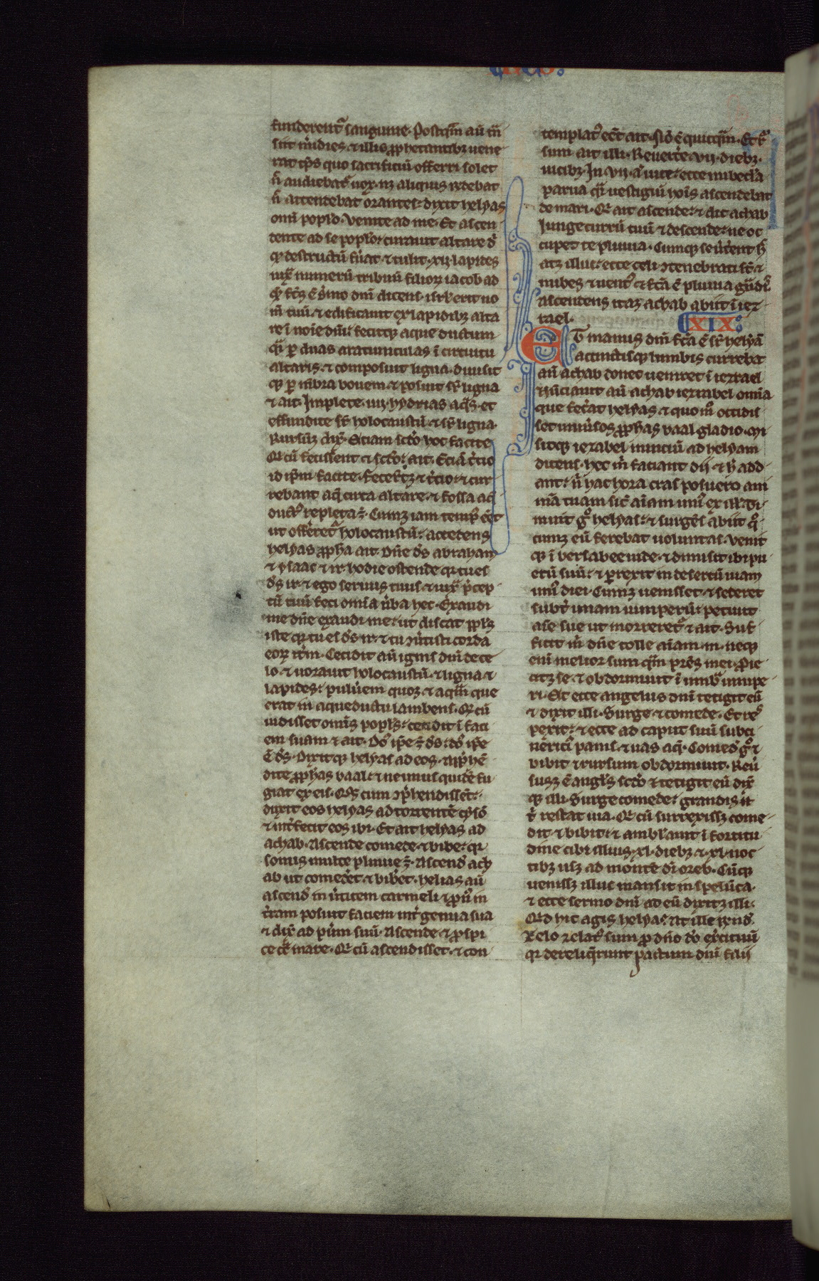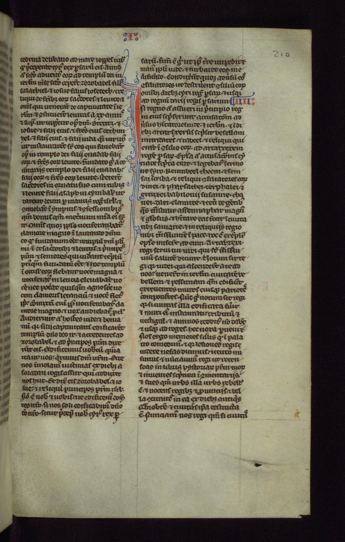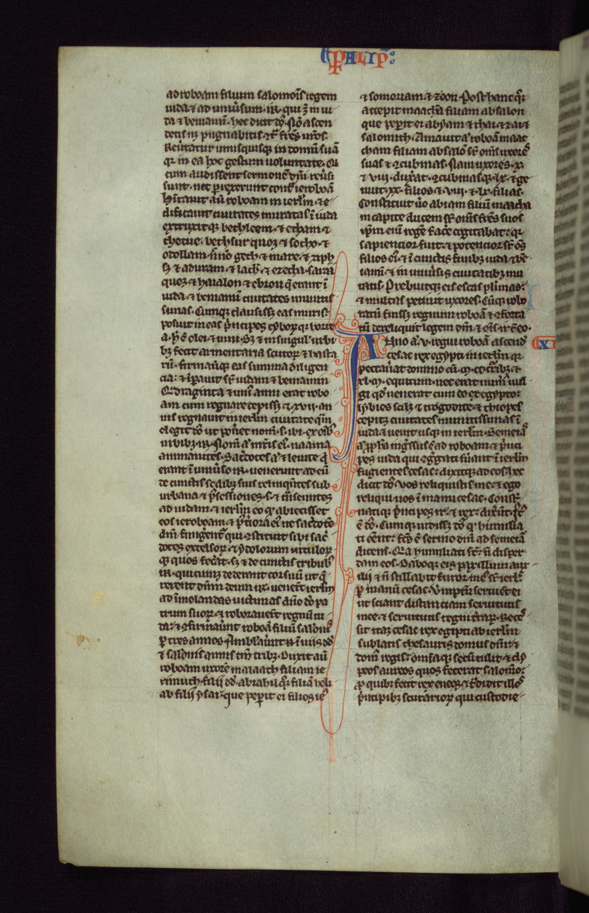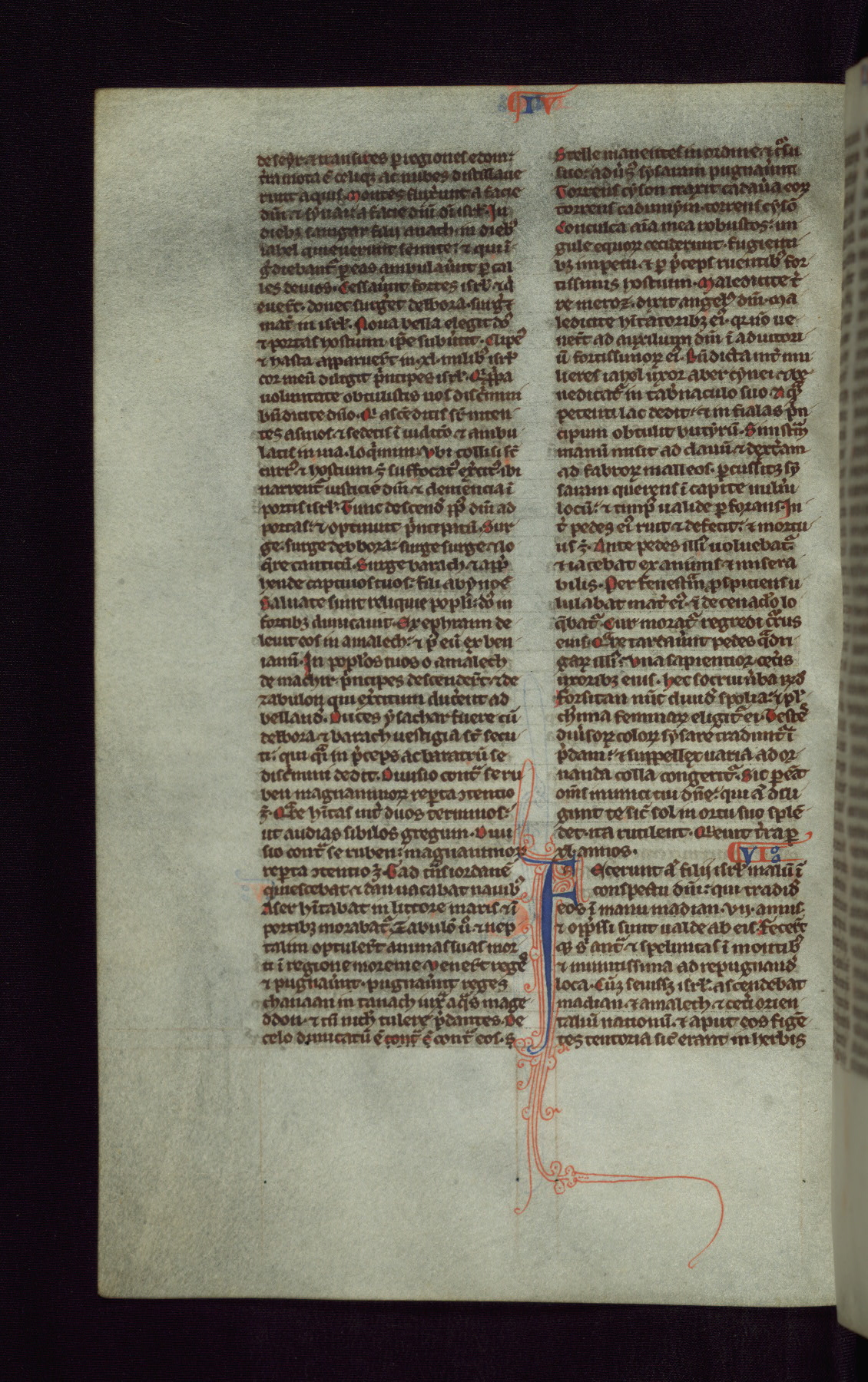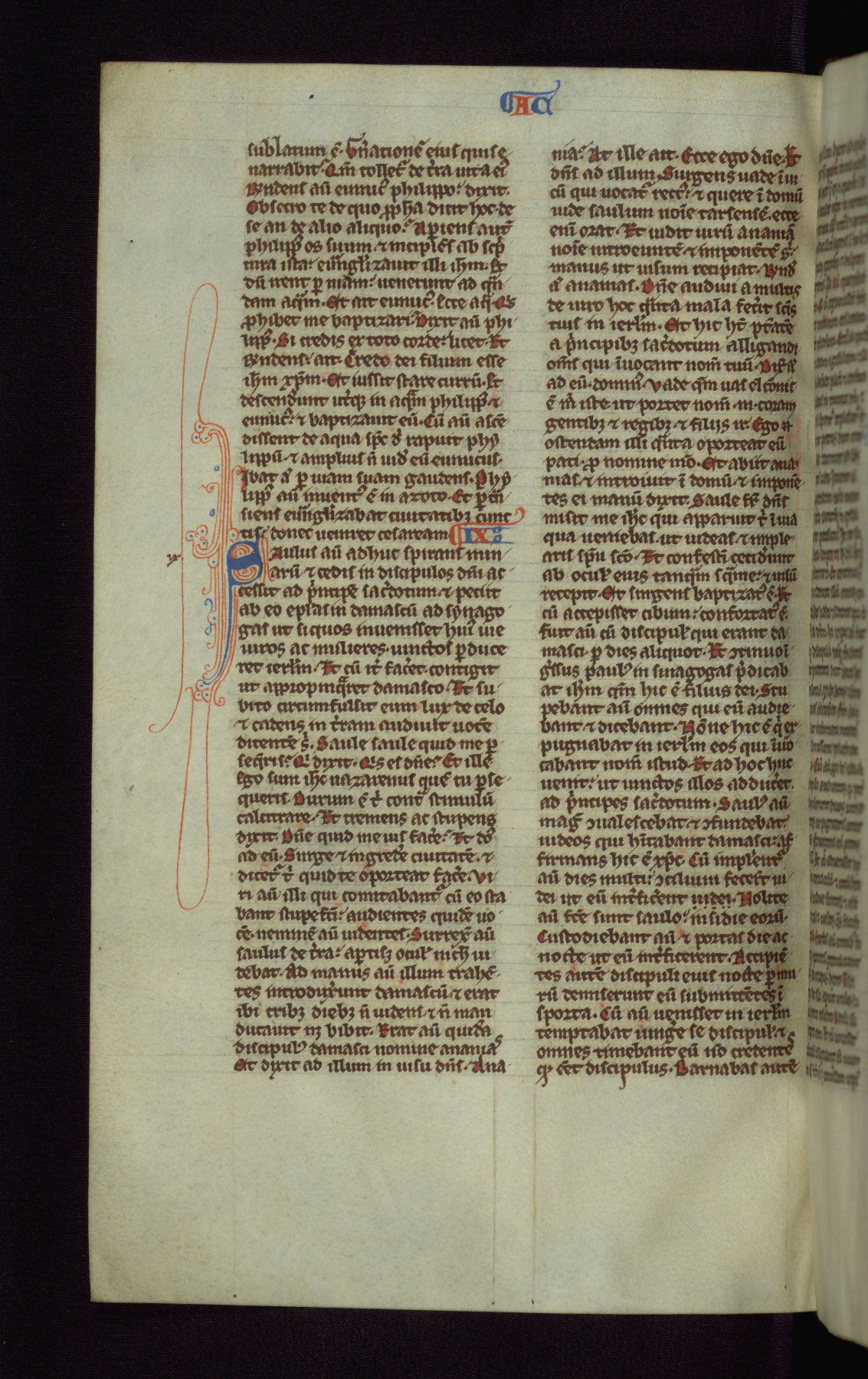This pocket-size Bible was created around the middle of the thirteenth century in England. It contains the Vulgate text of the Old and New Testaments, arranged in order and divided into chapters. Such Bibles, designed for individual rather than institutional use, began to be created on a large scale during the thirteenth century, especially in Paris. This manuscript is illuminated with a large number of small historiated initials, and also includes a somewhat later image of the Three Living and the Three Dead, a popular scene based on a French poem of the same century.