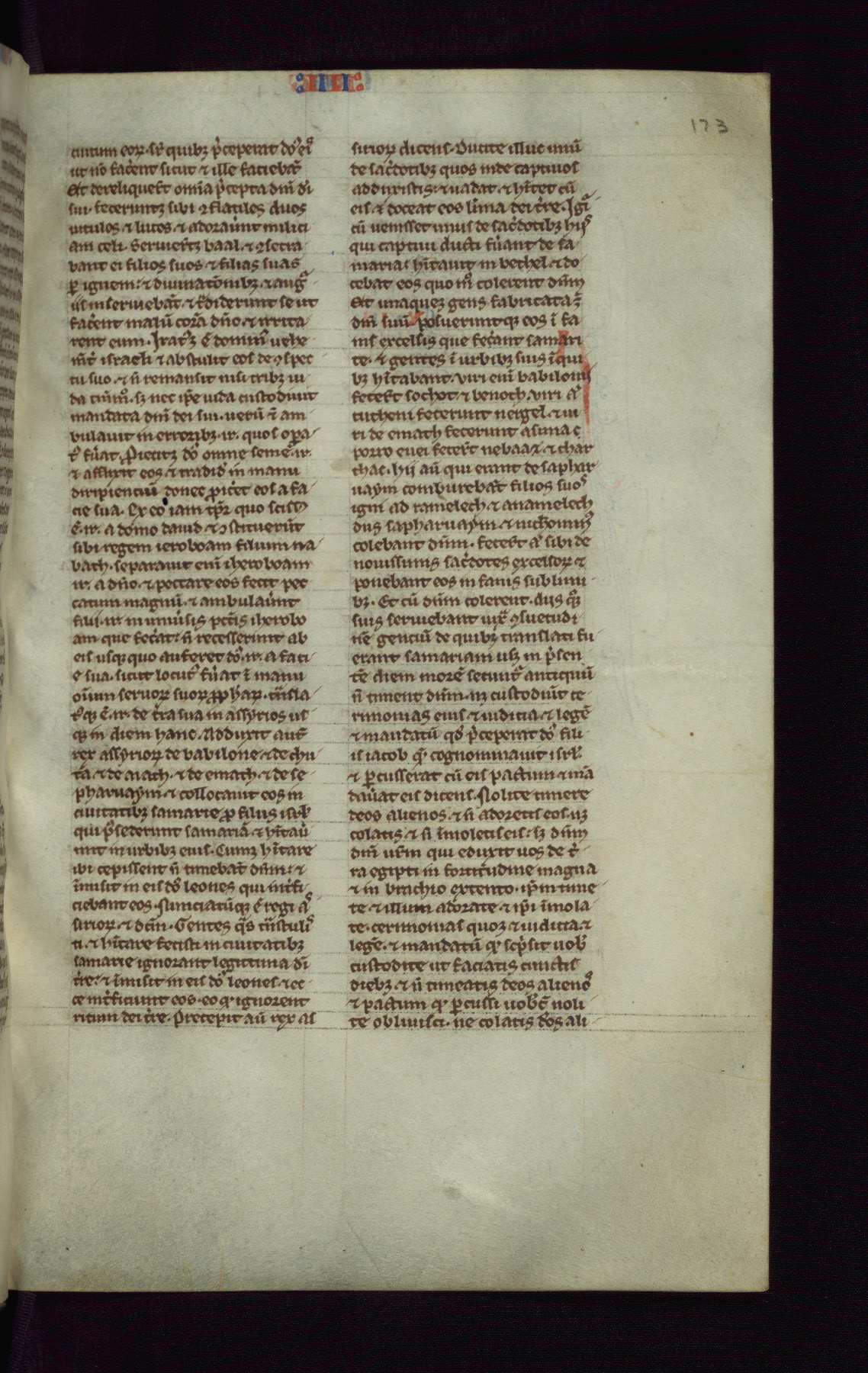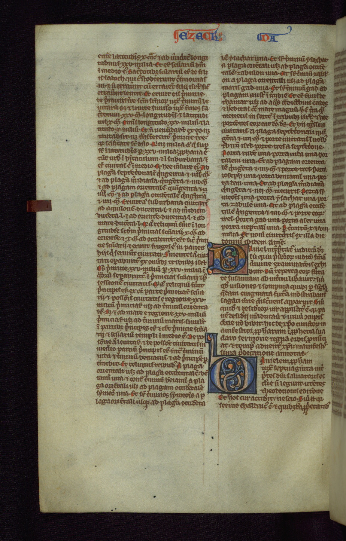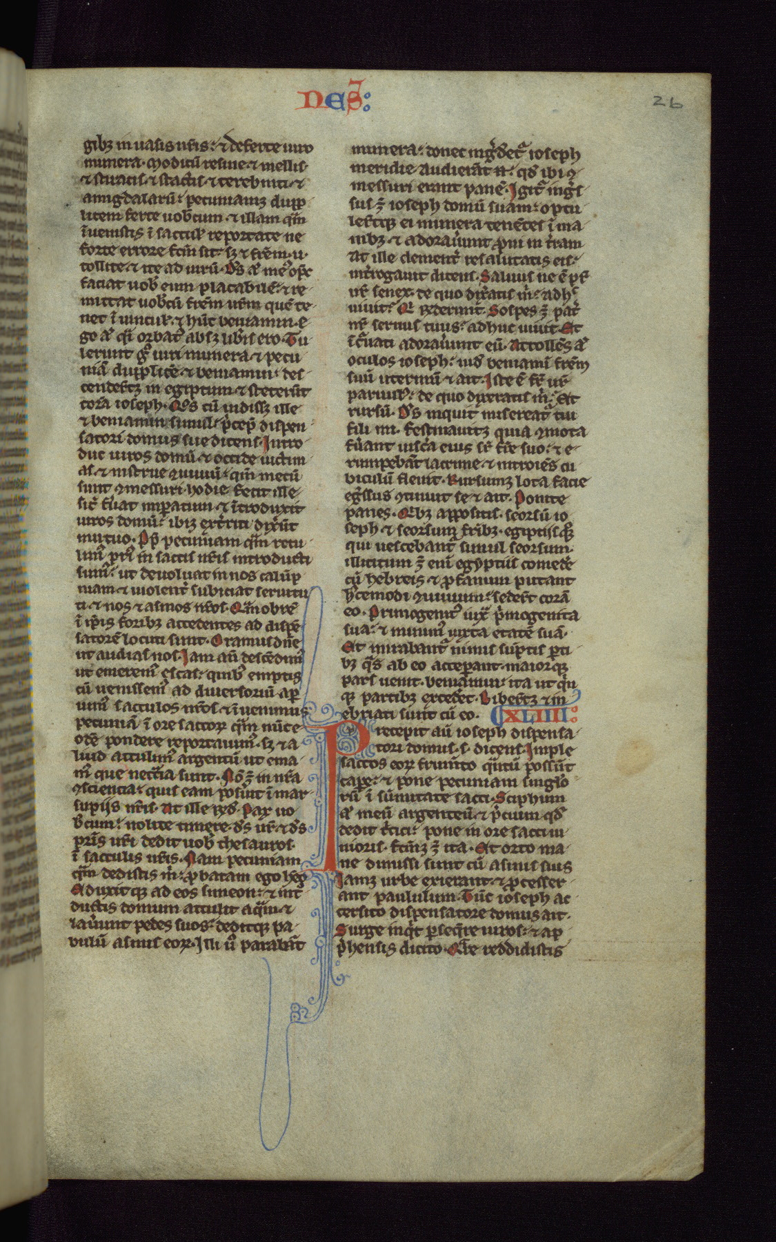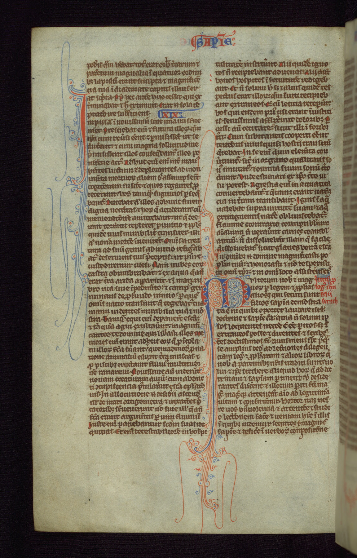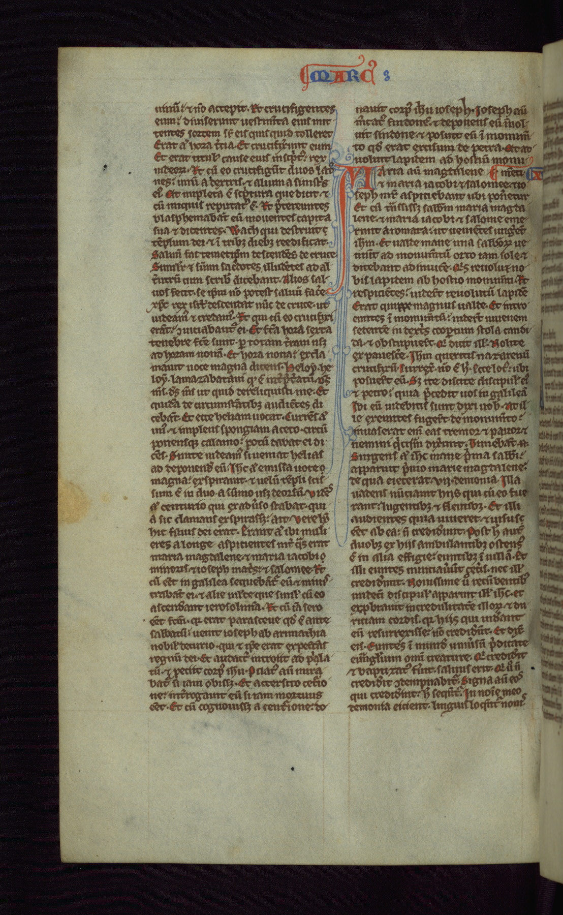 This pocket-size Bible was created around the middle of the thirteenth century in England. It contains the Vulgate text of the Old and New Testaments, arranged in order and divided into chapters. Such Bibles, designed for individual rather than institutional use, began to be created on a large scale during the thirteenth century, especially in Paris. This manuscript is illuminated with a large number of small historiated initials, and also includes a somewhat later image of the Three Living and the Three Dead, a popular scene based on a French poem of the same century.