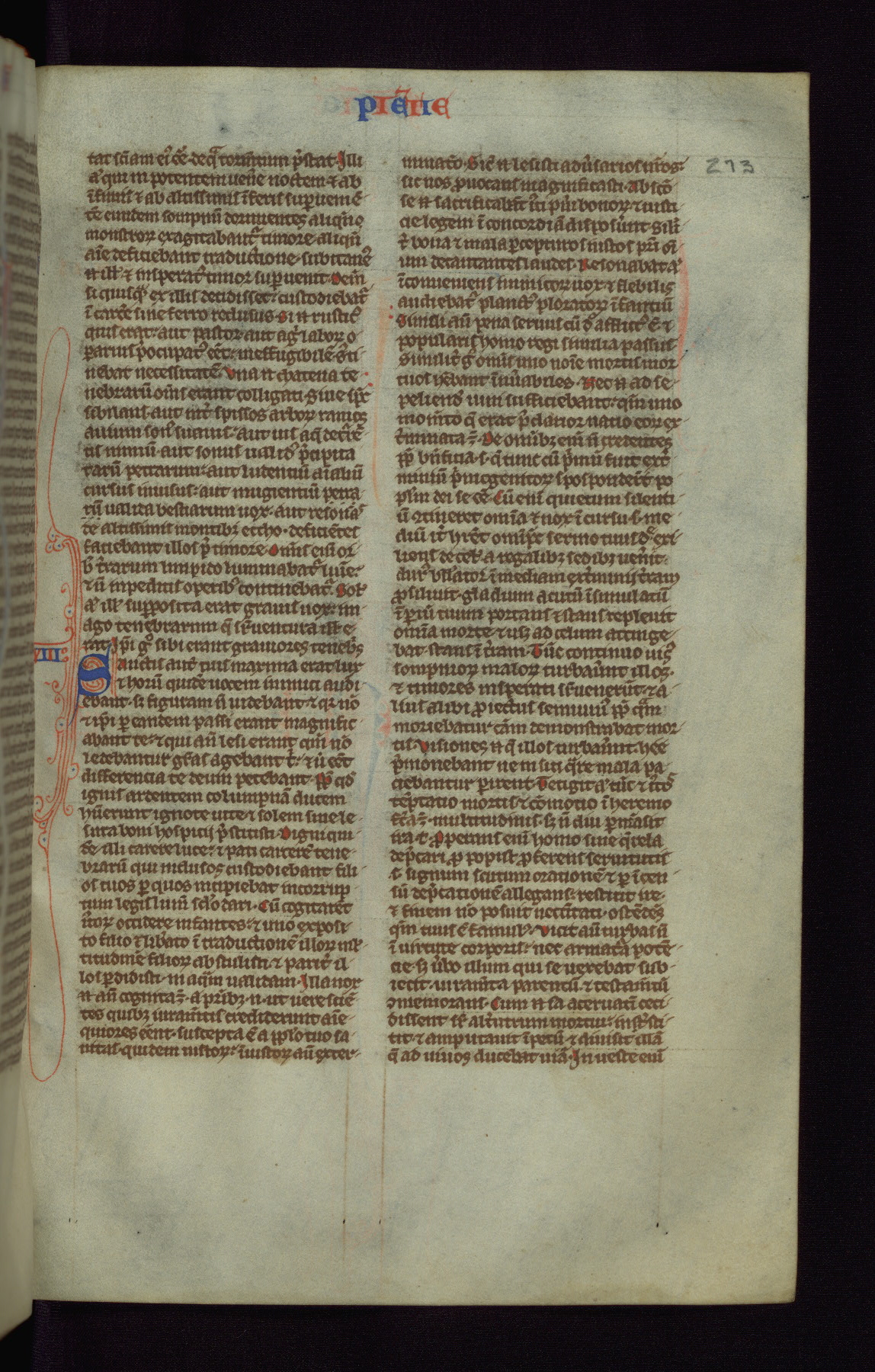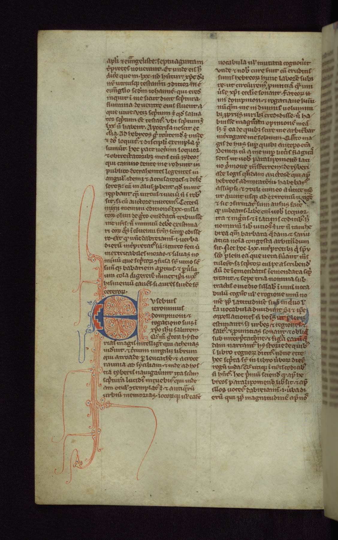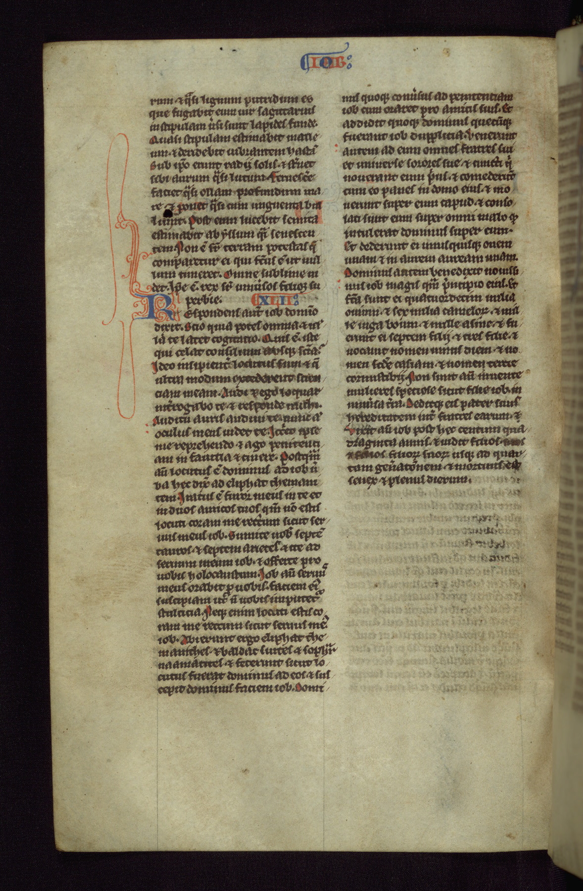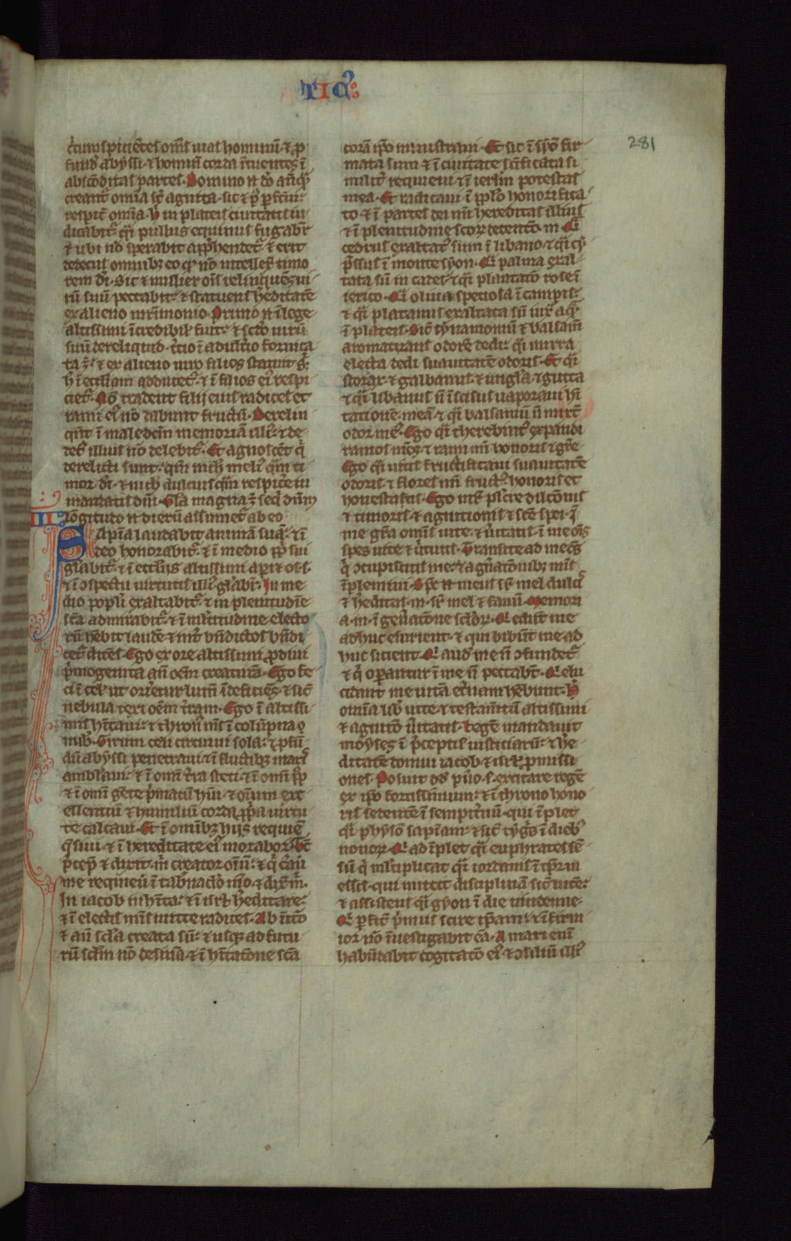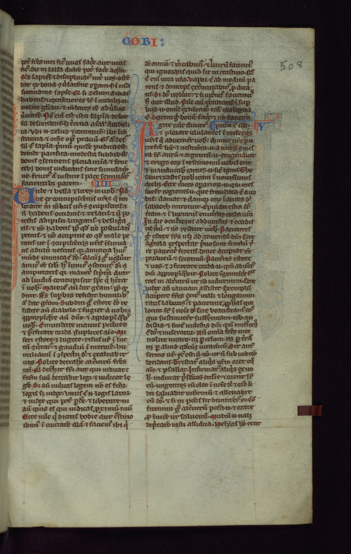 This pocket-size Bible was created around the middle of the thirteenth century in England. It contains the Vulgate text of the Old and New Testaments, arranged in order and divided into chapters. Such Bibles, designed for individual rather than institutional use, began to be created on a large scale during the thirteenth century, especially in Paris. This manuscript is illuminated with a large number of small historiated initials, and also includes a somewhat later image of the Three Living and the Three Dead, a popular scene based on a French poem of the same century.