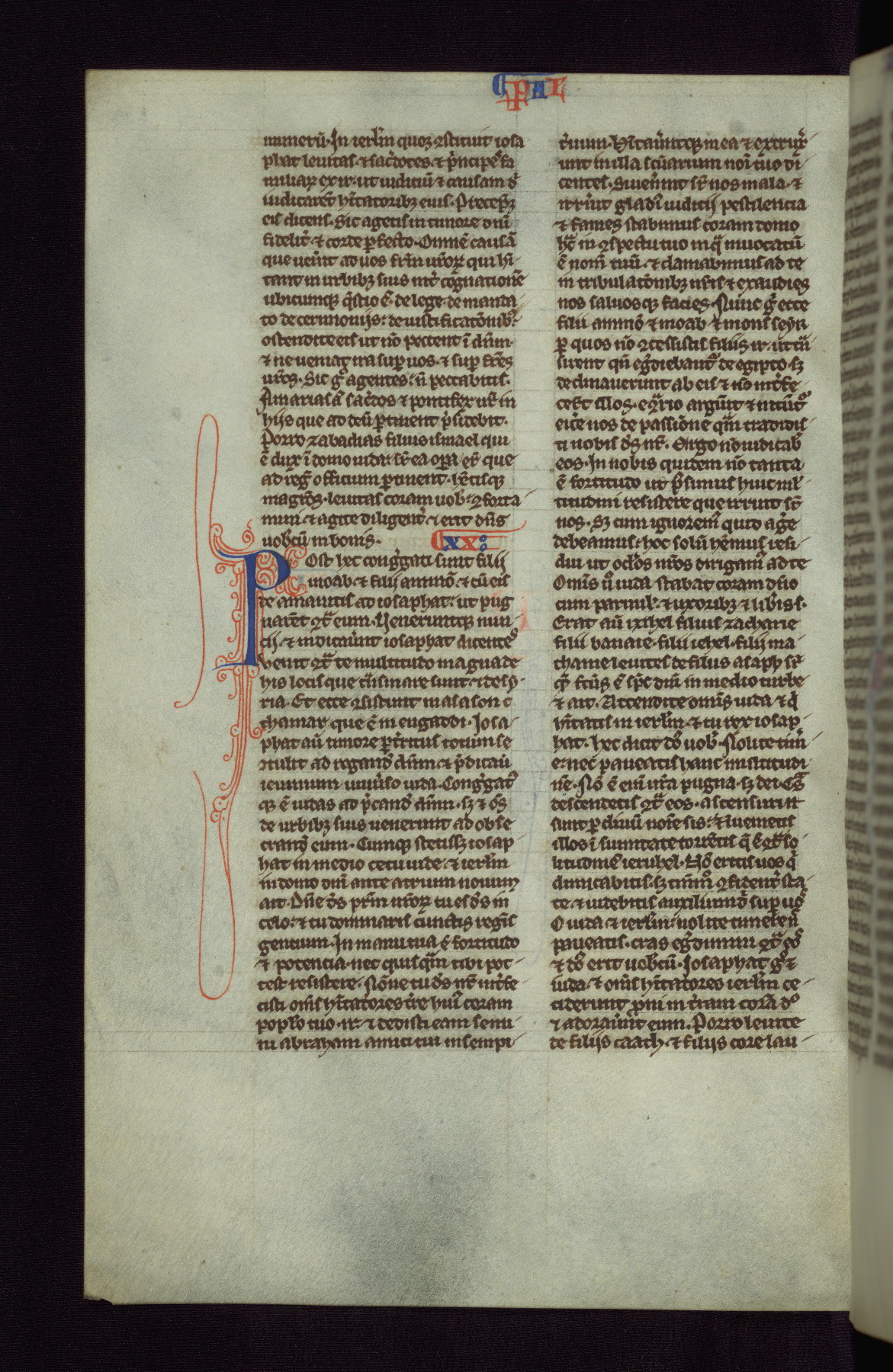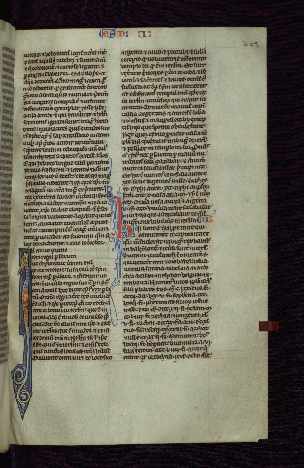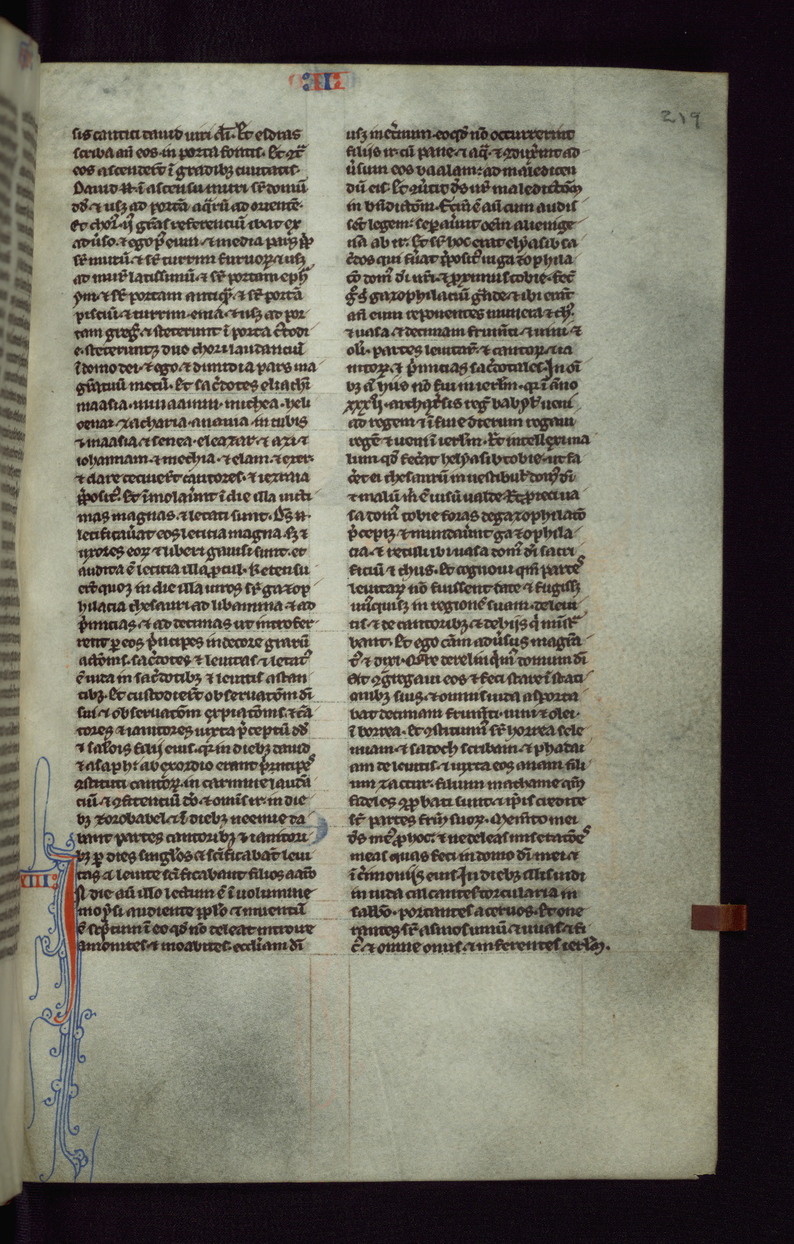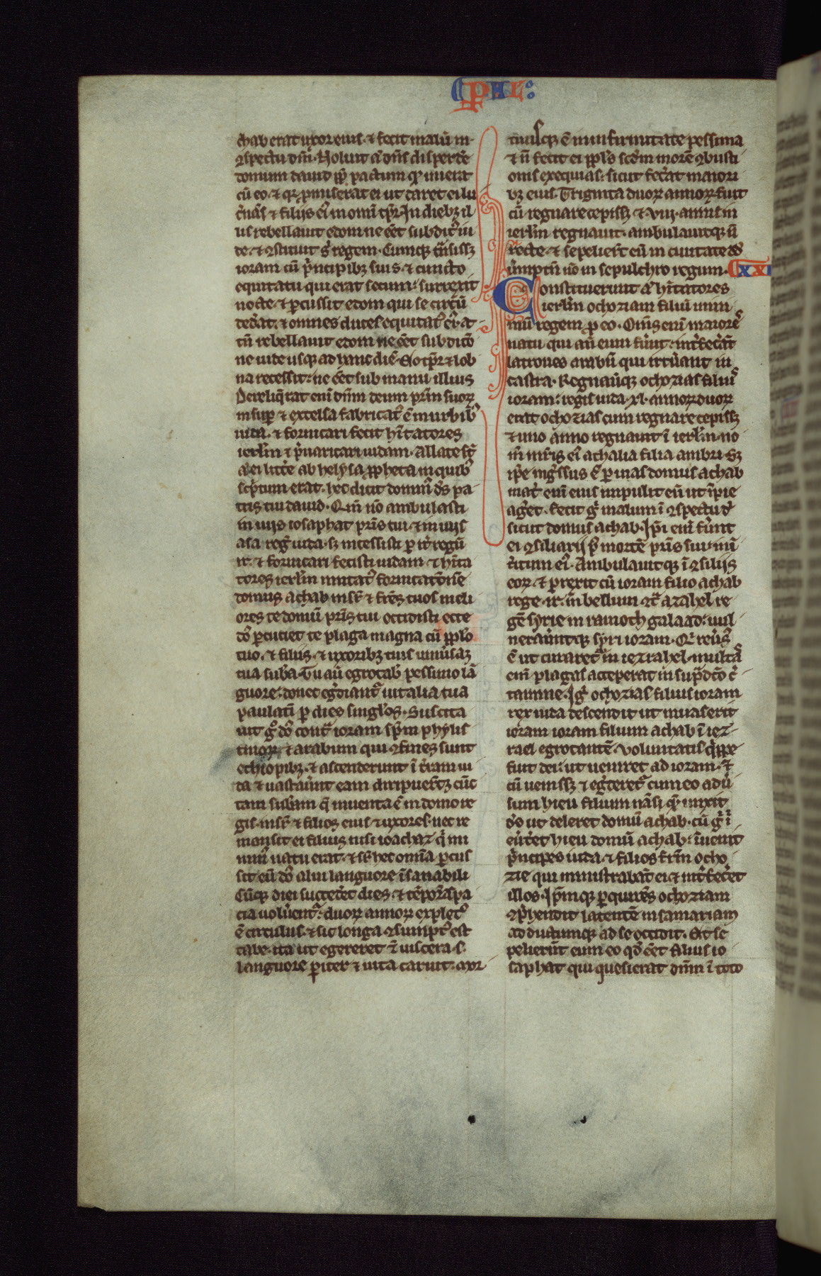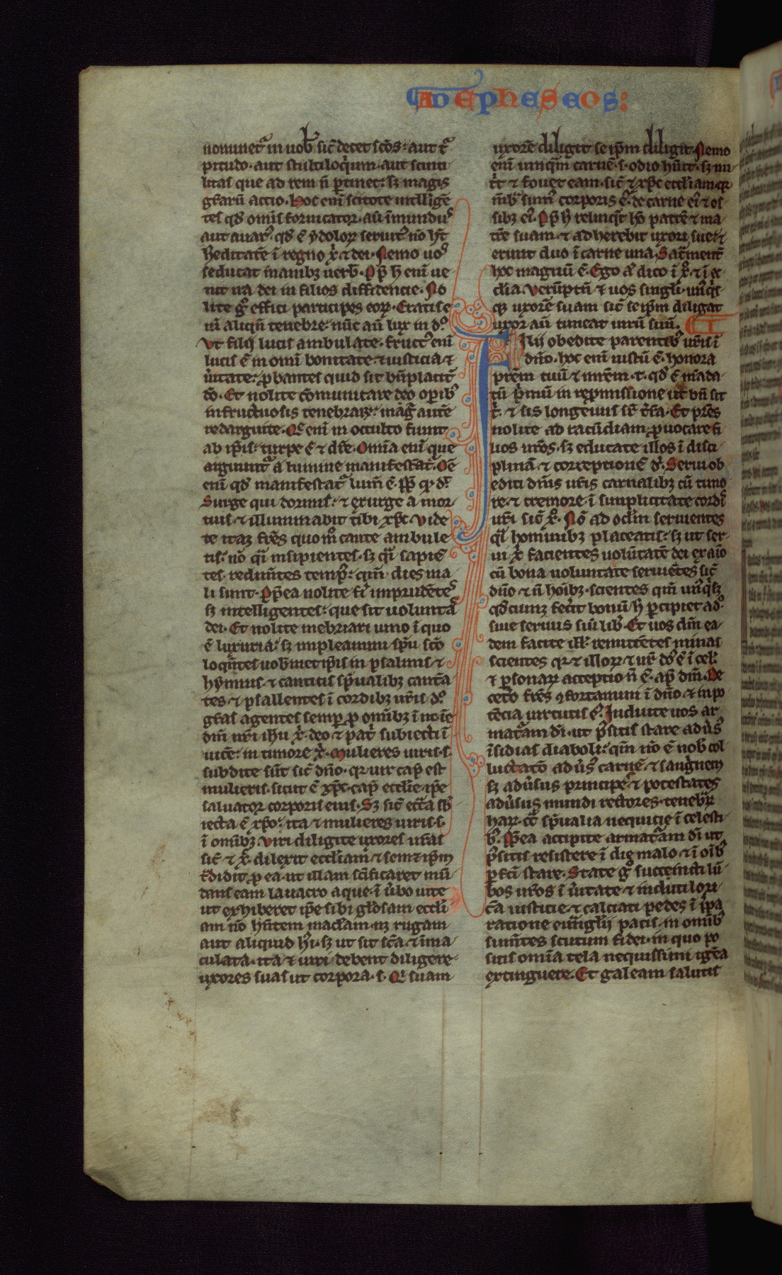 This pocket-size Bible was created around the middle of the thirteenth century in England. It contains the Vulgate text of the Old and New Testaments, arranged in order and divided into chapters. Such Bibles, designed for individual rather than institutional use, began to be created on a large scale during the thirteenth century, especially in Paris. This manuscript is illuminated with a large number of small historiated initials, and also includes a somewhat later image of the Three Living and the Three Dead, a popular scene based on a French poem of the same century.