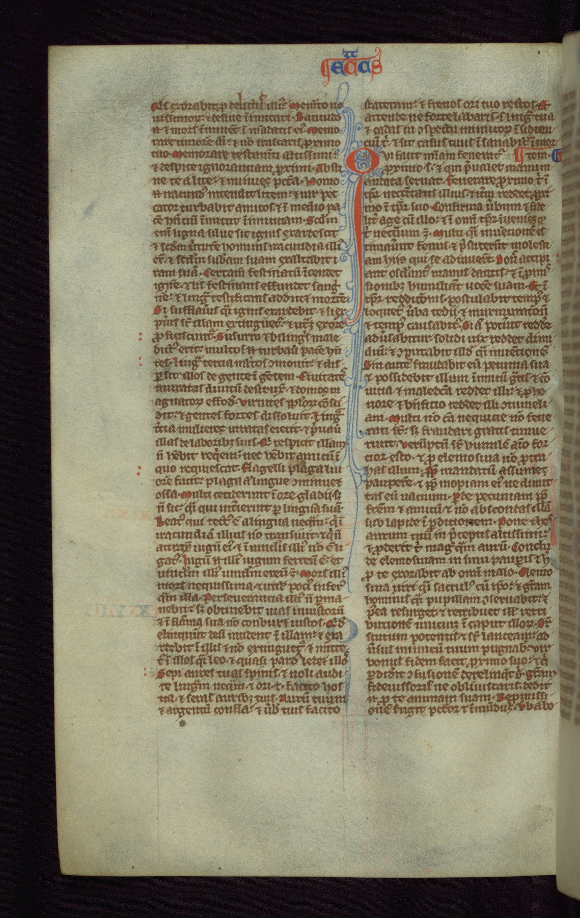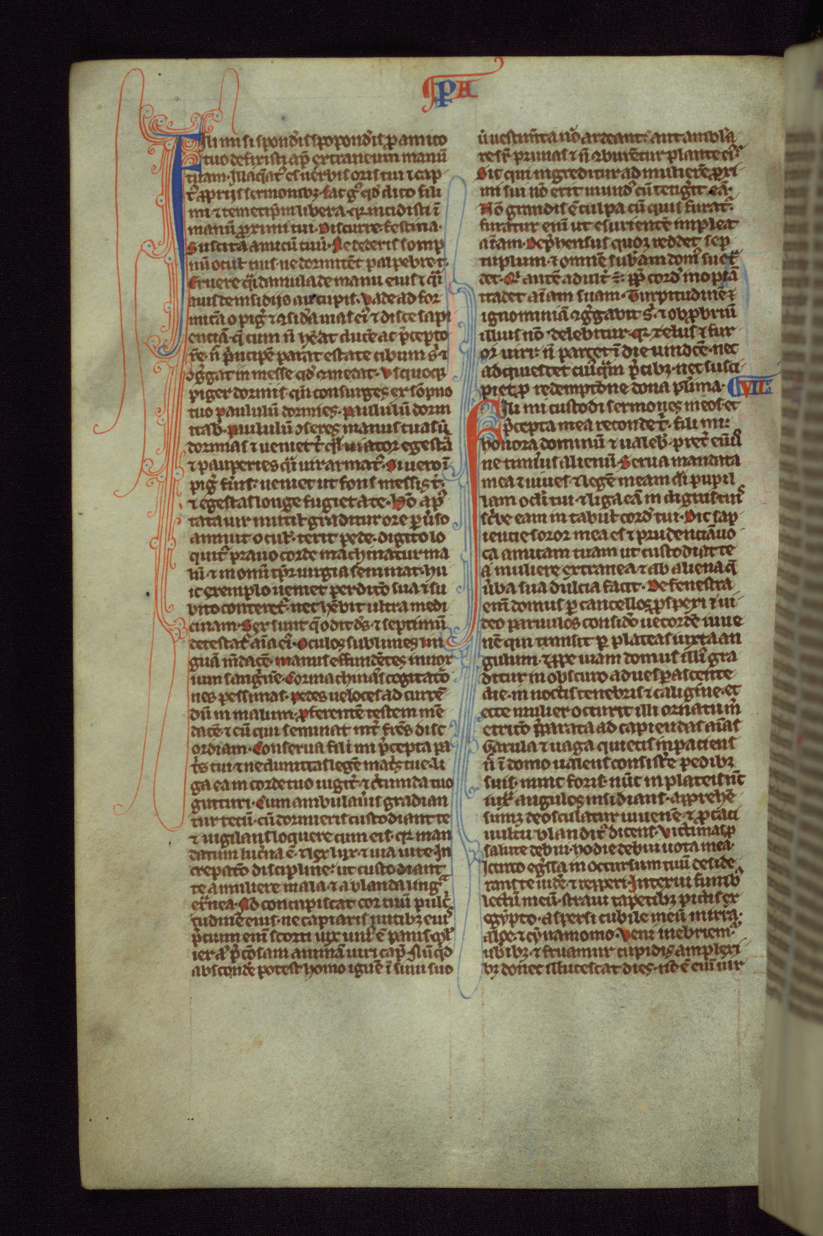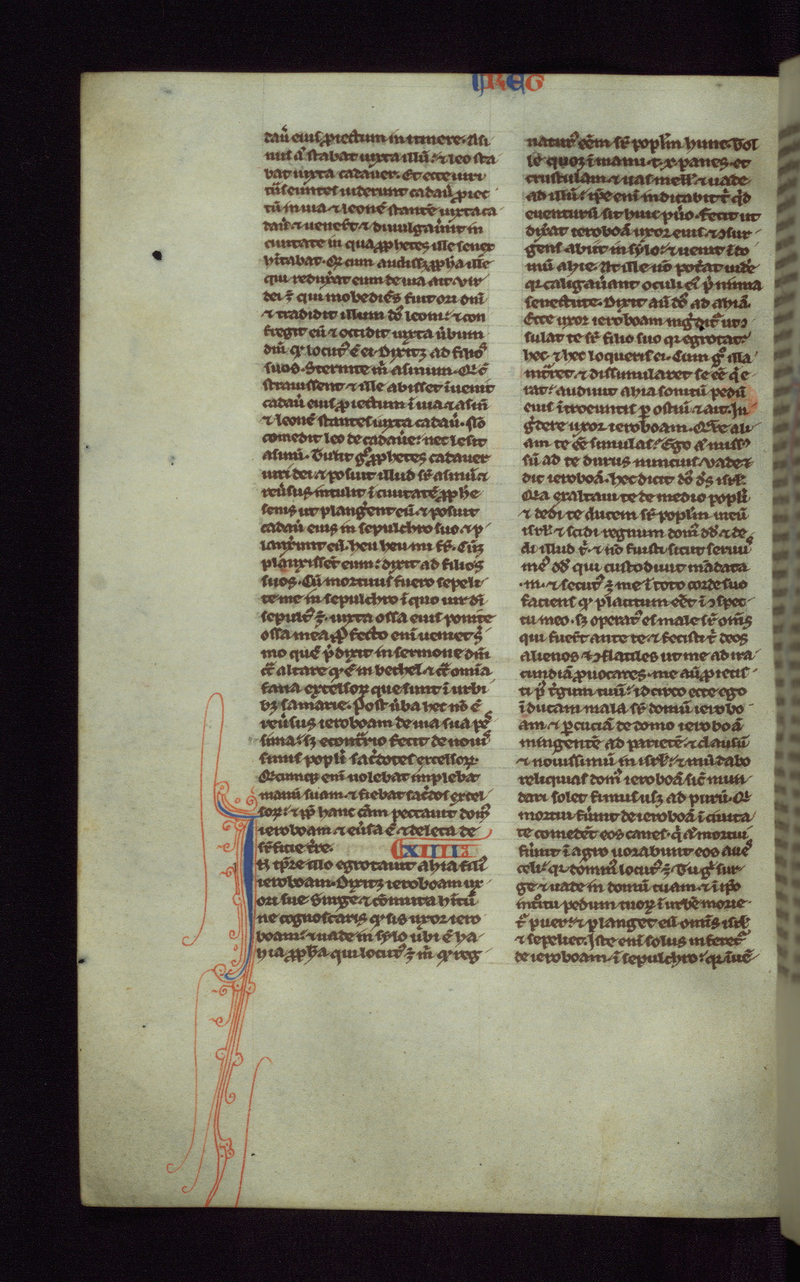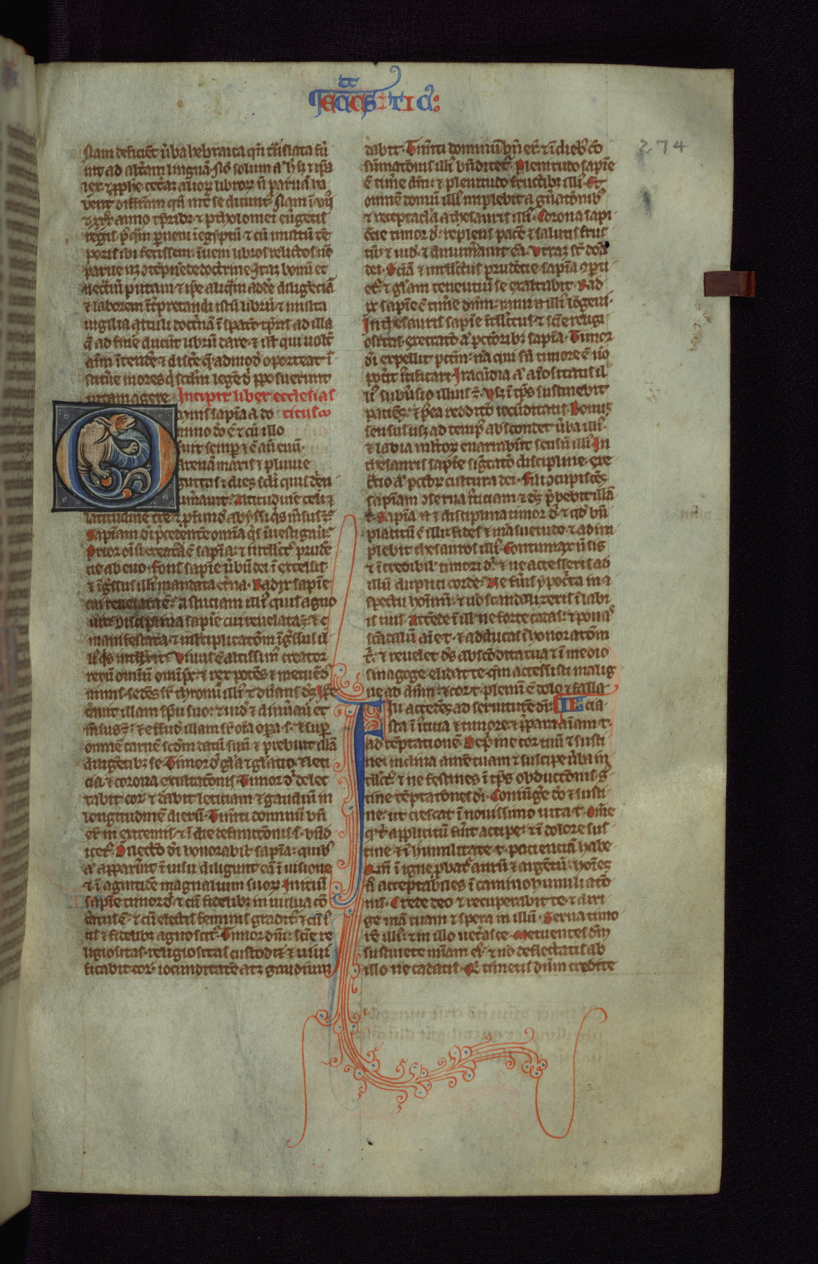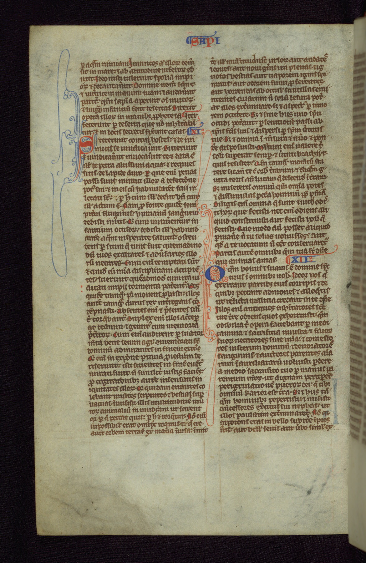 This pocket-size Bible was created around the middle of the thirteenth century in England. It contains the Vulgate text of the Old and New Testaments, arranged in order and divided into chapters. Such Bibles, designed for individual rather than institutional use, began to be created on a large scale during the thirteenth century, especially in Paris. This manuscript is illuminated with a large number of small historiated initials, and also includes a somewhat later image of the Three Living and the Three Dead, a popular scene based on a French poem of the same century.