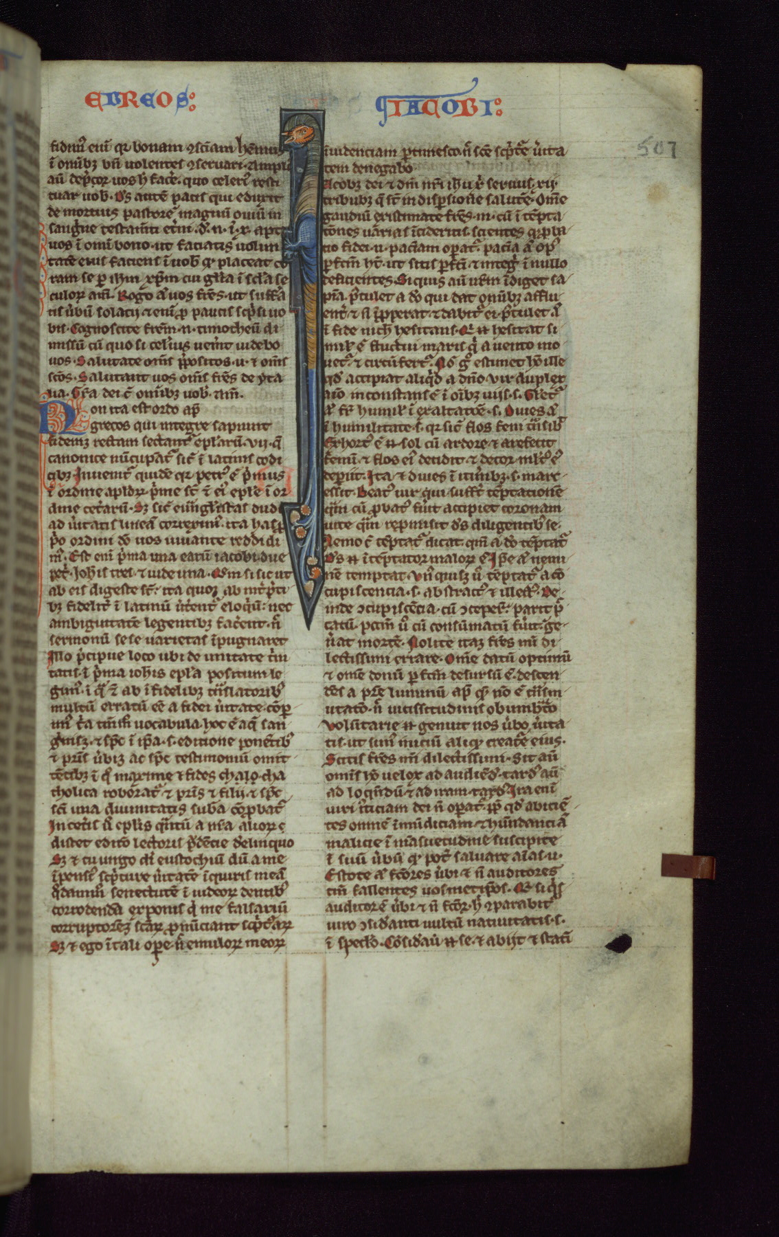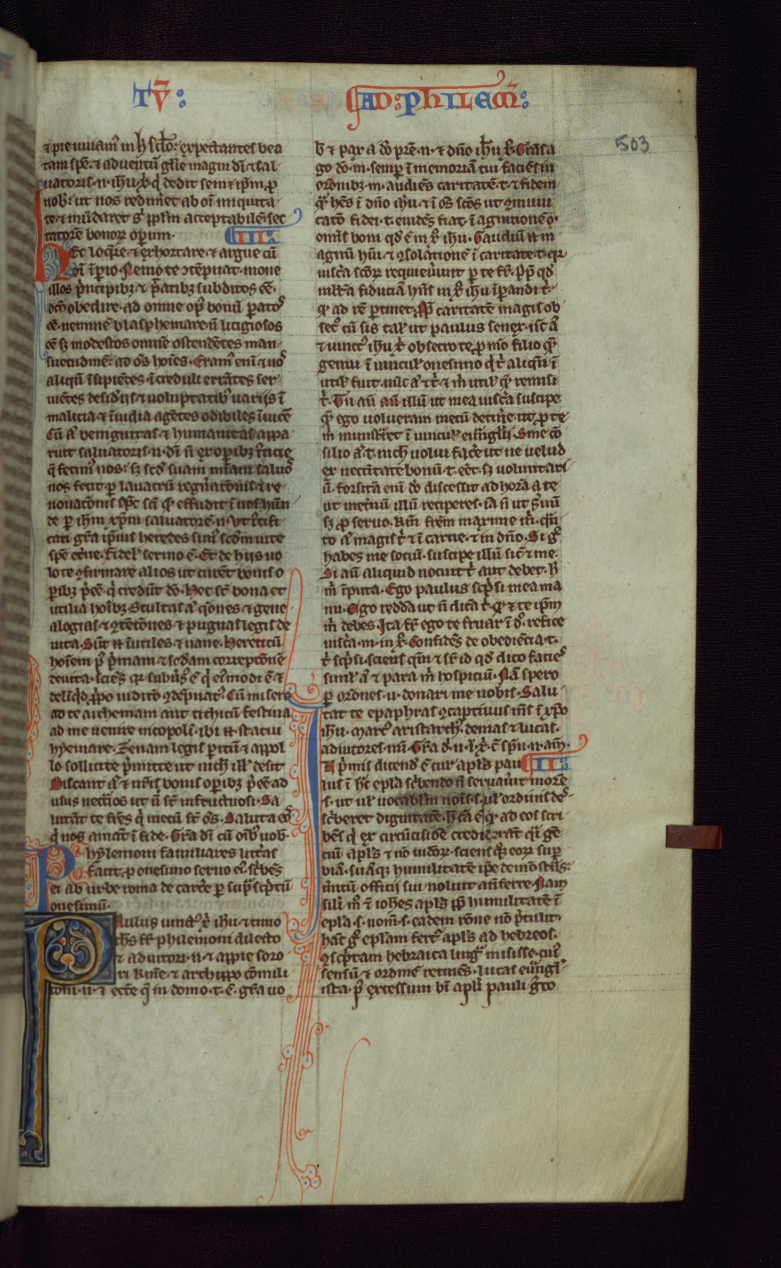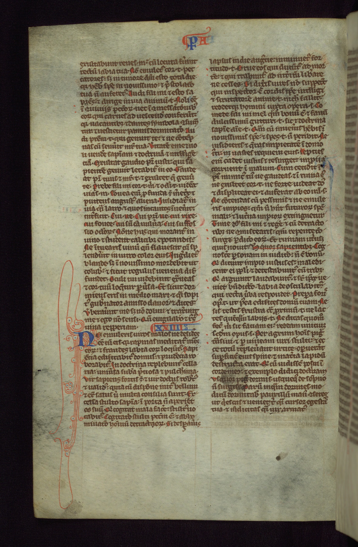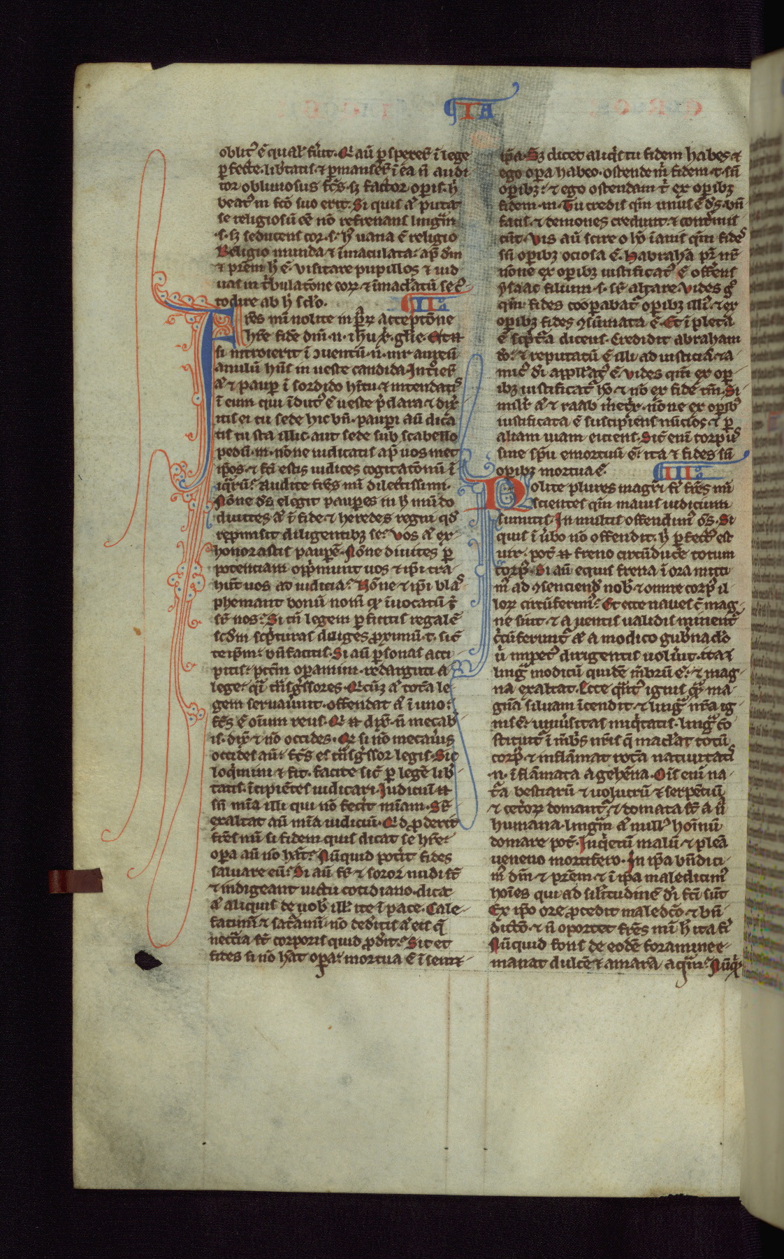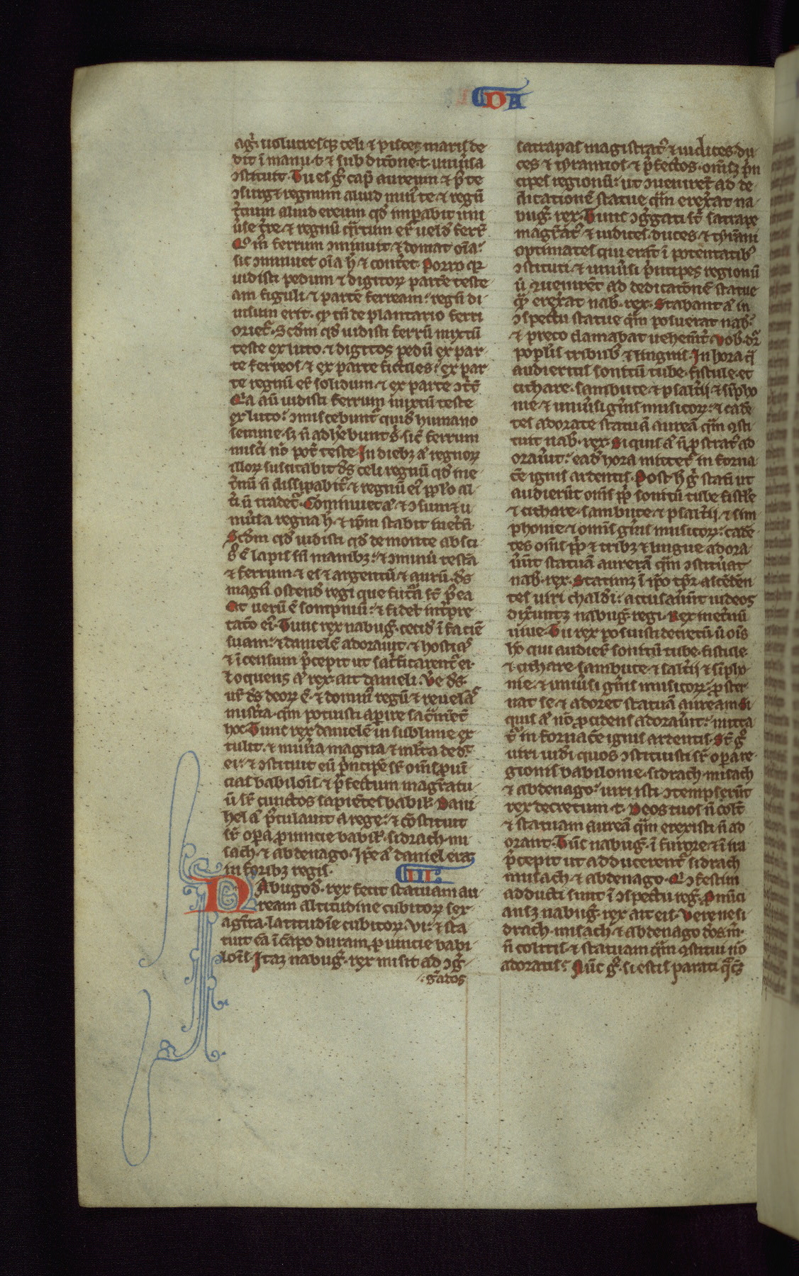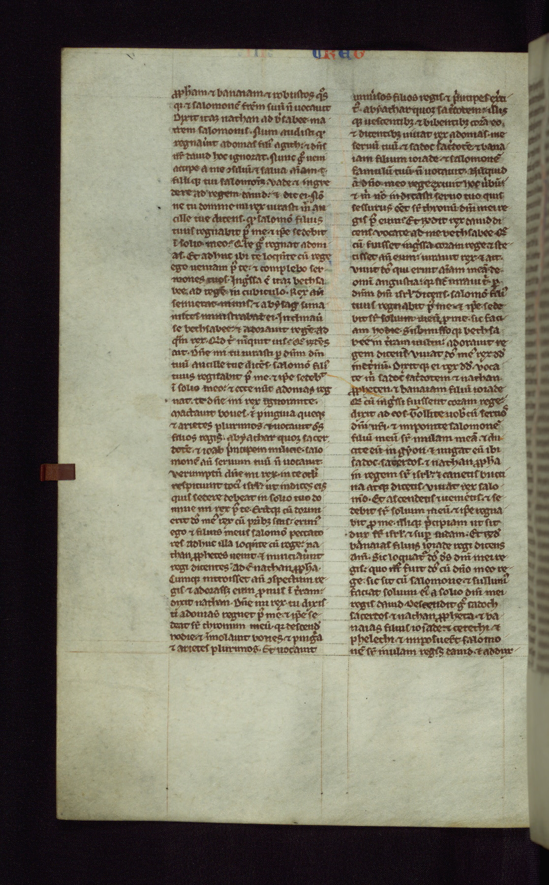 This pocket-size Bible was created around the middle of the thirteenth century in England. It contains the Vulgate text of the Old and New Testaments, arranged in order and divided into chapters. Such Bibles, designed for individual rather than institutional use, began to be created on a large scale during the thirteenth century, especially in Paris. This manuscript is illuminated with a large number of small historiated initials, and also includes a somewhat later image of the Three Living and the Three Dead, a popular scene based on a French poem of the same century.